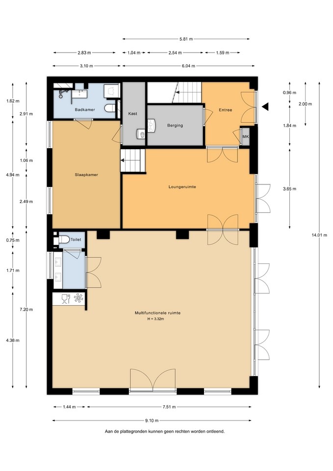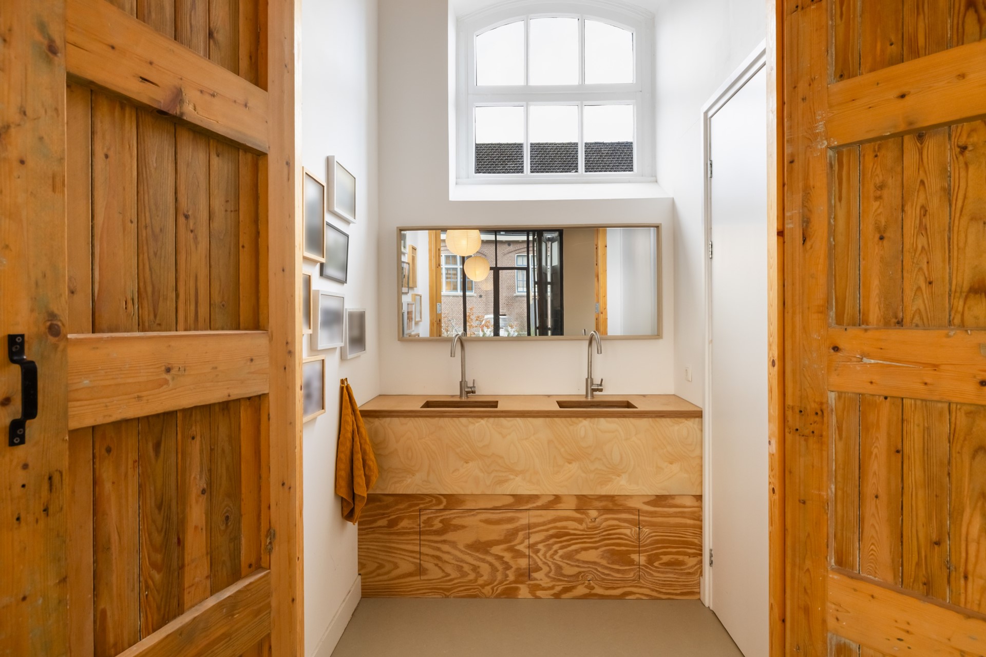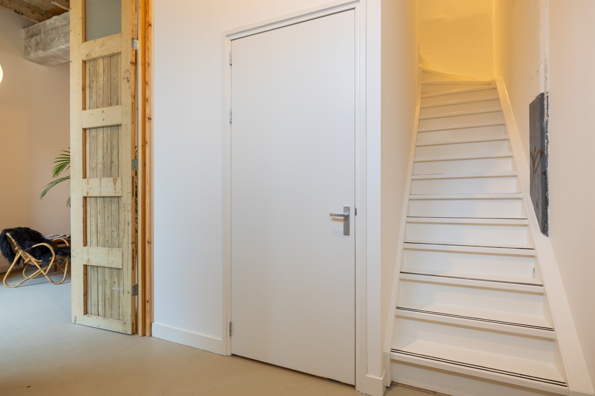 Aan weerszijden brengen hoge deuren in de kenmerkende stijl van het pand je naar respectievelijk de hal met trap naar boven en de multifunctionele ruimte. Deze ruimte is licht, open en indrukwekkend dankzij een hoogte van circa 3,3 meter. Grote raampartijen en openslaande deuren maken dit een ideale plek voor een atelier, kantoor, praktijkruimte of creatieve studio – maar ook kleinschalige horeca of bijvoorbeeld een koffiebar zouden hier perfect passen. De aanwezige pantry en het separate toilet zorgen ervoor dat werken en wonen volledig gescheiden kunnen blijven.