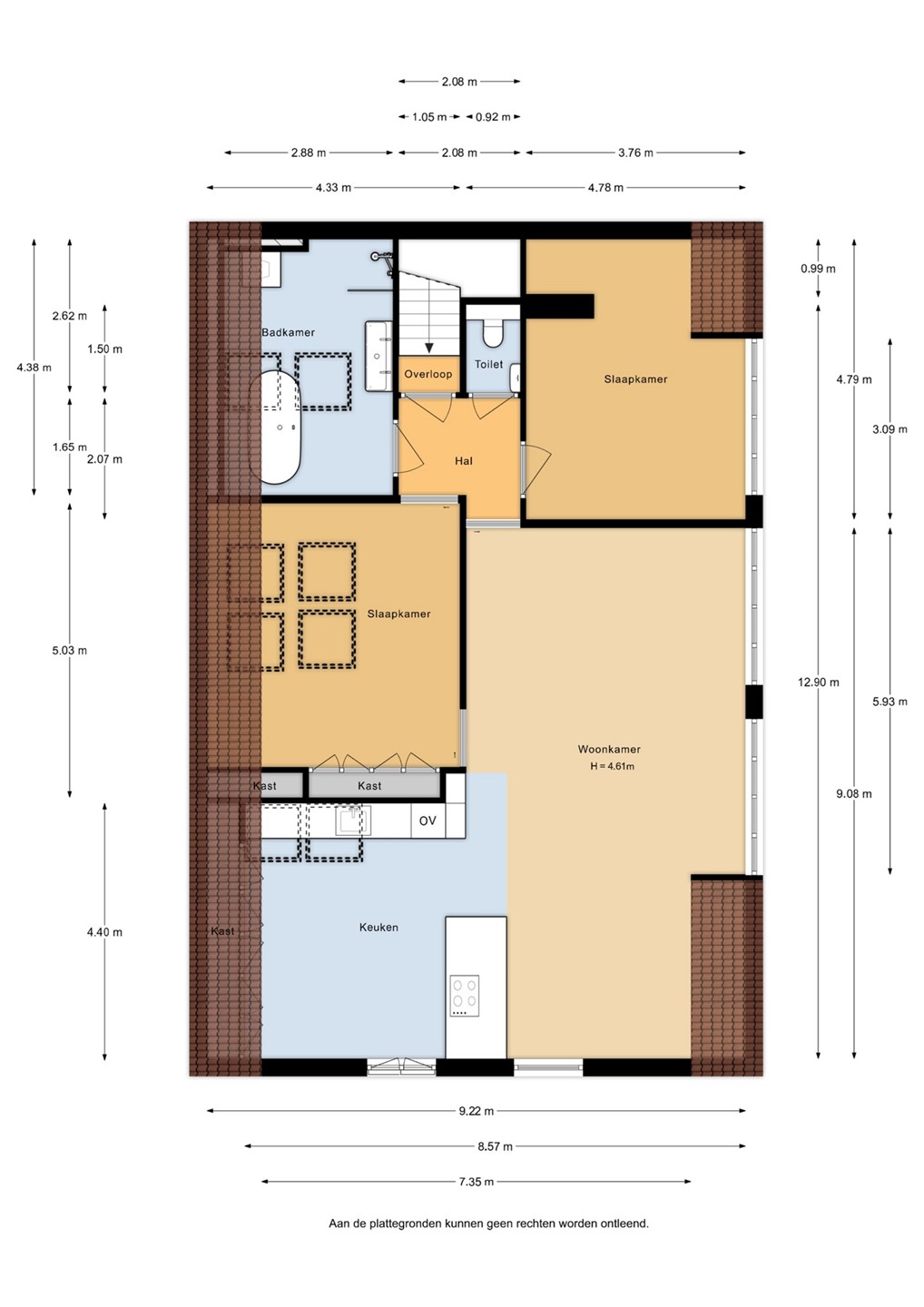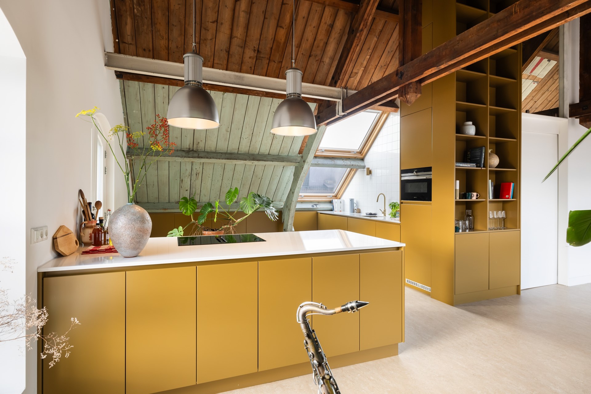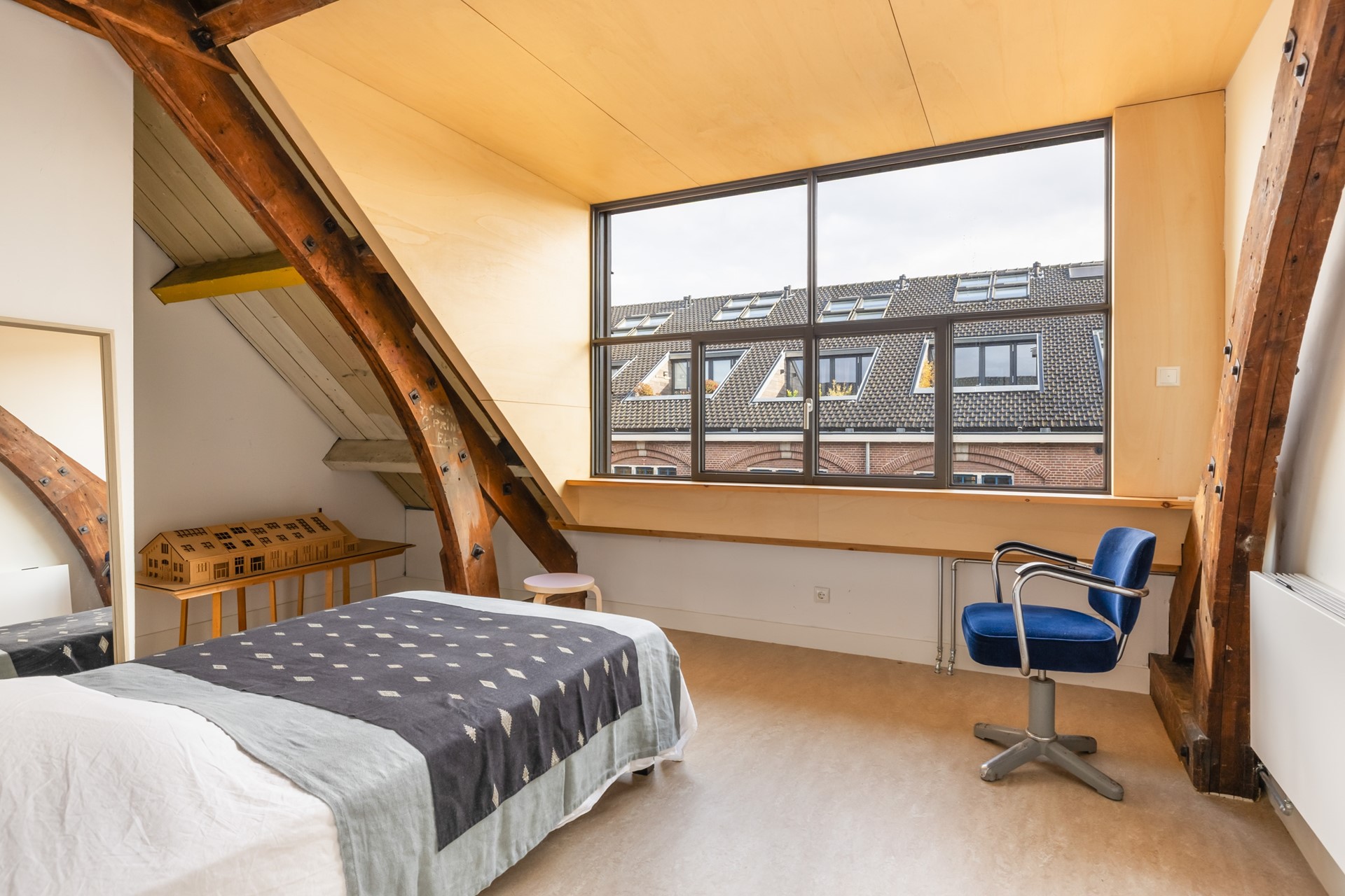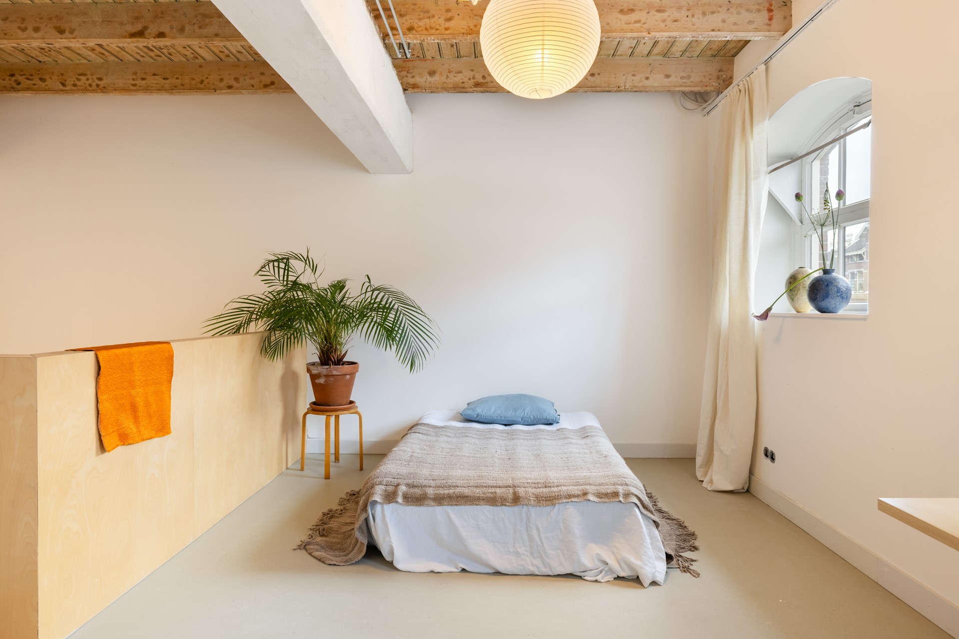 De vaste trap brengt je naar de bovenverdieping, waar de overloop toegang geeft tot alle ruimtes. Hier vind je twee ruime slaapkamers, een moderne badkamer en de sfeervolle woonkamer met open leefkeuken. De woonkamer heeft een prachtige hoogte van circa 4,6 meter in de nok, wat zorgt voor een ruimtelijk, licht en echt loftachtig gevoel. De grote dakkapel, het Franse balkon, meerdere dakramen en de oude stalramen laten het daglicht van alle kanten mooi binnenstromen. De oude houten balken en spanten zijn volledig in het zicht gelaten en vormen een prachtig contrast met de moderne afwerking. De open leefkeuken is een echte eyecatcher: praktisch ingedeeld met een schier-/kookeiland, volop kastruimte en hoogwaardige inbouwapparatuur (inductiekookplaat met geïntegreerde afzuiging, oven, koelkast, vriezer en vaatwasser). Het is een heerlijke plek om te koken, borrelen en samen te zijn. De verdieping is voorzien van een prachtige linoleumvloer en lage-temperatuurradiatoren die zowel kunnen verwarmen als koelen, wat bijdraagt aan optimaal wooncomfort in elk seizoen.