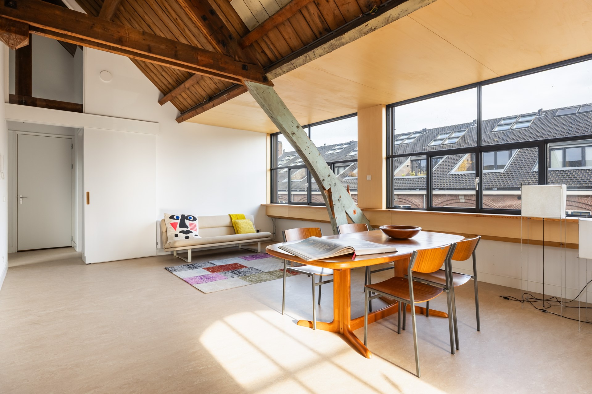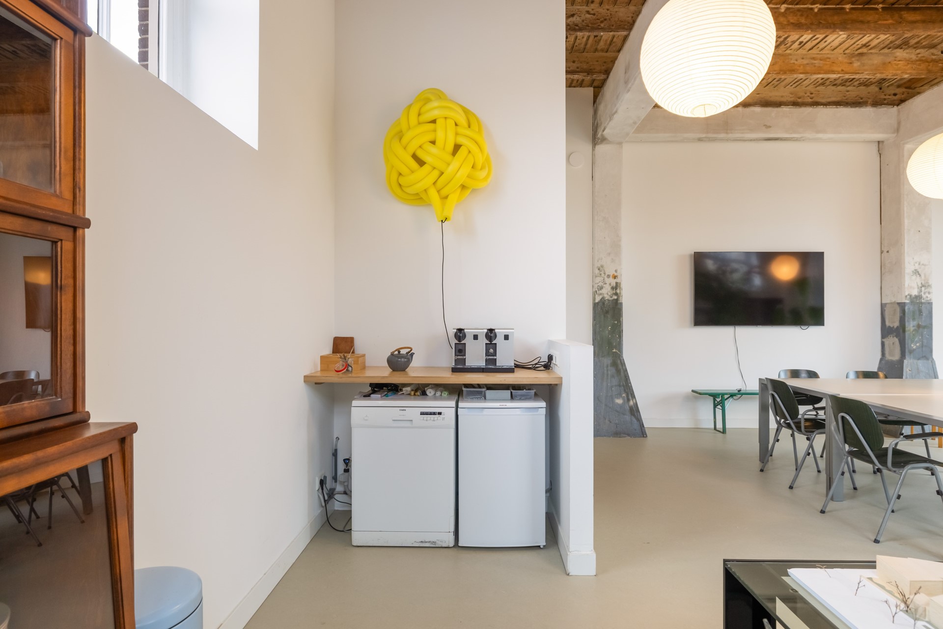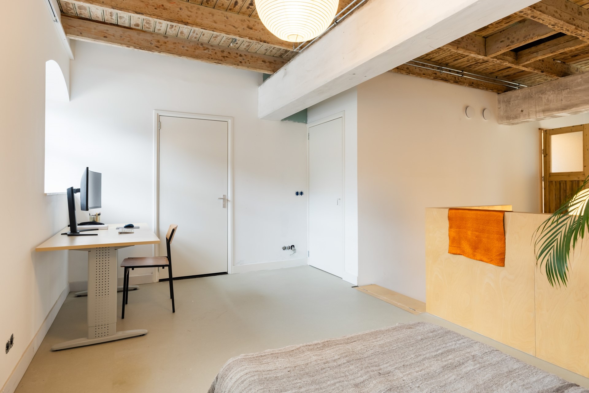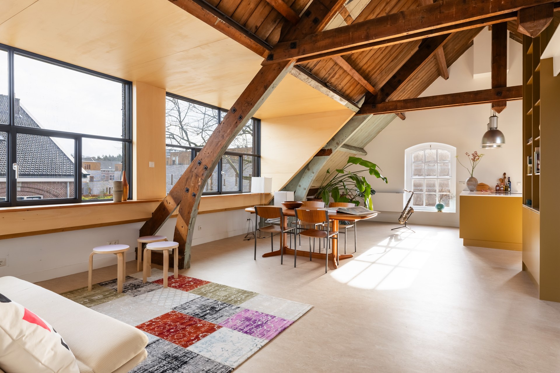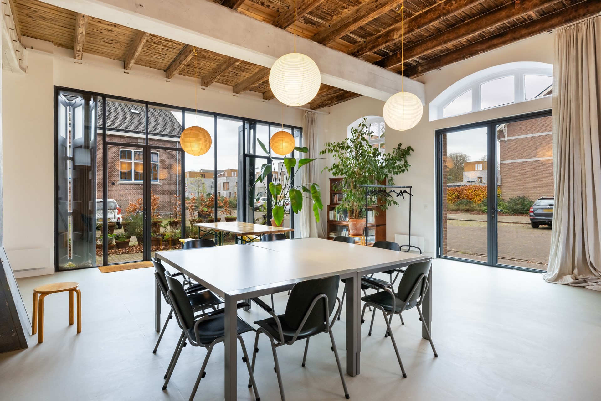 De imposante glazen pui van bijna 7 meter breed en 4 meter hoog vormt een echte eyecatcher en de dubbele deuren geven toegang tot zowel het woon- als werkdeel, die binnen met elkaar verbonden zijn via openslaande deuren maar buiten elk hun eigen entree hebben. De hoge plafonds, het stijlvolle materiaalgebruik en de grote mate van openheid zorgen voor een sterk loft-gevoel, waarbij de zichtbare balken en spanten een warme en karaktervolle sfeer creëren.