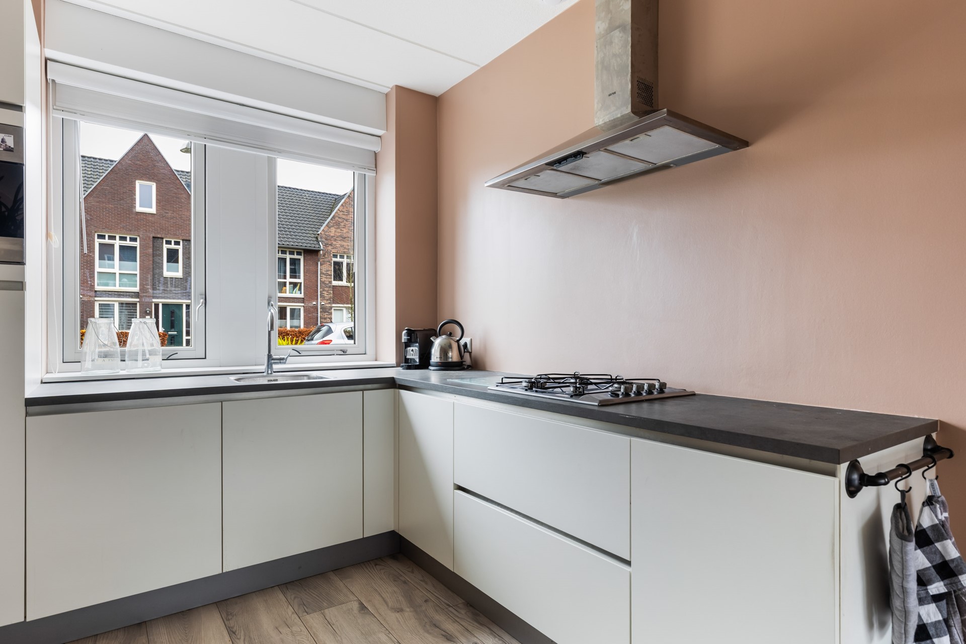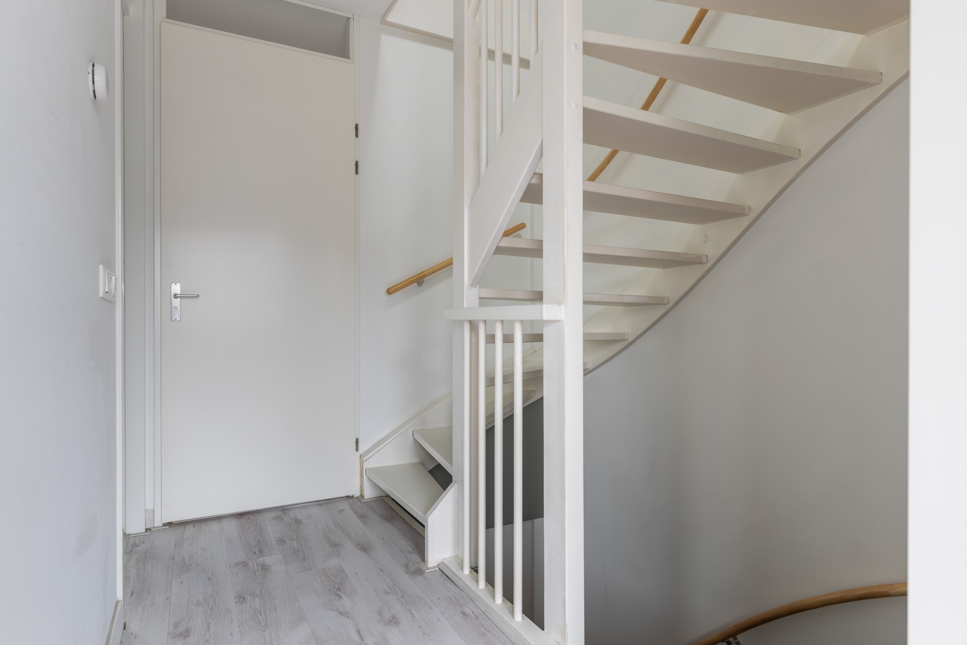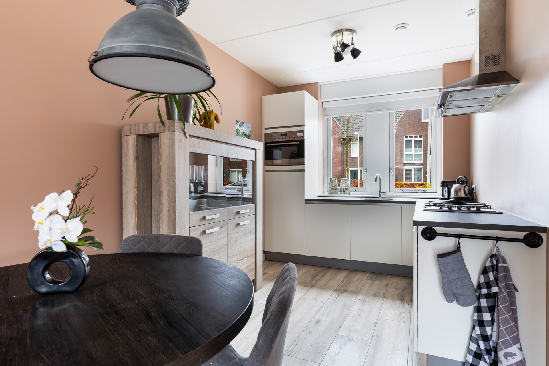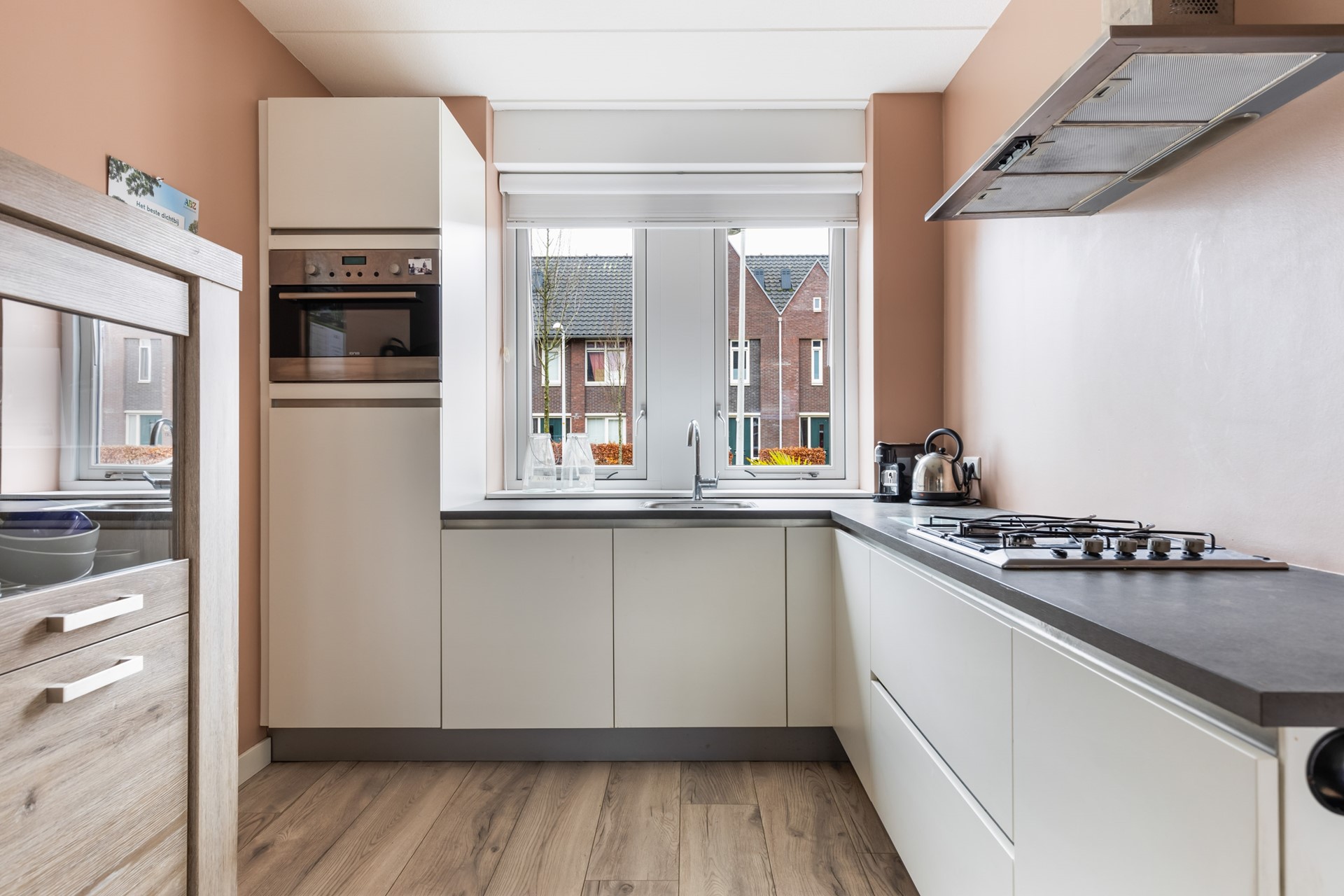 Bij binnenkomst in de woning kom je in de hal, die toegang biedt tot de meterkast (voorzien van glasvezelaansluiting), een modern afgewerkte toiletruimte met wandcloset en fonteintje, de trap naar de eerste verdieping en de woonkamer. De uitgebouwde, tuingerichte woonkamer is licht en ruim dankzij het grote raam en de loopdeur naar de achtertuin, die een mooie verbinding met buiten creëren. Aan de voorzijde van de woning bevindt zich de open keuken in een lichte kleurstelling met een praktische hoekopstelling. De keuken is volledig uitgerust met inbouwapparatuur, waaronder een 4-pitsgaskookplaat, afzuigkap, combi-oven/magnetron, koelkast en een vaatwasser (2025). De gehele begane grond is afgewerkt met een laminaatvloer met vloerverwarming. Daarnaast is er een handige provisieruimte aanwezig voor extra opbergruimte.