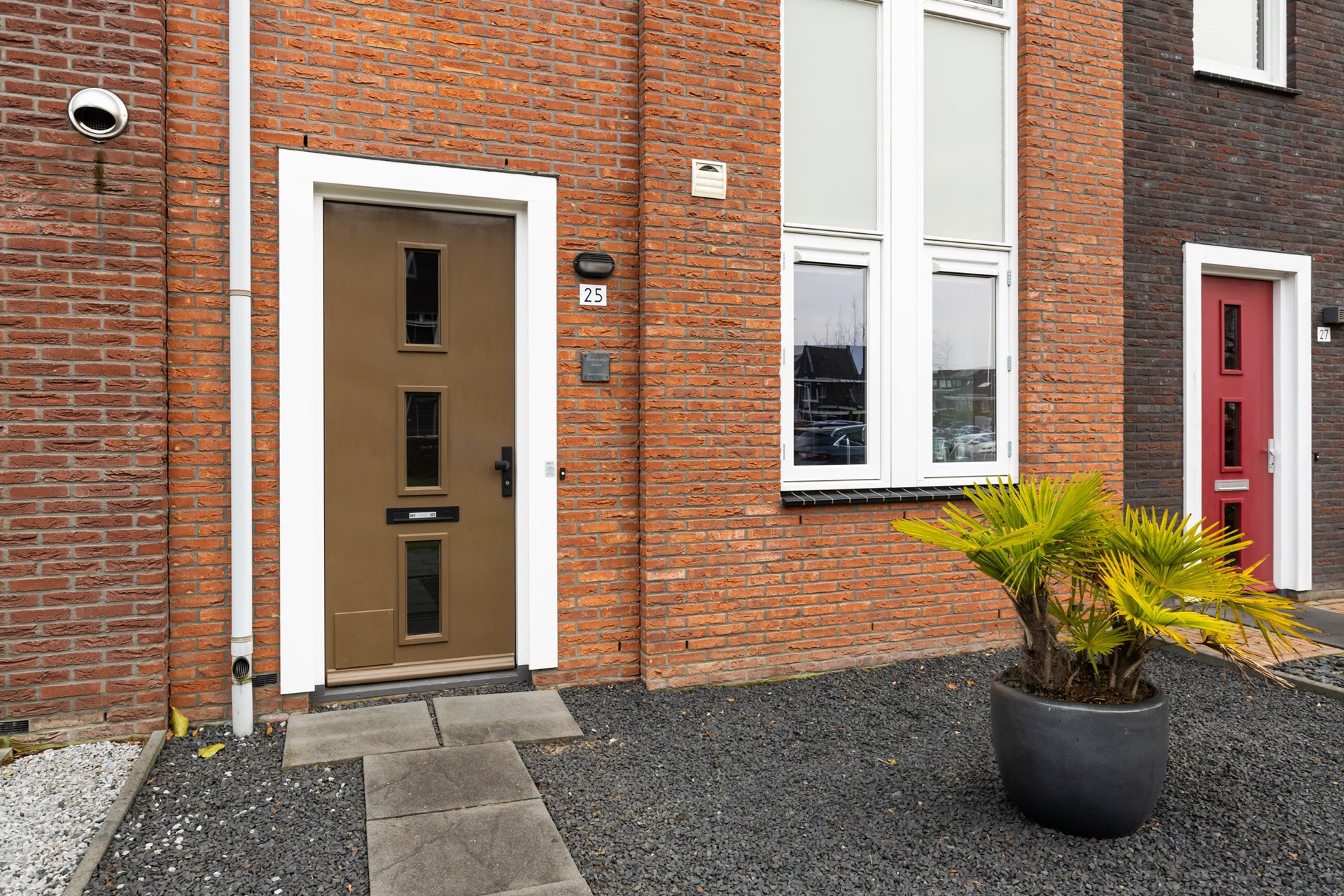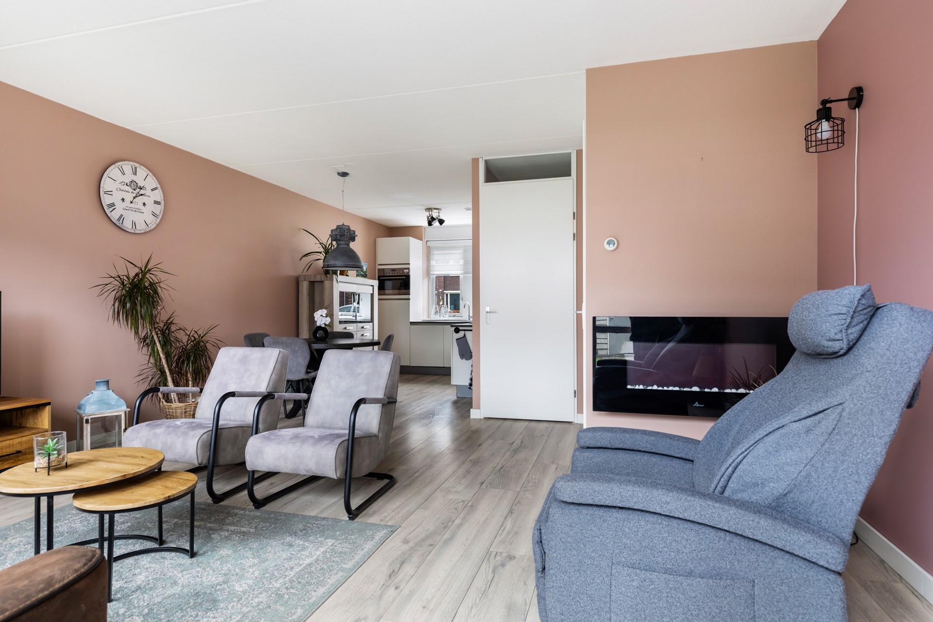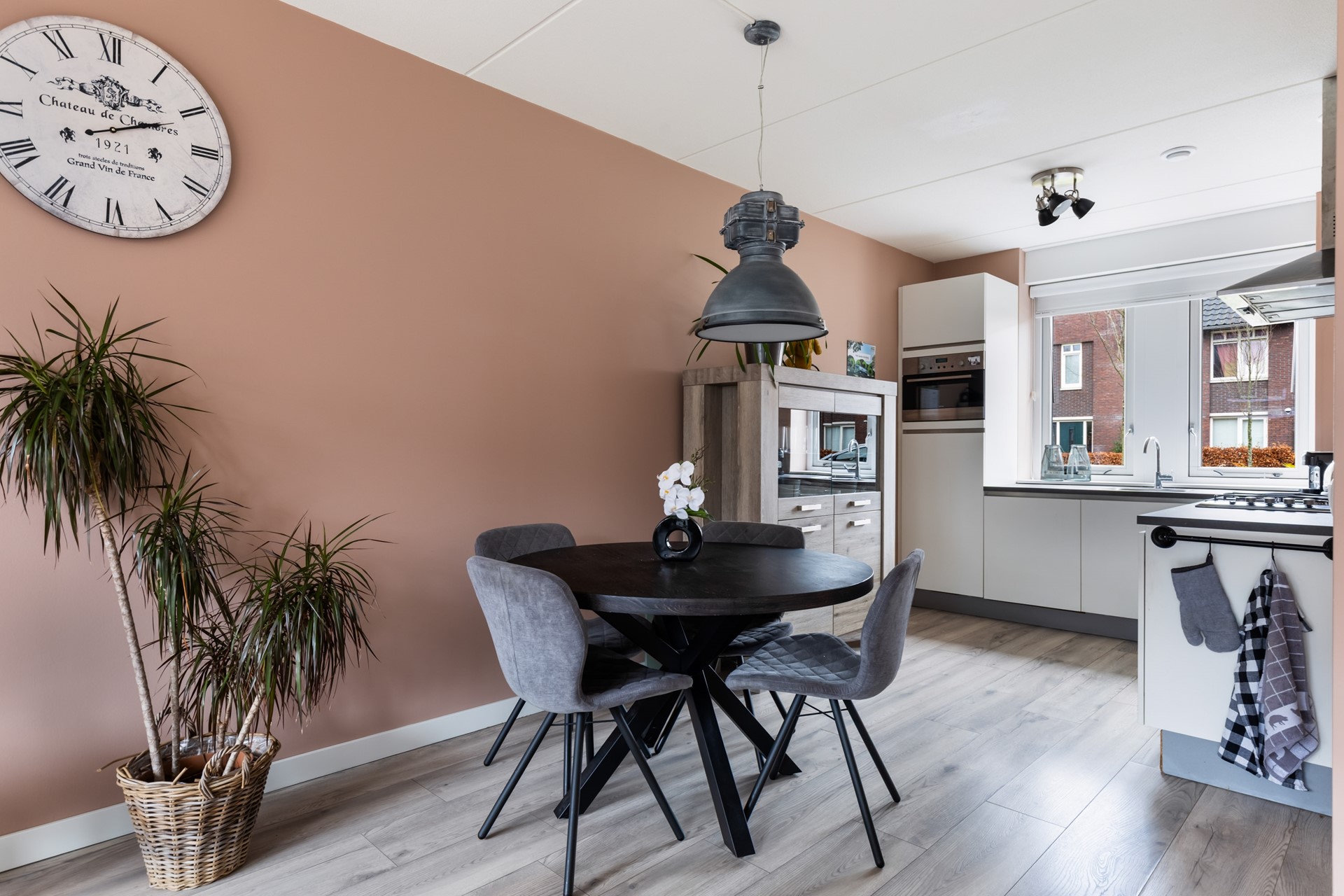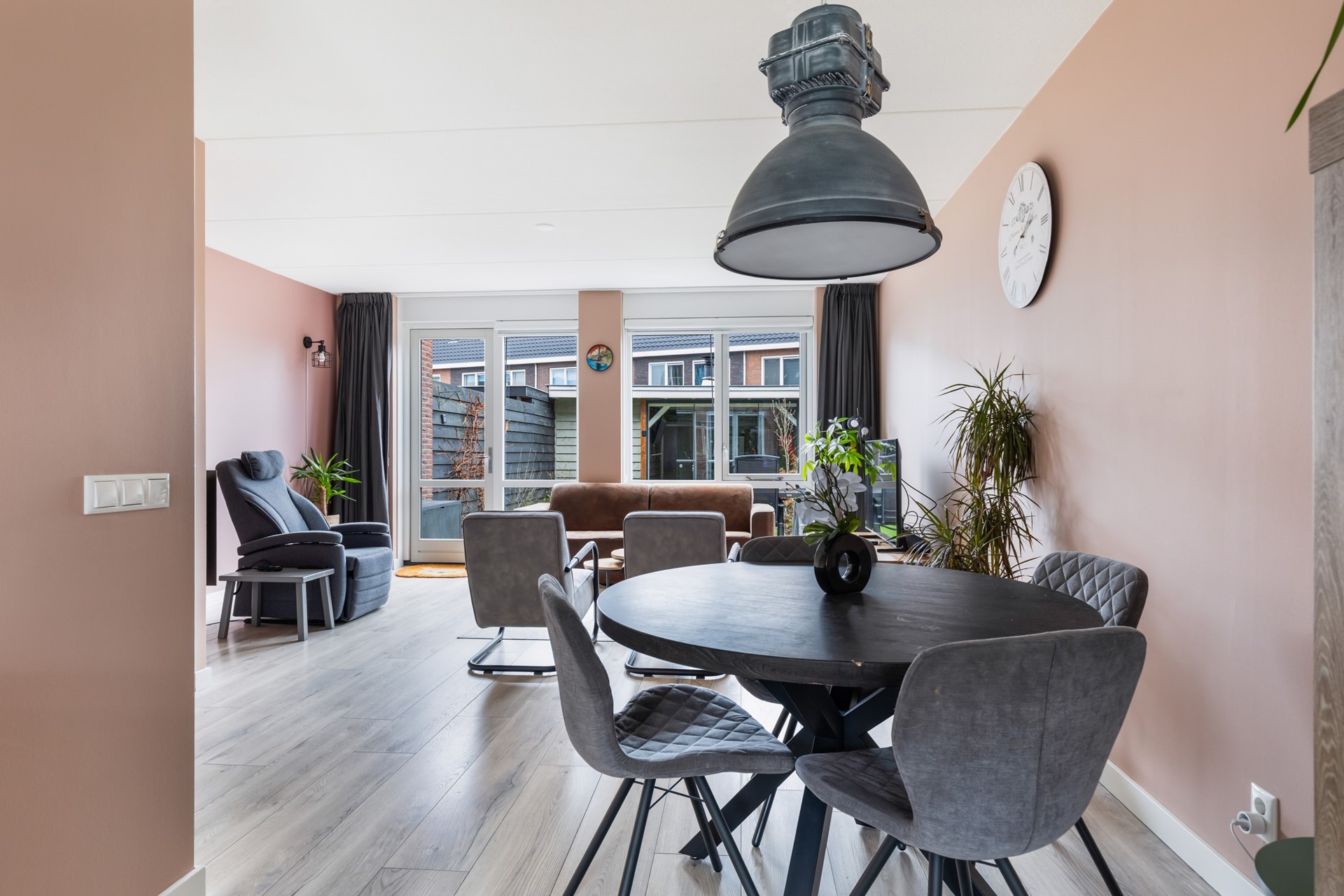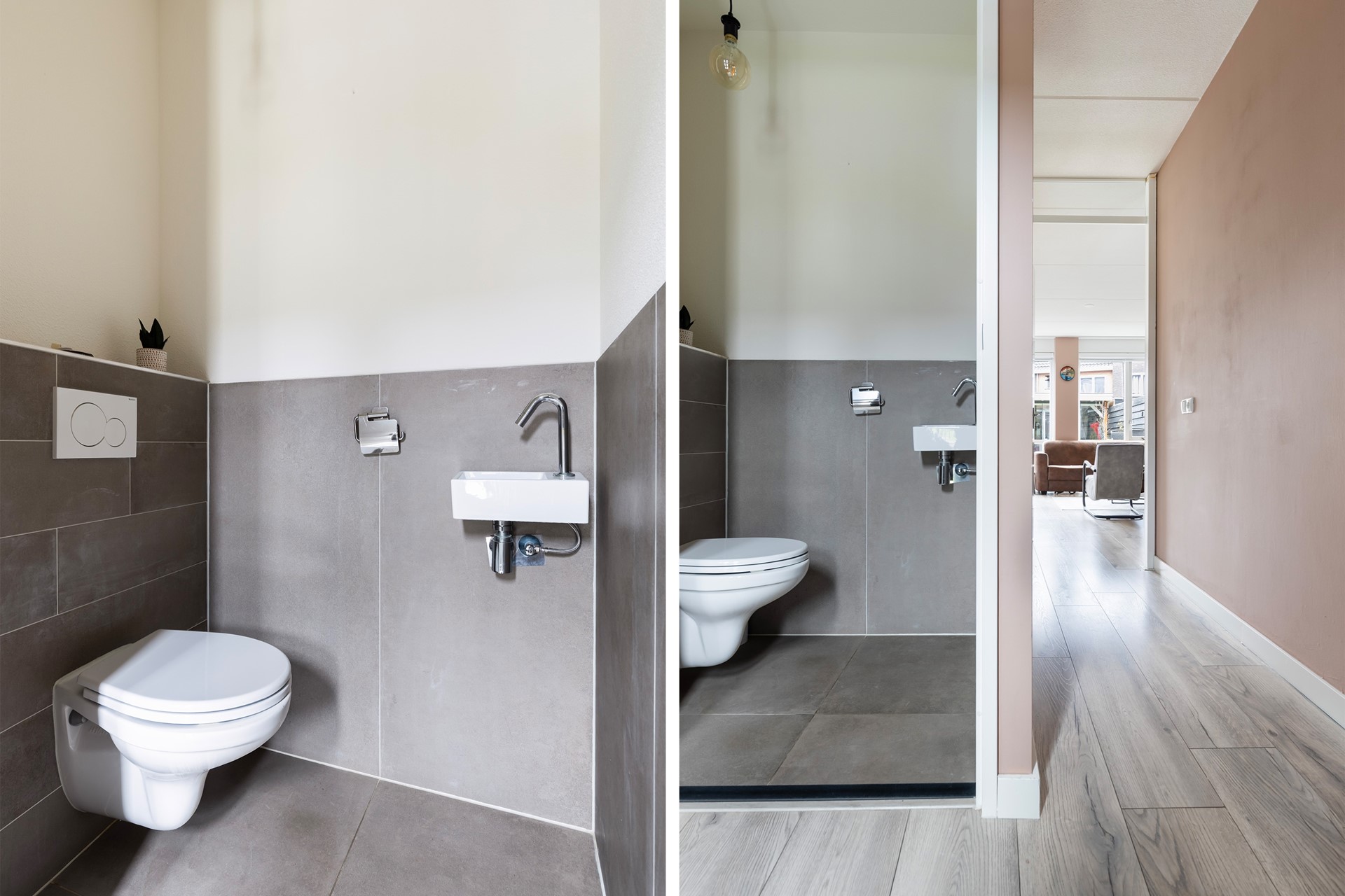 Bij binnenkomst in de woning kom je in de hal, die toegang biedt tot de meterkast (voorzien van glasvezelaansluiting), een modern afgewerkte toiletruimte met wandcloset en fonteintje, de trap naar de eerste verdieping en de woonkamer. De uitgebouwde, tuingerichte woonkamer is licht en ruim dankzij het grote raam en de loopdeur naar de achtertuin, die een mooie verbinding met buiten creëren. Aan de voorzijde van de woning bevindt zich de open keuken in een lichte kleurstelling met een praktische hoekopstelling. De keuken is volledig uitgerust met inbouwapparatuur, waaronder een 4-pitsgaskookplaat, afzuigkap, combi-oven/magnetron, koelkast en een vaatwasser (2025). De gehele begane grond is afgewerkt met een laminaatvloer met vloerverwarming. Daarnaast is er een handige provisieruimte aanwezig voor extra opbergruimte.