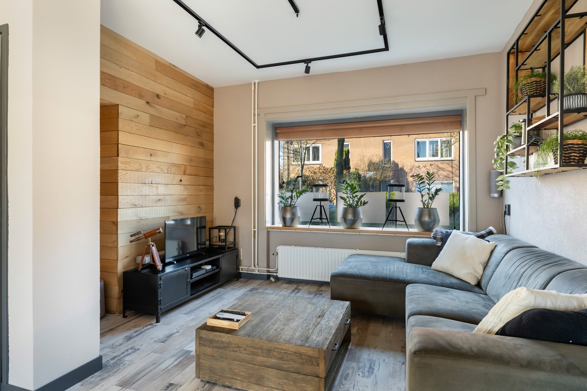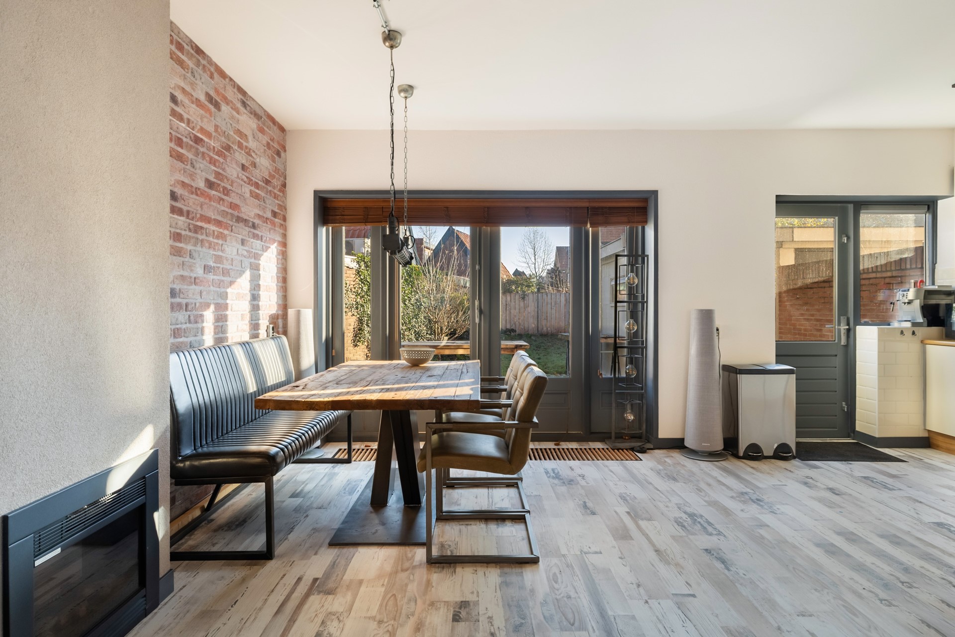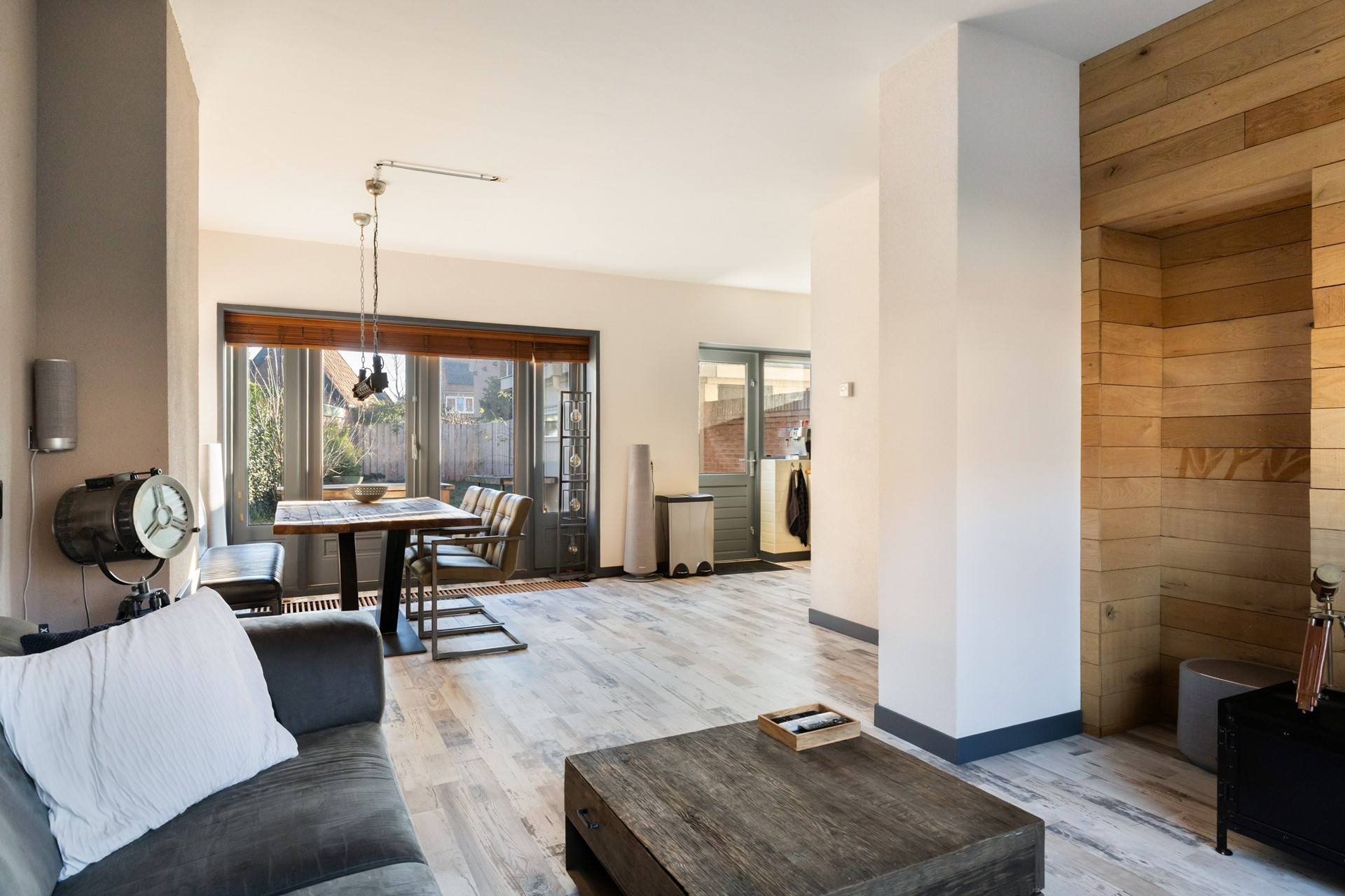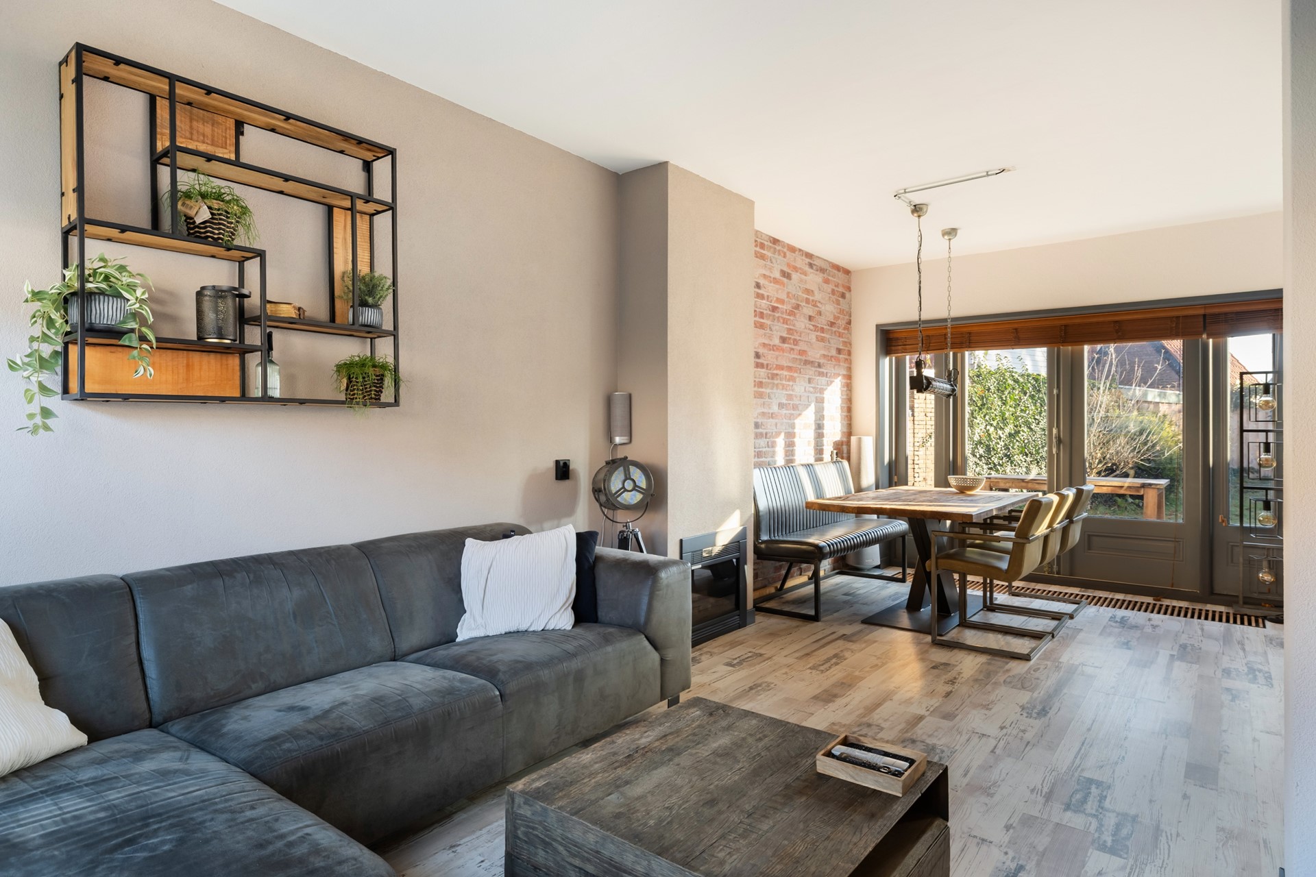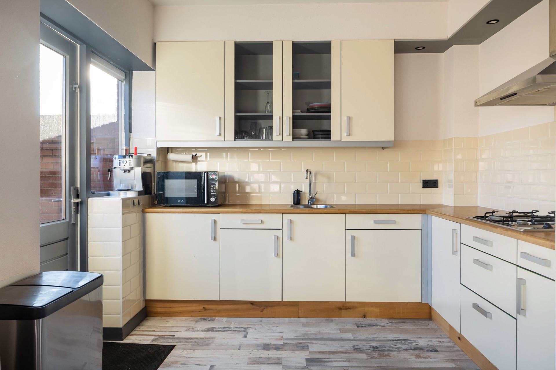 Via de entree stap je binnen in de hal, die toegang geeft tot de toiletruimte, de kelderkast, de trapopgang naar de eerste verdieping, de meterkast met glasvezelaansluiting en de woonkamer. De woonkamer, gelegen aan de voorzijde van de woning, beschikt over een royaal raampartij waardoor er veel natuurlijk licht binnenvalt. De gezellige haard vormt een sfeervol middelpunt van de ruimte. Aansluitend bevindt zich de ruime eethoek, waar je dankzij de openslaande deuren zo het terras opstapt. De open keuken sluit naadloos aan op de eethoek en is uitgevoerd in een praktische hoekopstelling. Deze is voorzien van een gasfornuis, afzuigkap en koelkast. Vanuit de keuken is er eveneens een loopdeur naar de tuin, wat zorgt voor extra gemak en verbinding met buiten.