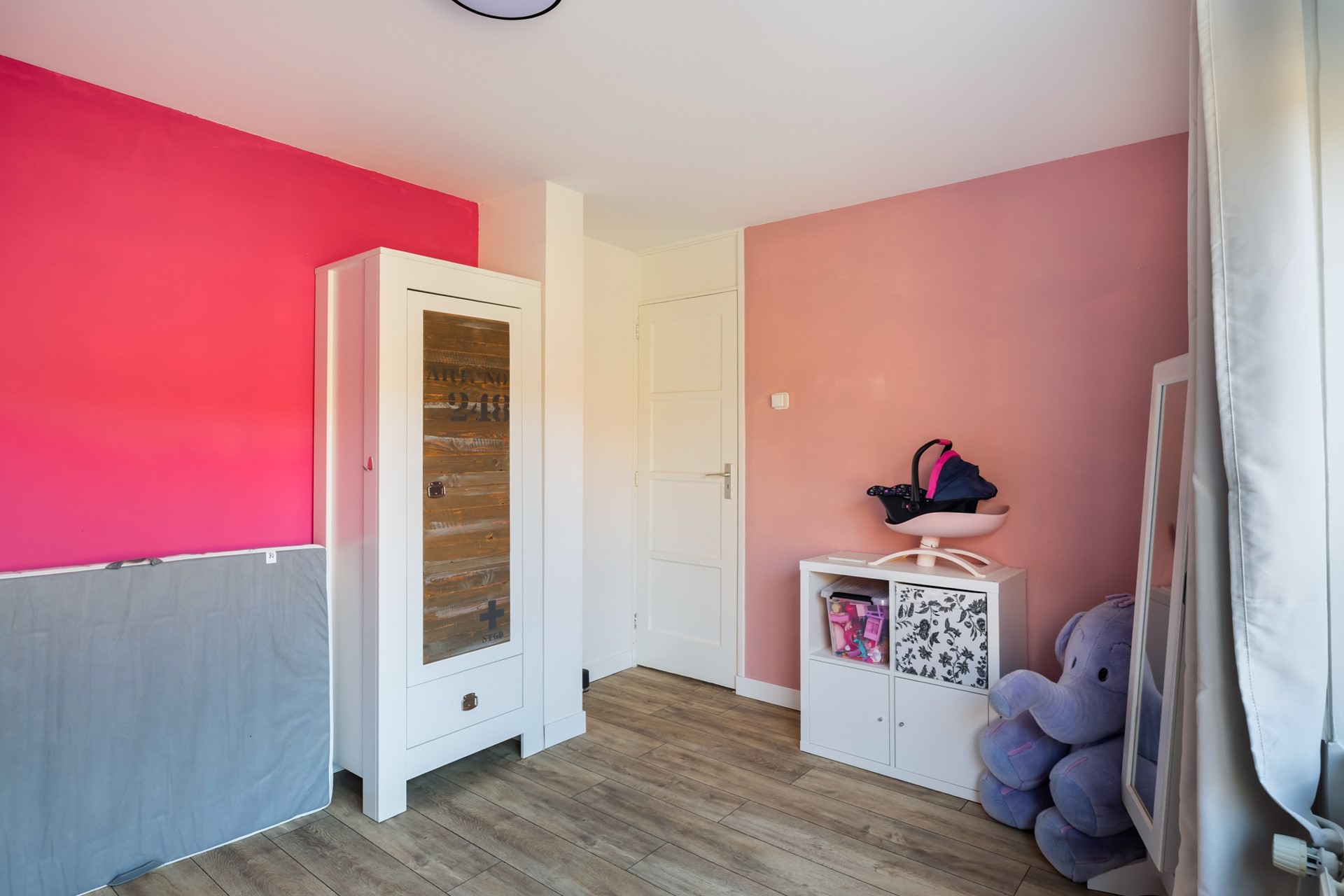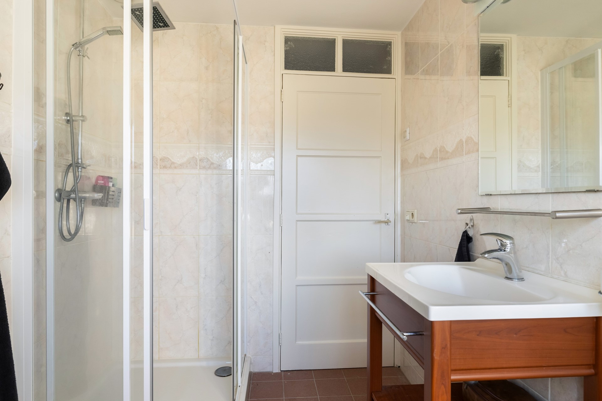 Via de vaste trap bereik je de ruime overloop, die toegang biedt tot de twee slaapkamers en de badkamer. De badkamer is eenvoudig maar praktisch ingericht met een douche en een wastafel. De twee slaapkamers op deze verdieping — één aan de voorzijde en één aan de achterzijde — zijn beide netjes afgewerkt met gladde wanden en een strak plafond.