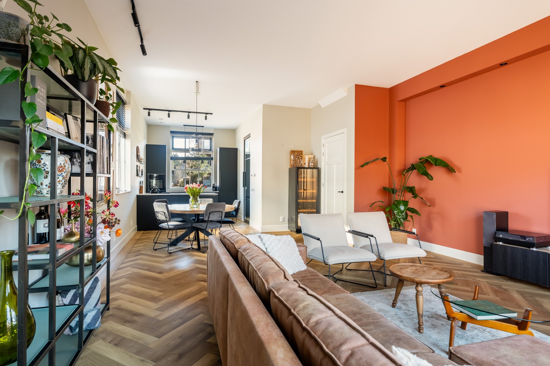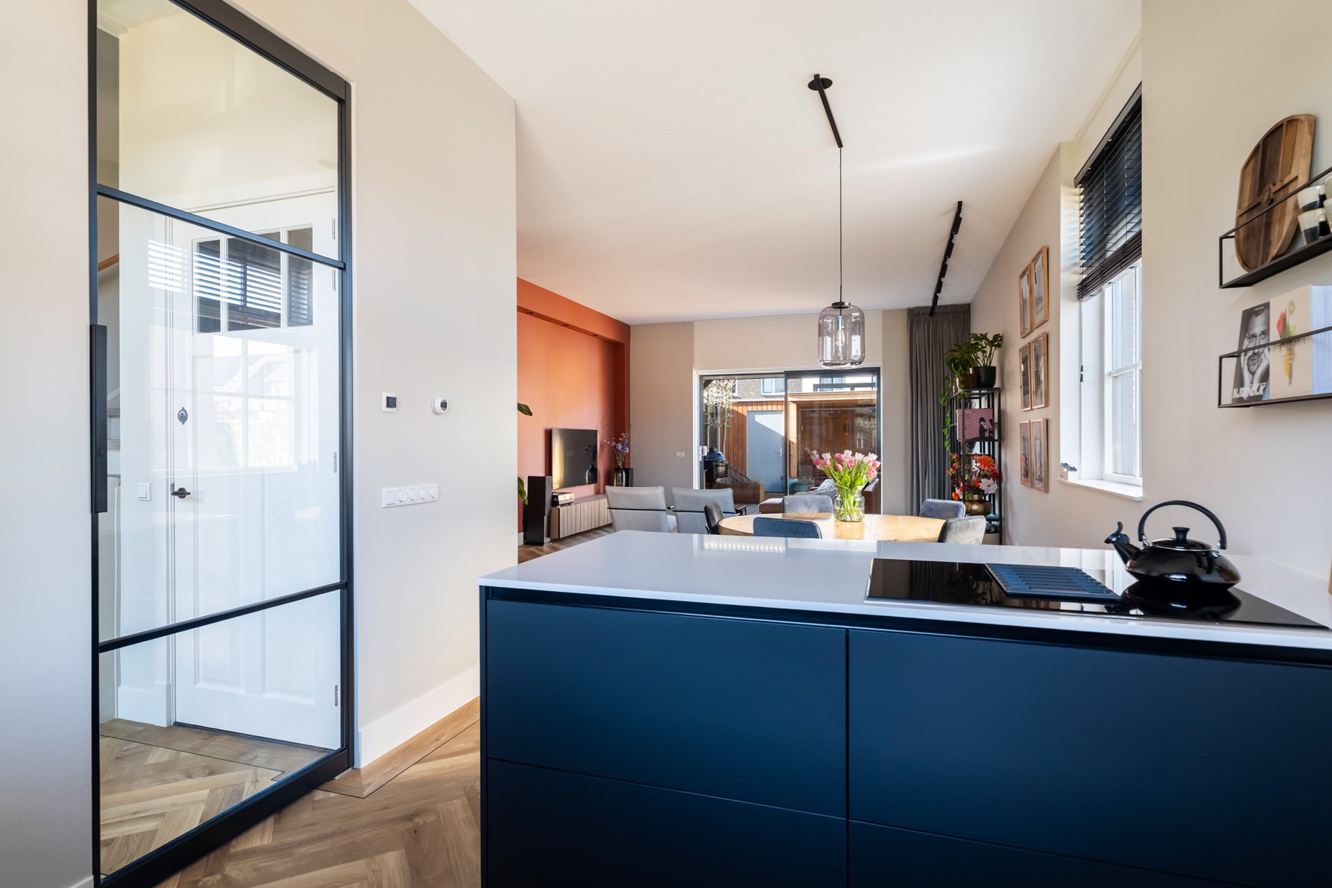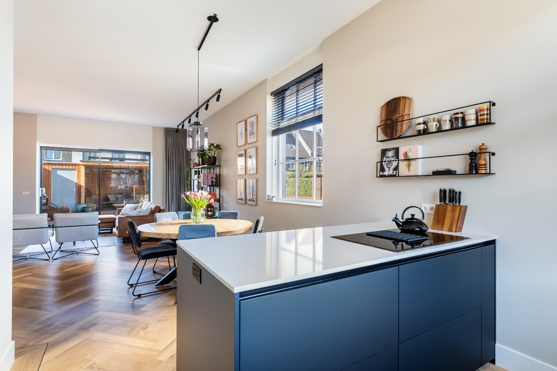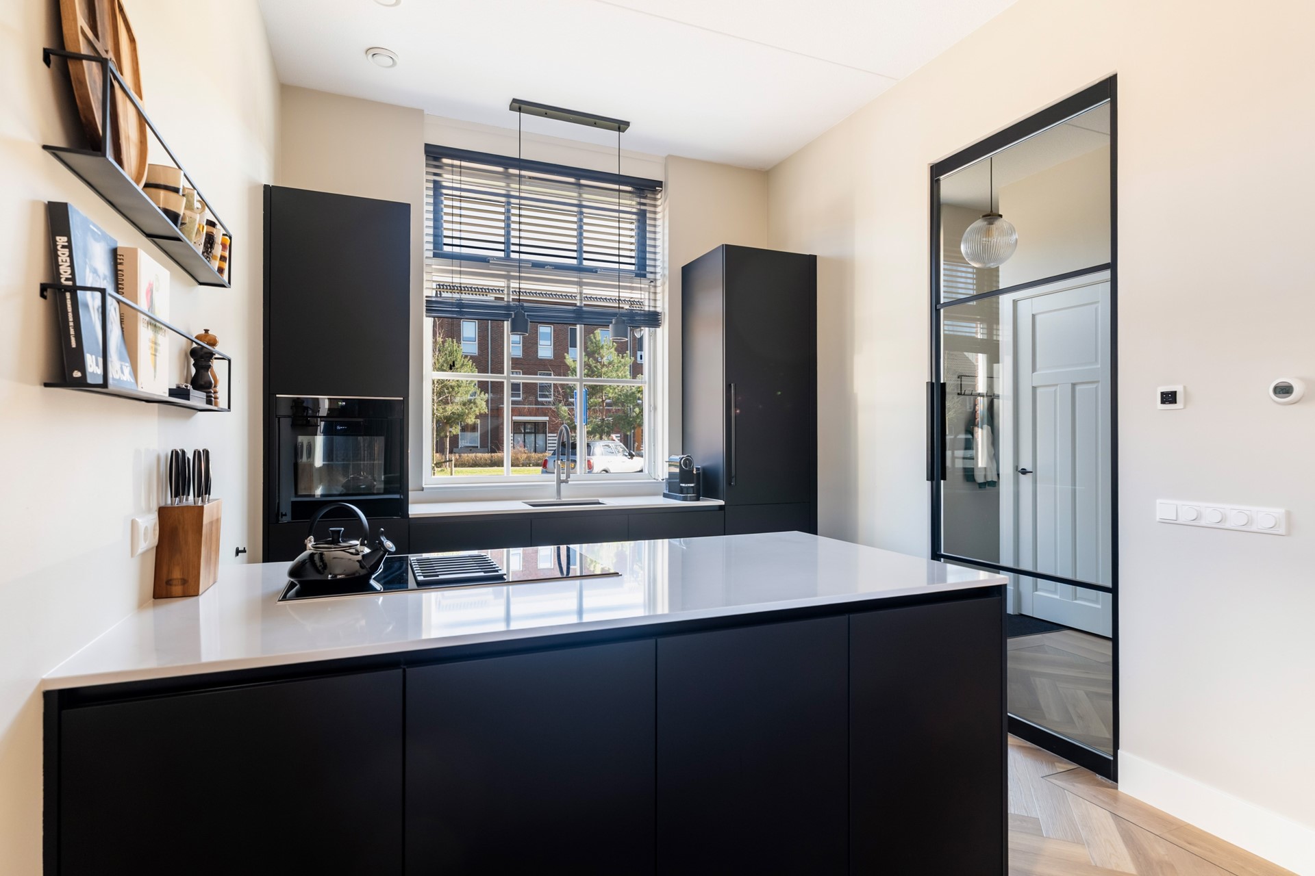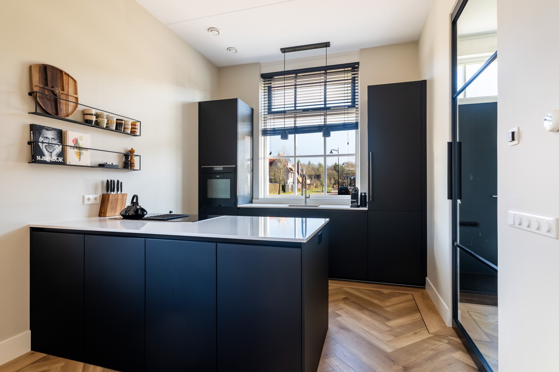 Via de hal met trapopgang, meterkast en toilet stap je het woongedeelte binnen, waar direct het ruimtelijke gevoel opvalt dankzij het hoge plafond en de grote raampartijen. Het prettige daglicht geeft de woonkamer een warme, open uitstraling. De strak afgewerkte wanden, paneeldeuren, hoge plinten en de visgraat pvc-vloer met comfortabele vloerverwarming zorgen voor een hoogwaardige en stijlvolle basis. Binnen en buiten zijn moeiteloos met elkaar verbonden dankzij de aanwezigheid van de schuifpui en hierdoor heb je een prachtig zicht op de karakteristieke ENKA-schoorsteen. De woonkamer is overzichtelijk opgezet met alle ruimte voor een fijne zit- en eethoek en biedt ook een praktische trapkast. Vanuit de keuken aan de voorzijde geniet je van een vrij uitzicht richting de bosrand. Deze moderne keuken met rechte opstelling en kook-/schiereiland heeft een luxe uitstraling en is uitgerust met hoogwaardige inbouwapparatuur, waaronder een inductiekookplaat met geïntegreerde afzuiging, combi-oven, koel-/vriescombinatie en een vaatwasser.