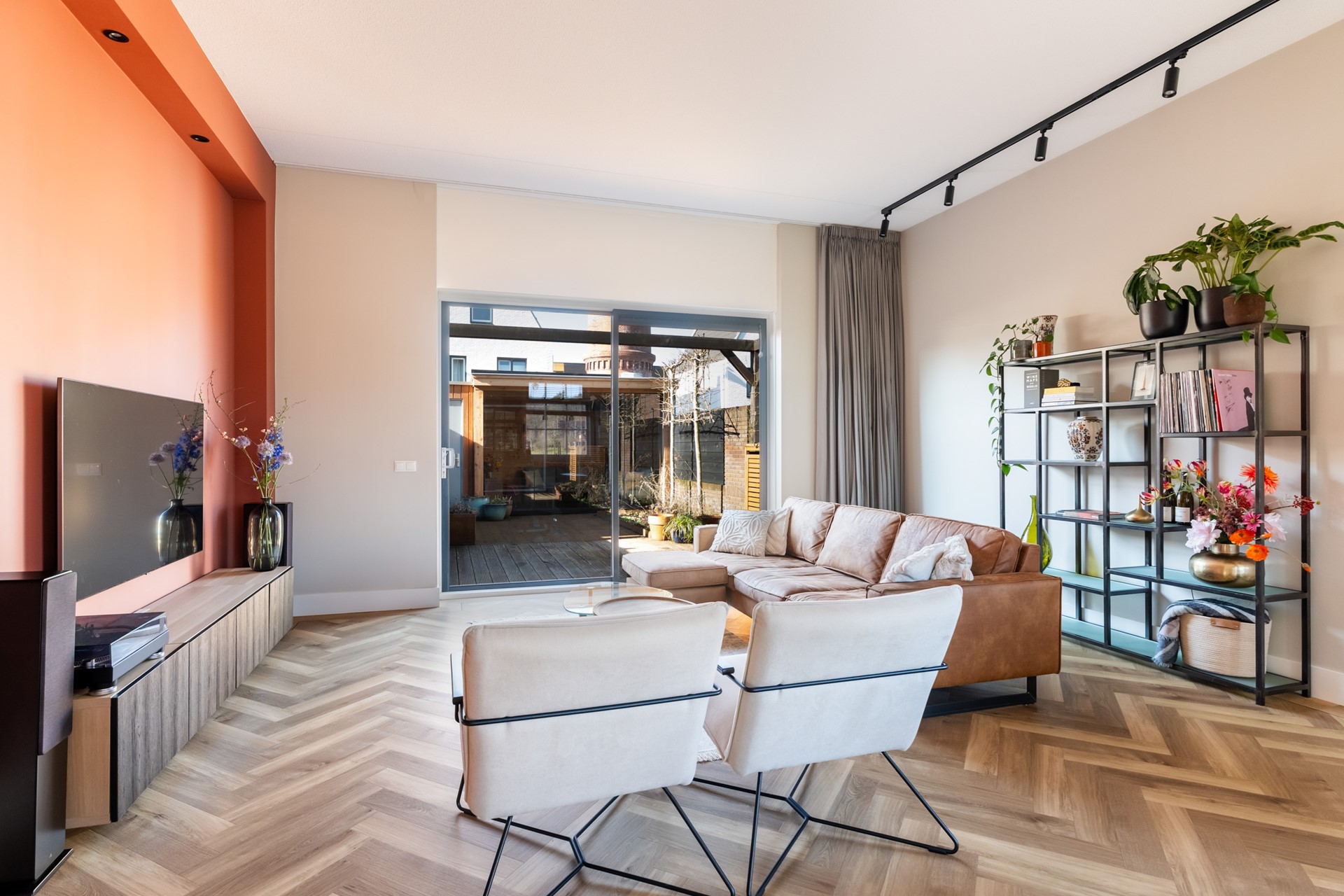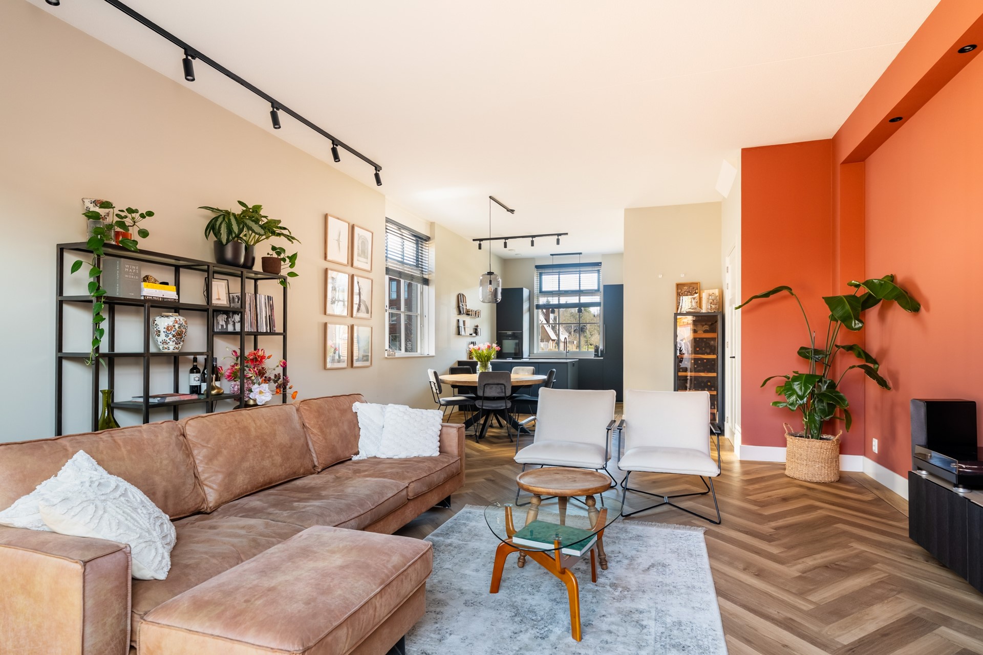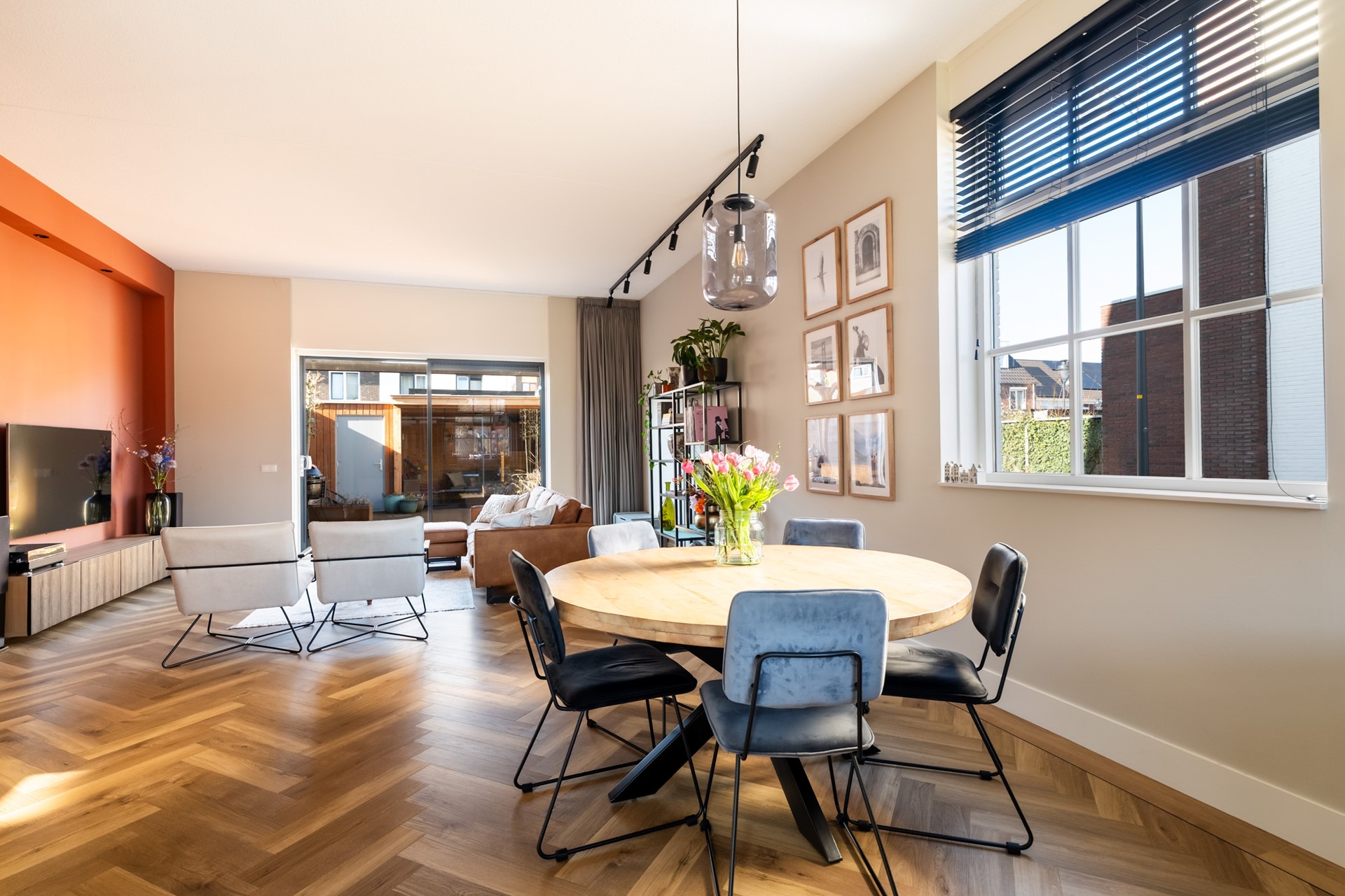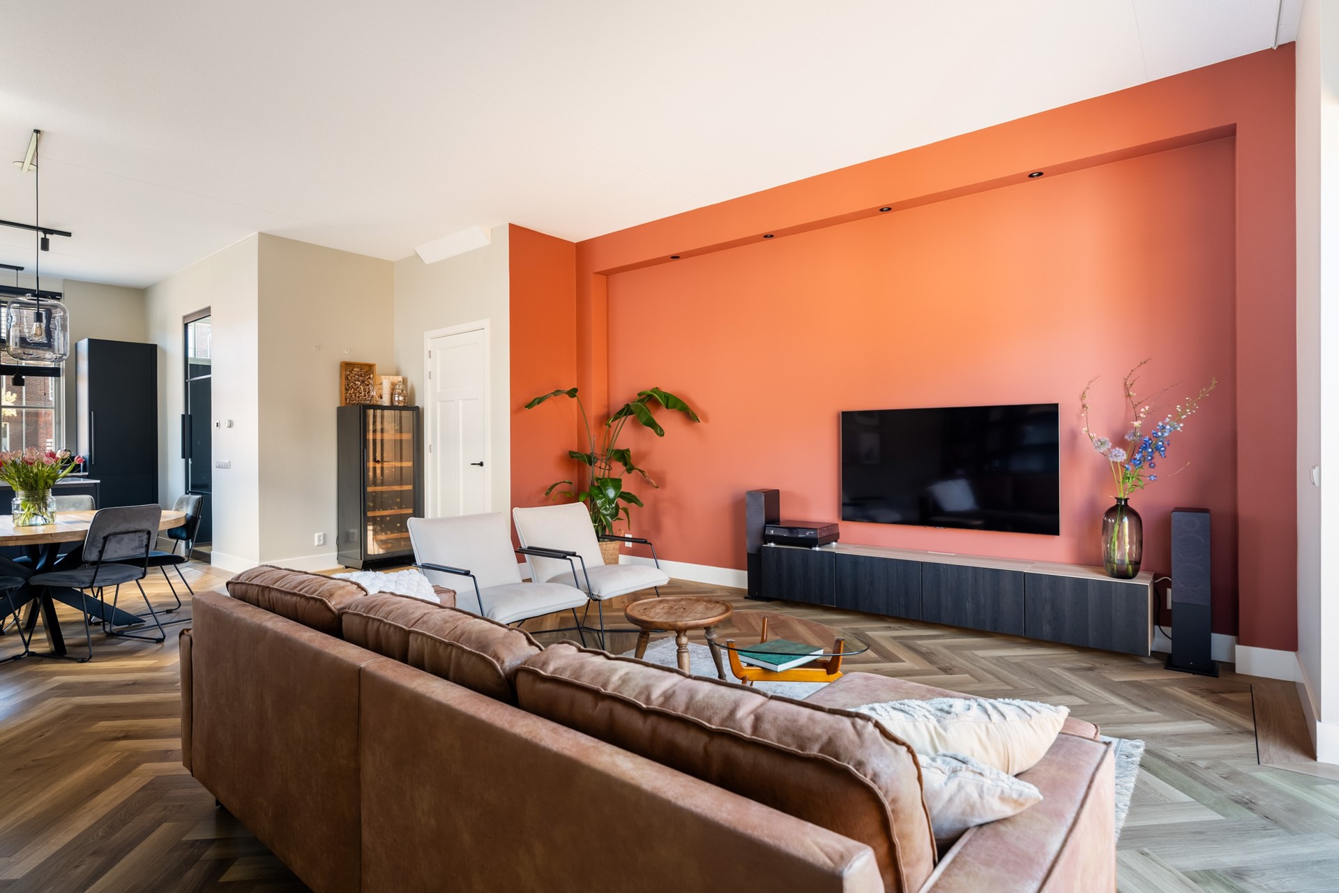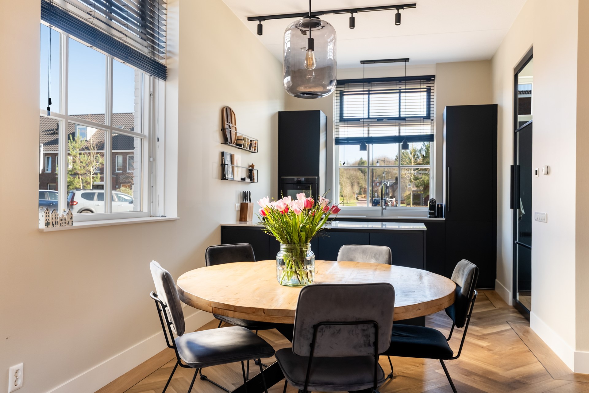Via de hal met trapopgang, meterkast en toilet stap je het woongedeelte binnen, waar direct het ruimtelijke gevoel opvalt dankzij het hoge plafond en de grote raampartijen. Het prettige daglicht geeft de woonkamer een warme, open uitstraling. De strak afgewerkte wanden, paneeldeuren, hoge plinten en de visgraat pvc-vloer met comfortabele vloerverwarming zorgen voor een hoogwaardige en stijlvolle basis. Binnen en buiten zijn moeiteloos met elkaar verbonden dankzij de aanwezigheid van de schuifpui en hierdoor heb je een prachtig zicht op de karakteristieke ENKA-schoorsteen. De woonkamer is overzichtelijk opgezet met alle ruimte voor een fijne zit- en eethoek en biedt ook een praktische trapkast. Vanuit de keuken aan de voorzijde geniet je van een vrij uitzicht richting de bosrand. Deze moderne keuken met rechte opstelling en kook-/schiereiland heeft een luxe uitstraling en is uitgerust met hoogwaardige inbouwapparatuur, waaronder een inductiekookplaat met geïntegreerde afzuiging, combi-oven, koel-/vriescombinatie en een vaatwasser.