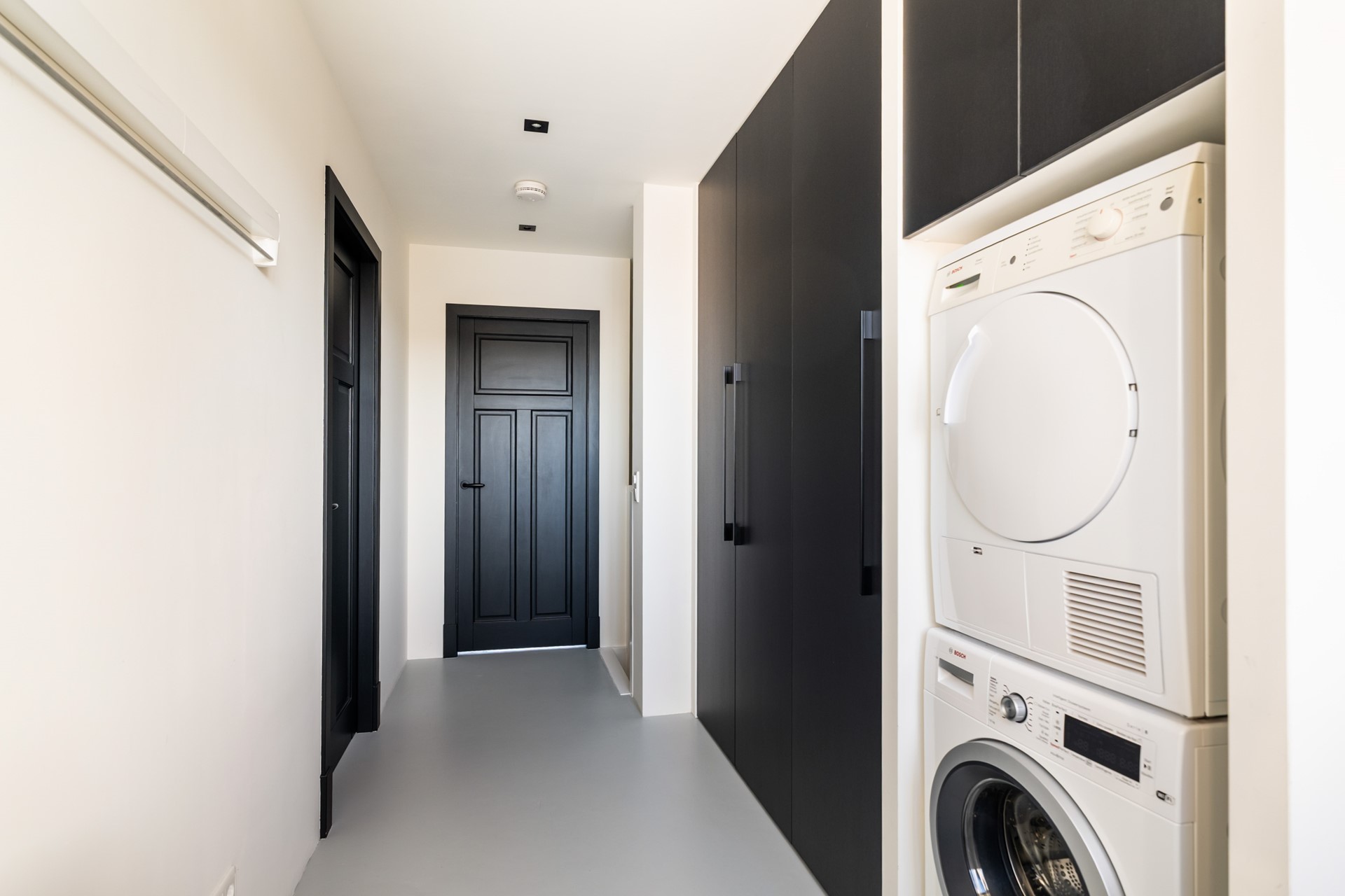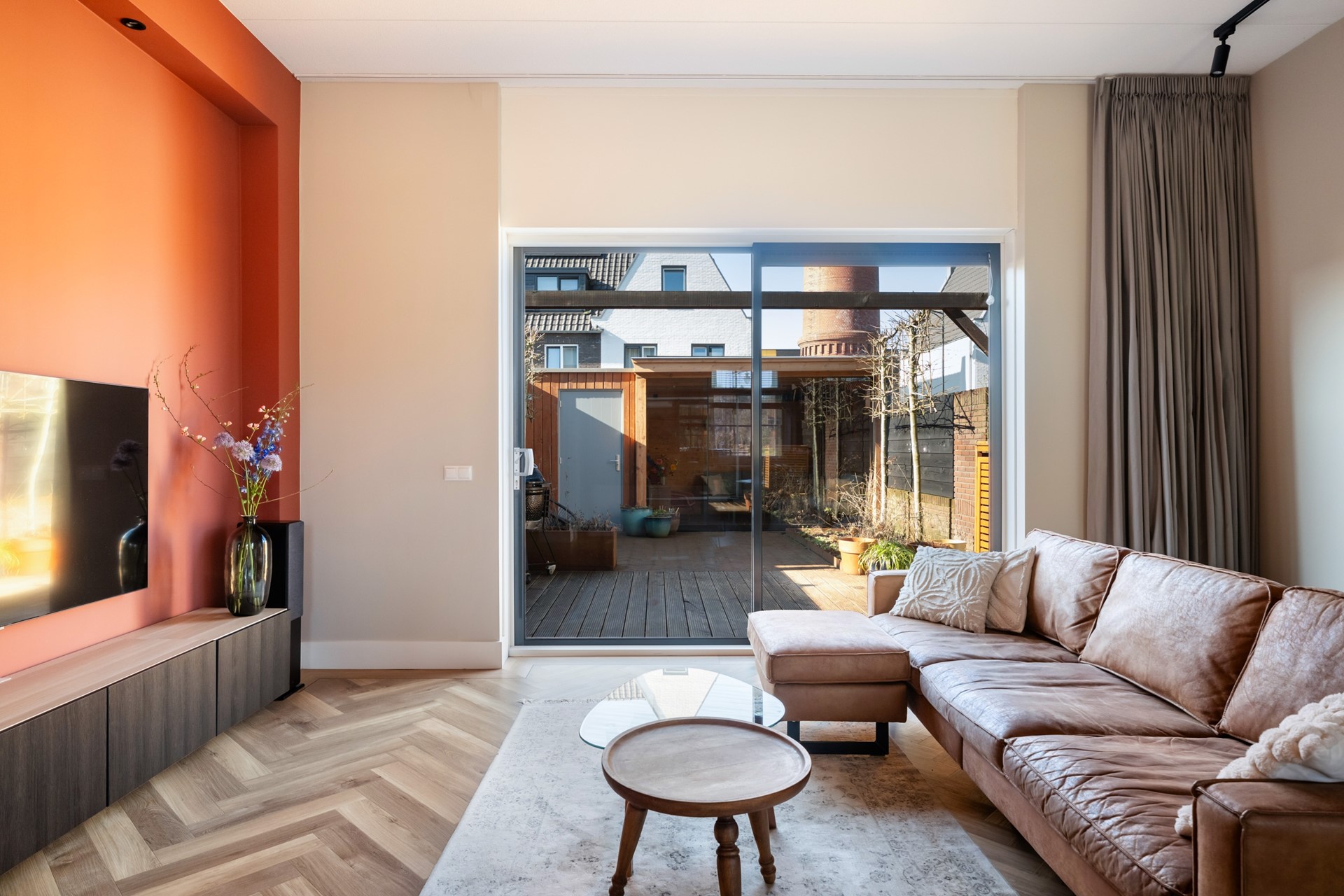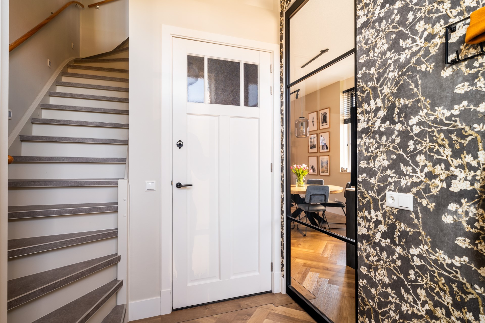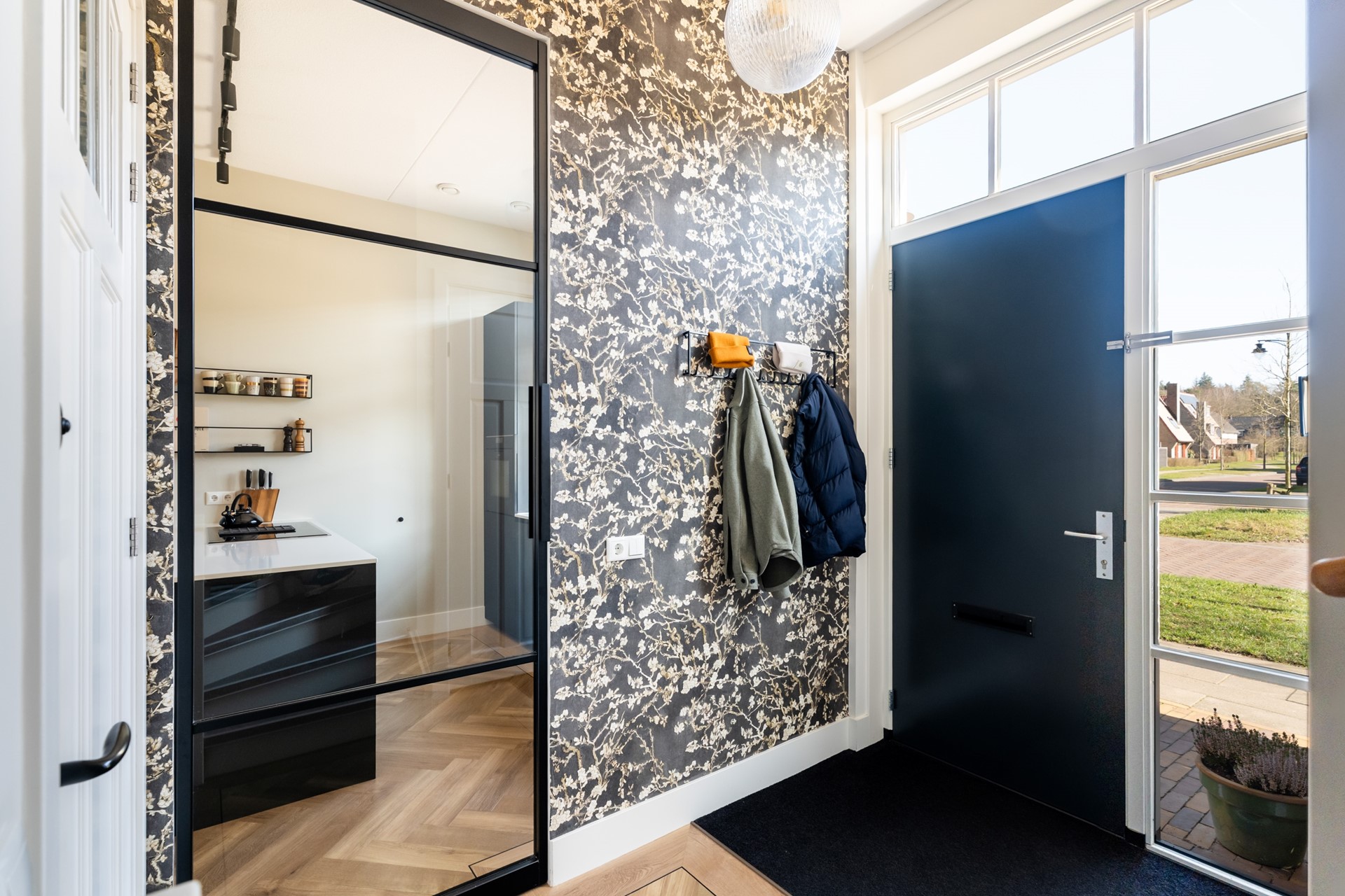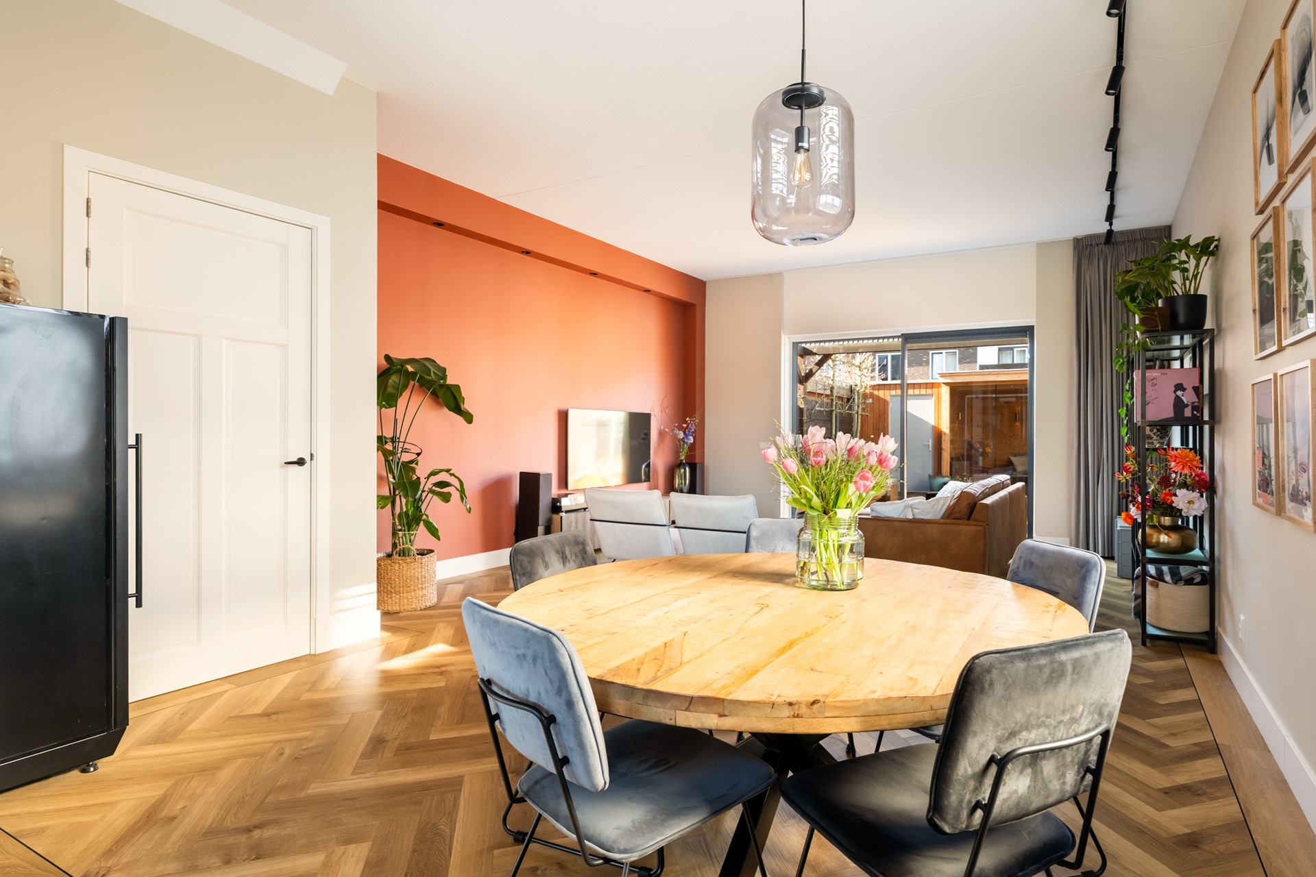 Via de hal met trapopgang, meterkast en toilet stap je het woongedeelte binnen, waar direct het ruimtelijke gevoel opvalt dankzij het hoge plafond en de grote raampartijen. Het prettige daglicht geeft de woonkamer een warme, open uitstraling. De strak afgewerkte wanden, paneeldeuren, hoge plinten en de visgraat pvc-vloer met comfortabele vloerverwarming zorgen voor een hoogwaardige en stijlvolle basis. Binnen en buiten zijn moeiteloos met elkaar verbonden dankzij de aanwezigheid van de schuifpui en hierdoor heb je een prachtig zicht op de karakteristieke ENKA-schoorsteen. De woonkamer is overzichtelijk opgezet met alle ruimte voor een fijne zit- en eethoek en biedt ook een praktische trapkast. Vanuit de keuken aan de voorzijde geniet je van een vrij uitzicht richting de bosrand. Deze moderne keuken met rechte opstelling en kook-/schiereiland heeft een luxe uitstraling en is uitgerust met hoogwaardige inbouwapparatuur, waaronder een inductiekookplaat met geïntegreerde afzuiging, combi-oven, koel-/vriescombinatie en een vaatwasser.