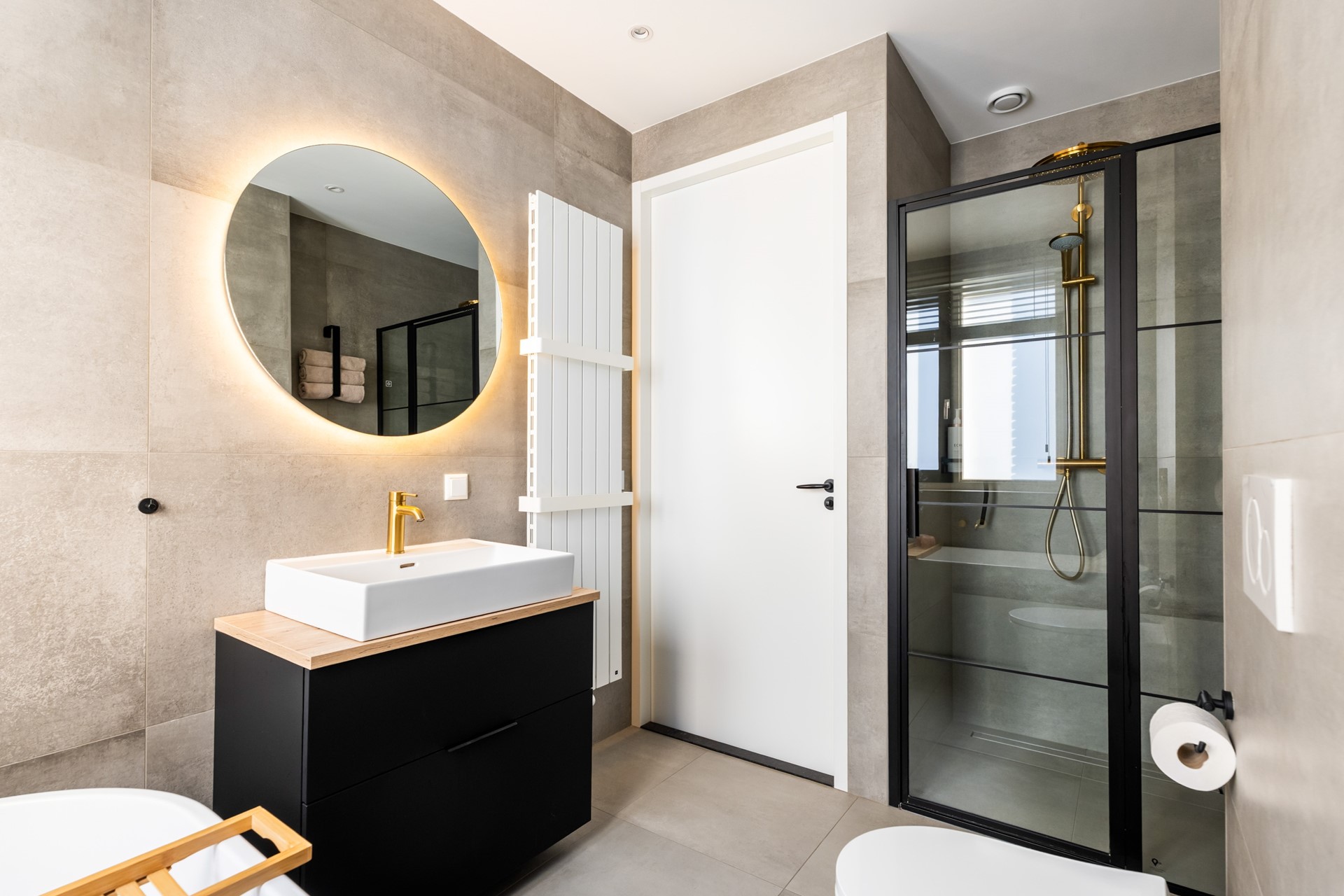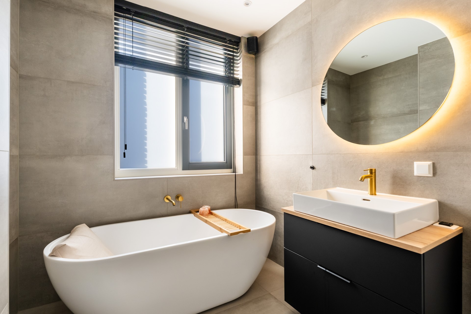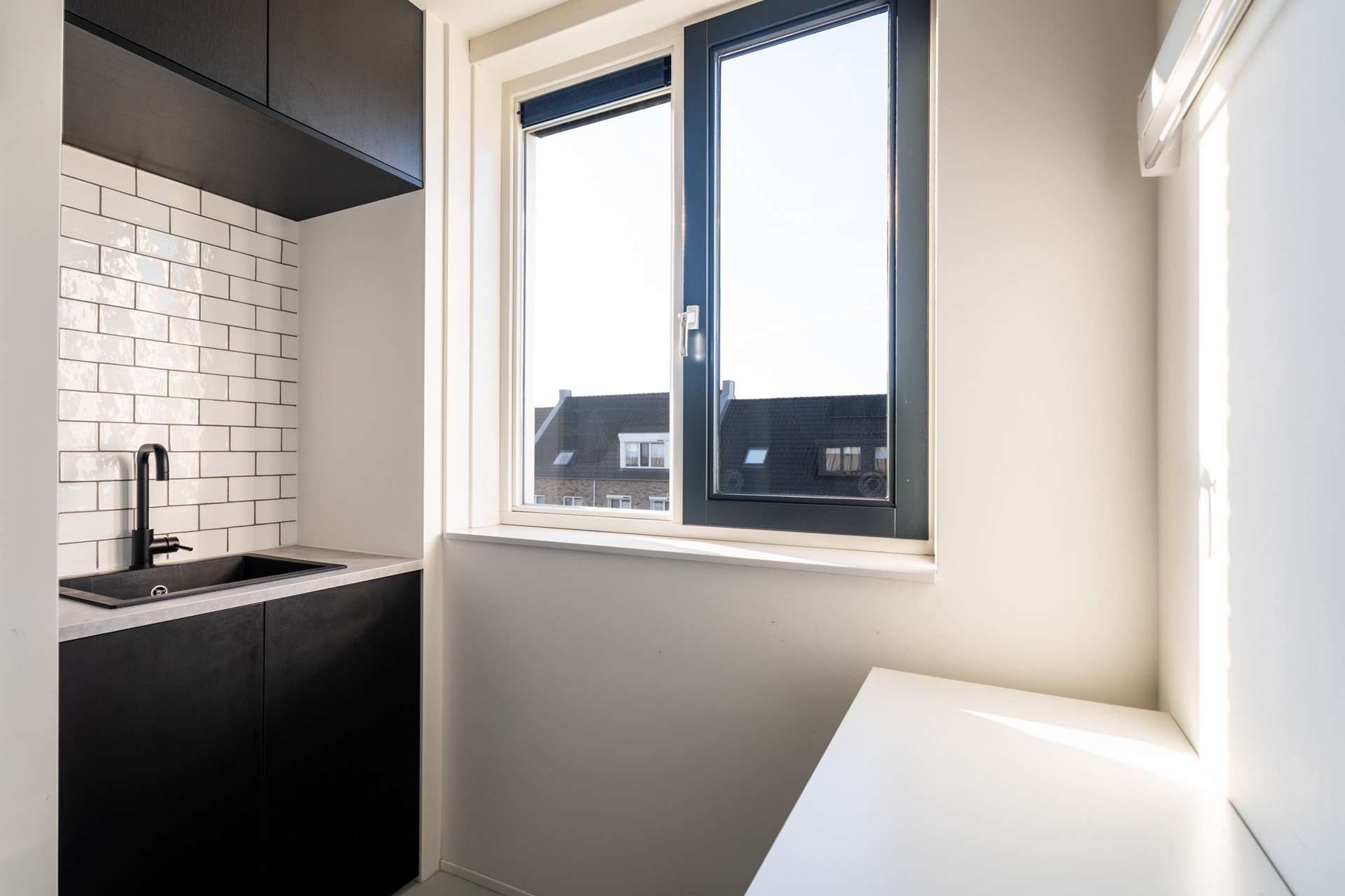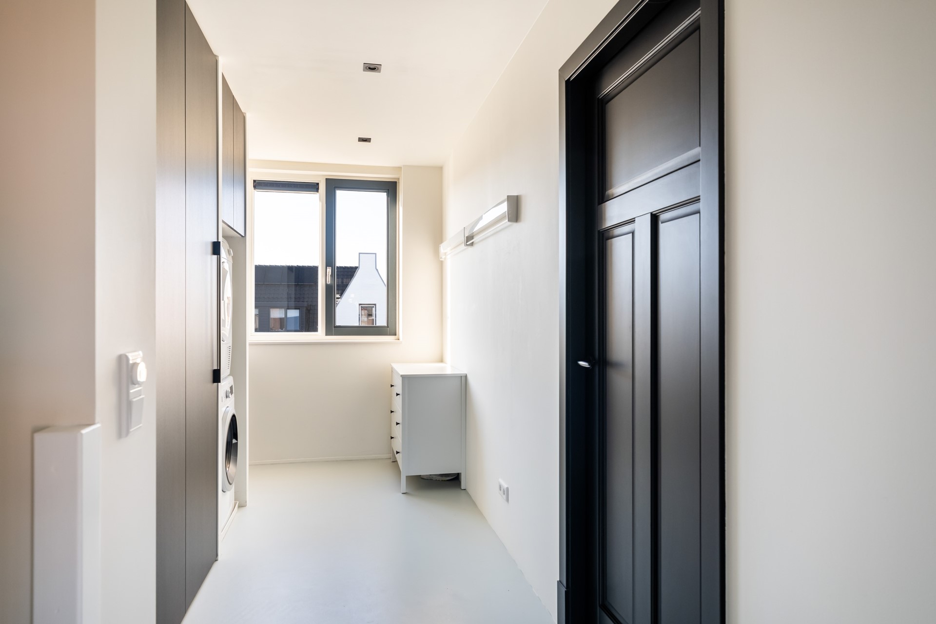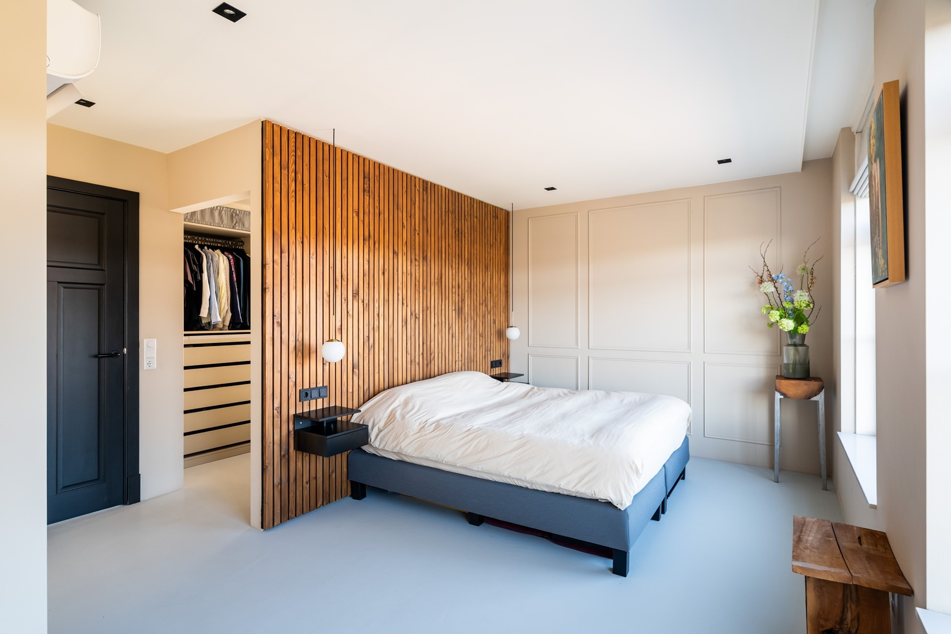 Via de hal met trapopgang, meterkast en toilet stap je het woongedeelte binnen, waar direct het ruimtelijke gevoel opvalt dankzij het hoge plafond en de grote raampartijen. Het prettige daglicht geeft de woonkamer een warme, open uitstraling. De strak afgewerkte wanden, paneeldeuren, hoge plinten en de visgraat pvc-vloer met comfortabele vloerverwarming zorgen voor een hoogwaardige en stijlvolle basis. Binnen en buiten zijn moeiteloos met elkaar verbonden dankzij de aanwezigheid van de schuifpui en hierdoor heb je een prachtig zicht op de karakteristieke ENKA-schoorsteen. De woonkamer is overzichtelijk opgezet met alle ruimte voor een fijne zit- en eethoek en biedt ook een praktische trapkast. Vanuit de keuken aan de voorzijde geniet je van een vrij uitzicht richting de bosrand. Deze moderne keuken met rechte opstelling en kook-/schiereiland heeft een luxe uitstraling en is uitgerust met hoogwaardige inbouwapparatuur, waaronder een inductiekookplaat met geïntegreerde afzuiging, combi-oven, koel-/vriescombinatie en een vaatwasser.
