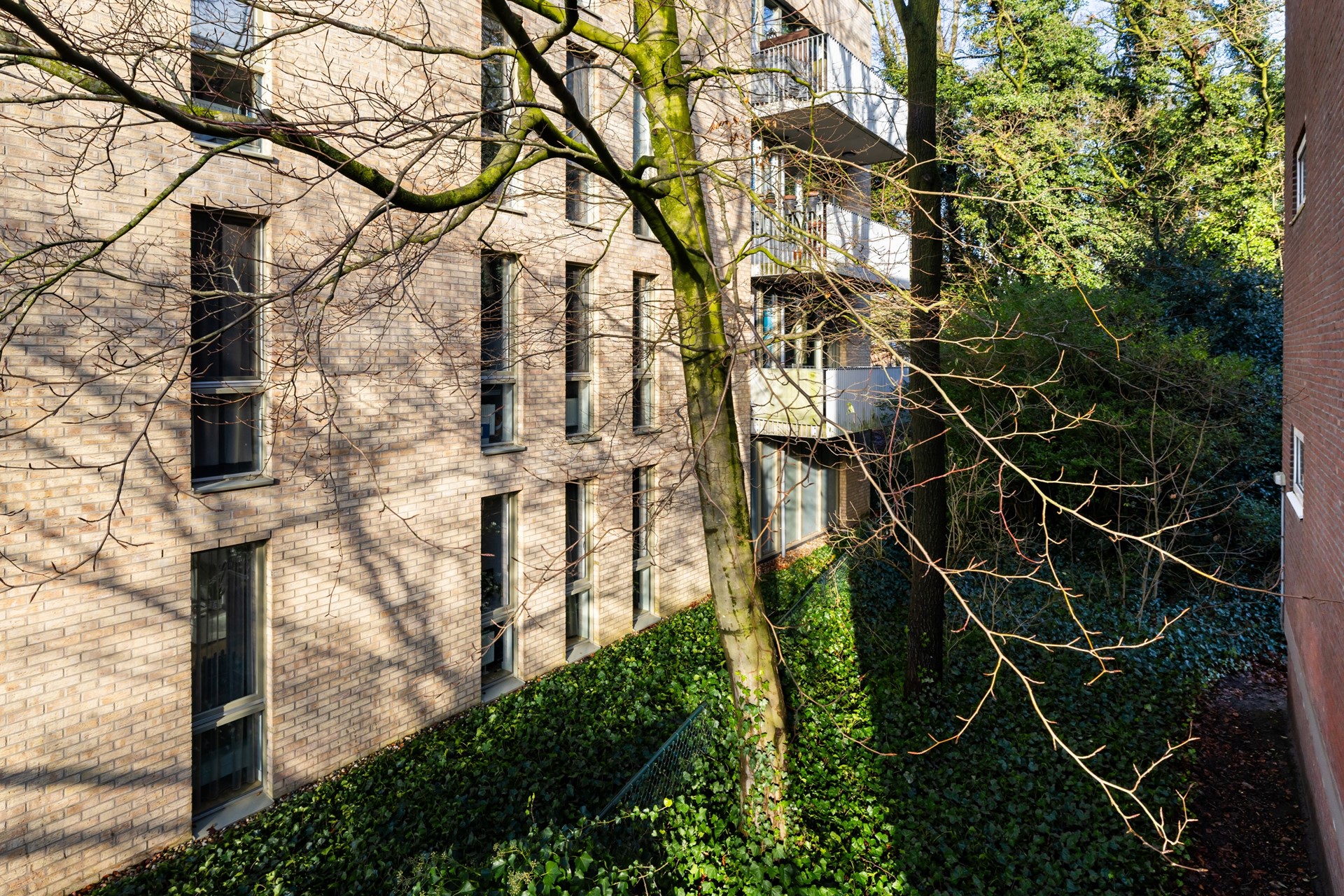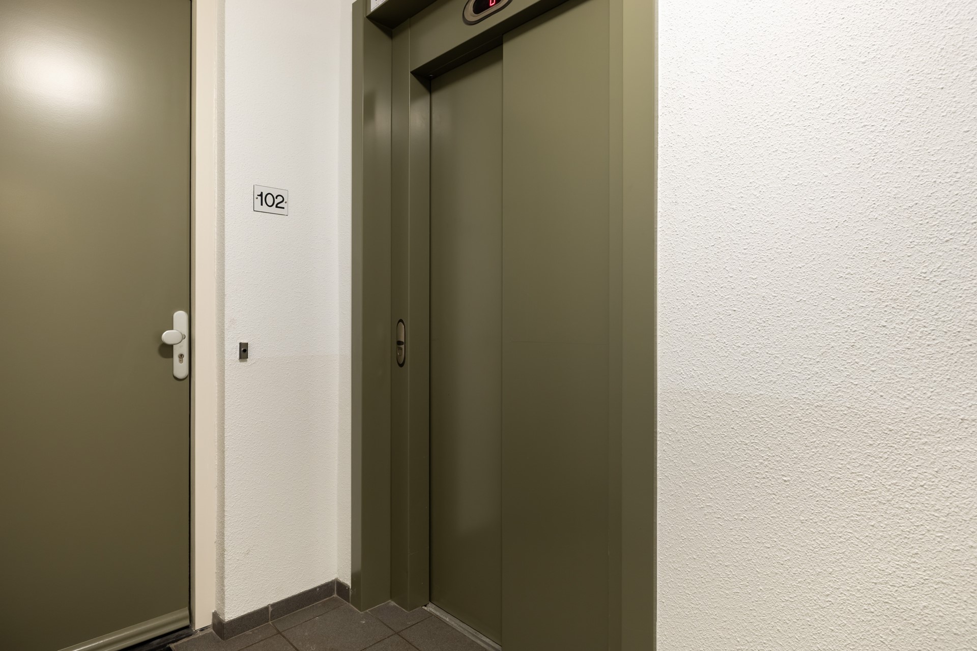 Vanaf het parkeerterrein met een vaste plek voor je auto heb je uitzicht op de appartementengebouwen, waarbij het appartement zich in het meest rechtergebouw bevindt. Aan de achterzijde zijn de gezamenlijke fietsenstalling en de hoofdentree gelegen. De entree is voorzien van brievenbussen en een intercom en geeft toegang tot de trapopgang of de lift naar de tweede verdieping.