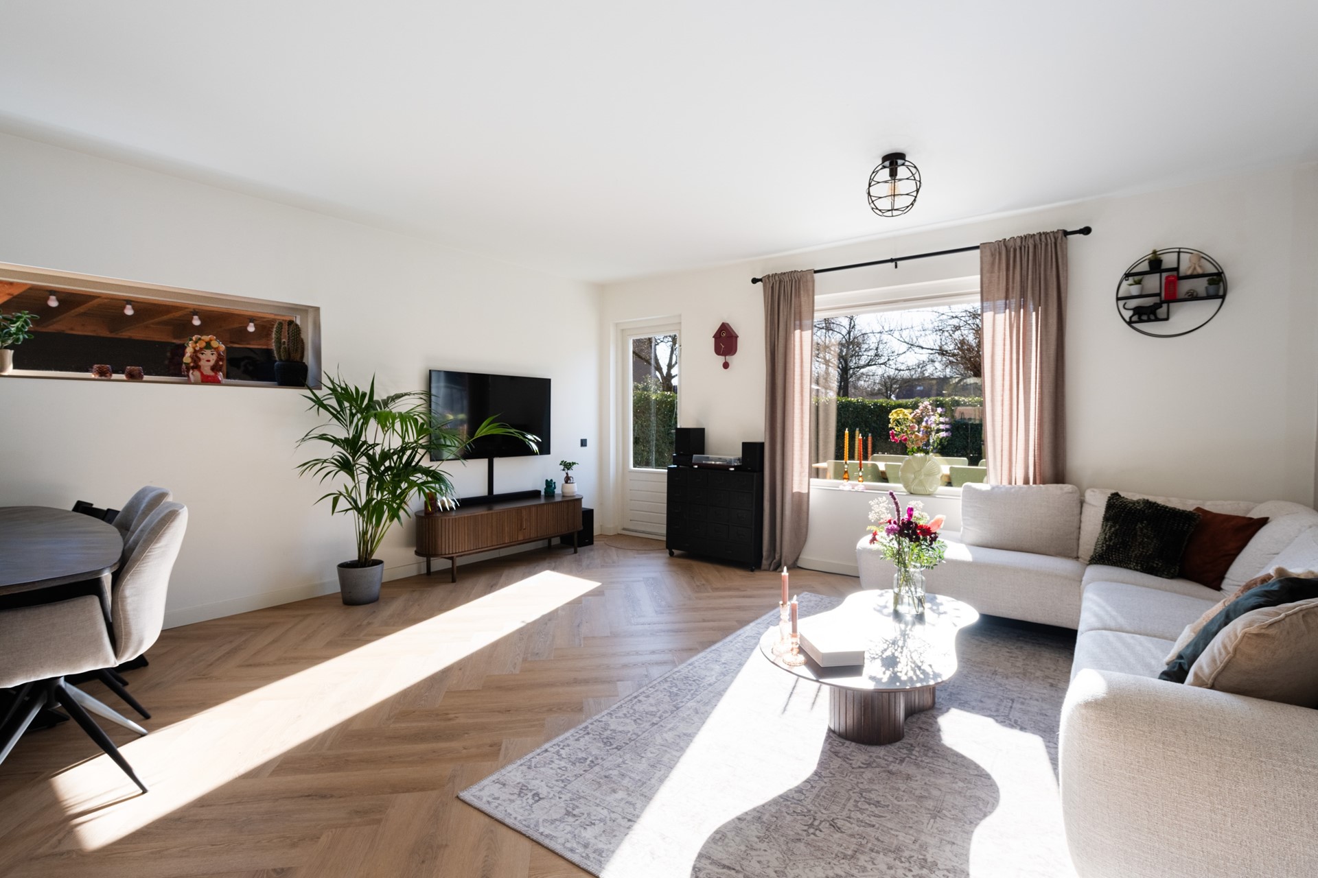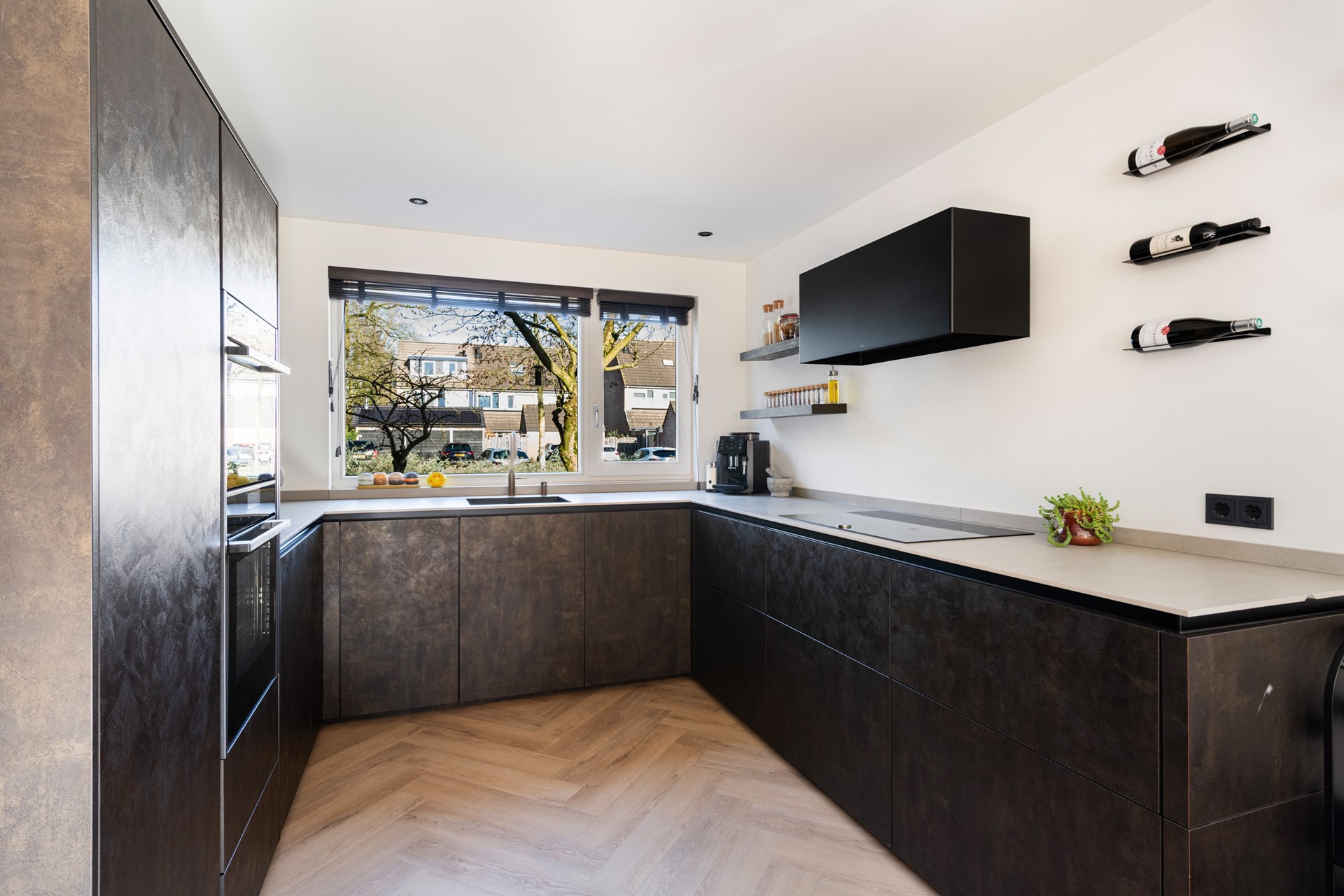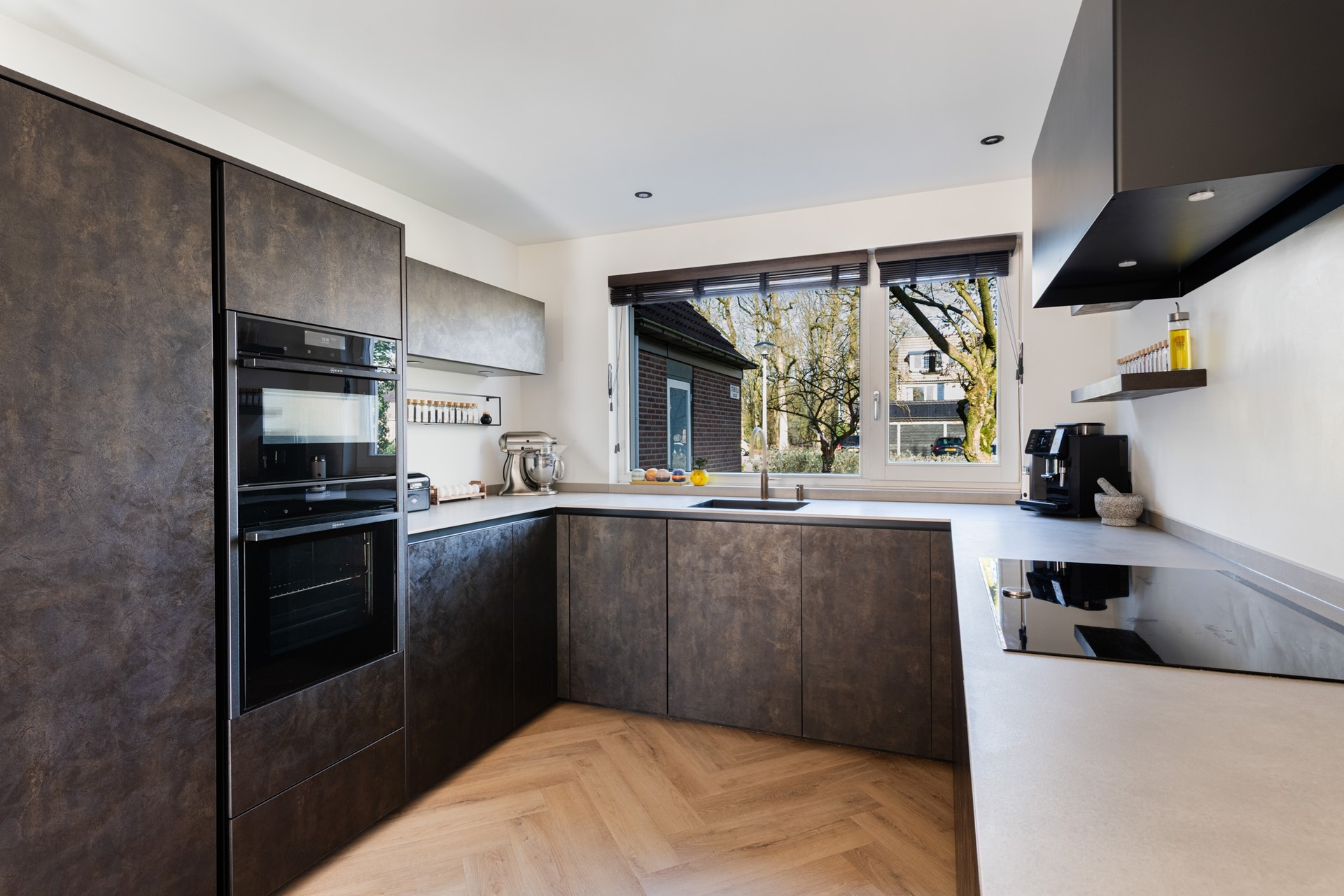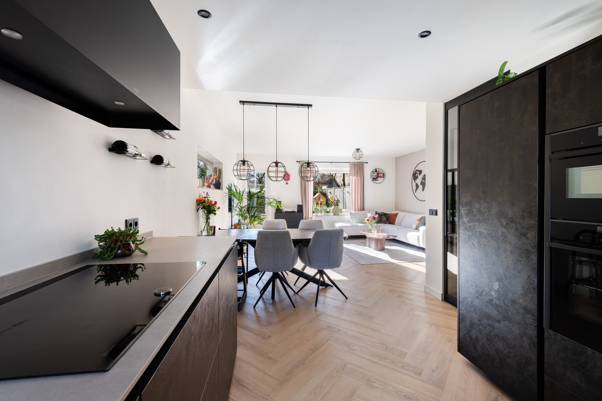 Via de overdekte entree betreed je de hal, die toegang geeft tot de meterkast met glasvezelaansluiting, het toilet met wandcloset en fontein en de trapopgang naar de 1e verdieping. Een moderne stalen taatsdeur nodigt je uit om de woonkamer binnen te stappen. De woonkamer is heerlijk tuingericht en strak afgewerkt, met gladde wanden en een strak plafond. De visgraatvloer en vloerverwarming geven de ruimte een warme uitstraling en dankzij een loopdeur stap je zo buiten het terras op. Aan de voorzijde bevindt zich de in 2021 geplaatste moderne keuken, compleet met divers inbouwapparatuur, waaronder een inductiekookplaat, afzuigkap, vaatwasser, koelkast met vriesvak, stoomoven, combi-oven én een Quooker.
