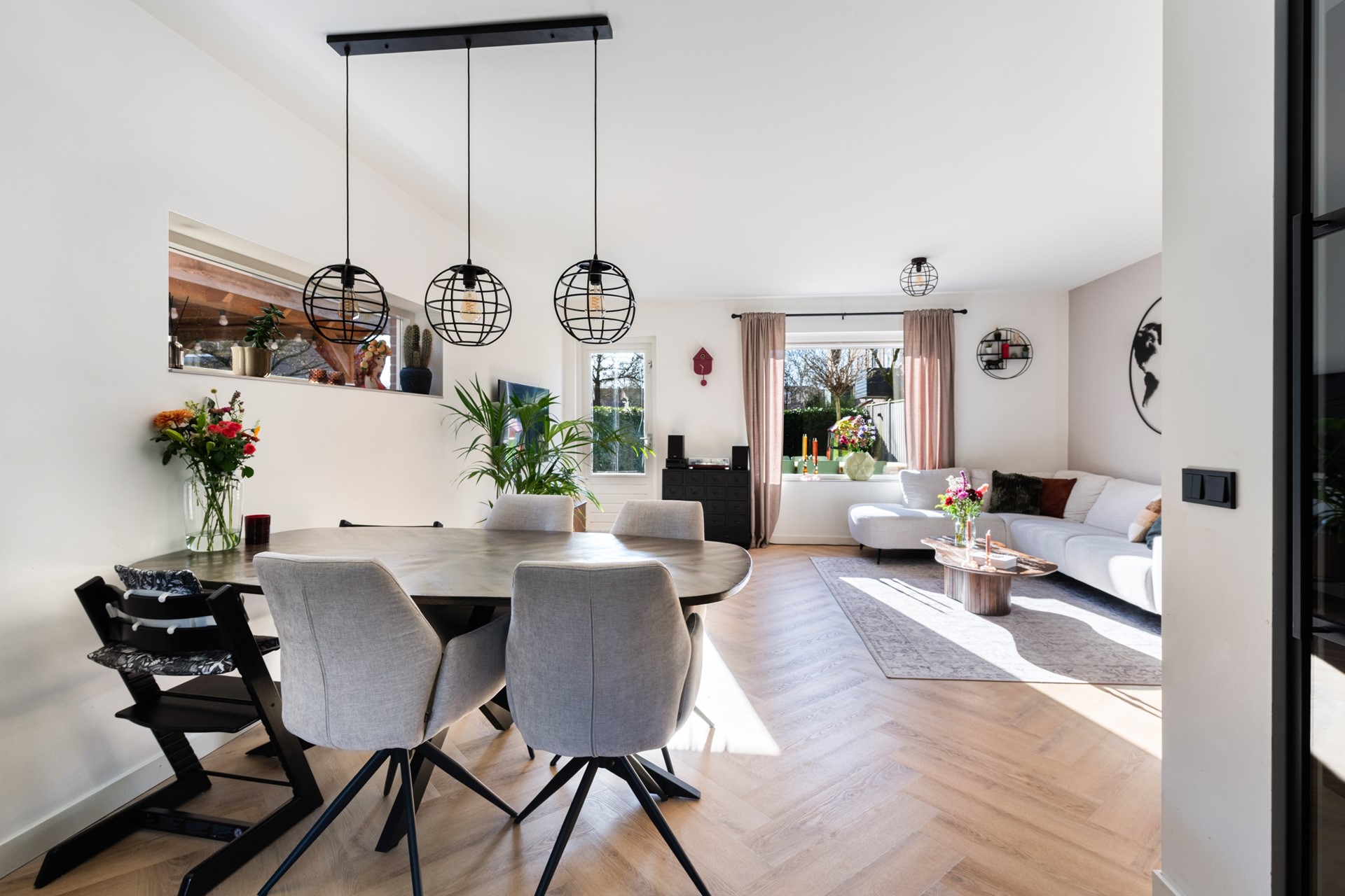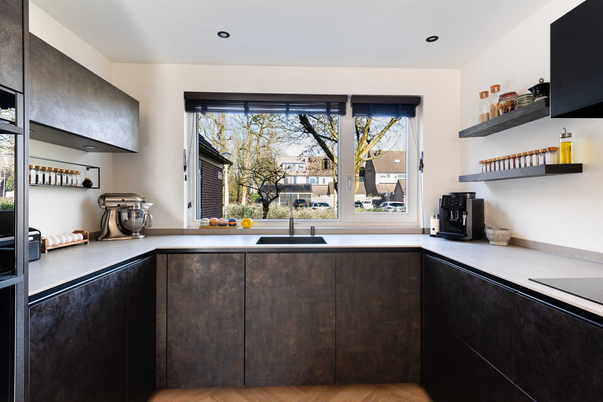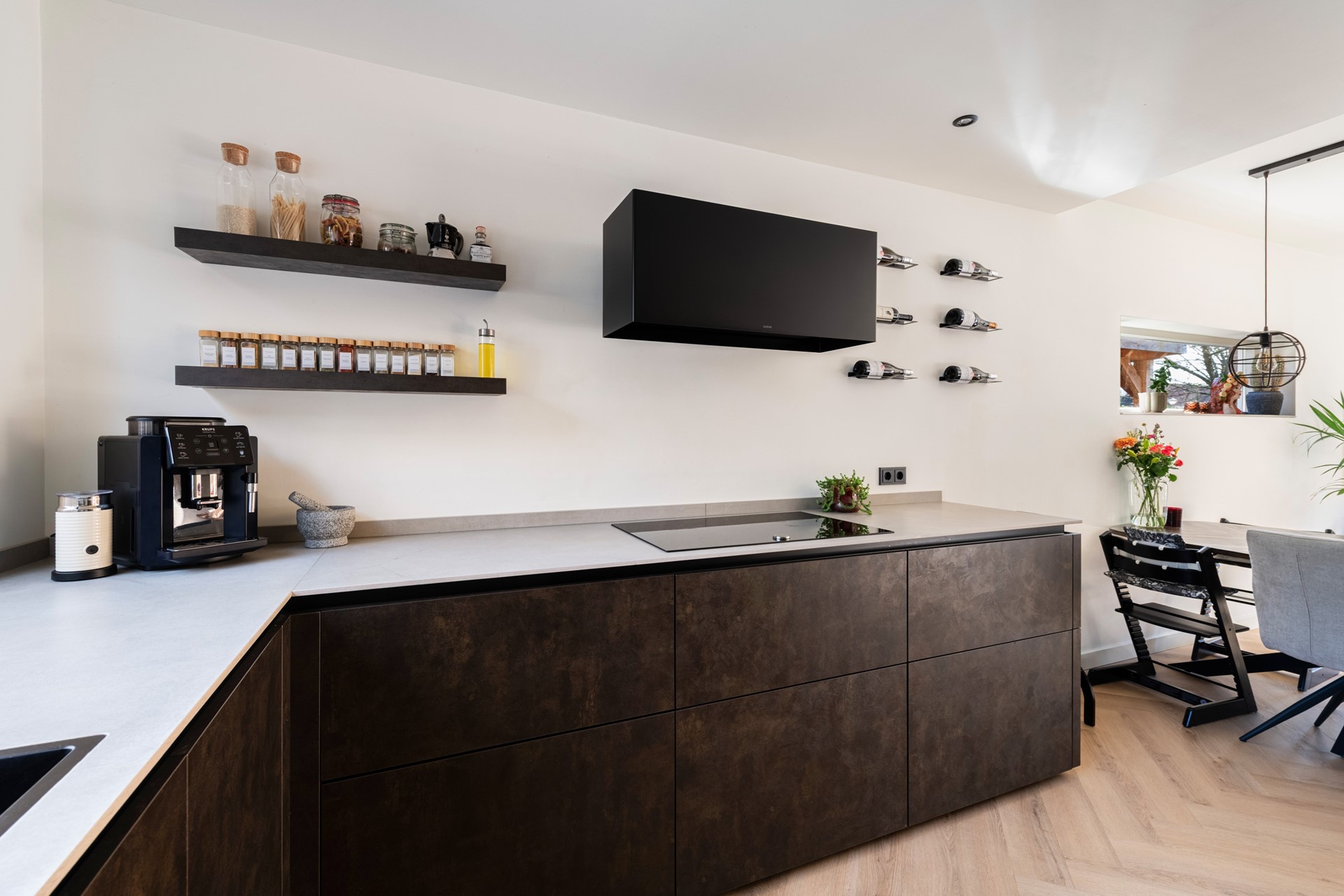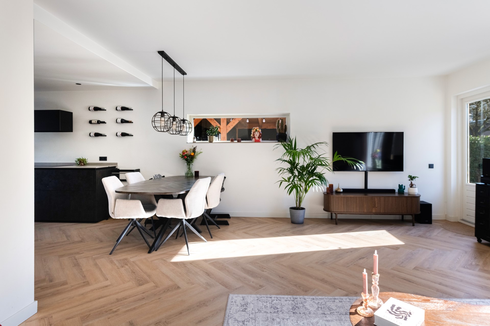 Via de overdekte entree betreed je de hal, die toegang geeft tot de meterkast met glasvezelaansluiting, het toilet met wandcloset en fontein en de trapopgang naar de 1e verdieping. Een moderne stalen taatsdeur nodigt je uit om de woonkamer binnen te stappen. De woonkamer is heerlijk tuingericht en strak afgewerkt, met gladde wanden en een strak plafond. De visgraatvloer en vloerverwarming geven de ruimte een warme uitstraling en dankzij een loopdeur stap je zo buiten het terras op. Aan de voorzijde bevindt zich de in 2021 geplaatste moderne keuken, compleet met divers inbouwapparatuur, waaronder een inductiekookplaat, afzuigkap, vaatwasser, koelkast met vriesvak, stoomoven, combi-oven én een Quooker.