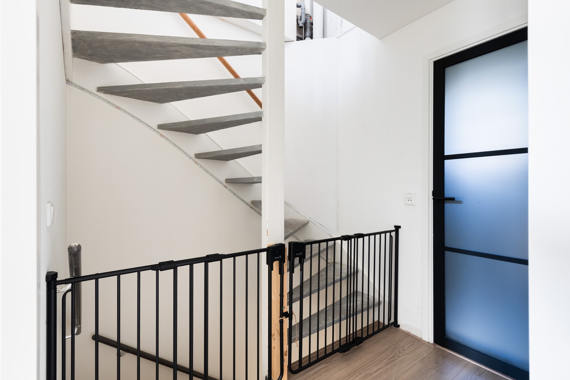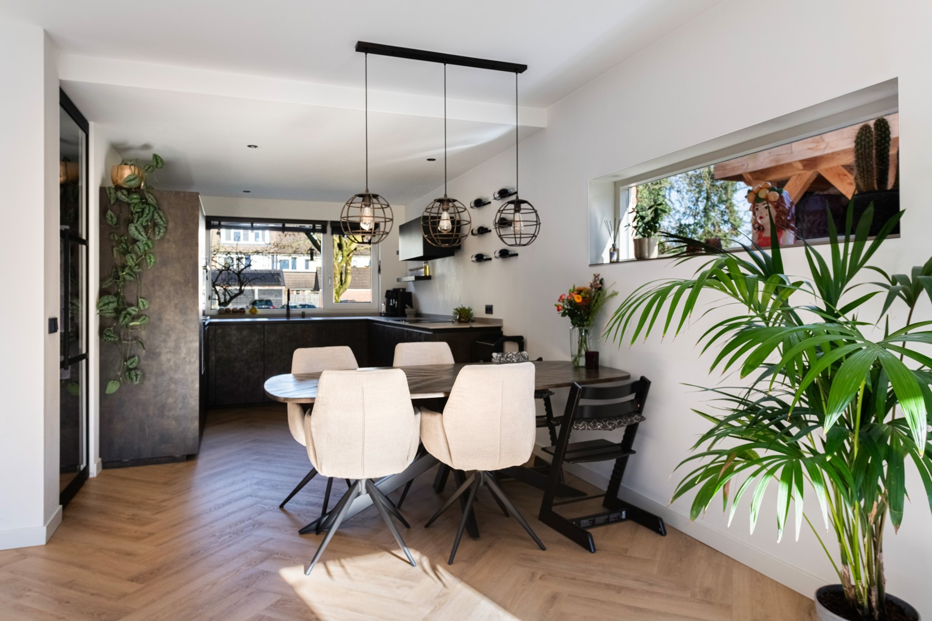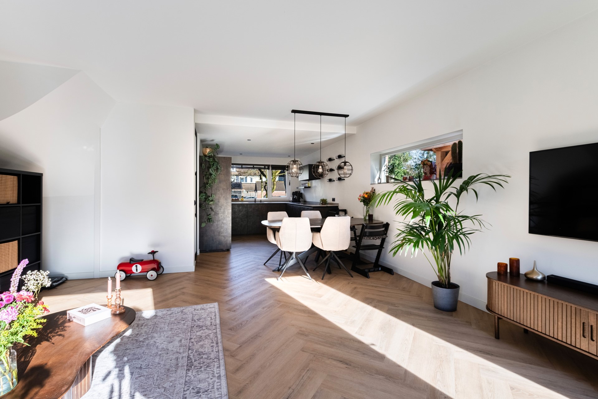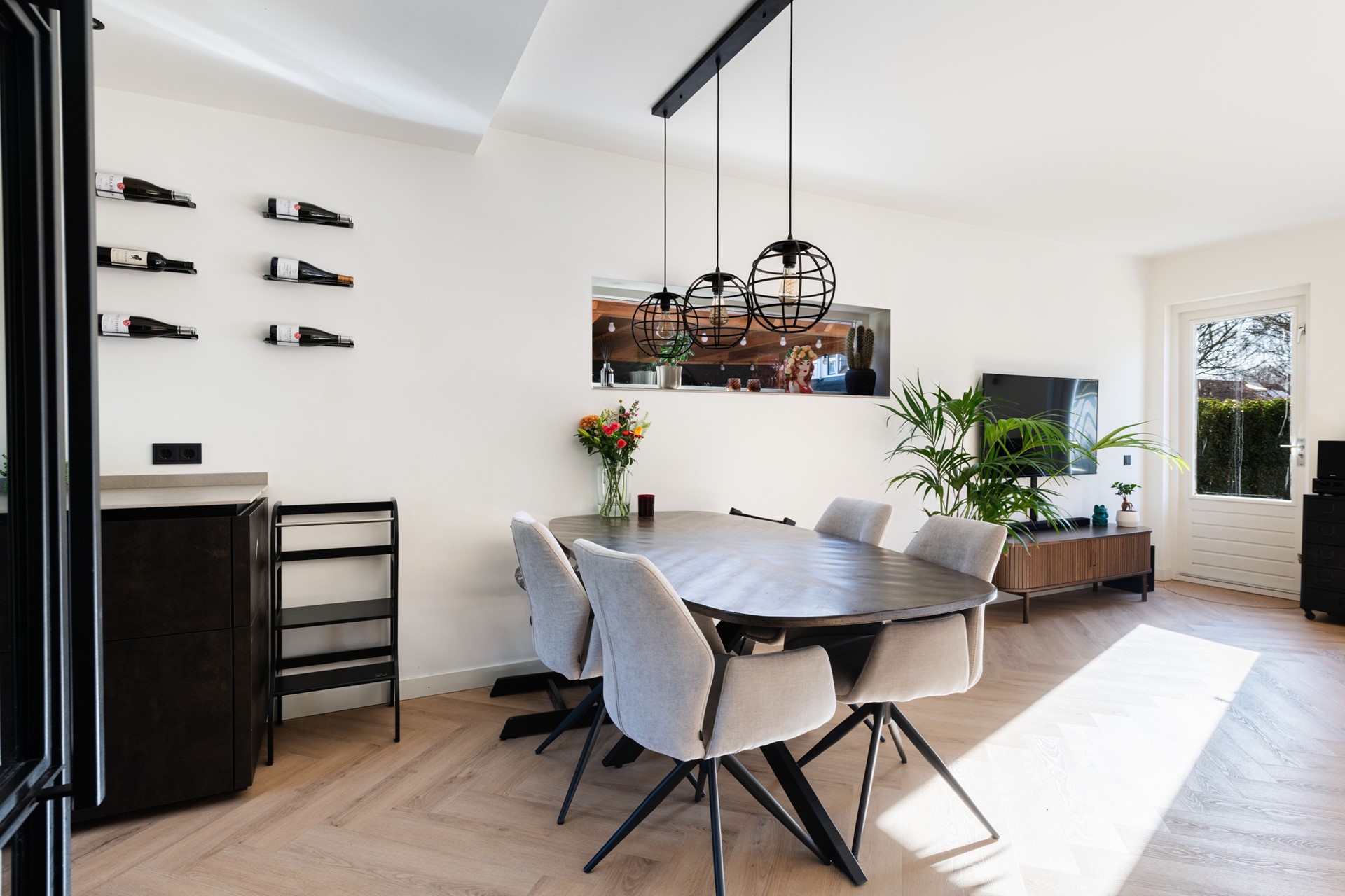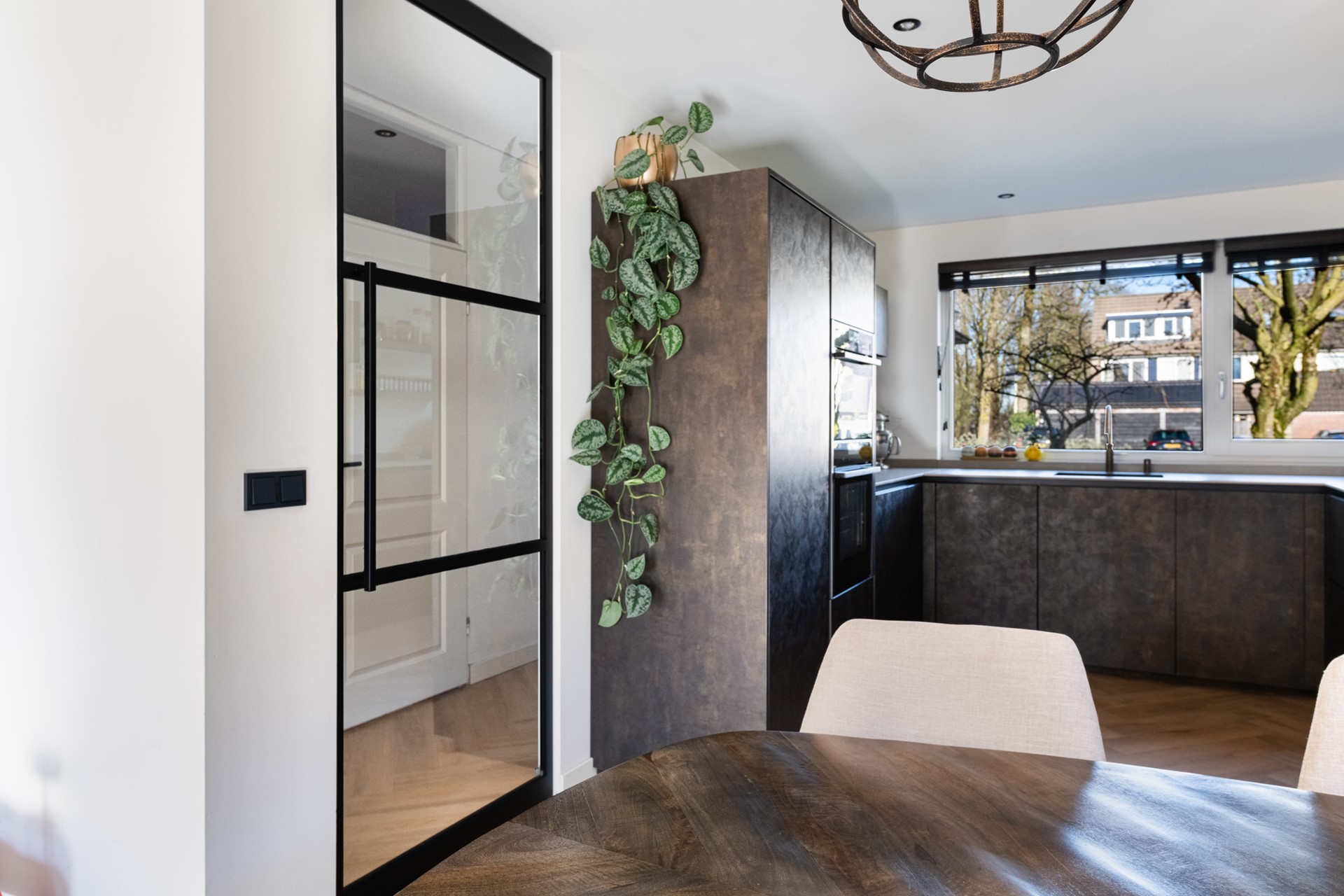 Via de overdekte entree betreed je de hal, die toegang geeft tot de meterkast met glasvezelaansluiting, het toilet met wandcloset en fontein en de trapopgang naar de 1e verdieping. Een moderne stalen taatsdeur nodigt je uit om de woonkamer binnen te stappen. De woonkamer is heerlijk tuingericht en strak afgewerkt, met gladde wanden en een strak plafond. De visgraatvloer en vloerverwarming geven de ruimte een warme uitstraling en dankzij een loopdeur stap je zo buiten het terras op. Aan de voorzijde bevindt zich de in 2021 geplaatste moderne keuken, compleet met divers inbouwapparatuur, waaronder een inductiekookplaat, afzuigkap, vaatwasser, koelkast met vriesvak, stoomoven, combi-oven én een Quooker.