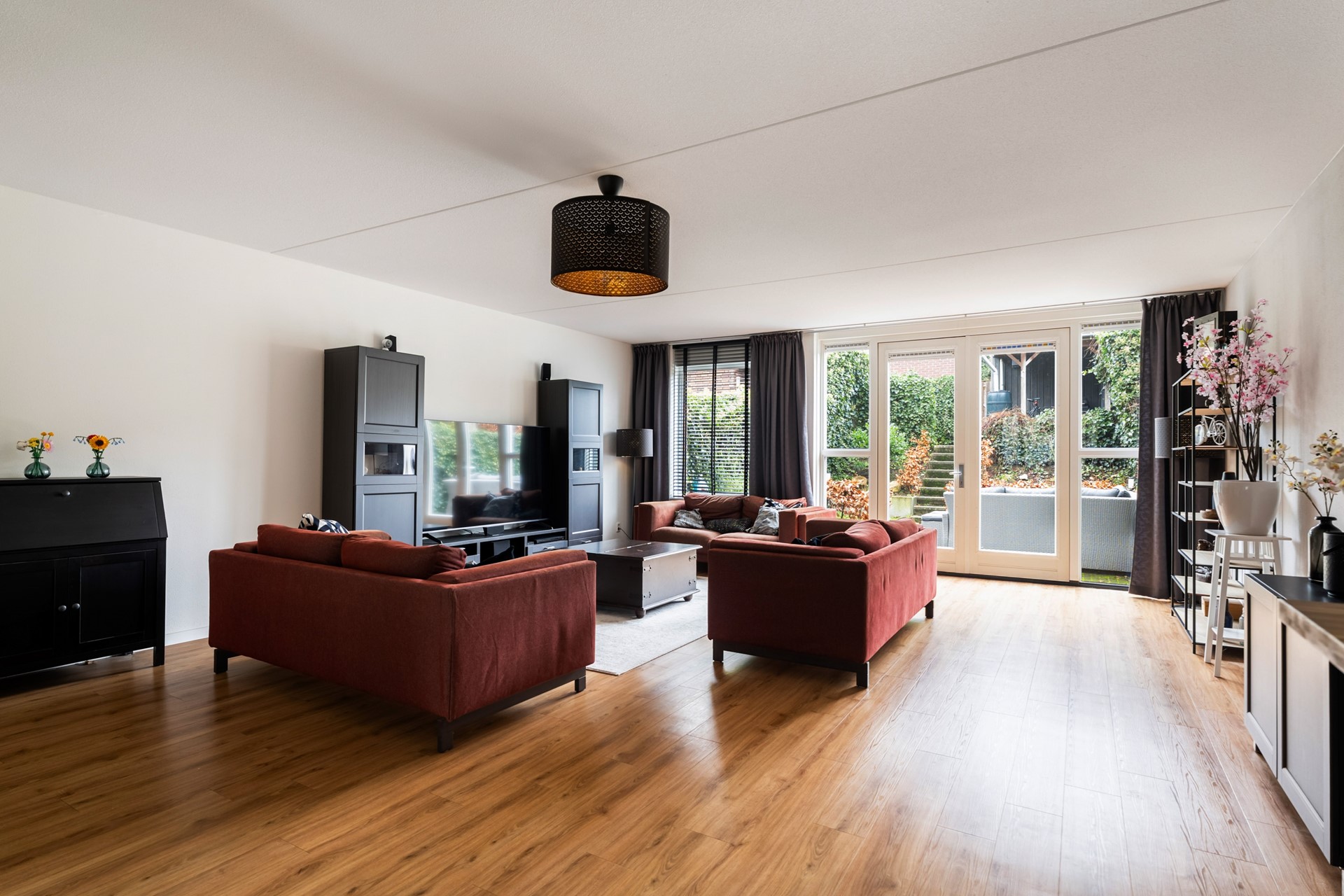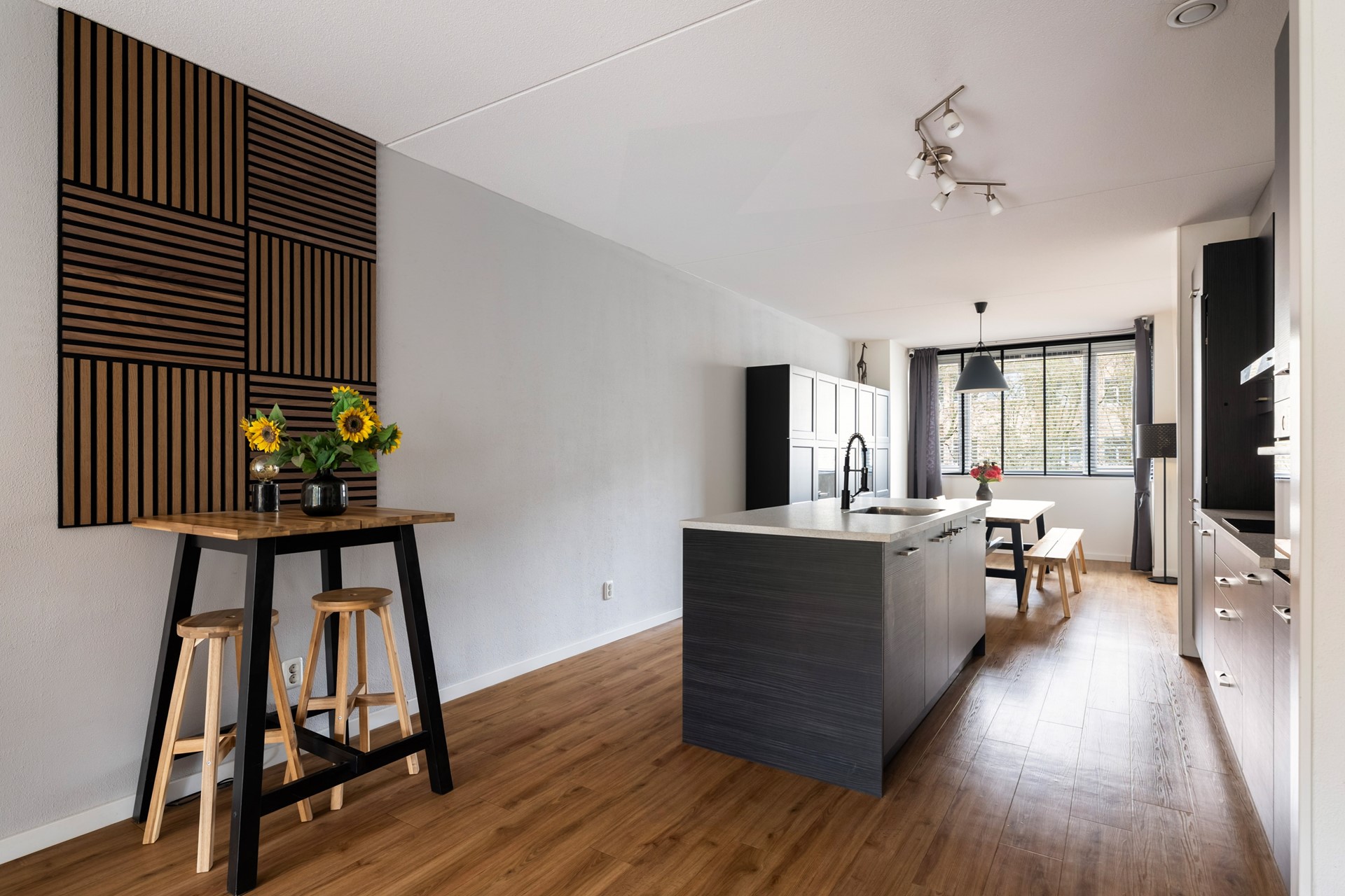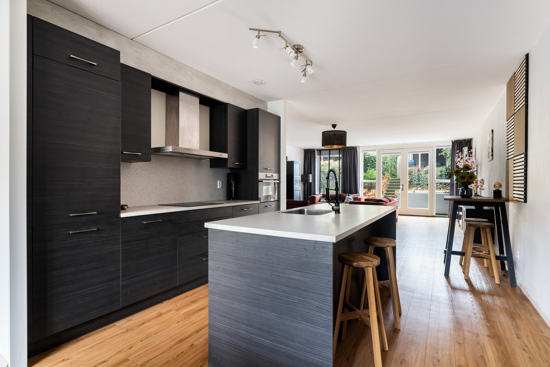 Via de entree stap je binnen in de hal, een prettige binnenkomst die direct toegang geeft tot de meterkast (met glasvezelaansluiting), een geheel betegelde toiletruimte (met wandcloset en fontein), de praktische berging met warmtepomp (2012), de trapopgang naar de 1e verdieping, de woonkeuken en woonkamer. De uitgebouwde woonkamer is royaal van opzet en nodigt uit tot het creëren van een comfortabele en ruime zithoek. Dankzij de openslaande deuren staat deze ruimte in directe verbinding met het terras en de tuin, waardoor binnen en buiten moeiteloos in elkaar overlopen. De strakke wandafwerking en de pvc-vloer met aangename vloerverwarming zorgen voor een verzorgde uitstraling. Aan de voorzijde van de woning, in het verlengde van de woonkamer, bevindt zich de woonkeuken. Het gezellige spoeleiland met bar vormt het hart van de ruimte – de perfecte plek om ’s ochtends rustig van een kop koffie te genieten of samen te komen tijdens het koken. De keuken is uitgerust met diverse inbouwapparatuur, waaronder een inductiekookplaat met afzuigkap, koelkast, vriezer en een combi oven/magnetron. Dankzij de erker aan de voorzijde is er volop ruimte voor een royale eethoek, waar je lange diners kunt organiseren.