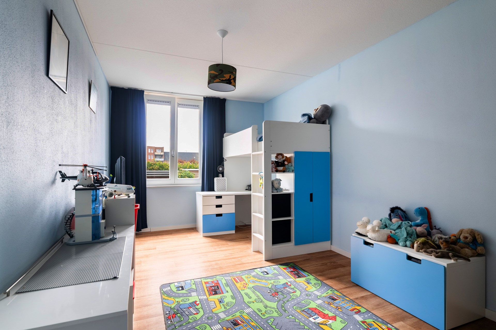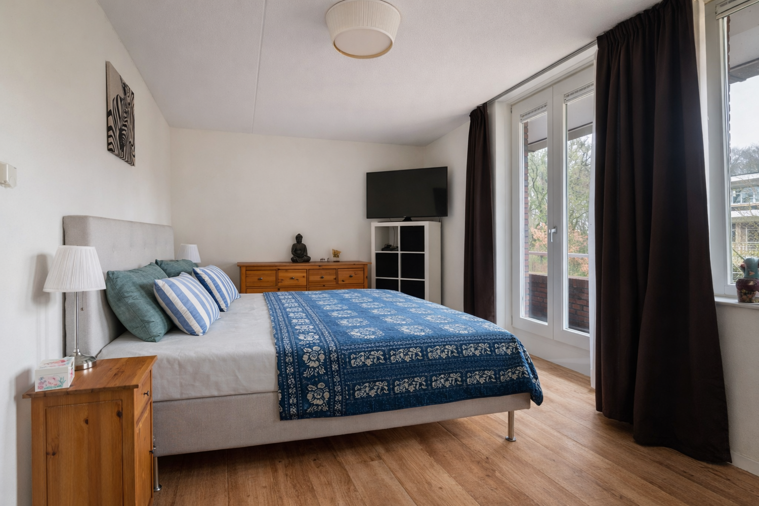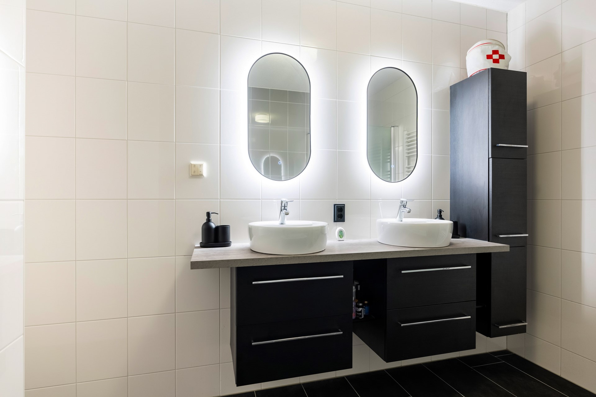 De overloop op de eerste verdieping vormt de verbinding naar drie royale slaapkamers, de separate toiletruimte en de badkamer. De moderne badkamer, uitgevoerd in een rustige, neutrale kleurstelling, is volledig betegeld en uitgerust met een dubbel wastafelmeubel met dubbele waskommen en verlichte spiegels, een designradiator, een comfortabel ligbad en een separate douche. De toiletruimte is eveneens volledig betegeld en voorzien van een strak wandcloset met fontein. Alle drie de slaapkamers zijn ruim en licht van opzet; de kamers aan de achterzijde beschikken over praktische draai-kiepramen. De ouderslaapkamer, gesitueerd aan de voorzijde en over de volledige breedte van de woning, vormt een echte eyecatcher en biedt via openslaande deuren directe toegang tot het balkon aan de voorzijde — een heerlijke plek om de dag te beginnen of juist rustig af te sluiten. Tot slot is de gehele verdieping voorzien van een vinyl vloer en vloerverwarming.