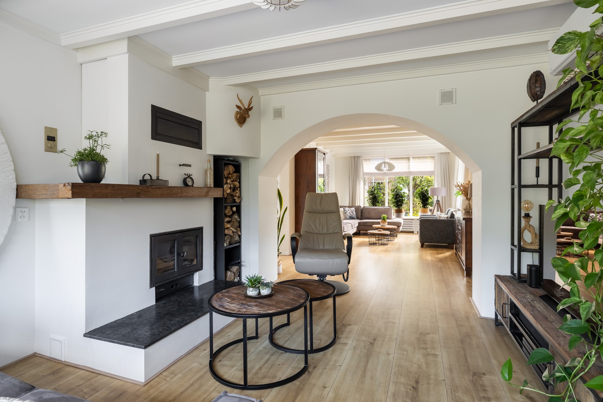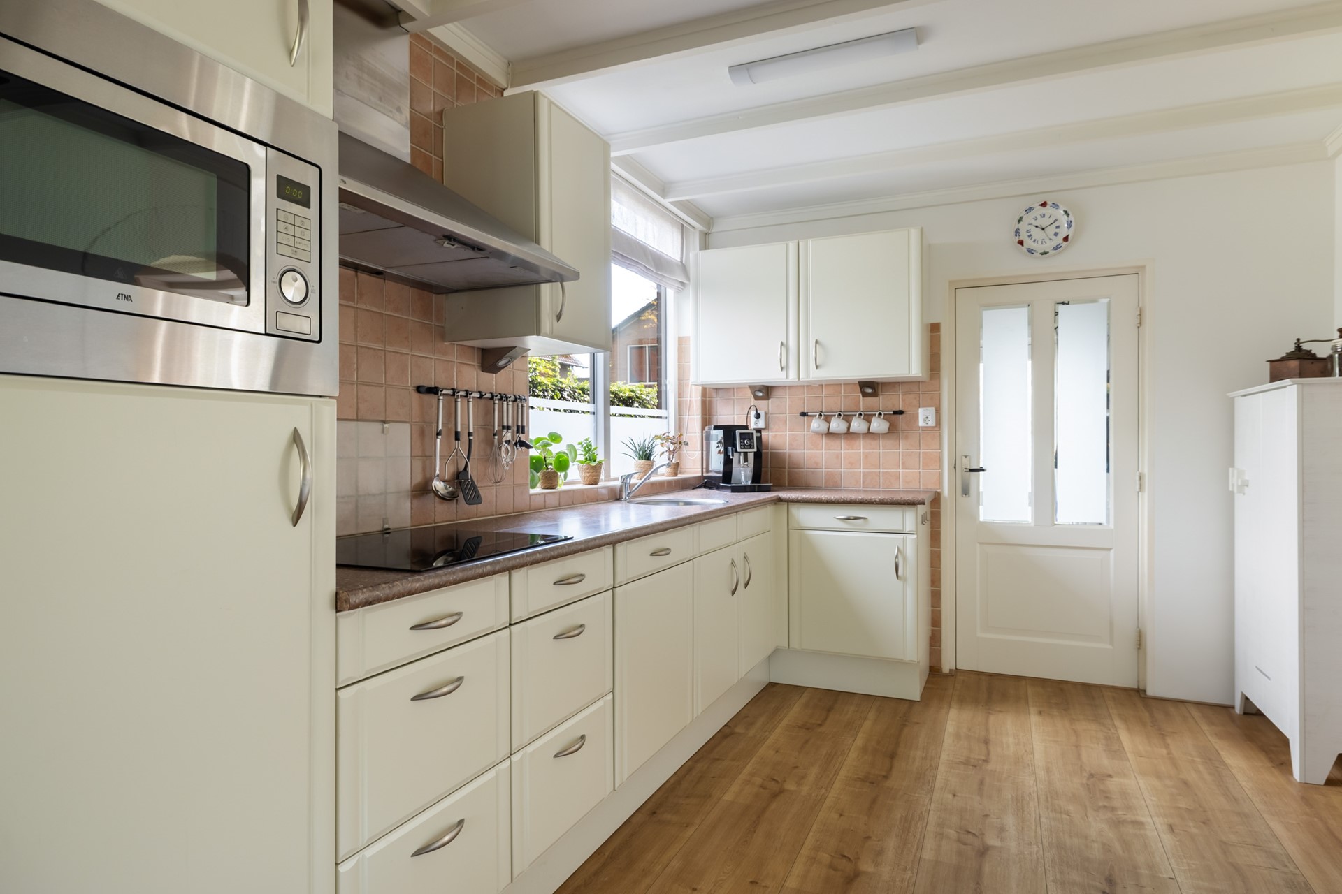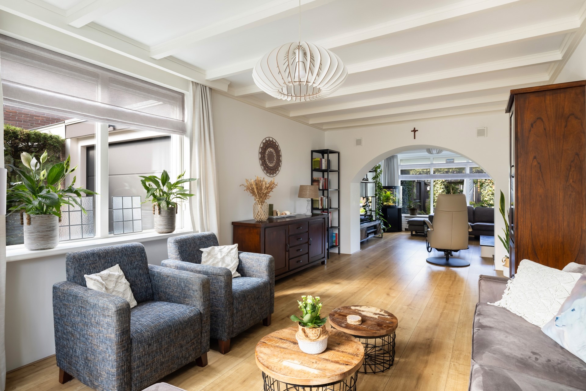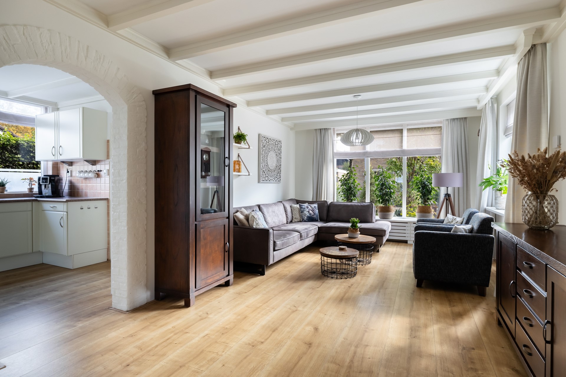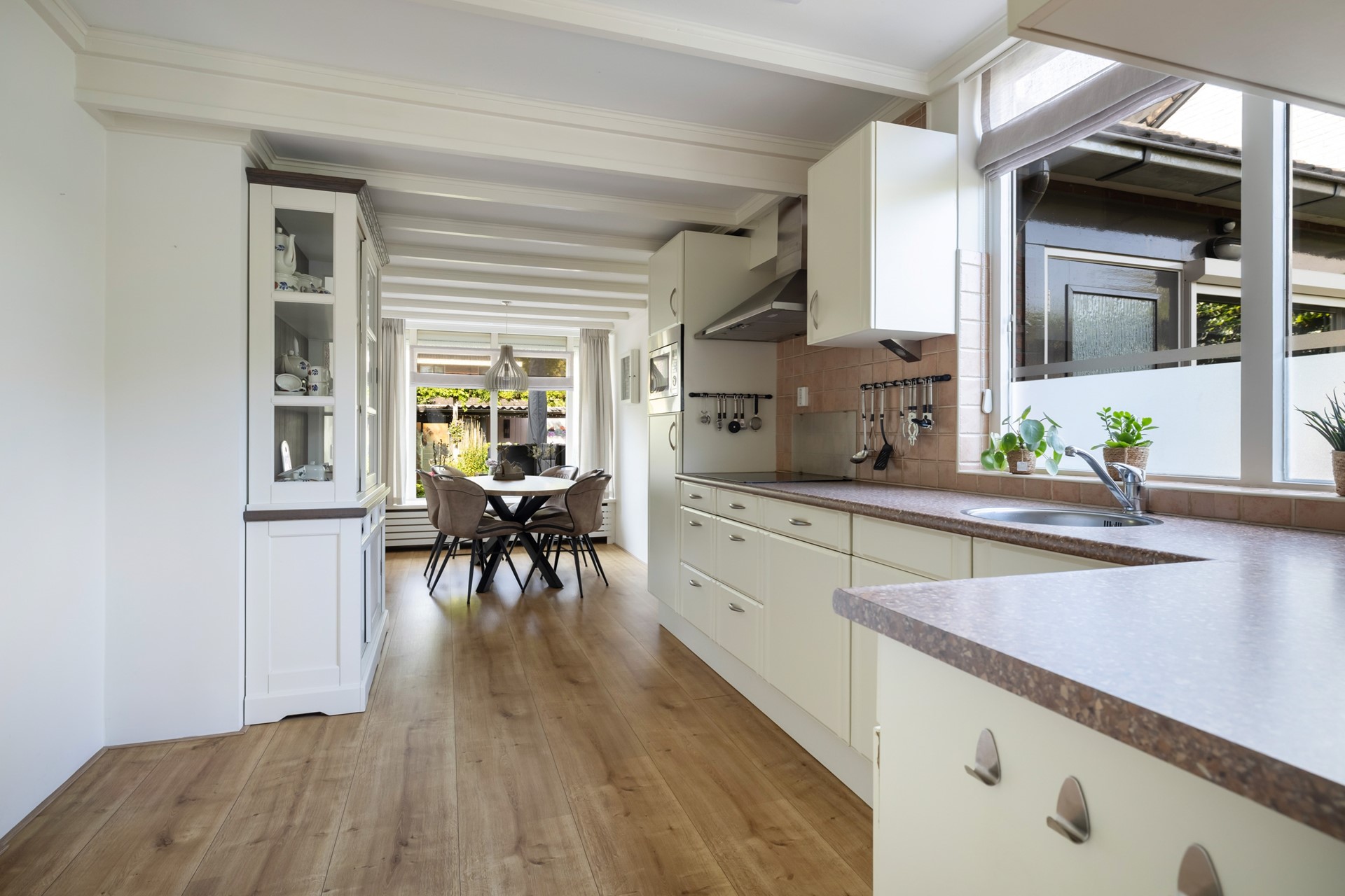 Je komt binnen in de hal met toegang tot de toiletruimte, meterkast, provisiekelder, trap naar de 1e verdieping en de keuken. De woonkeuken is voorzien van inbouwapparatuur, waaronder een keramische kookplaat, afzuigkap, combimagnetron, koelkast en vaatwasser. Aan de achterzijde is plek voor een gezellige eethoek waar je met het gezin of vrienden kunt samenkomen. Aansluitend ligt de bijkeuken, met aansluitingen voor de wasmachine en droger, een spoelbak en de opstelplaats van de c.v.-installatie. Vanuit hier loop je zo naar de oprit of de achtertuin. De woonkamer met airconditioning is ruim opgezet en biedt genoeg mogelijkheden om verschillende zithoeken te creëren. Het zichtbare houten balkenplafond geeft extra karakter en de nette laminaatvloer loopt grotendeels door over de begane grond. Via een tussenportaal bereik je de schuur en de berging, die ook toegang geeft tot de tuin.