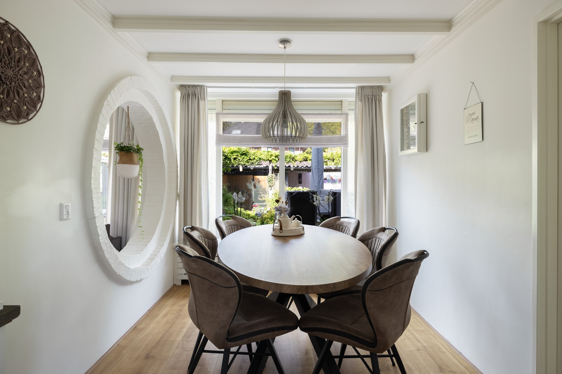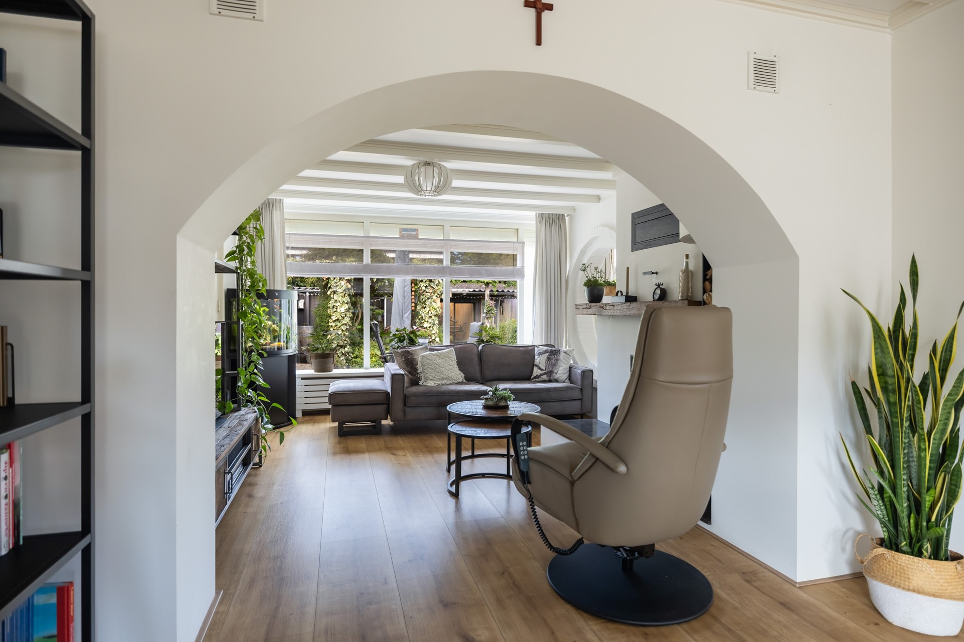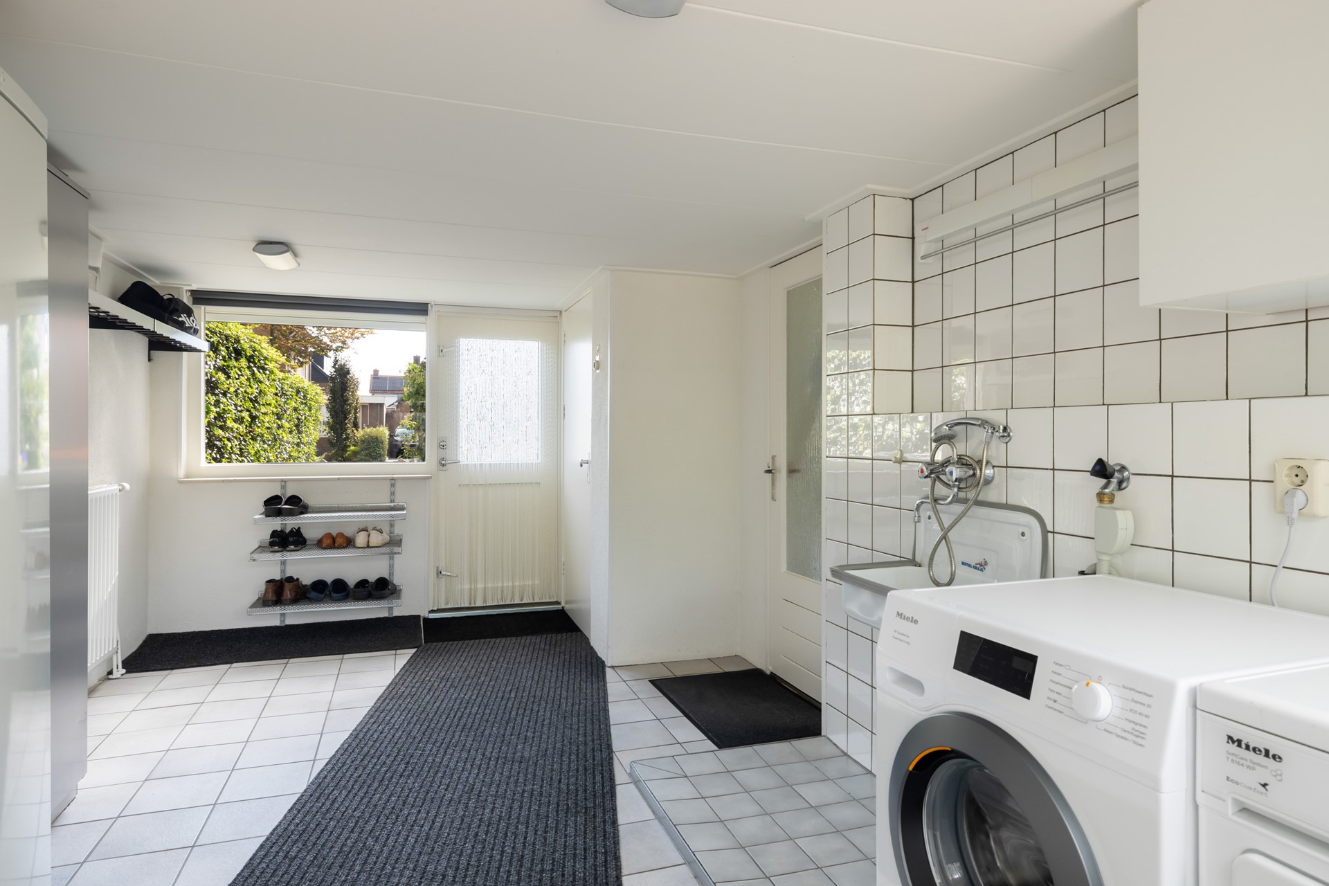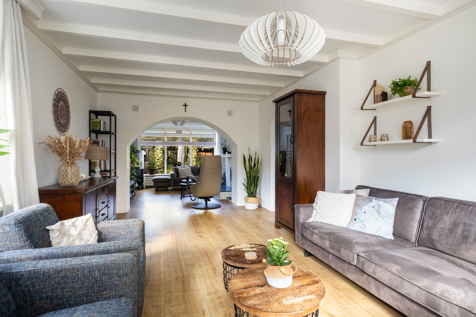 Je komt binnen in de hal met toegang tot de toiletruimte, meterkast, provisiekelder, trap naar de 1e verdieping en de keuken. De woonkeuken is voorzien van inbouwapparatuur, waaronder een keramische kookplaat, afzuigkap, combimagnetron, koelkast en vaatwasser. Aan de achterzijde is plek voor een gezellige eethoek waar je met het gezin of vrienden kunt samenkomen. Aansluitend ligt de bijkeuken, met aansluitingen voor de wasmachine en droger, een spoelbak en de opstelplaats van de c.v.-installatie. Vanuit hier loop je zo naar de oprit of de achtertuin. De woonkamer met airconditioning is ruim opgezet en biedt genoeg mogelijkheden om verschillende zithoeken te creëren. Het zichtbare houten balkenplafond geeft extra karakter en de nette laminaatvloer loopt grotendeels door over de begane grond. Via een tussenportaal bereik je de schuur en de berging, die ook toegang geeft tot de tuin.