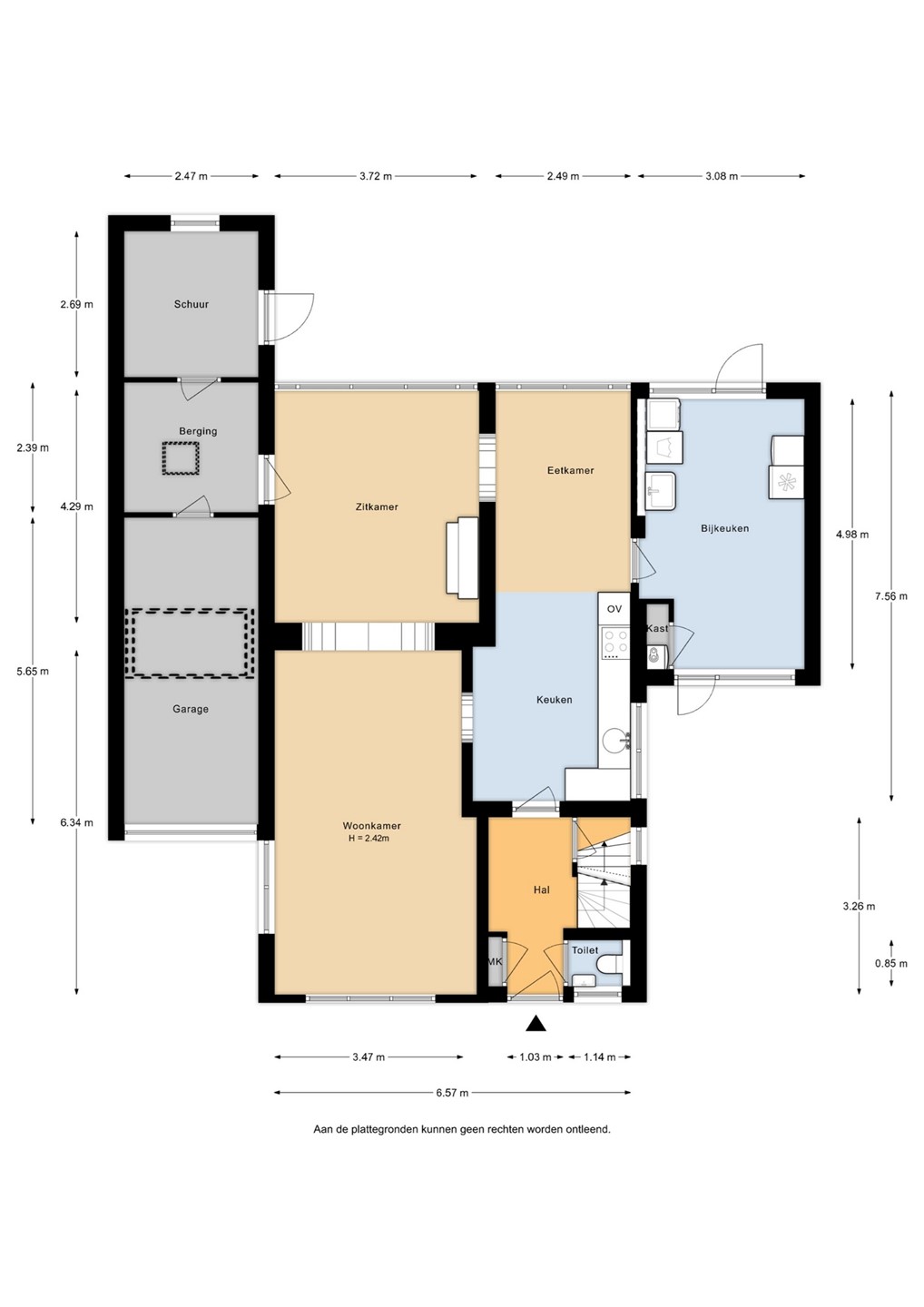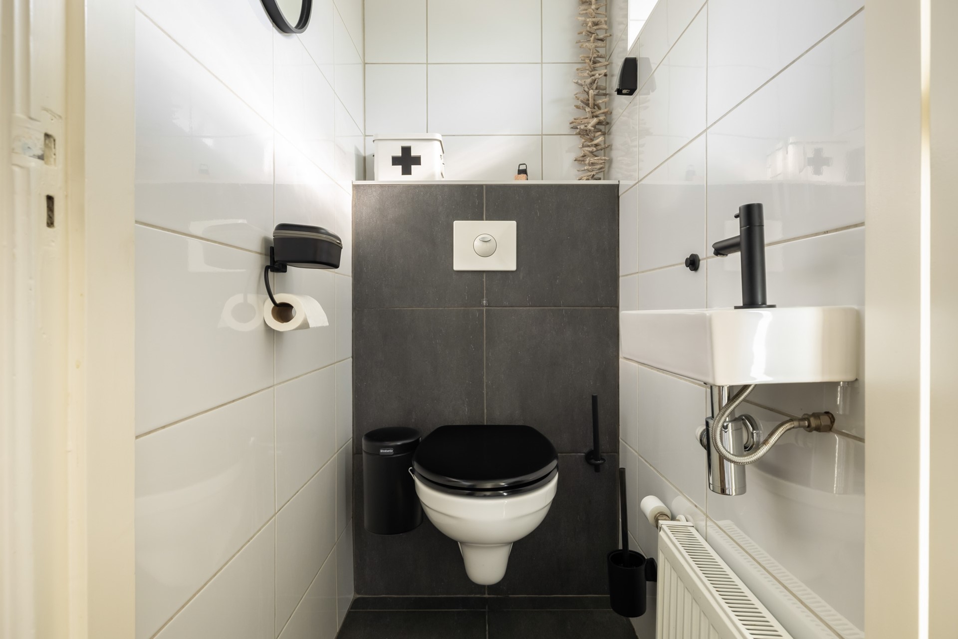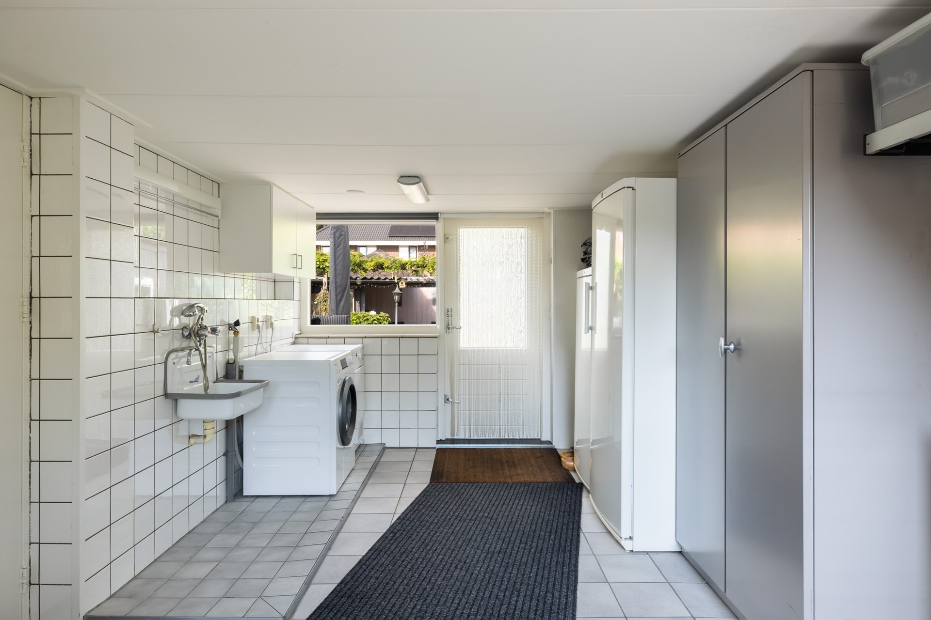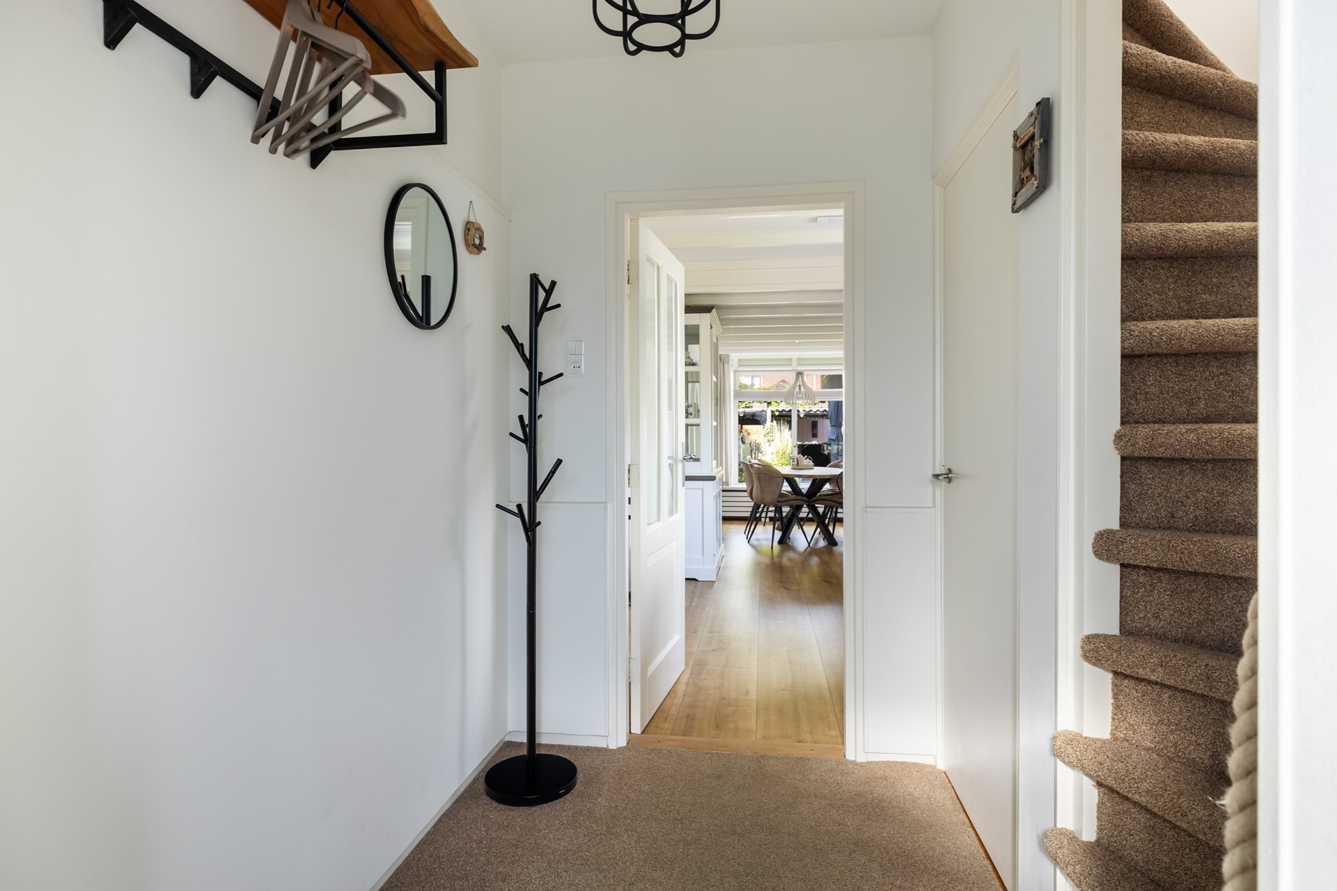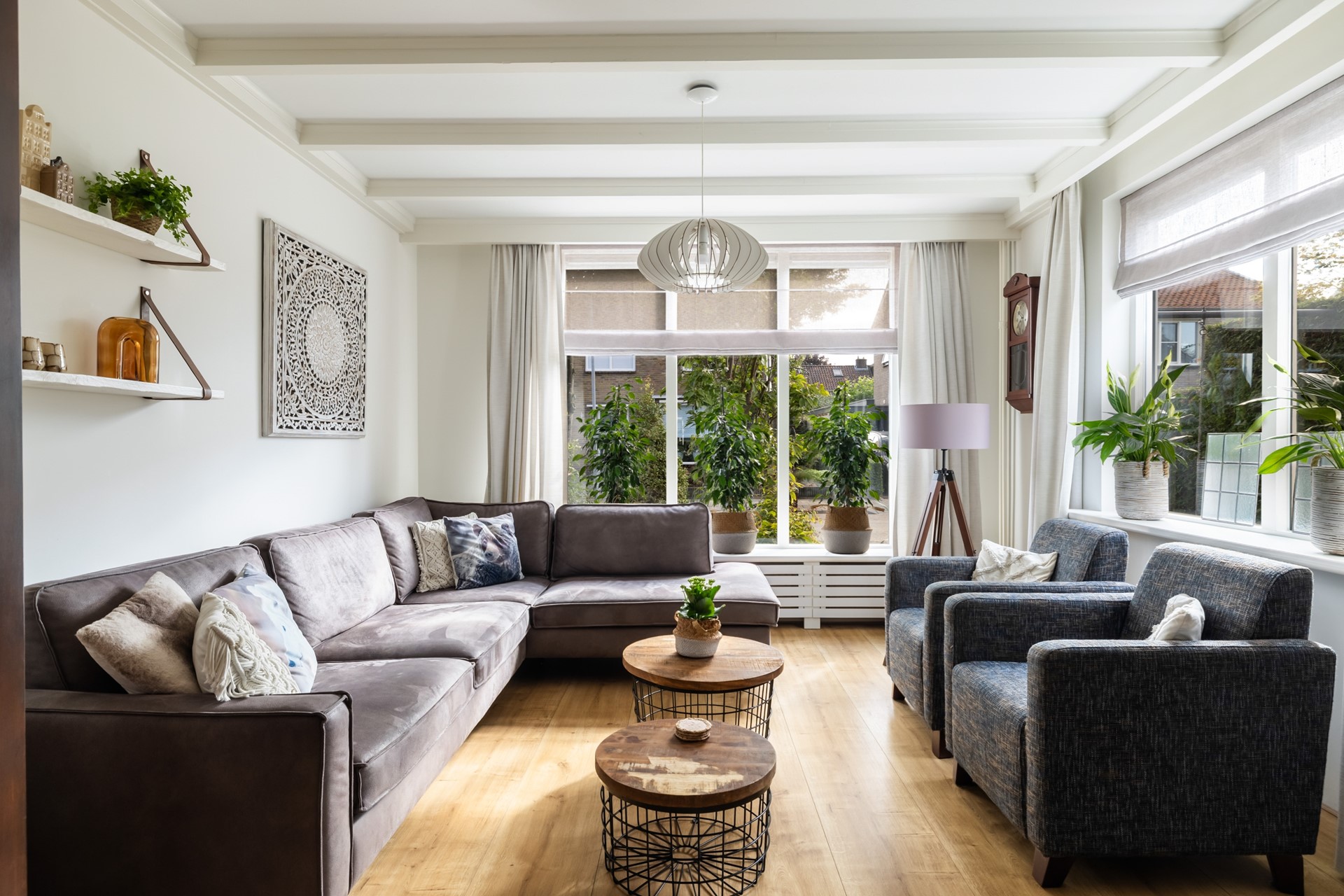 Je komt binnen in de hal met toegang tot de toiletruimte, meterkast, provisiekelder, trap naar de 1e verdieping en de keuken. De woonkeuken is voorzien van inbouwapparatuur, waaronder een keramische kookplaat, afzuigkap, combimagnetron, koelkast en vaatwasser. Aan de achterzijde is plek voor een gezellige eethoek waar je met het gezin of vrienden kunt samenkomen. Aansluitend ligt de bijkeuken, met aansluitingen voor de wasmachine en droger, een spoelbak en de opstelplaats van de c.v.-installatie. Vanuit hier loop je zo naar de oprit of de achtertuin. De woonkamer met airconditioning is ruim opgezet en biedt genoeg mogelijkheden om verschillende zithoeken te creëren. Het zichtbare houten balkenplafond geeft extra karakter en de nette laminaatvloer loopt grotendeels door over de begane grond. Via een tussenportaal bereik je de schuur en de berging, die ook toegang geeft tot de tuin.