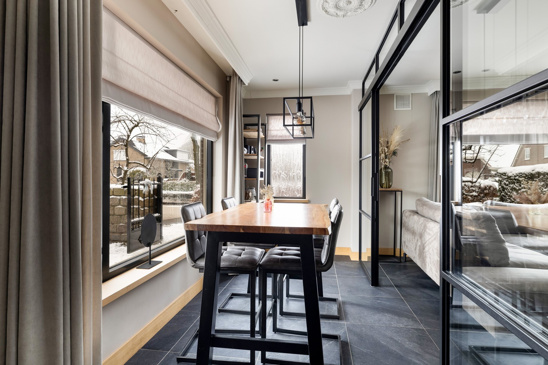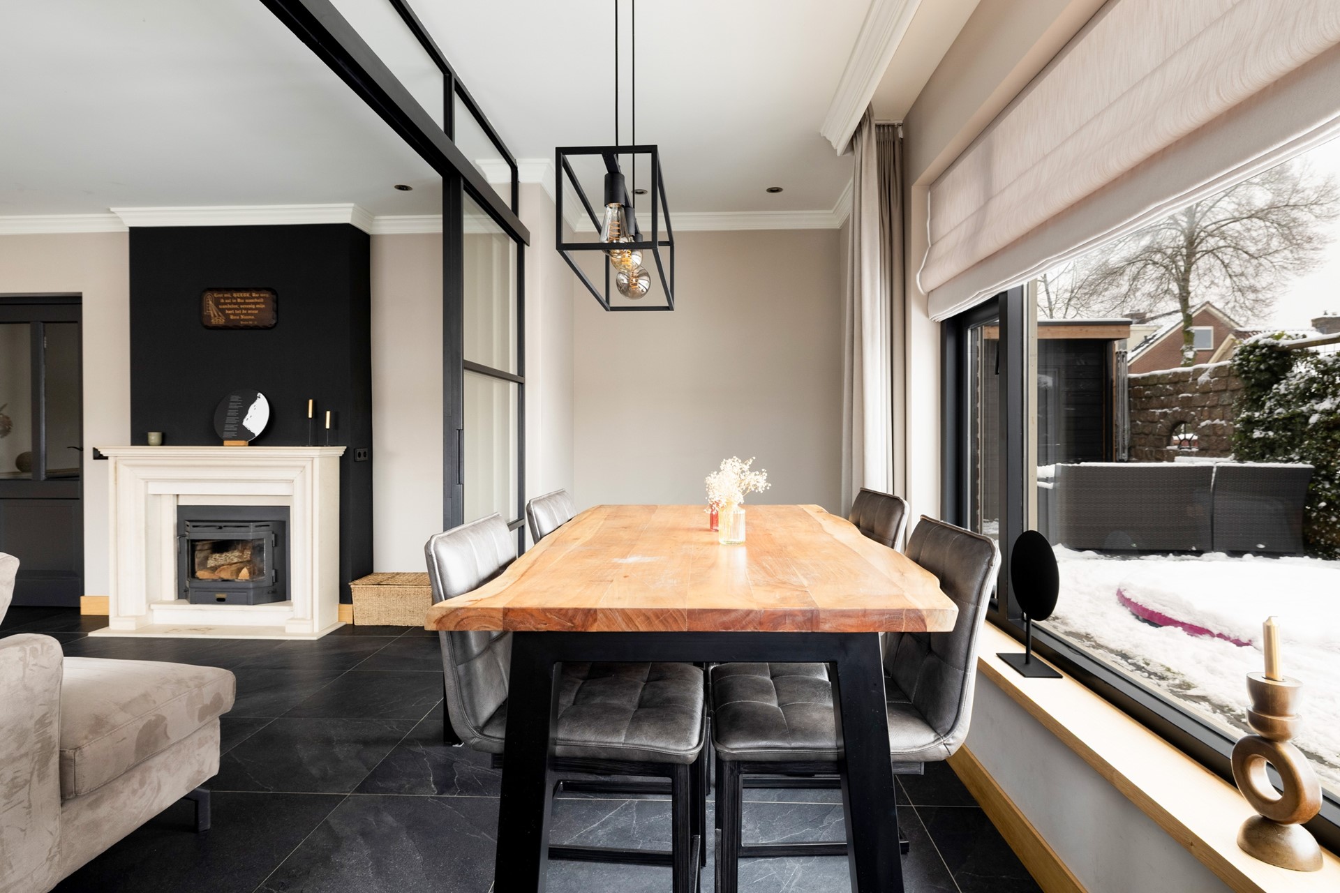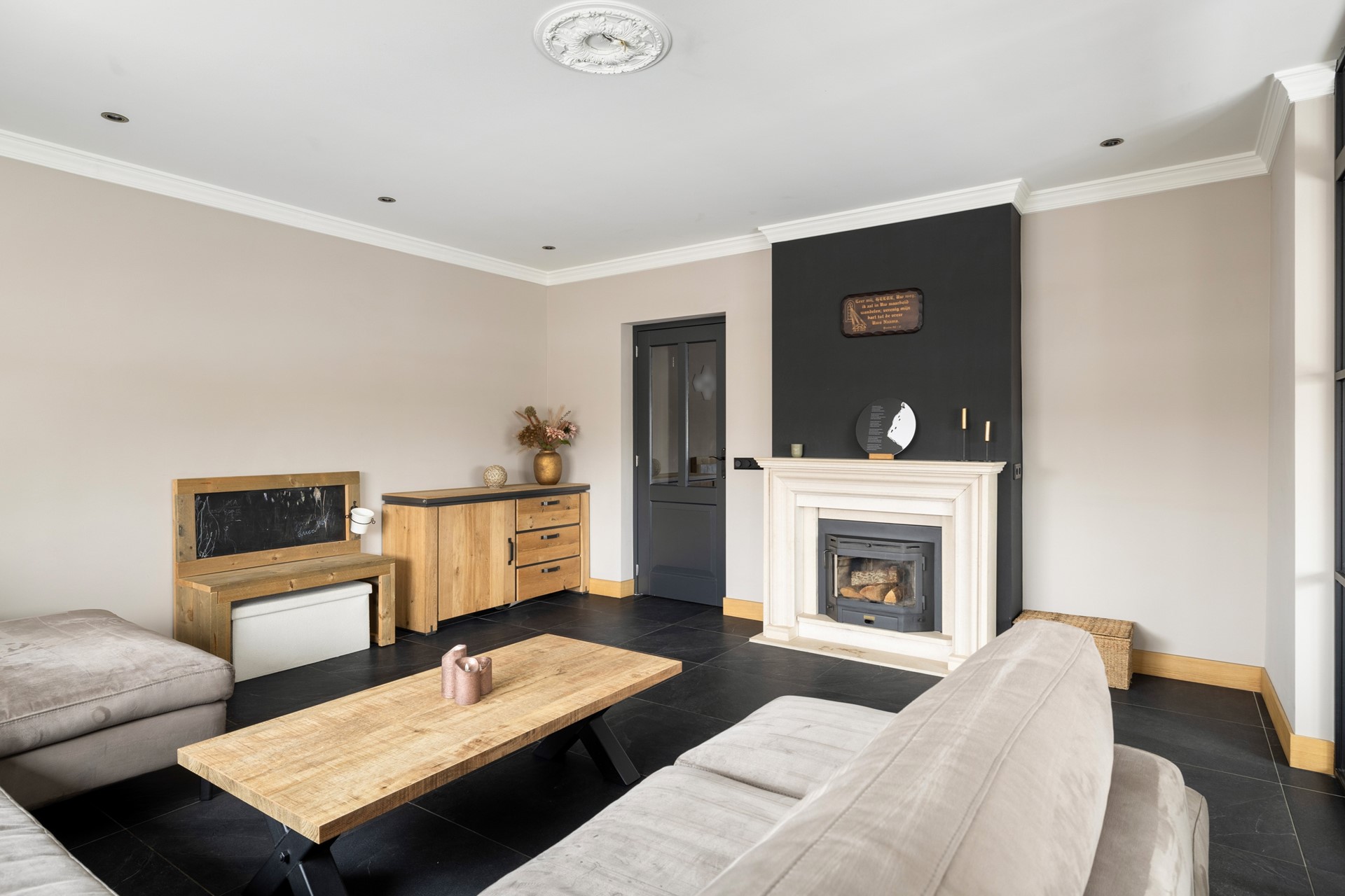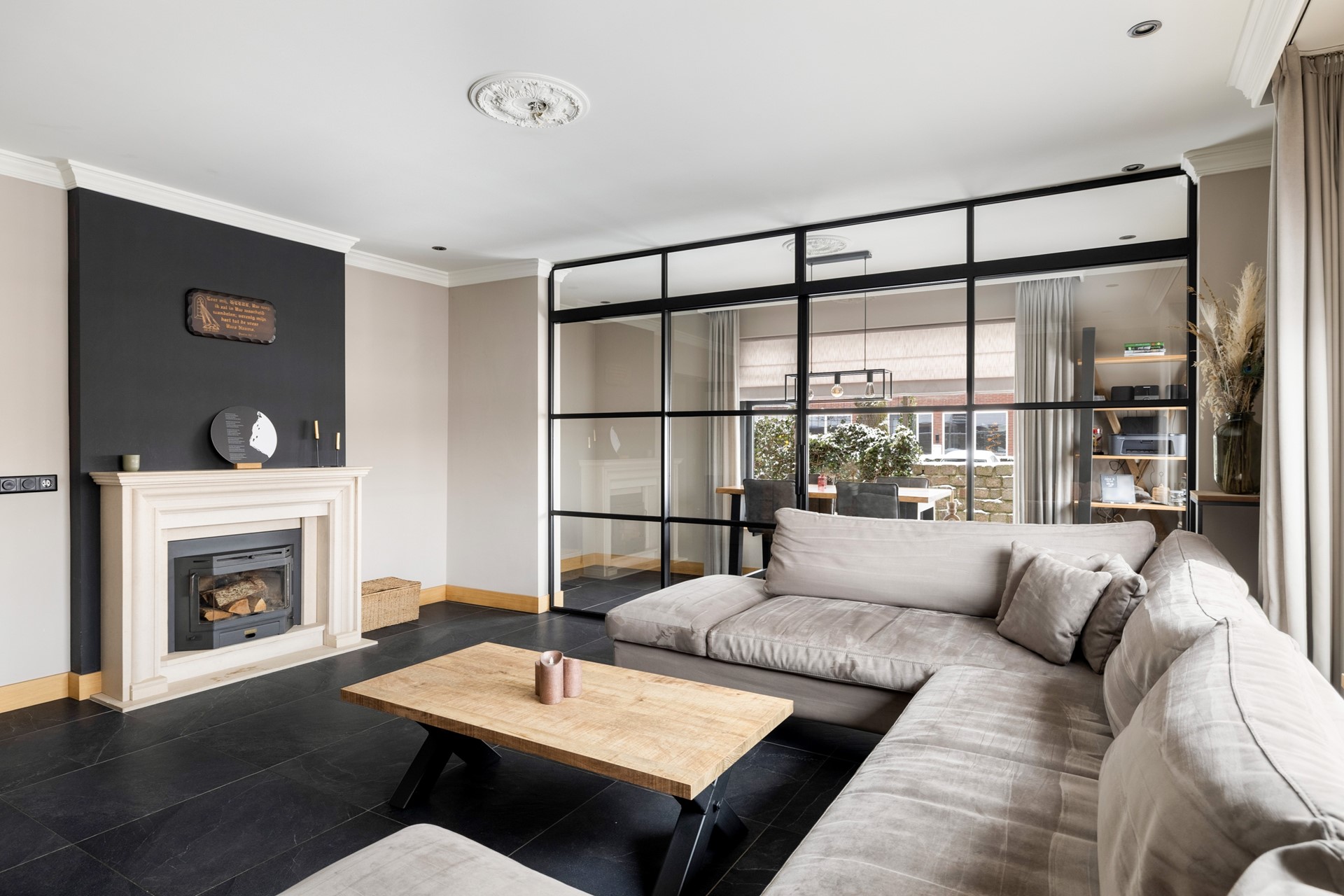 Via de entree kom je in de ruime hal, die toegang biedt tot de betegelde toiletruimte met wandcloset en fontein, de badkamer met douche, ligbad en wastafelmeubel, de provisiekast en de trapopgang naar de eerste verdieping. De woonkeuken is voorzien van een plavuizen vloer en een granieten keukenblad en beschikt over een inductiekookplaat, afzuigkap, koelkast, combimagnetron en vaatwasser. Aan de voorzijde van de woning ligt de sfeervolle woonkamer met gestukt plafond en inbouwspots. De ruimte is voorzien van een parketvloer en een houtkachel. Dankzij de stalenschuifdeuren kan de woonkamer eenvoudig in tweeën worden gedeeld, bijvoorbeeld om een speelhoek voor de kinderen of een werkplek te creëren. De begane grond is bovendien voorzien van comfortabele vloerverwarming, wat zorgt voor extra comfort en warmte.