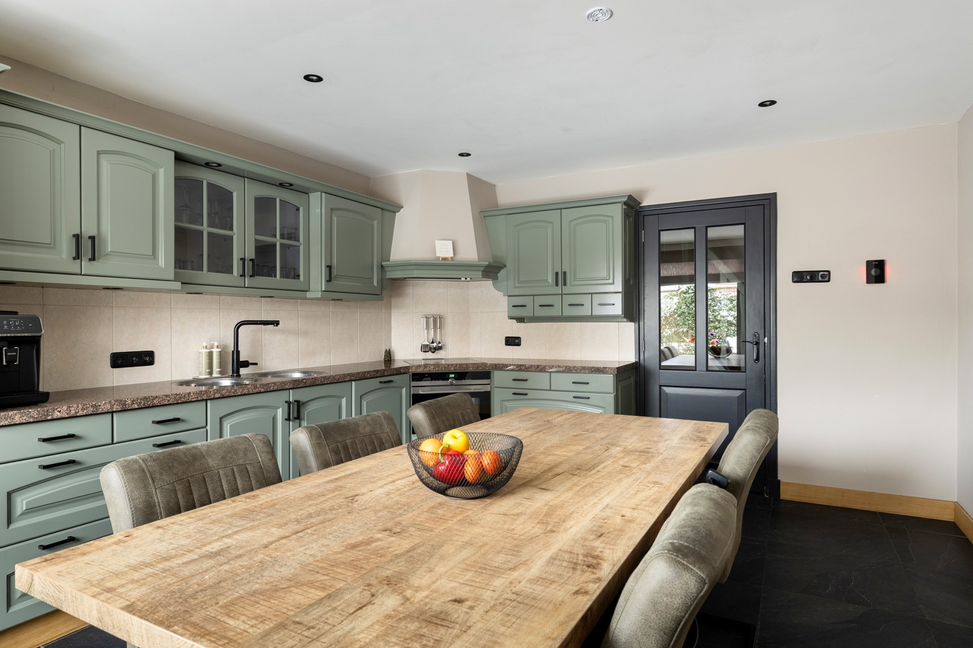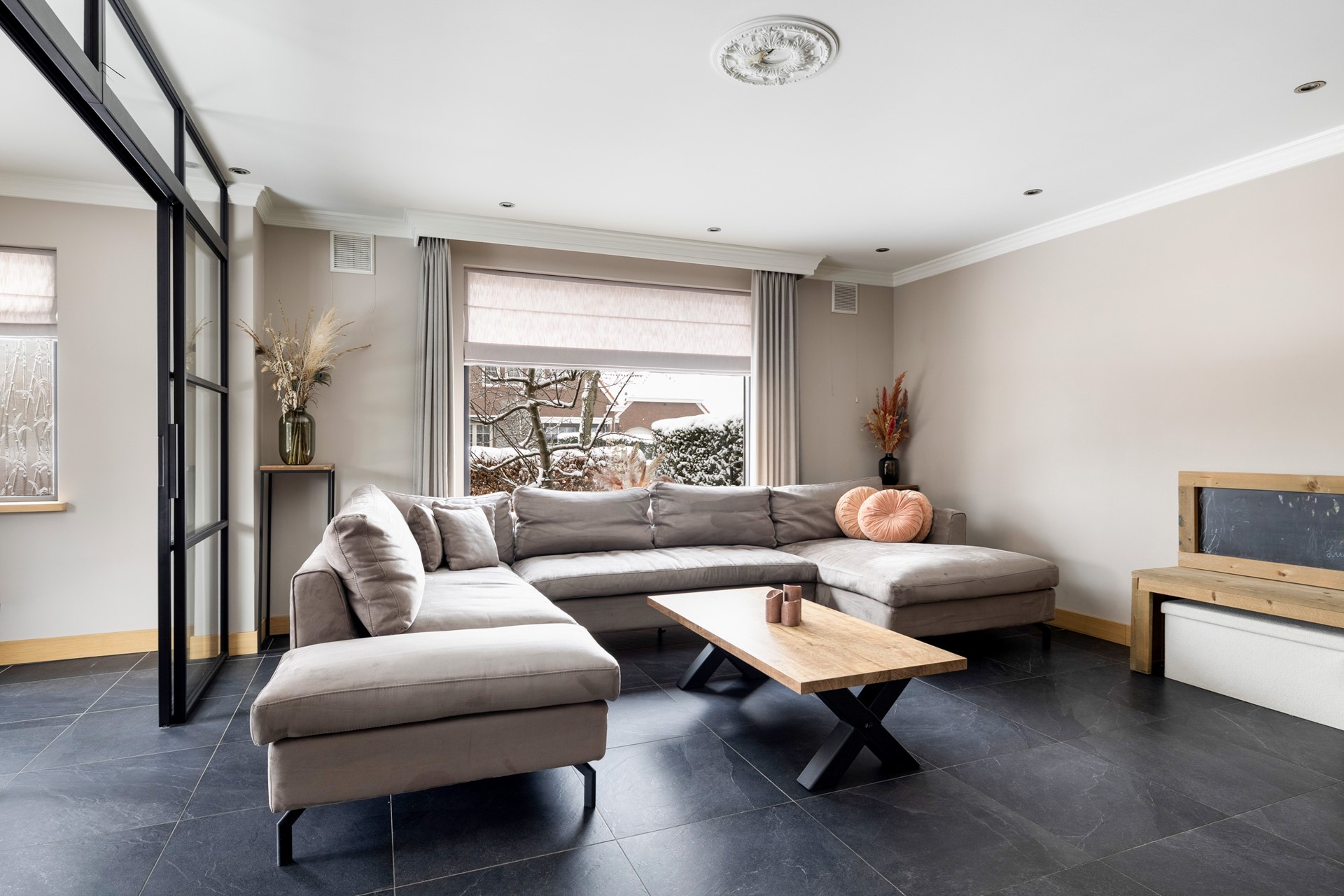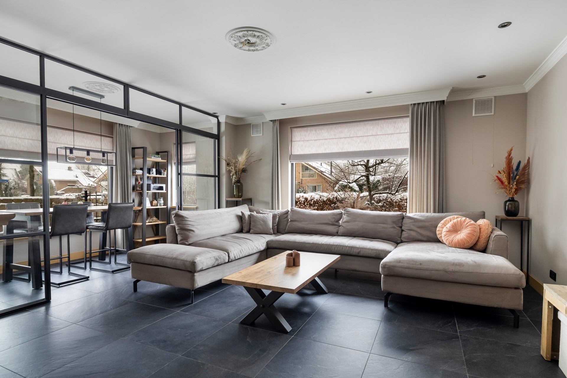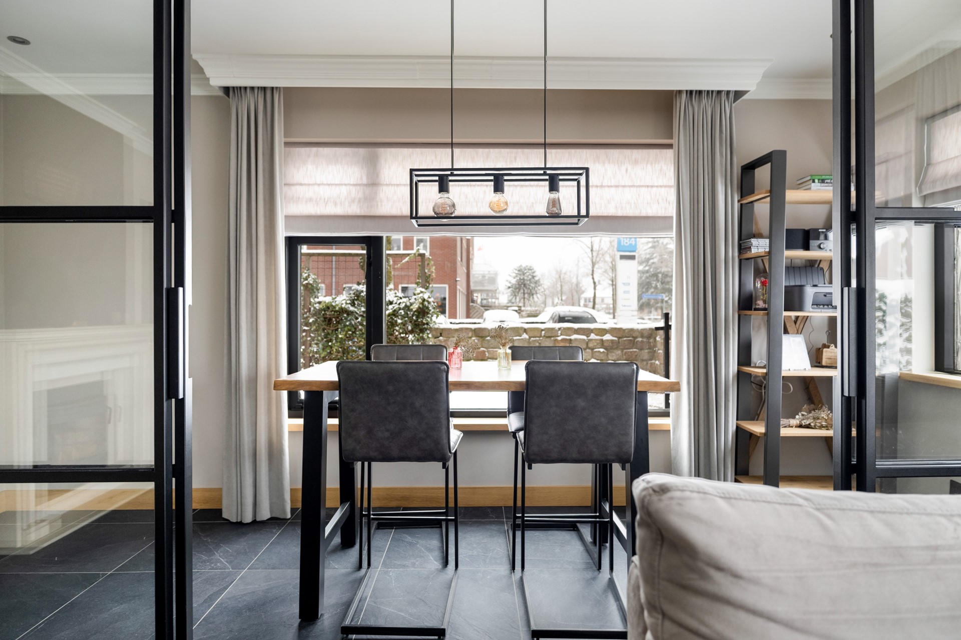 Via de entree kom je in de ruime hal, die toegang biedt tot de betegelde toiletruimte met wandcloset en fontein, de badkamer met douche, ligbad en wastafelmeubel, de provisiekast en de trapopgang naar de eerste verdieping. De woonkeuken is voorzien van een plavuizen vloer en een granieten keukenblad en beschikt over een inductiekookplaat, afzuigkap, koelkast, combimagnetron en vaatwasser. Aan de voorzijde van de woning ligt de sfeervolle woonkamer met gestukt plafond en inbouwspots. De ruimte is voorzien van een parketvloer en een houtkachel. Dankzij de stalenschuifdeuren kan de woonkamer eenvoudig in tweeën worden gedeeld, bijvoorbeeld om een speelhoek voor de kinderen of een werkplek te creëren. De begane grond is bovendien voorzien van comfortabele vloerverwarming, wat zorgt voor extra comfort en warmte.