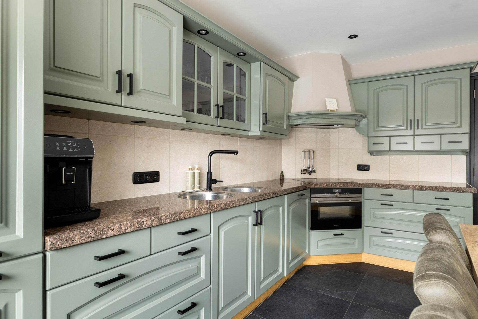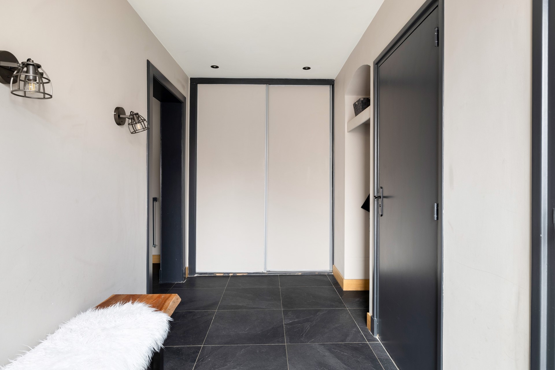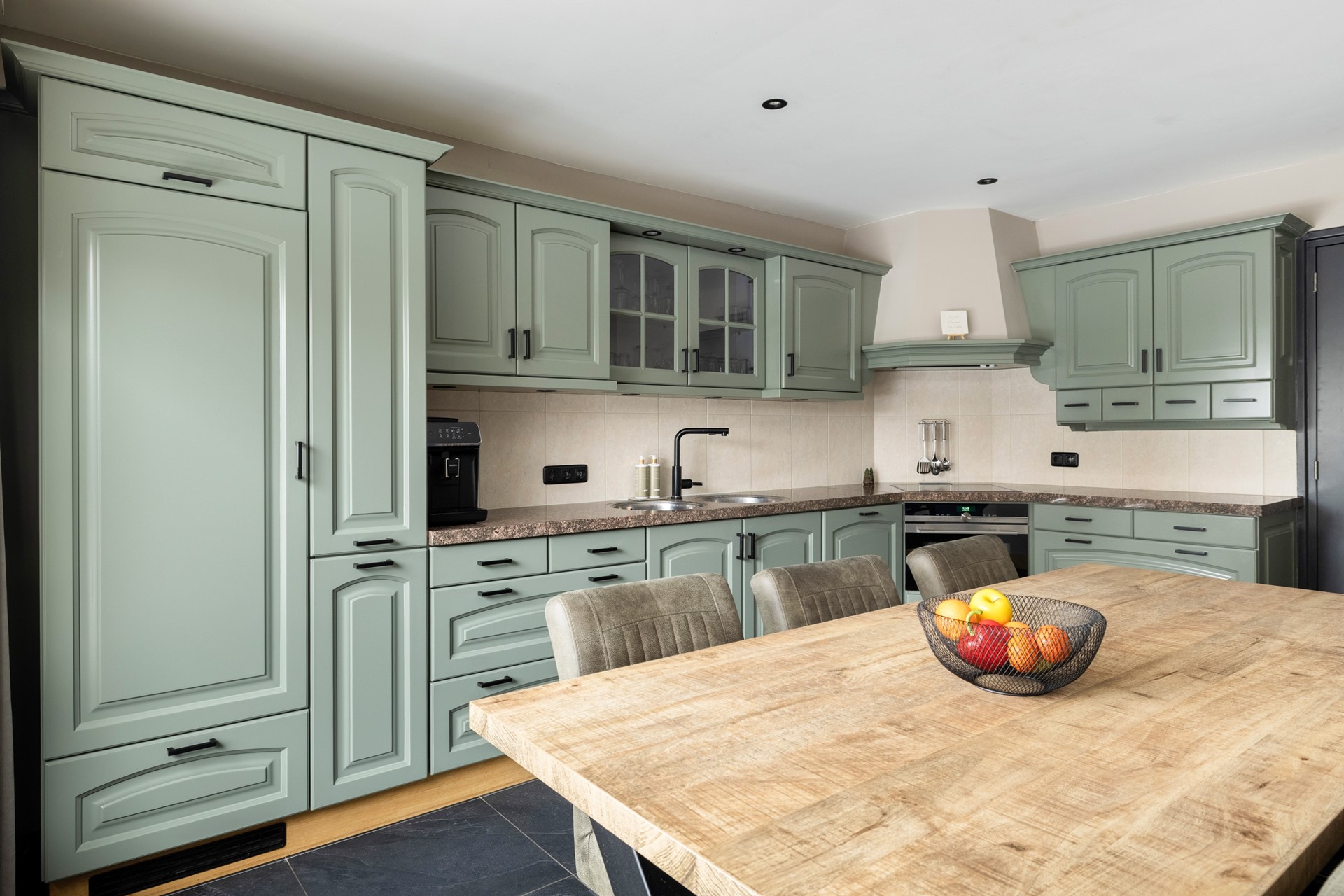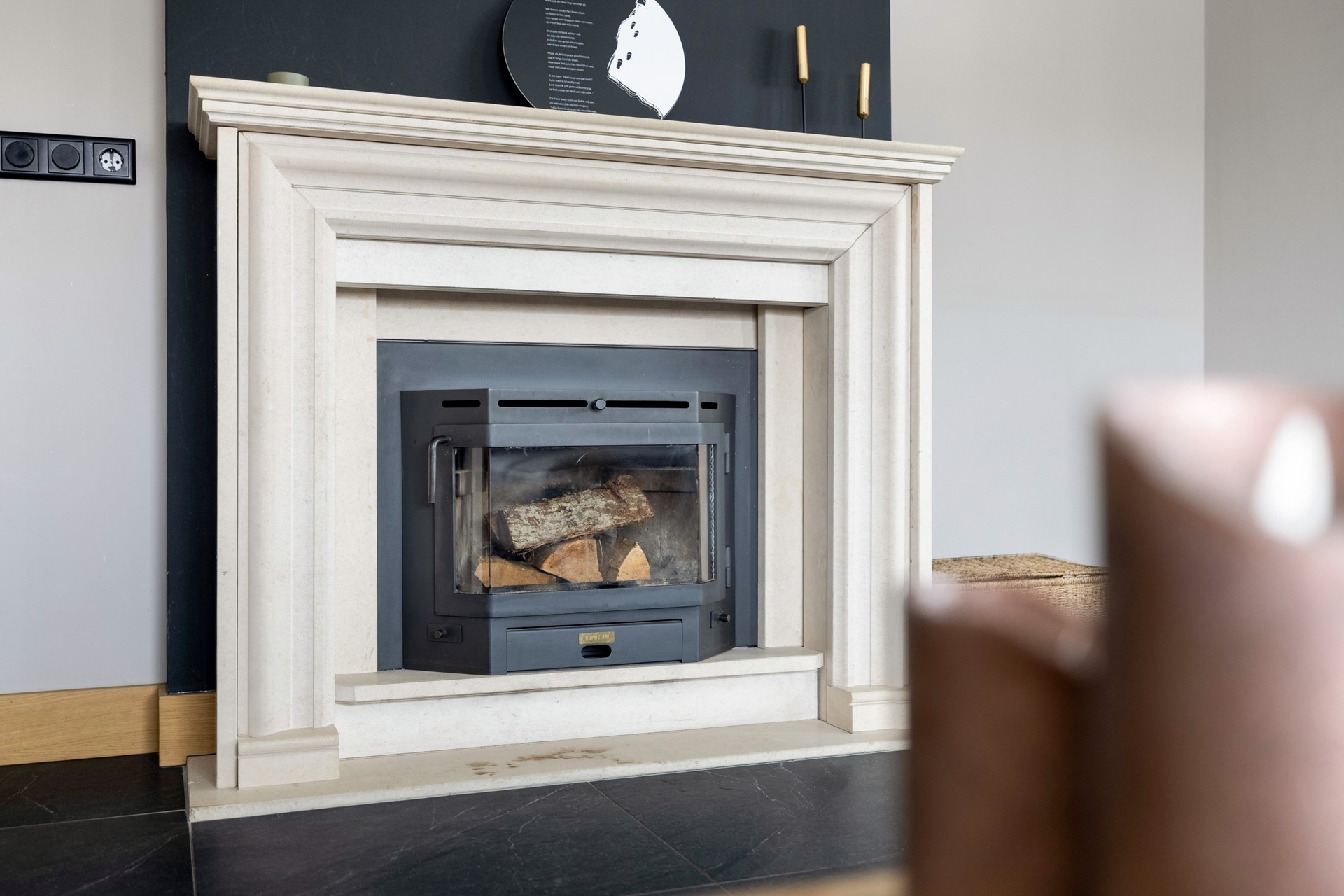 Via de entree kom je in de ruime hal, die toegang biedt tot de betegelde toiletruimte met wandcloset en fontein, de badkamer met douche, ligbad en wastafelmeubel, de provisiekast en de trapopgang naar de eerste verdieping. De woonkeuken is voorzien van een plavuizen vloer en een granieten keukenblad en beschikt over een inductiekookplaat, afzuigkap, koelkast, combimagnetron en vaatwasser. Aan de voorzijde van de woning ligt de sfeervolle woonkamer met gestukt plafond en inbouwspots. De ruimte is voorzien van een parketvloer en een houtkachel. Dankzij de stalenschuifdeuren kan de woonkamer eenvoudig in tweeën worden gedeeld, bijvoorbeeld om een speelhoek voor de kinderen of een werkplek te creëren. De begane grond is bovendien voorzien van comfortabele vloerverwarming, wat zorgt voor extra comfort en warmte.