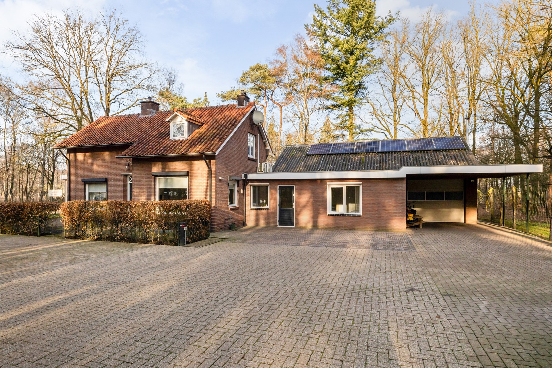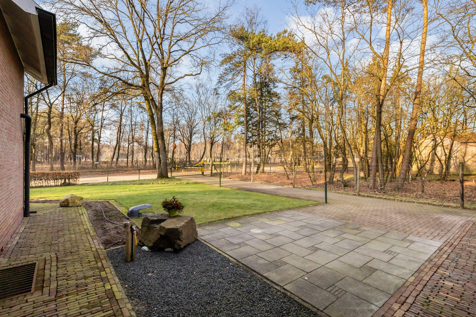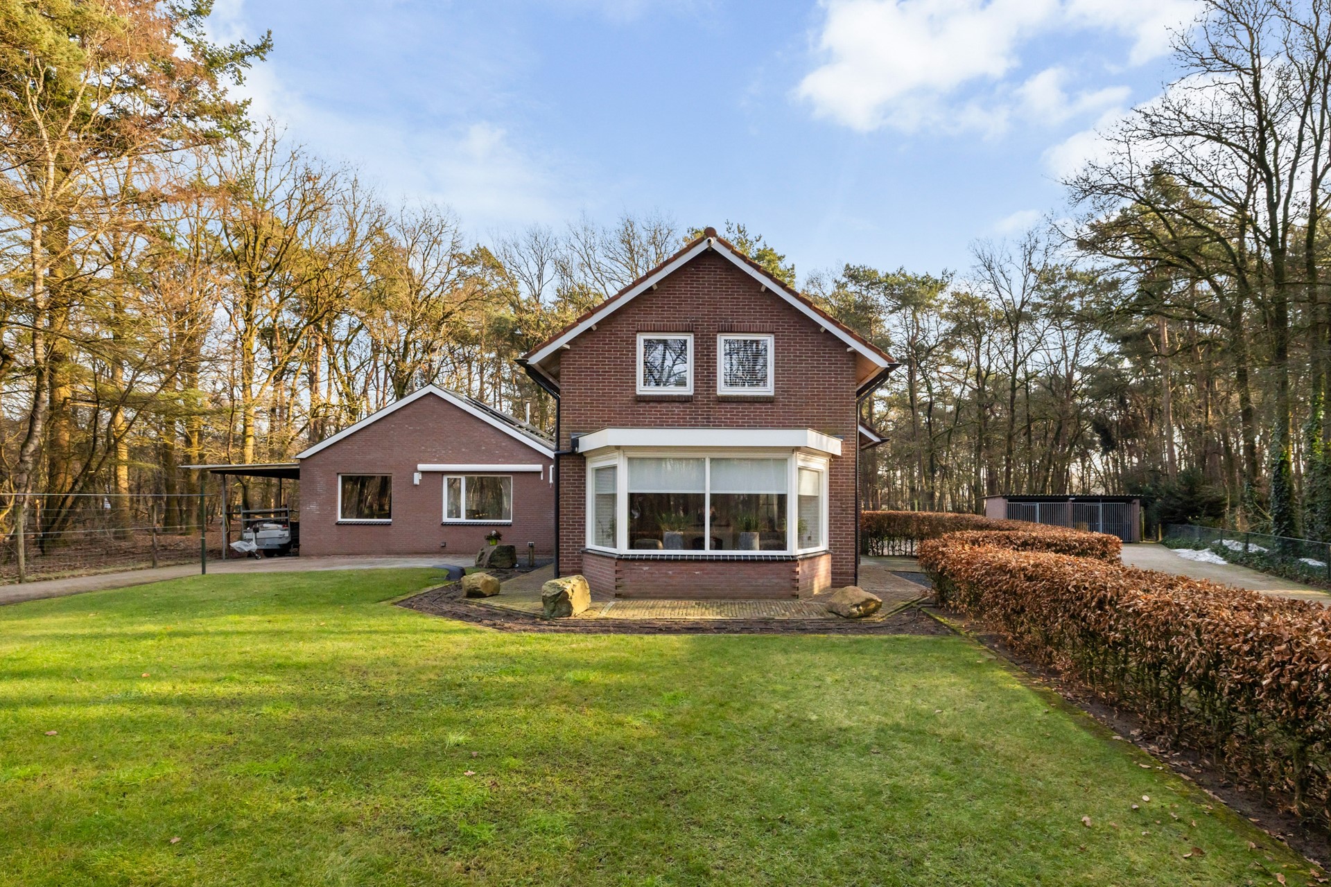 Een van de grote pluspunten van deze woning zijn de royale overkappingen en de aangebouwde stenen garage. Deze bieden volop ruimte voor het stallen van auto’s, werkbussen of andere voertuigen en zorgen daarnaast voor meer dan voldoende bergruimte. In de garage bevindt zich bovendien een vlizotrap naar een ruime vliering, ideaal voor het opbergen van spullen. Rondom de woning ligt een royale tuin die uitnodigt tot het creëren van meerdere gezellige zitplekken. Of je nu wilt ontspannen in de zon of juist de schaduw opzoekt, hier geniet je optimaal van het buitenleven. Dankzij het vele groen en de aanwezige bomen zit je bovendien heerlijk beschut.
