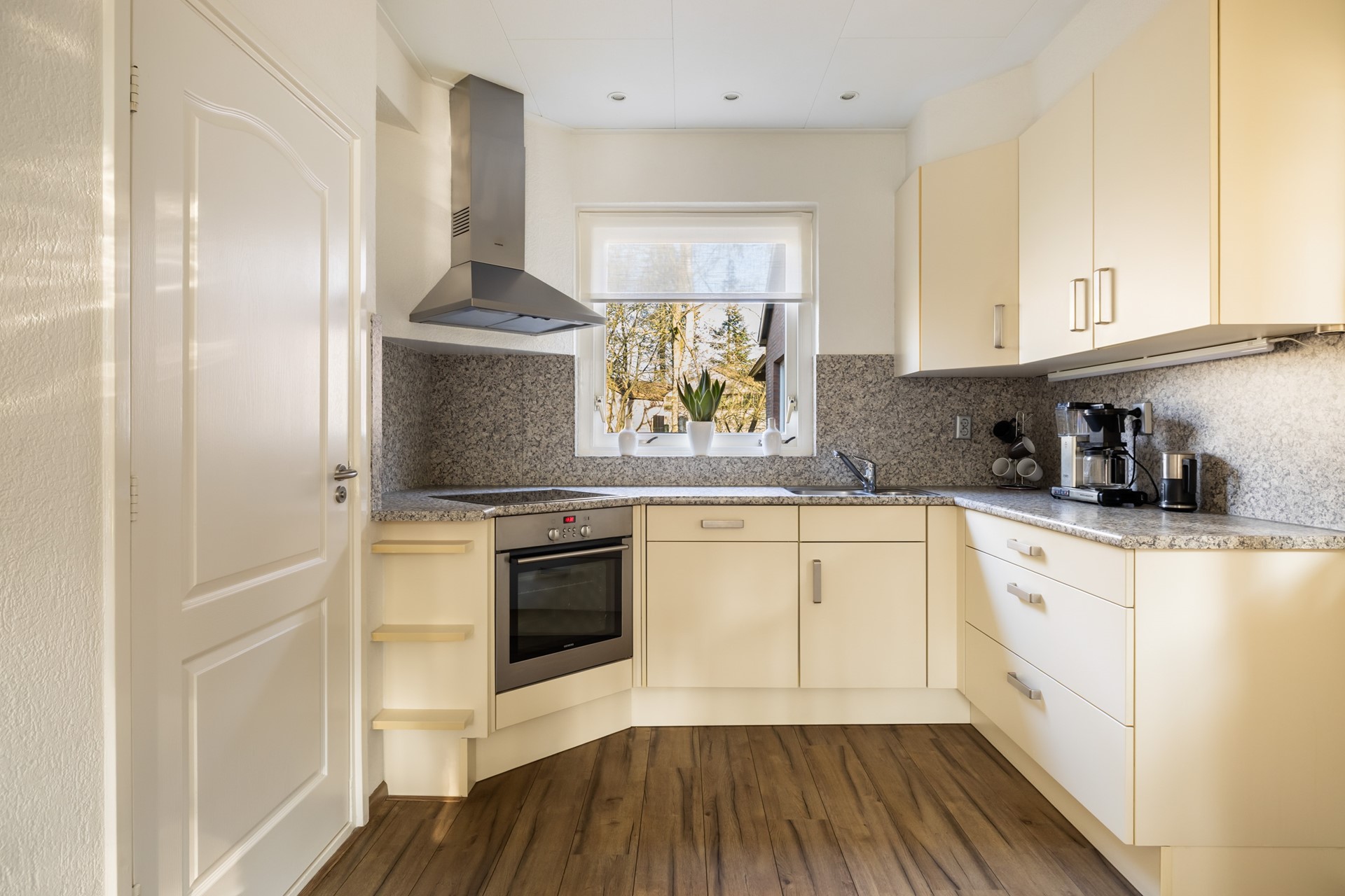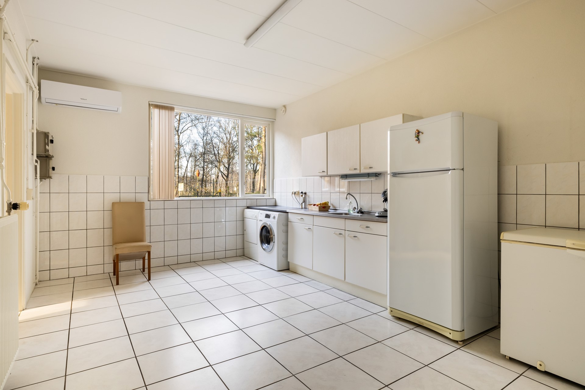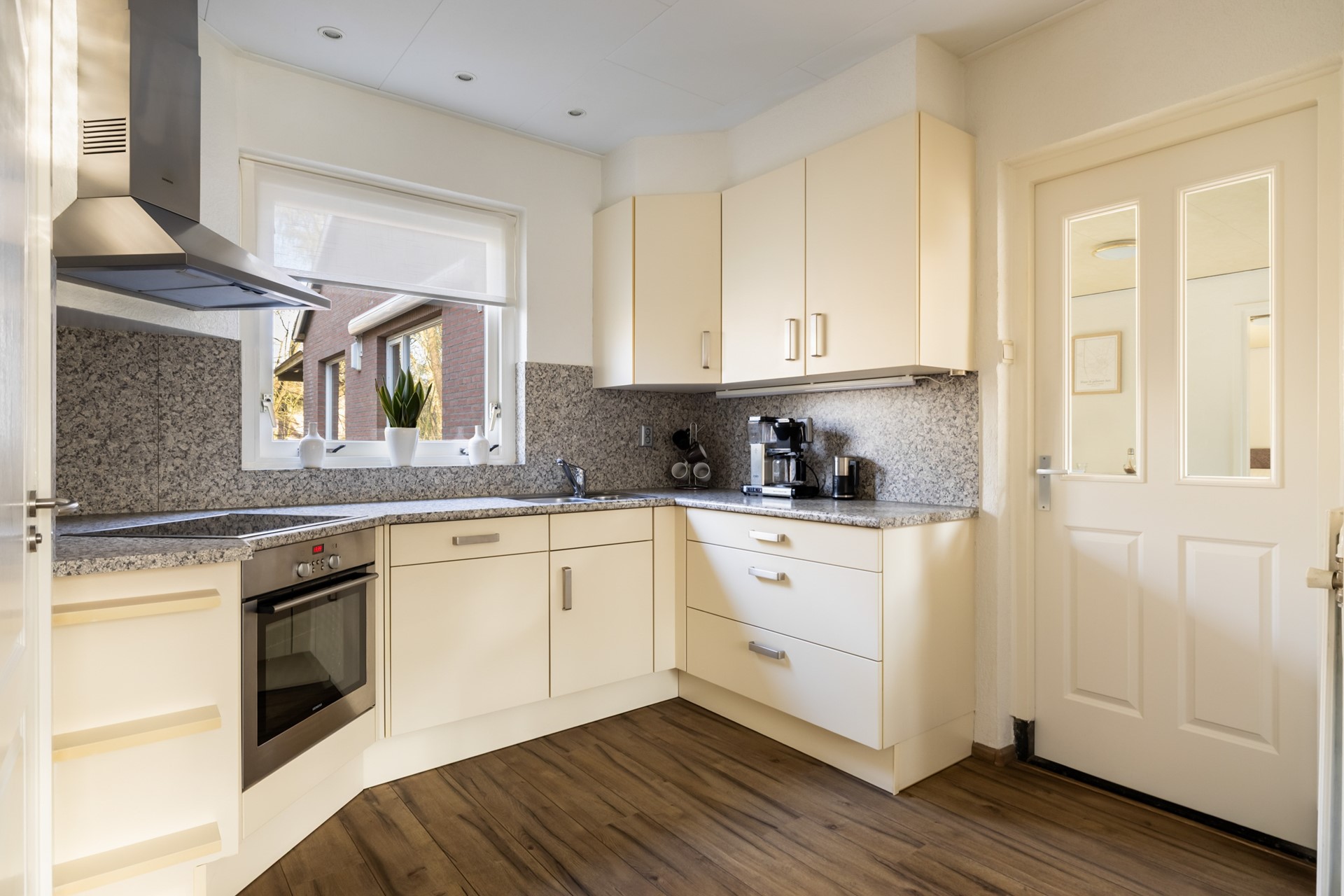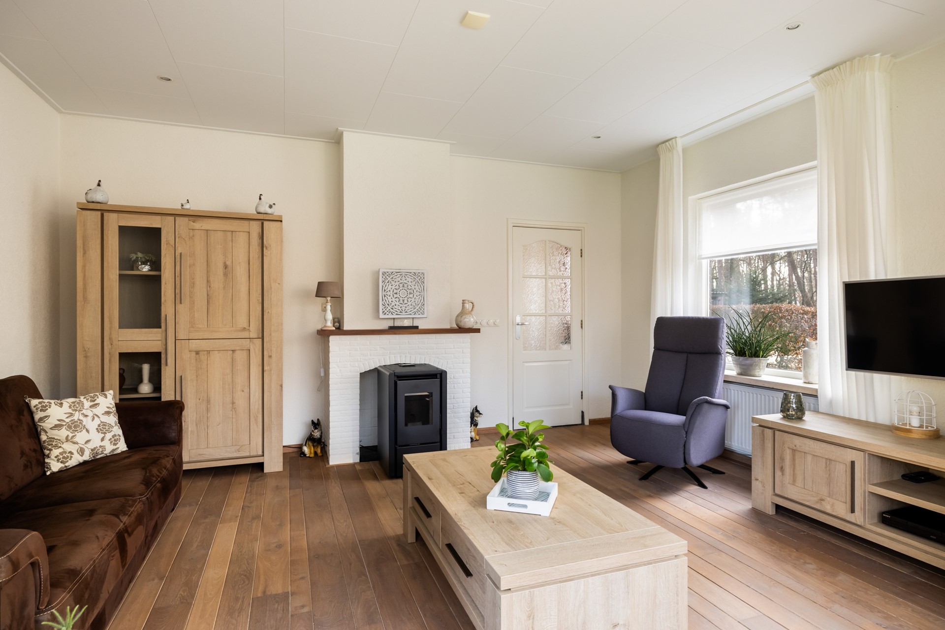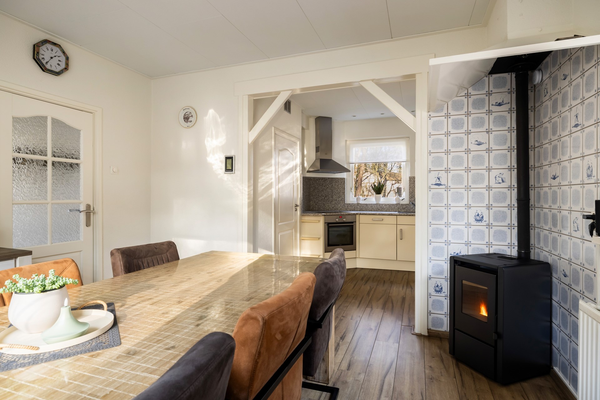 Via de entree kom je in de hal, die toegang biedt tot de woonkamer, eetkamer, toiletruimte, kelderkast en de trap naar de 1e verdieping. De woonkamer, gelegen aan de voorzijde van de woning, beschikt over een houten vloer en vormt dankzij de pelletkachel en de ruime erker een warme en sfeervolle leefruimte. De eetkamer is eveneens voorzien van een pelletkachel en staat in open verbinding met de keuken. De keuken is uitgevoerd in een praktische hoekopstelling en uitgerust met een inductiekookplaat, afzuigkap, oven en vaatwasser. Daarnaast bevindt zich in de keuken een bergkast met daarin de cv-installatie (Nefit, 2008). Via zowel de keuken als de tuin bereik je de bijkeuken. Deze multifunctionele ruimte beschikt over airconditioning, een keukenblok en aansluitingen voor de wasmachine en droger. Vanuit hier heb je toegang tot de garage, een slaapkamer en een kantoorruimte. Dankzij de slaapkamer op de begane grond is de woning bovendien levensloopbestendig