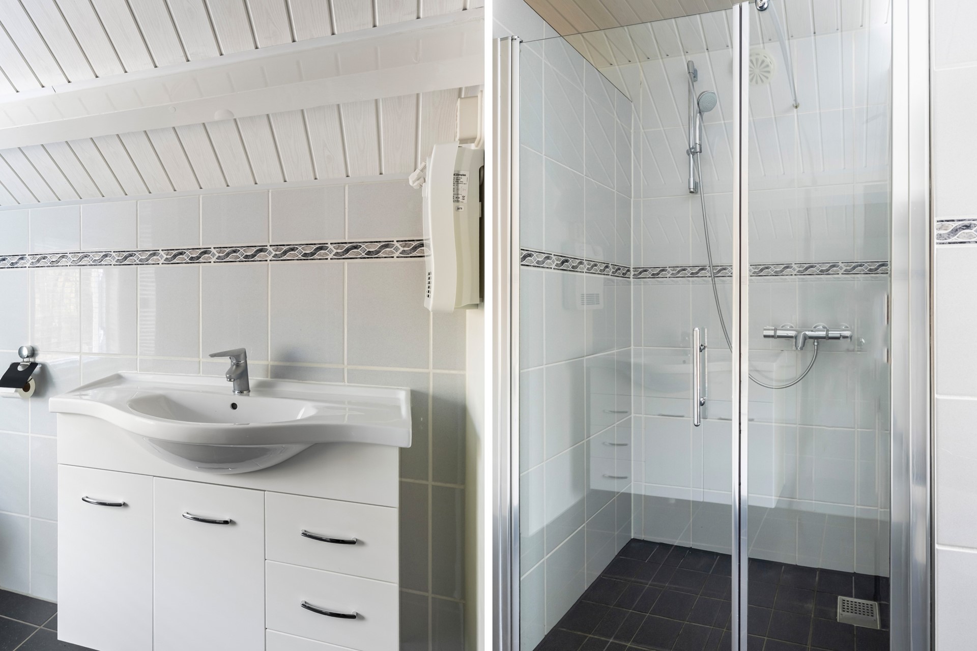 Via de vaste trap bereik je de overloop van de eerste verdieping. Vanaf hier heb je toegang tot drie slaapkamers en de badkamer. De badkamer is volledig betegeld en ingericht met een douche, toilet, wastafelmeubel en een praktische vaste kast. Zowel de badkamer als de aangrenzende slaapkamer, die eveneens over een vaste kast beschikt, bevinden zich aan de voorzijde van de woning. Aan de achterzijde liggen de overige twee slaapkamers. Eén van deze kamers is voorzien van een vaste kast, terwijl de andere dankzij de dakkapel extra licht en ruimte biedt. Op de overloop zelf is tot slot ook nog een vaste kast aanwezig, ideaal voor extra bergruimte.