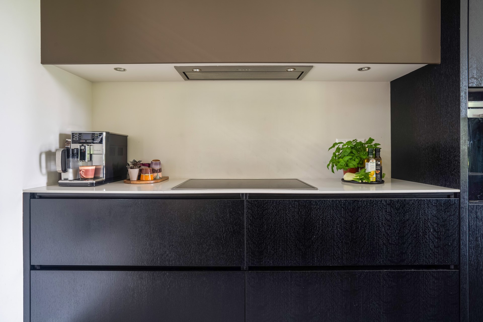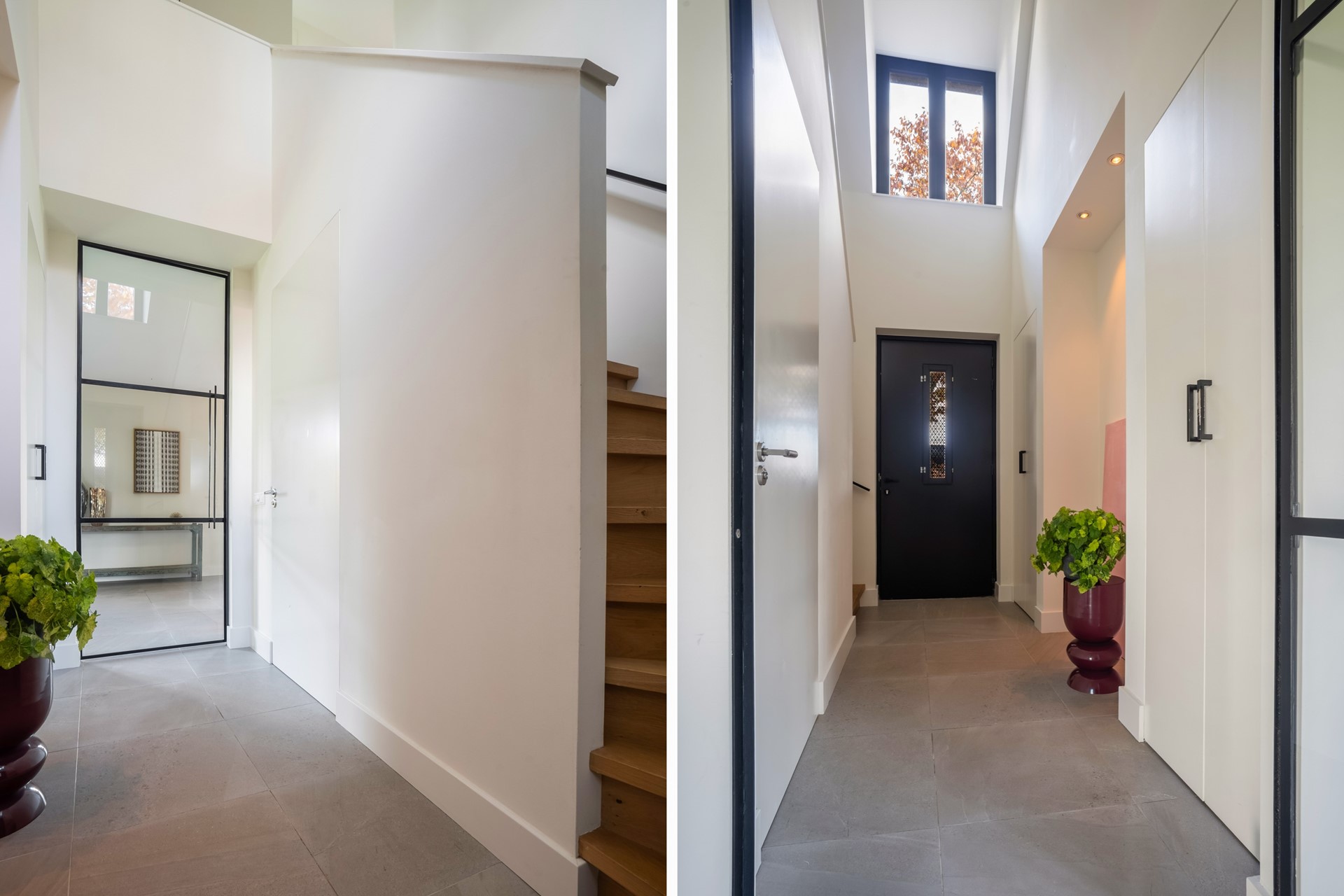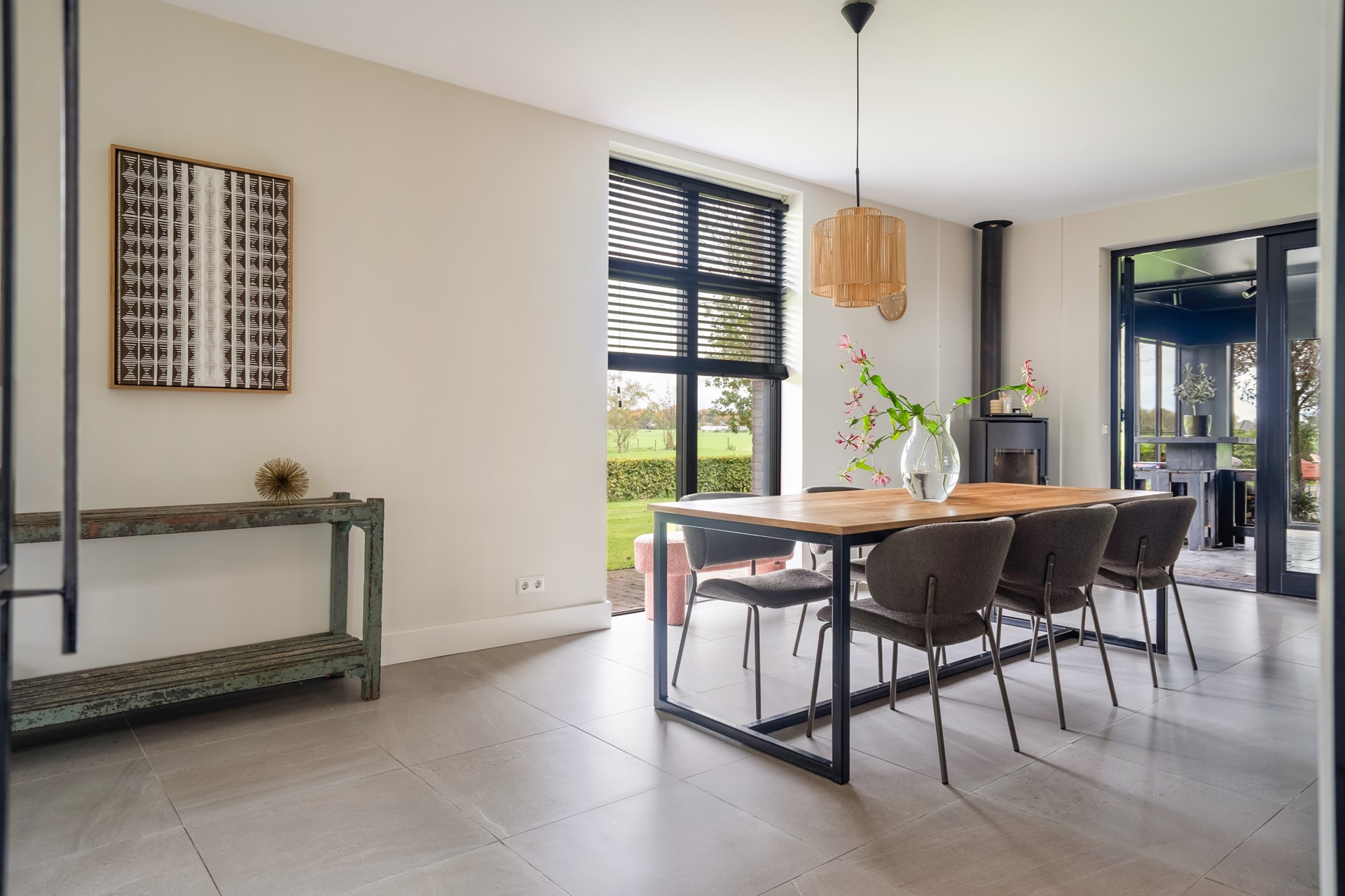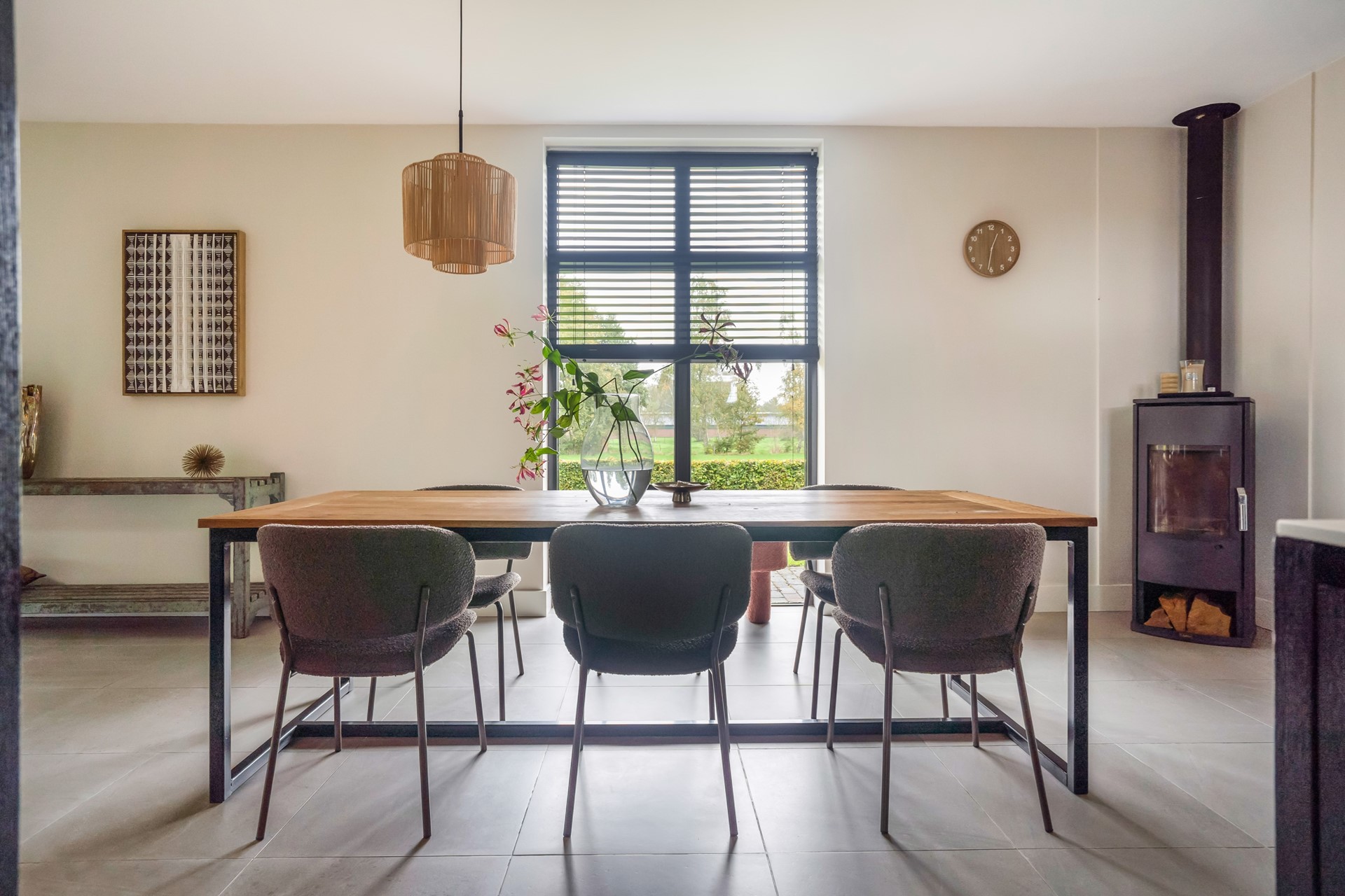 Via de entree kom je binnen in de prachtige, strak afgewerkte hal met vide. Deze ruimte geeft toegang tot de trapopgang naar de 1e verdieping, meterkast, toiletruimte (wandcloset en fonteintje) en de woonkamer. Door de stijlvolle stalen deuren stap je de royale woonkamer binnen, waar het gestuukte plafond met inbouwspots zorgt voor een moderne uitstraling. Rondom de gezellige gaskachel is volop ruimte om een sfeervolle zithoek te creëren. In het verlengde van de woonkamer bevindt zich de ruime woonkeuken. Ook hier zorgt een houtkachel voor extra warmte en gezelligheid. De moderne keuken is luxe uitgevoerd met een kookeiland en uitgerust met een inductiekookplaat, afzuigkap, koelkast, vaatwasser en combi-oven. Aan het eiland is bovendien een bar gerealiseerd, perfect voor een kop koffie in de ochtend of een leuk gesprek tijdens het koken. Via openslaande deuren bereik je de serre, waar je het hele jaar door van het buitengevoel kunt genieten. Vanuit de keuken is tevens de bijkeuken bereikbaar. Achter de nette kastenwand zijn hier de cv-installatie (Nefit, 2017) en de aansluitingen voor wasmachine en droger keurig weggewerkt. Vanuit de bijkeuken heb je bovendien directe toegang tot de garage. De gehele begane grond is tot slot strak afgewerkt, voorzien van vloerverwarming en een fraaie plavuizenvloer.