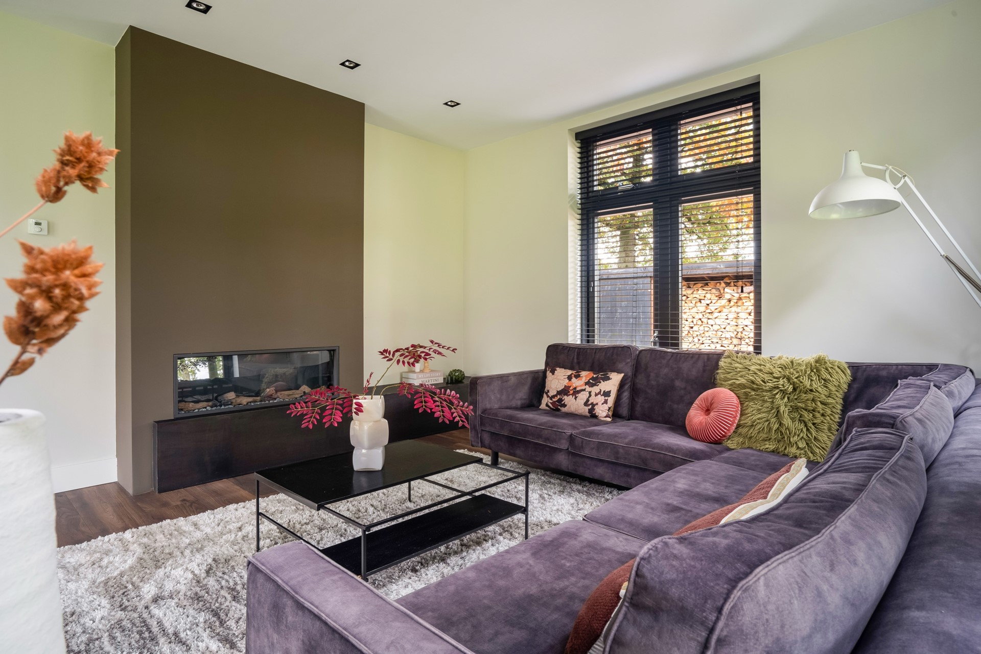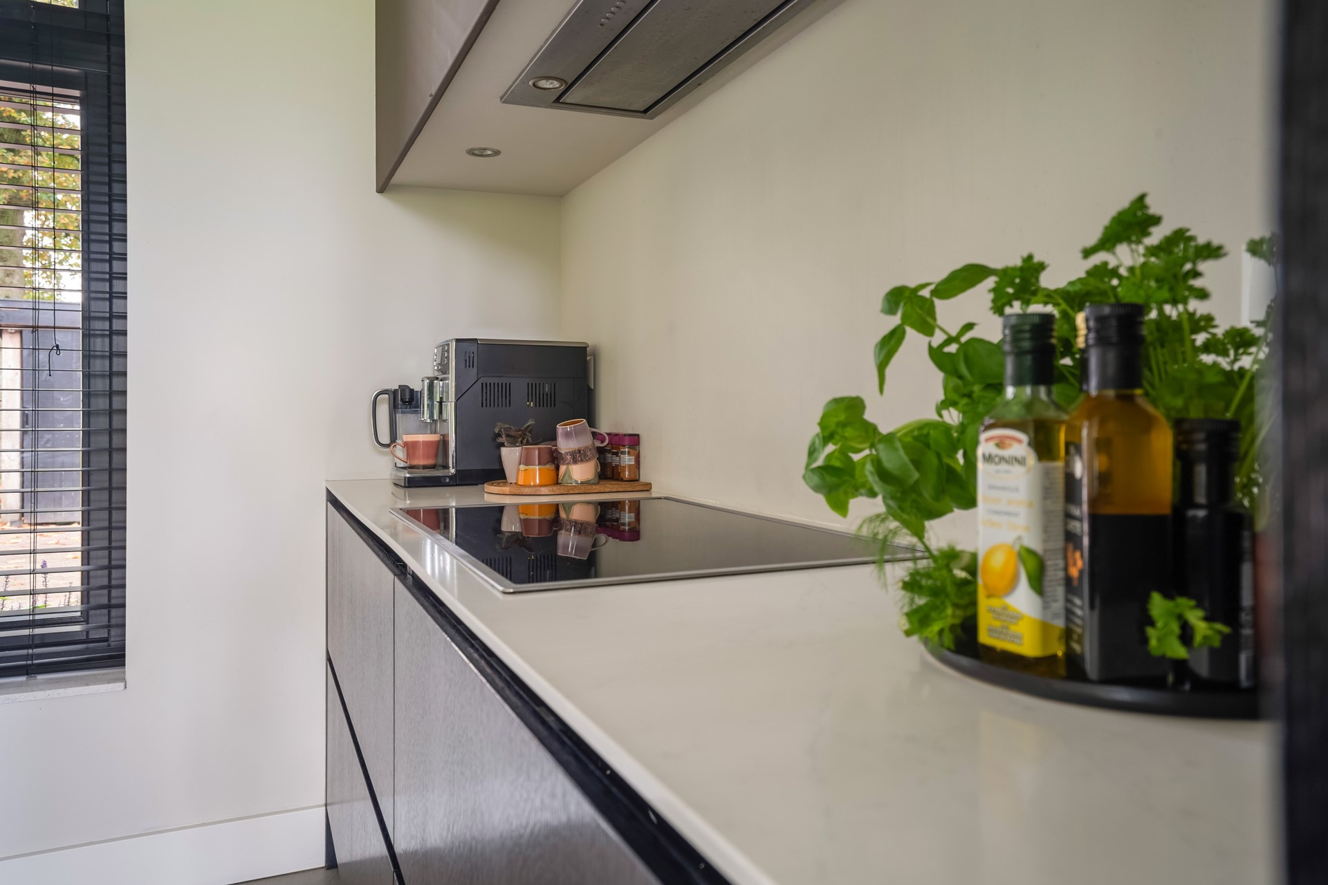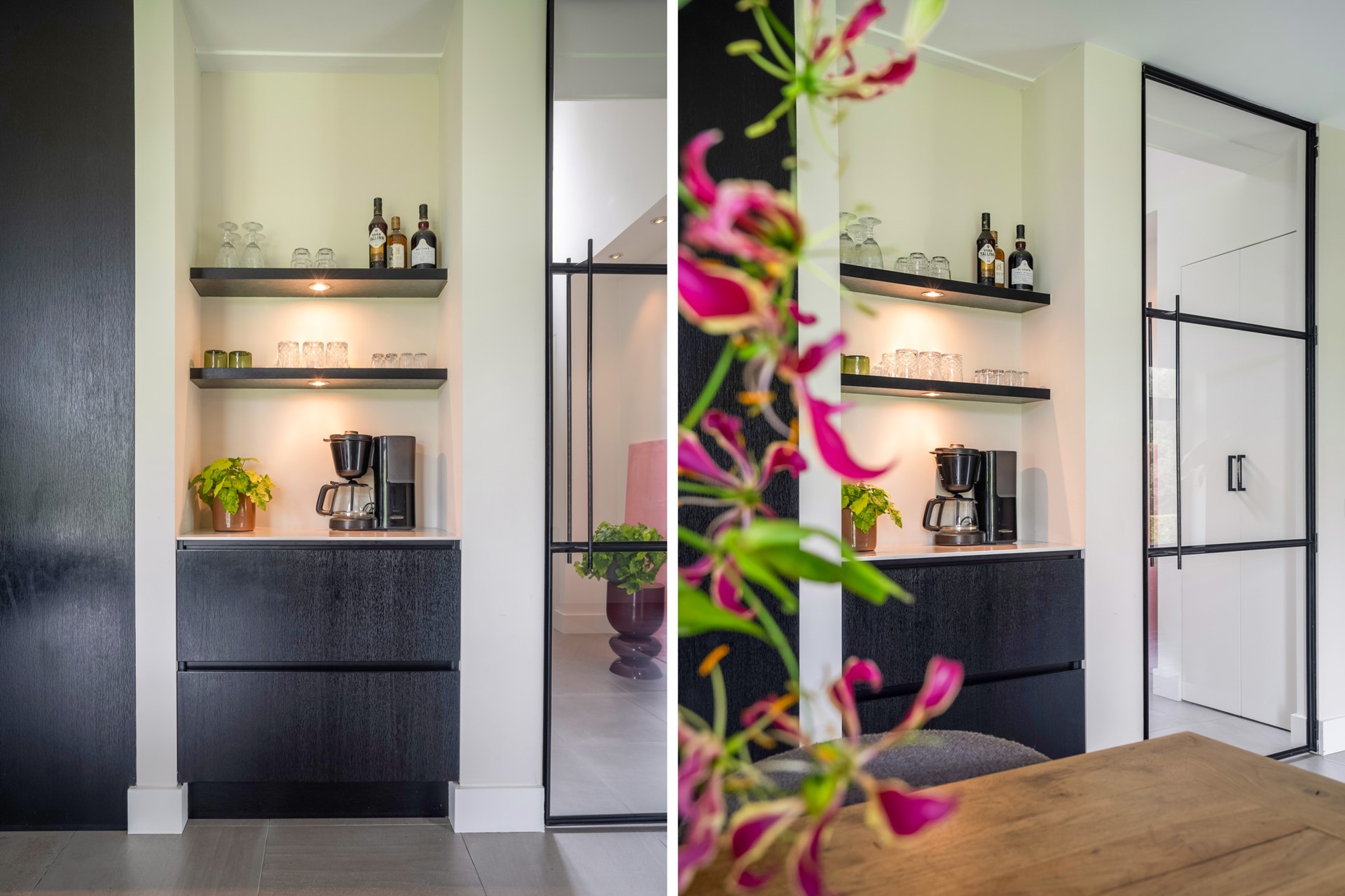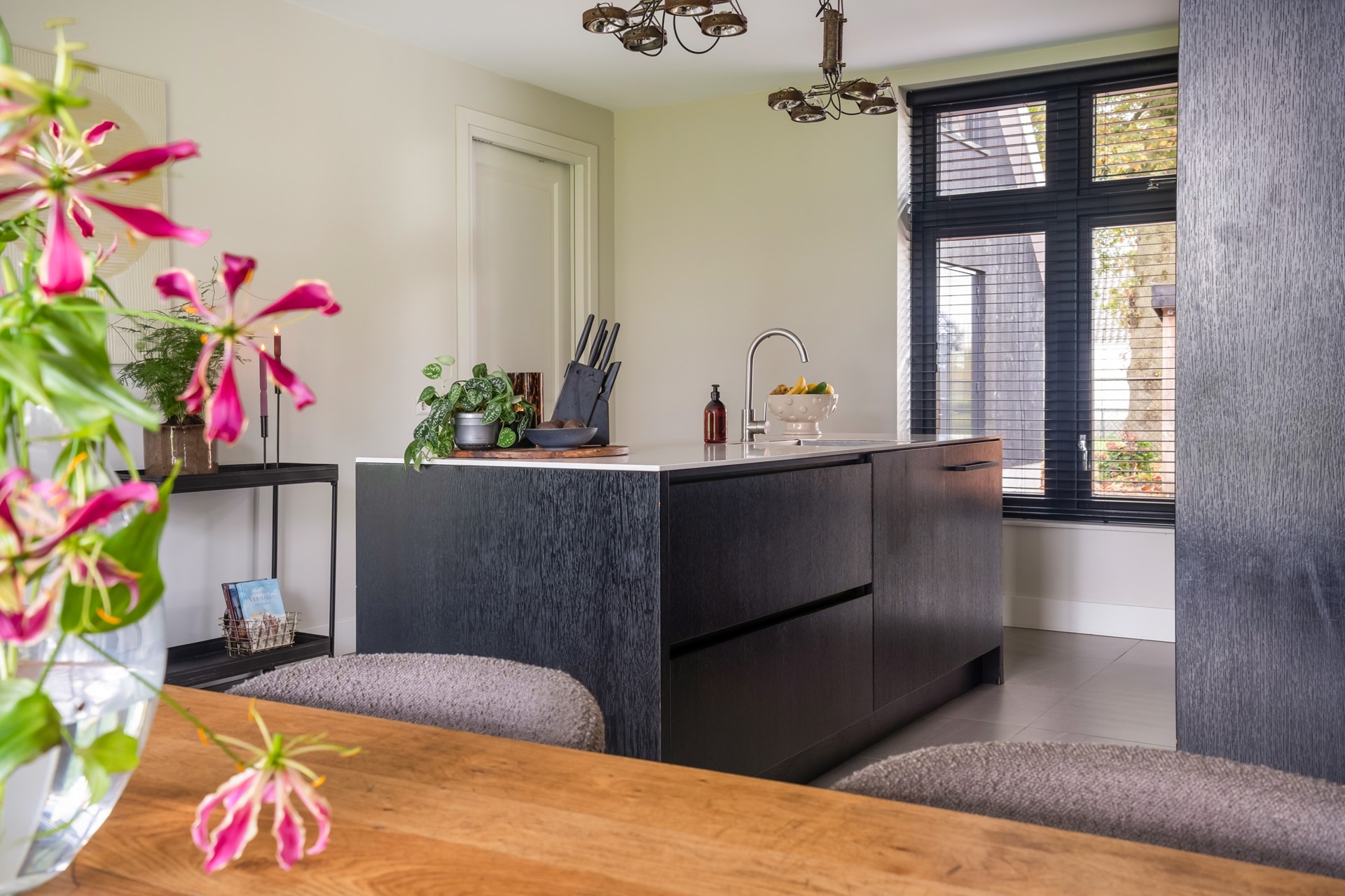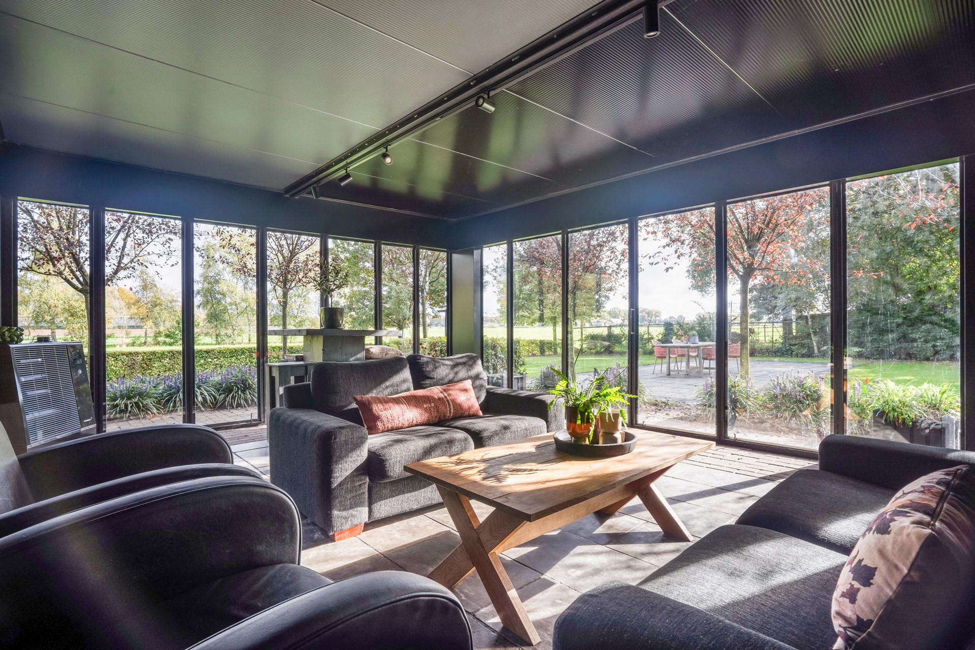 Via de entree kom je binnen in de prachtige, strak afgewerkte hal met vide. Deze ruimte geeft toegang tot de trapopgang naar de 1e verdieping, meterkast, toiletruimte (wandcloset en fonteintje) en de woonkamer. Door de stijlvolle stalen deuren stap je de royale woonkamer binnen, waar het gestuukte plafond met inbouwspots zorgt voor een moderne uitstraling. Rondom de gezellige gaskachel is volop ruimte om een sfeervolle zithoek te creëren. In het verlengde van de woonkamer bevindt zich de ruime woonkeuken. Ook hier zorgt een houtkachel voor extra warmte en gezelligheid. De moderne keuken is luxe uitgevoerd met een kookeiland en uitgerust met een inductiekookplaat, afzuigkap, koelkast, vaatwasser en combi-oven. Aan het eiland is bovendien een bar gerealiseerd, perfect voor een kop koffie in de ochtend of een leuk gesprek tijdens het koken. Via openslaande deuren bereik je de serre, waar je het hele jaar door van het buitengevoel kunt genieten. Vanuit de keuken is tevens de bijkeuken bereikbaar. Achter de nette kastenwand zijn hier de cv-installatie (Nefit, 2017) en de aansluitingen voor wasmachine en droger keurig weggewerkt. Vanuit de bijkeuken heb je bovendien directe toegang tot de garage. De gehele begane grond is tot slot strak afgewerkt, voorzien van vloerverwarming en een fraaie plavuizenvloer.