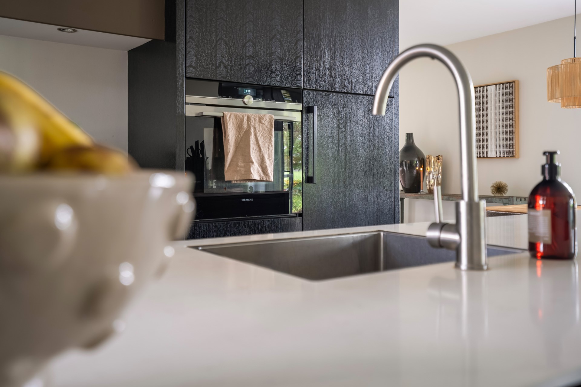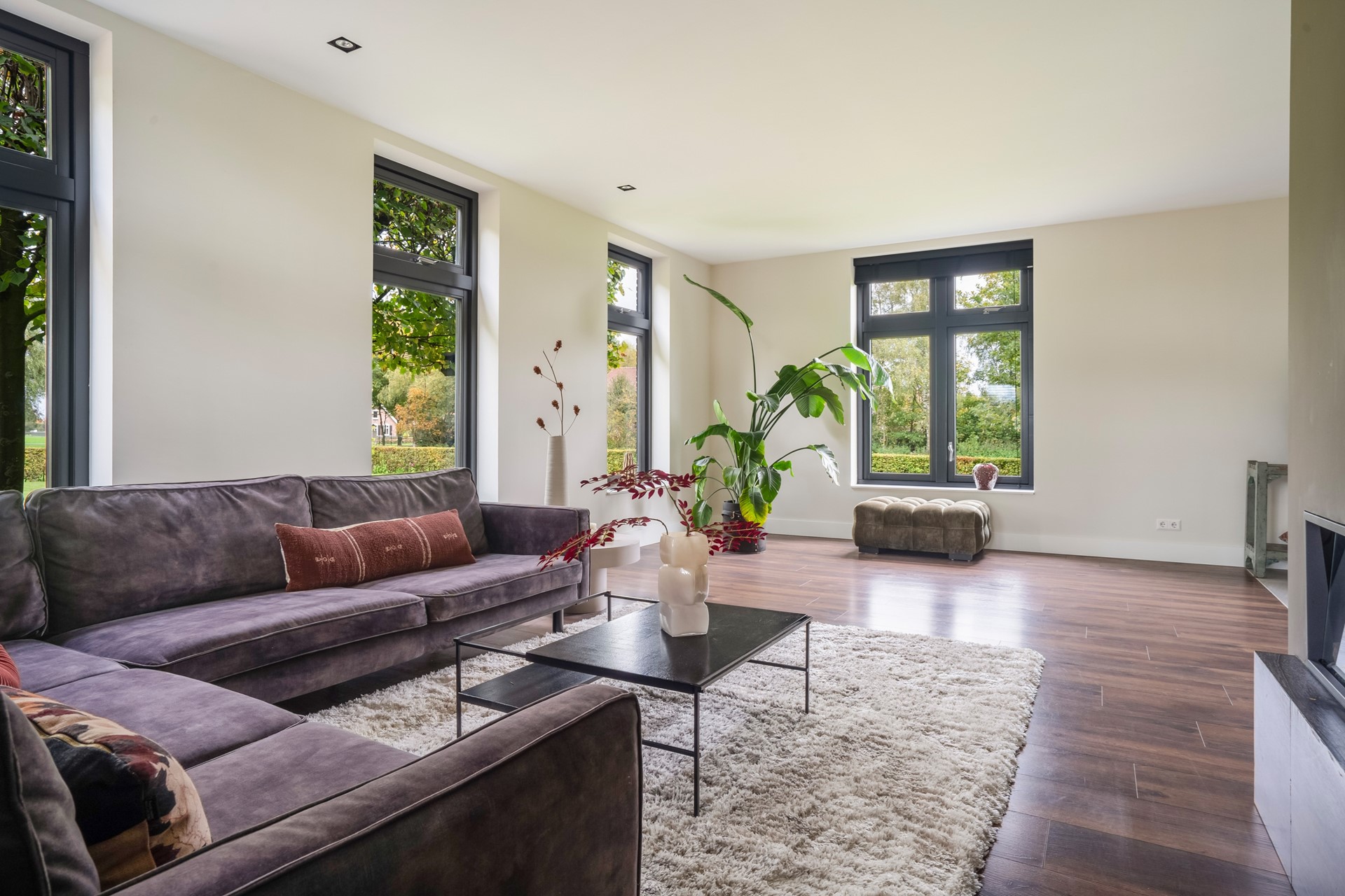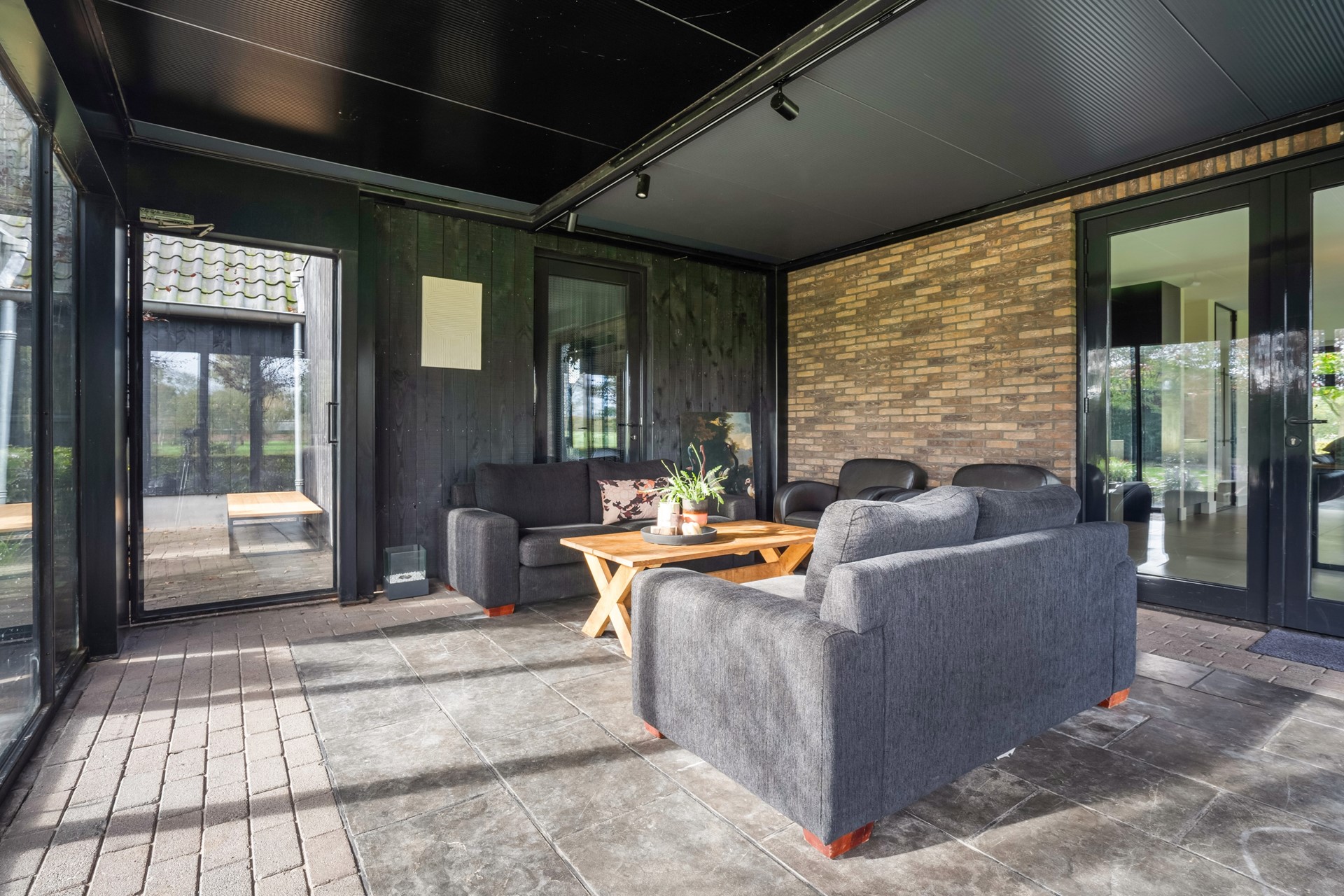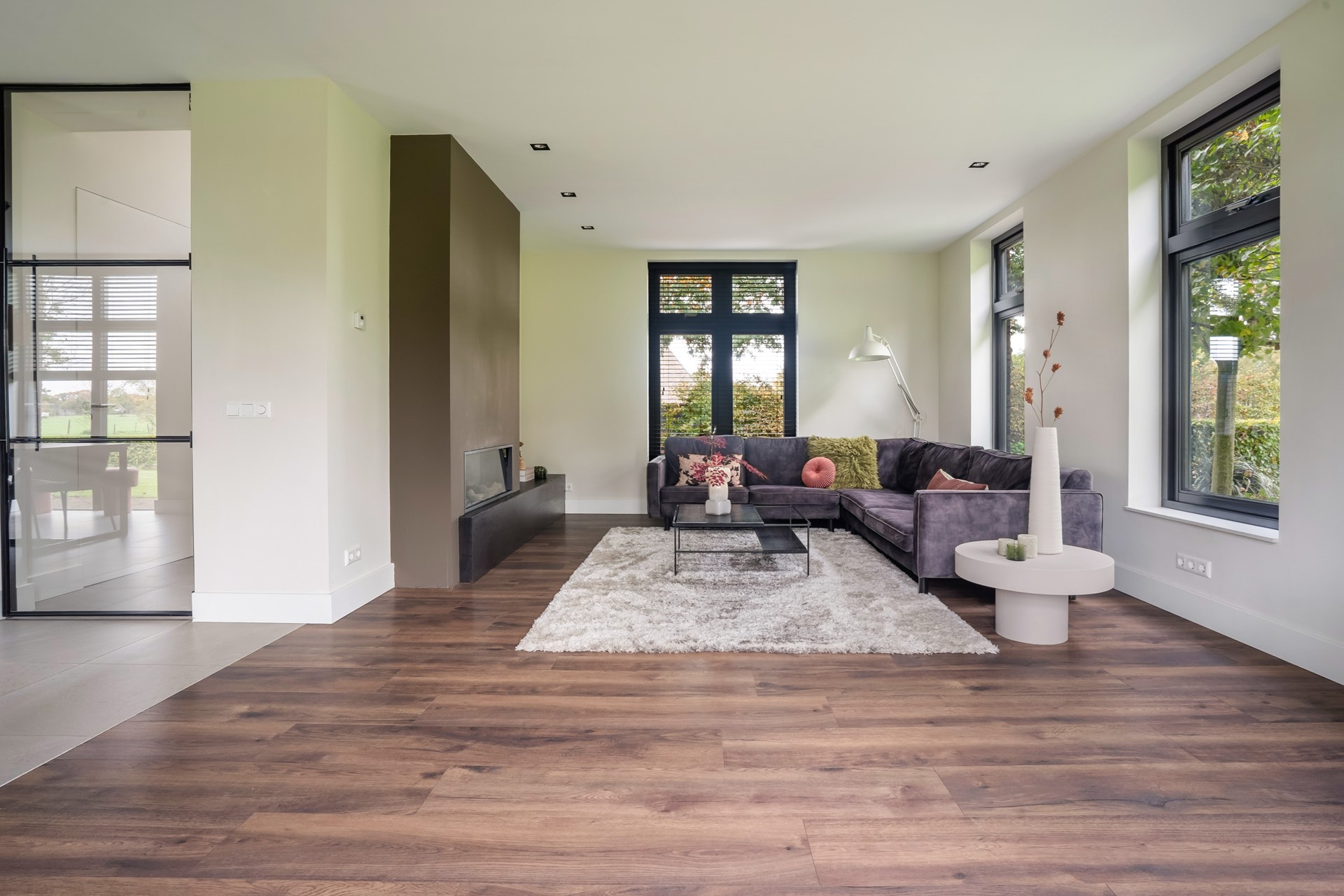Via de entree kom je binnen in de prachtige, strak afgewerkte hal met vide. Deze ruimte geeft toegang tot de trapopgang naar de 1e verdieping, meterkast, toiletruimte (wandcloset en fonteintje) en de woonkamer. Door de stijlvolle stalen deuren stap je de royale woonkamer binnen, waar het gestuukte plafond met inbouwspots zorgt voor een moderne uitstraling. Rondom de gezellige gaskachel is volop ruimte om een sfeervolle zithoek te creëren. In het verlengde van de woonkamer bevindt zich de ruime woonkeuken. Ook hier zorgt een houtkachel voor extra warmte en gezelligheid. De moderne keuken is luxe uitgevoerd met een kookeiland en uitgerust met een inductiekookplaat, afzuigkap, koelkast, vaatwasser en combi-oven. Aan het eiland is bovendien een bar gerealiseerd, perfect voor een kop koffie in de ochtend of een leuk gesprek tijdens het koken. Via openslaande deuren bereik je de serre, waar je het hele jaar door van het buitengevoel kunt genieten. Vanuit de keuken is tevens de bijkeuken bereikbaar. Achter de nette kastenwand zijn hier de cv-installatie (Nefit, 2017) en de aansluitingen voor wasmachine en droger keurig weggewerkt. Vanuit de bijkeuken heb je bovendien directe toegang tot de garage. De gehele begane grond is tot slot strak afgewerkt, voorzien van vloerverwarming en een fraaie plavuizenvloer.