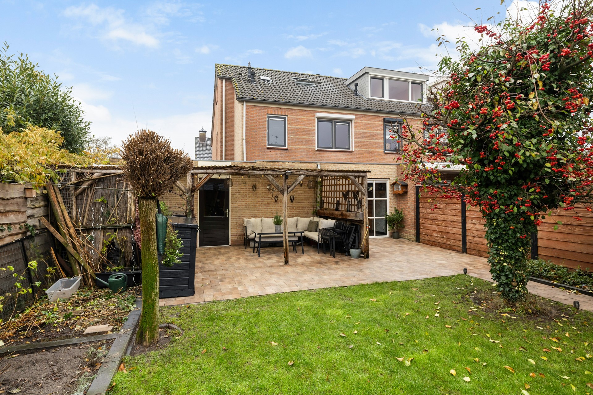 De achtertuin ligt op het zuidwesten en is daarmee een ideale plek om volop van de zon te genieten. De tuin is sfeervol aangelegd met een terras, gazon, mooie borders en een gezellige overkapping. Achterin de tuin staat een praktische berging. De garage biedt extra opbergruimte en op de oprit kun je parkeren op eigen terrein. De woning ligt in een kindvriendelijke buurt met diverse speelplekken en voldoende parkeergelegenheid in de directe omgeving.