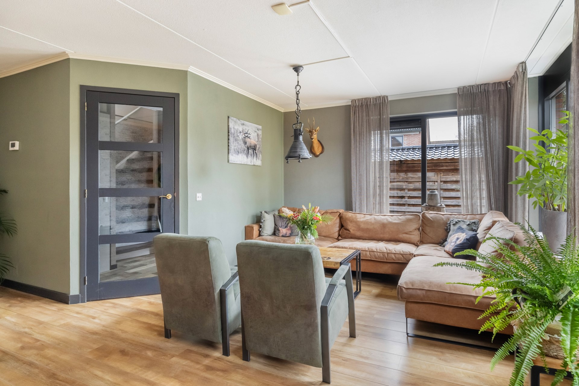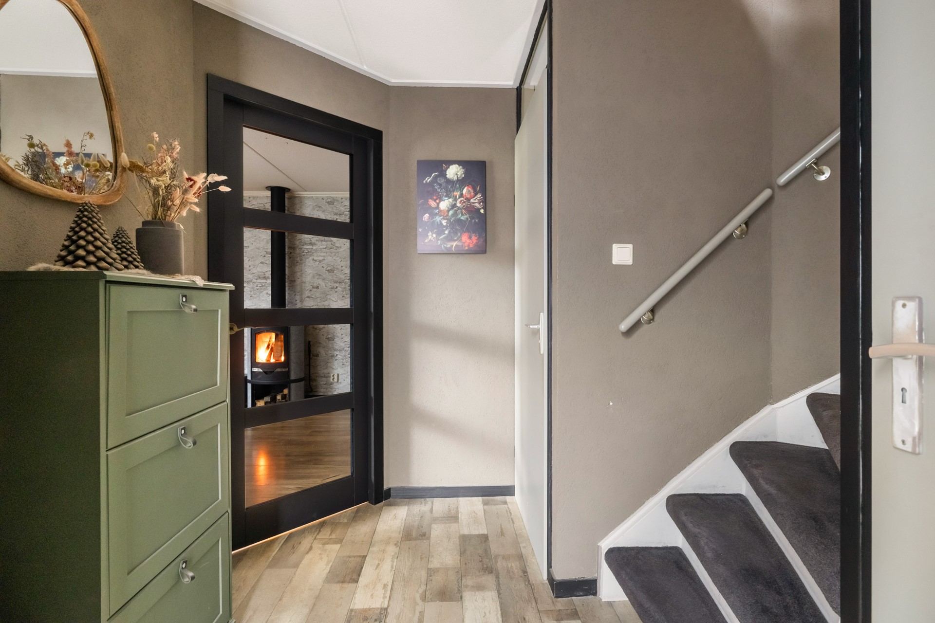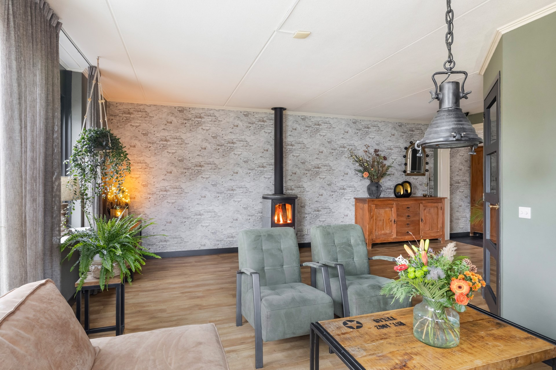 Via de entree kom je in de hal, die toegang biedt tot de toiletruimte met fonteintje, de meterkast, de trapopgang naar de eerste verdieping, een praktische trapkast en natuurlijk de woonkamer. Aan de voorzijde vind je de lichte, sfeervolle woonkamer met houtkachel en een nette laminaatvloer. Je kunt hier eenvoudig meerdere zithoeken creëren en door de grote ramen geniet je van een prettige lichtinval. De aansluitende woonkeuken in hoekopstelling is uitgerust met diverse inbouwapparatuur, waaronder een 5-pits gasfornuis met oven, afzuigkap, koelkast, vriezer en vaatwasser. De plavuizenvloer met vloerverwarming maakt het geheel extra comfortabel. Vanuit de keuken heb je direct toegang tot de garage.