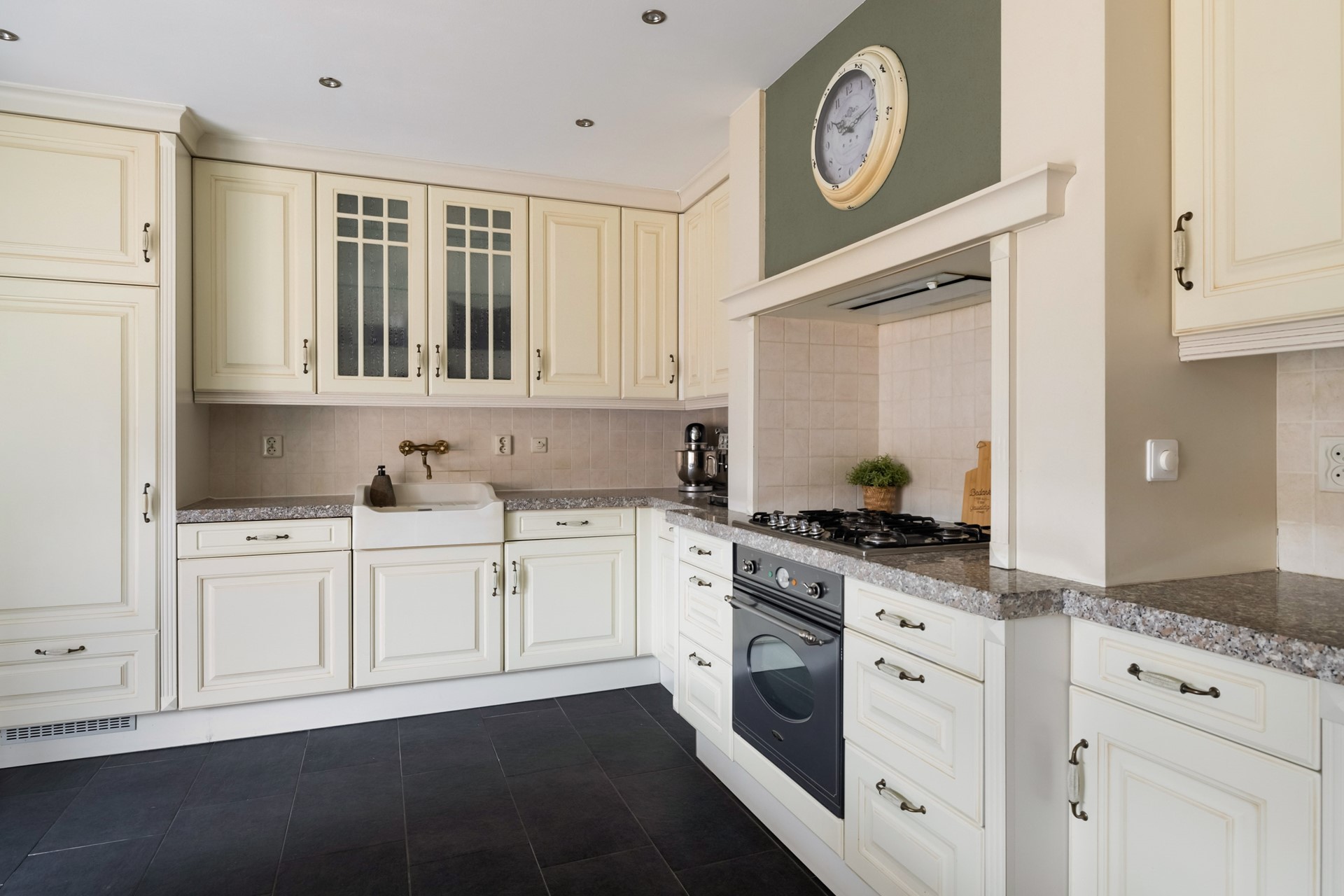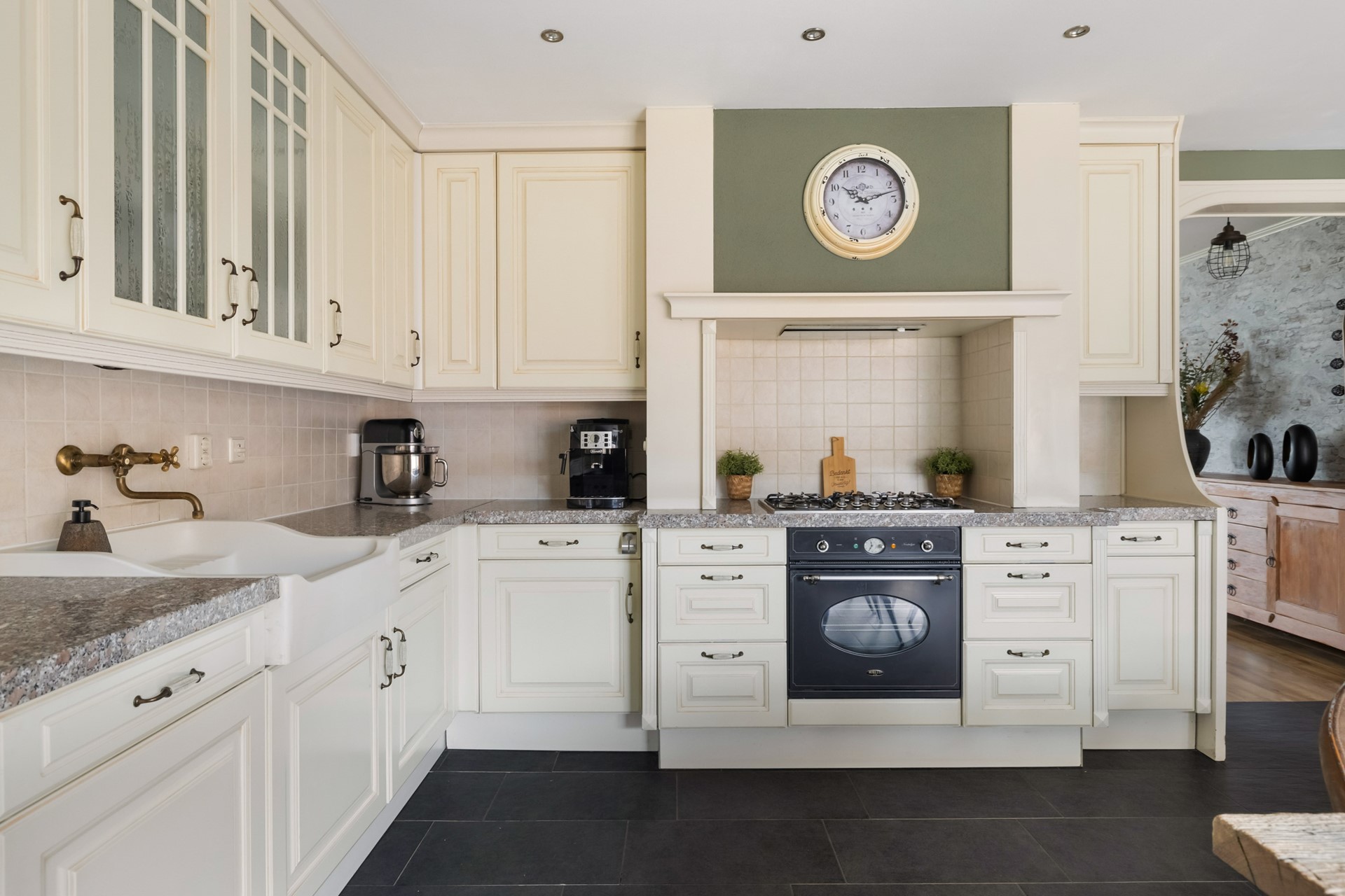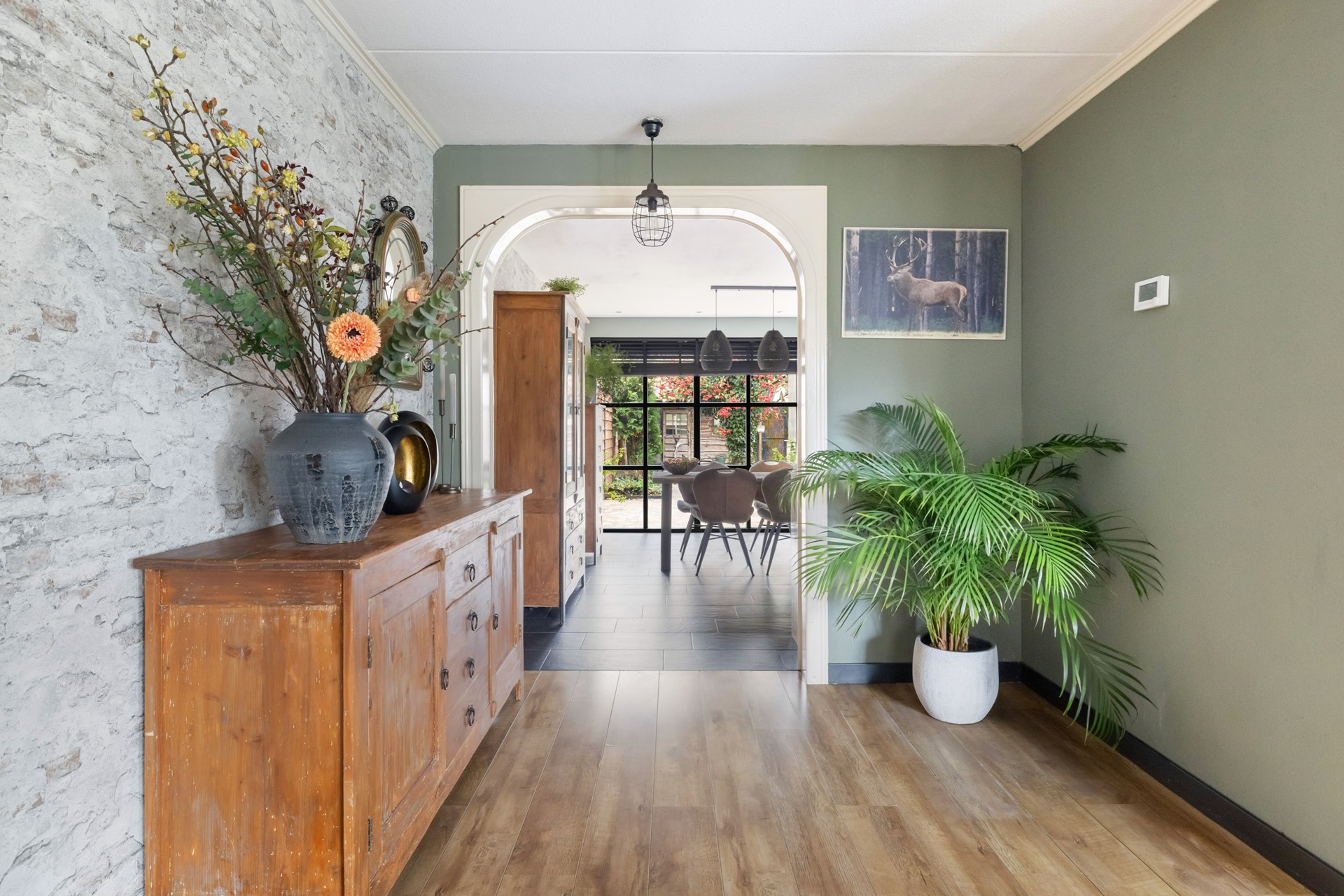 Via de entree kom je in de hal, die toegang biedt tot de toiletruimte met fonteintje, de meterkast, de trapopgang naar de eerste verdieping, een praktische trapkast en natuurlijk de woonkamer. Aan de voorzijde vind je de lichte, sfeervolle woonkamer met houtkachel en een nette laminaatvloer. Je kunt hier eenvoudig meerdere zithoeken creëren en door de grote ramen geniet je van een prettige lichtinval. De aansluitende woonkeuken in hoekopstelling is uitgerust met diverse inbouwapparatuur, waaronder een 5-pits gasfornuis met oven, afzuigkap, koelkast, vriezer en vaatwasser. De plavuizenvloer met vloerverwarming maakt het geheel extra comfortabel. Vanuit de keuken heb je direct toegang tot de garage.