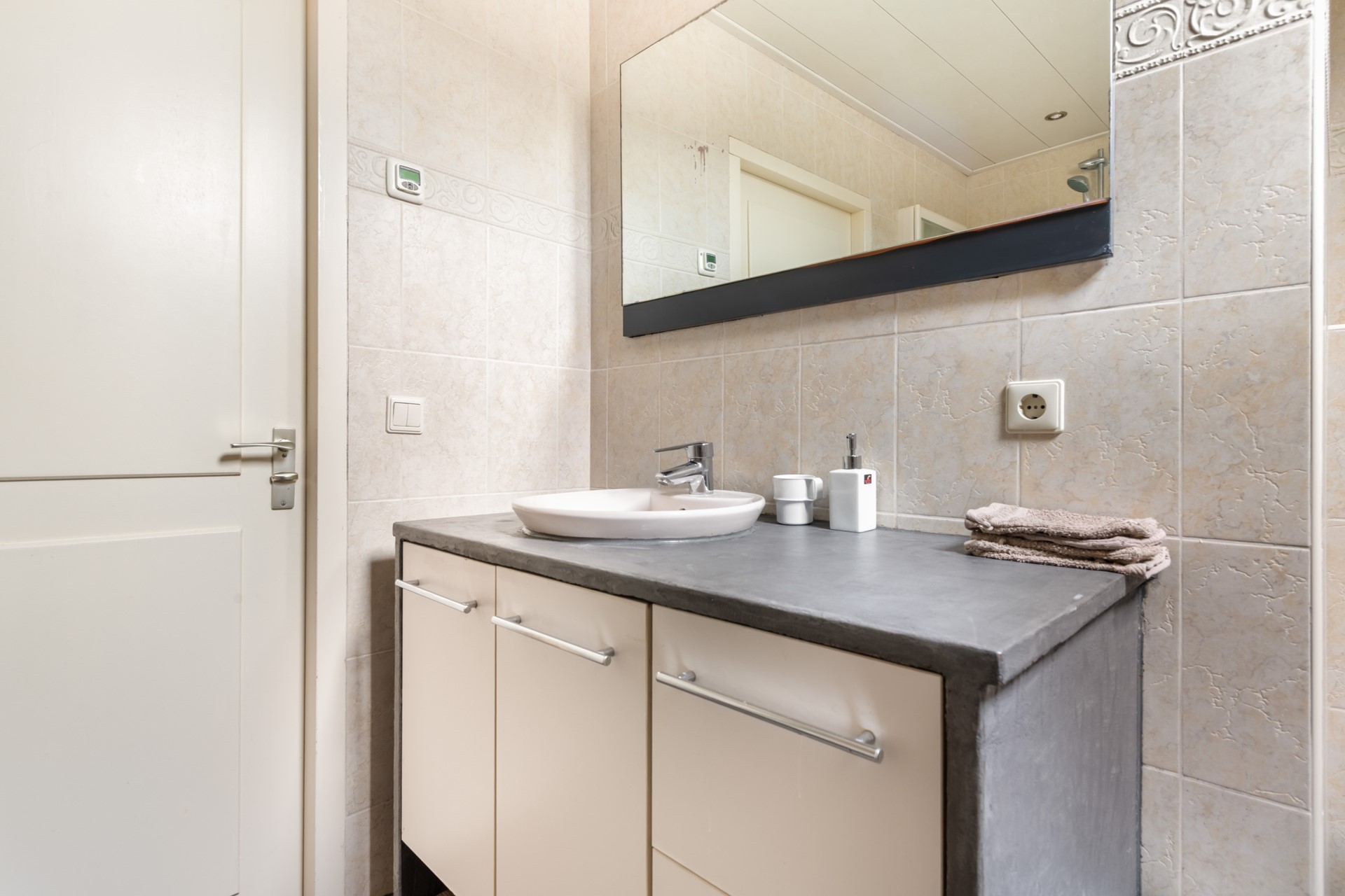Op de bovenverdieping – via een vaste trap bereikbaar - zijn nog eens drie slaapkamers, waarvan twee aan de voorzijde en één aan de achterzijde met een Velux-dakraam. Alle kamers beschikken over handige bergruimte achter de knieschotten. Ook op de overloop zijn vaste kasten aanwezig. De badkamer is volledig betegeld en uitgerust met een douche in bad, toilet, wastafelmeubel en comfortabele vloerverwarming.