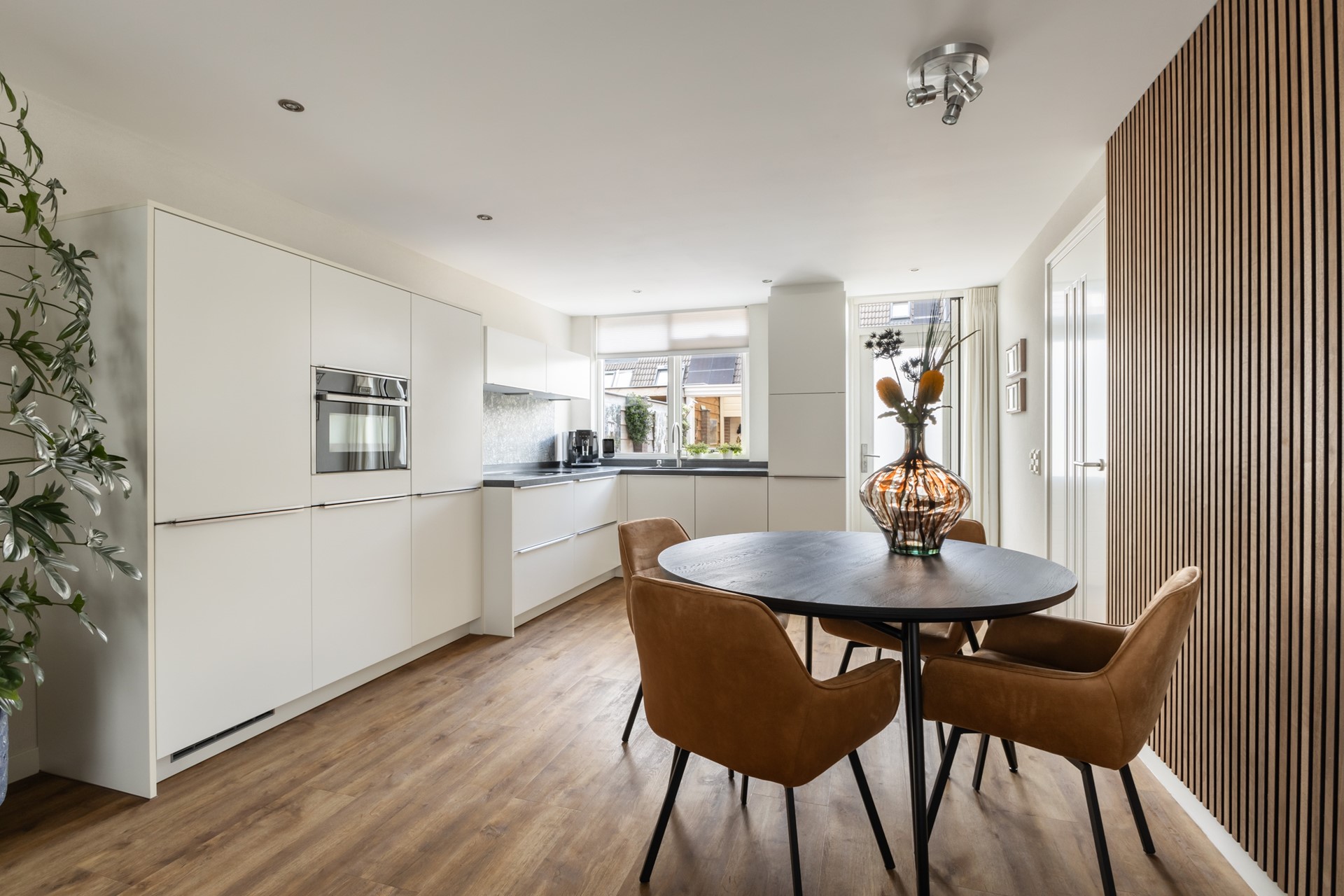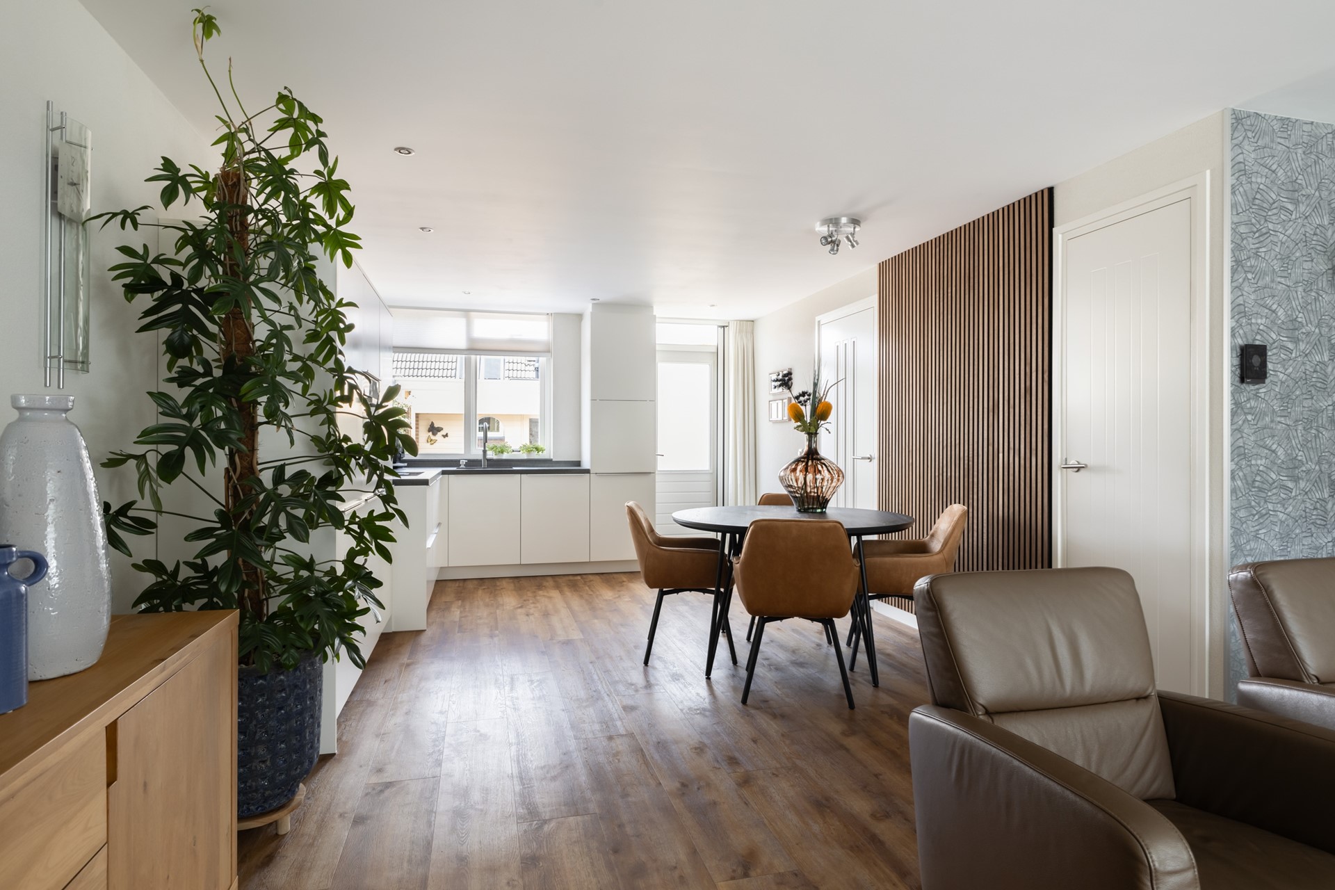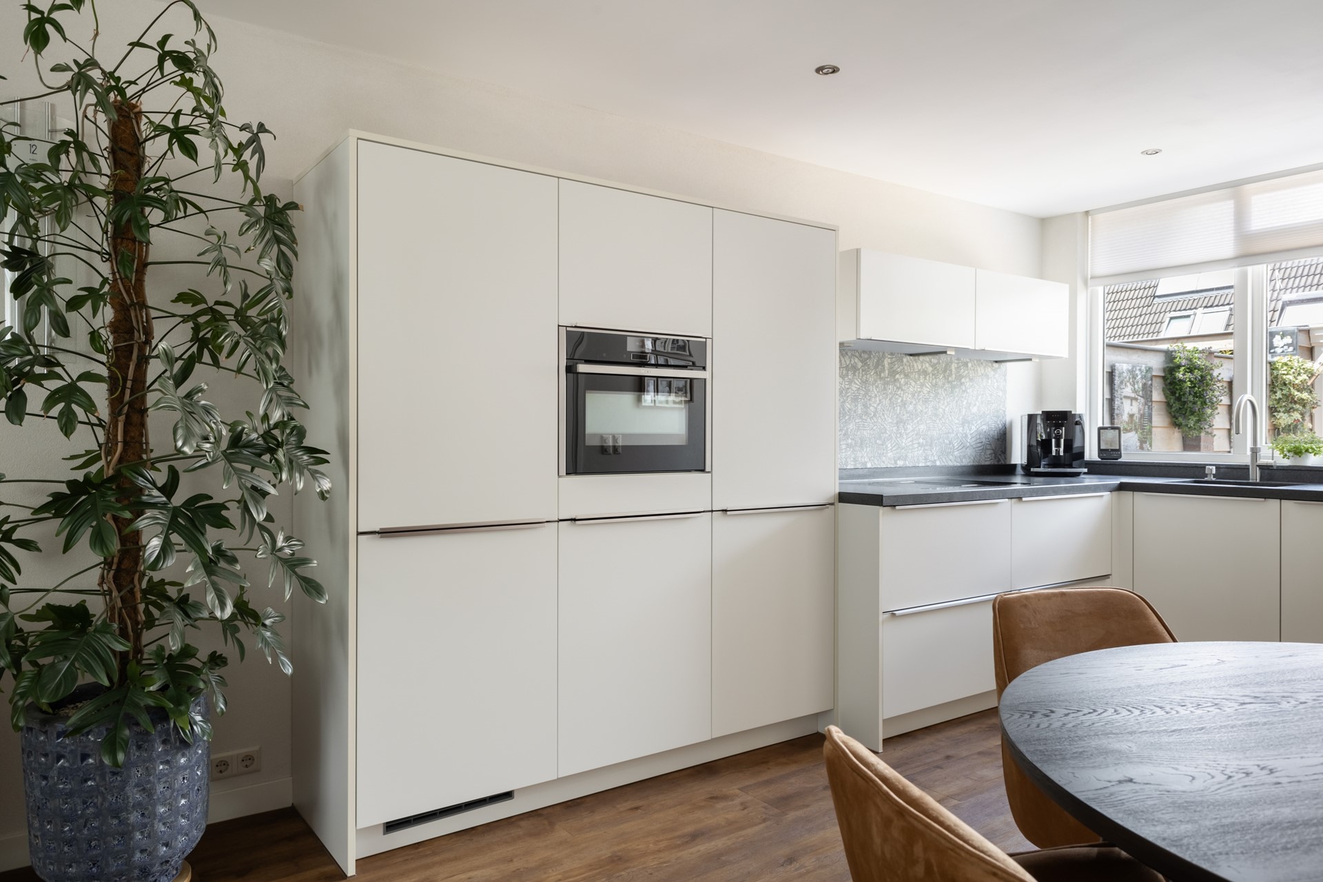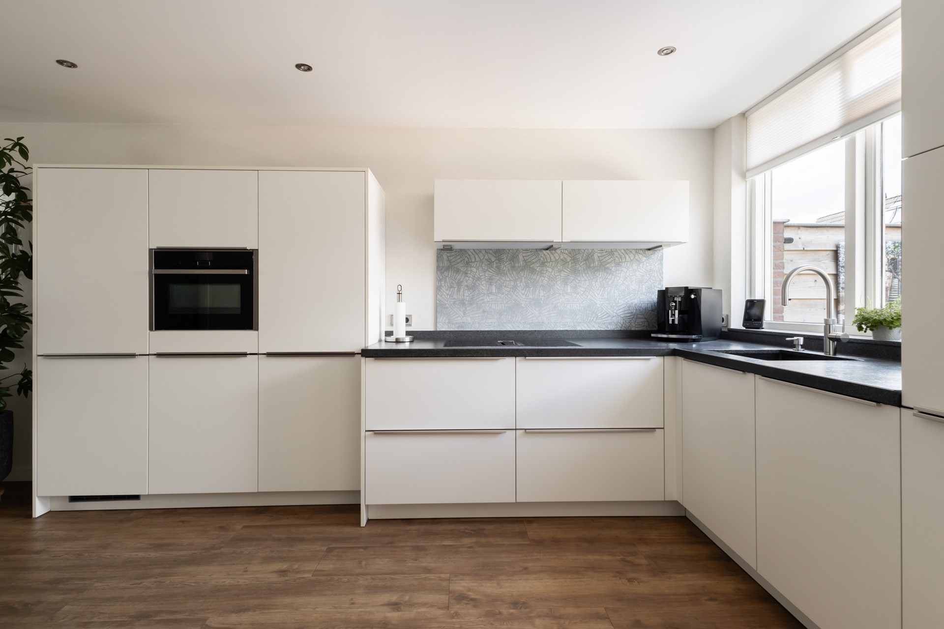 Bij binnenkomst in de woning betreed je de hal, die toegang biedt tot de meterkast (voorzien van glasvezelaansluiting) en de sfeervolle woonkamer. Deze is gesitueerd aan de voorzijde en valt direct op door de erker met elektrisch bedienbare screen – een fijne plek met veel natuurlijk lichtinval. Aan de achterzijde van de woning bevindt zich de moderne open keuken, waar volop ruimte is voor een royale eettafel. Een handige provisiekast zorgt voor extra bergruimte. De luxe keuken in hoekopstelling is afgewerkt met een stijlvol natuurstenen werkblad en beschikt over hoogwaardige inbouwapparatuur, waaronder een inductiekookplaat met geïntegreerde afzuiging, combi-oven, koel-/vriescombinatie, vaatwasser, Quooker en veel kastruimte. Via een tussenportaal zijn de toiletruimte met wandcloset en fonteintje, evenals de trapopgang naar de eerste verdieping, bereikbaar. De gehele begane grond is hoogwaardig afgewerkt met een strak gestuukt plafond inclusief inbouwspots en een fraaie pvc-vloer met comfortabele vloerverwarming. Hier is duidelijk gekozen voor kwaliteit en wooncomfort.