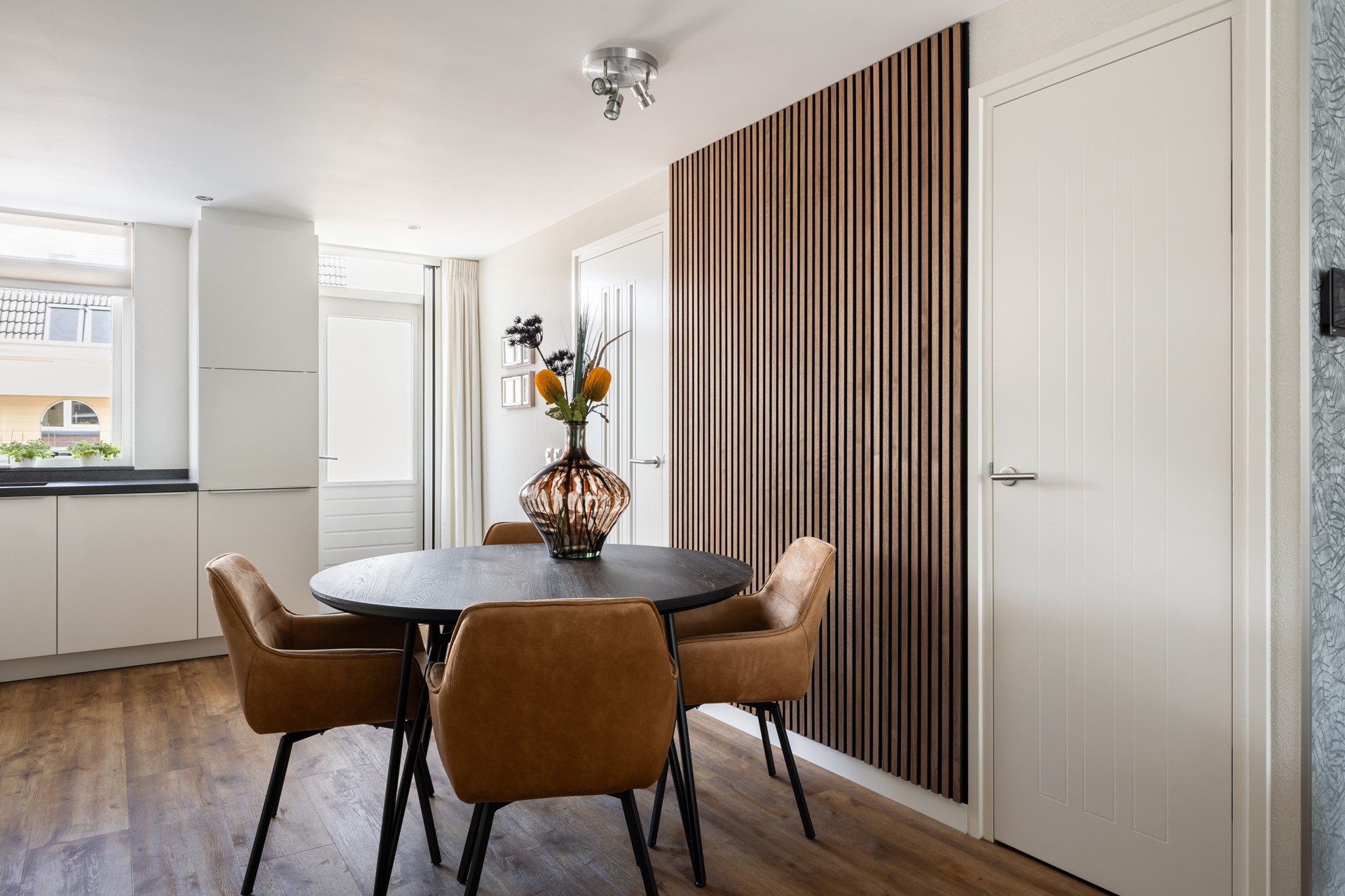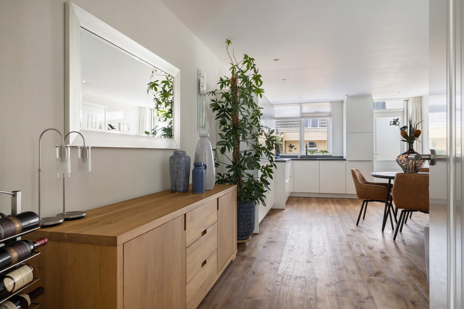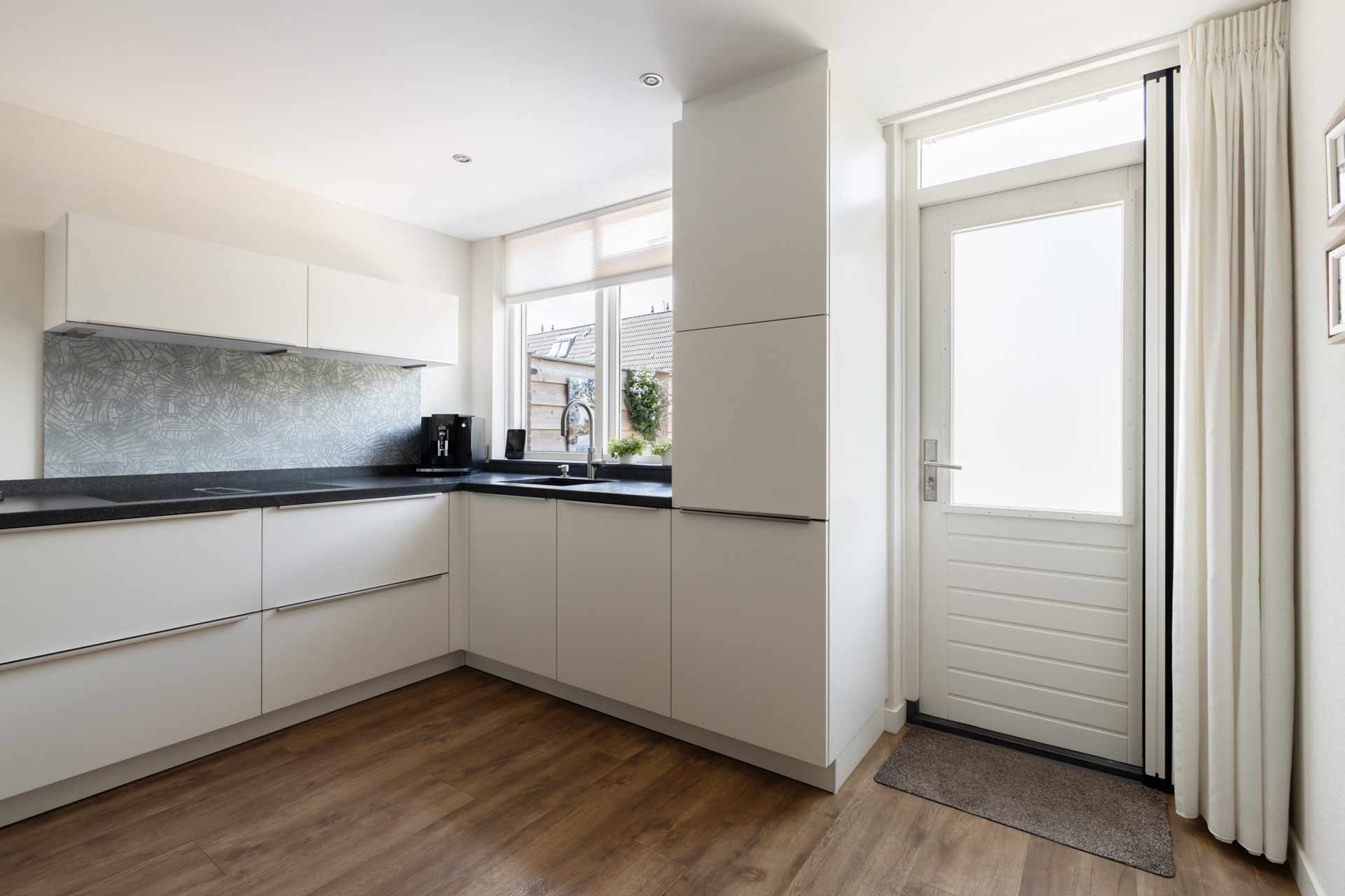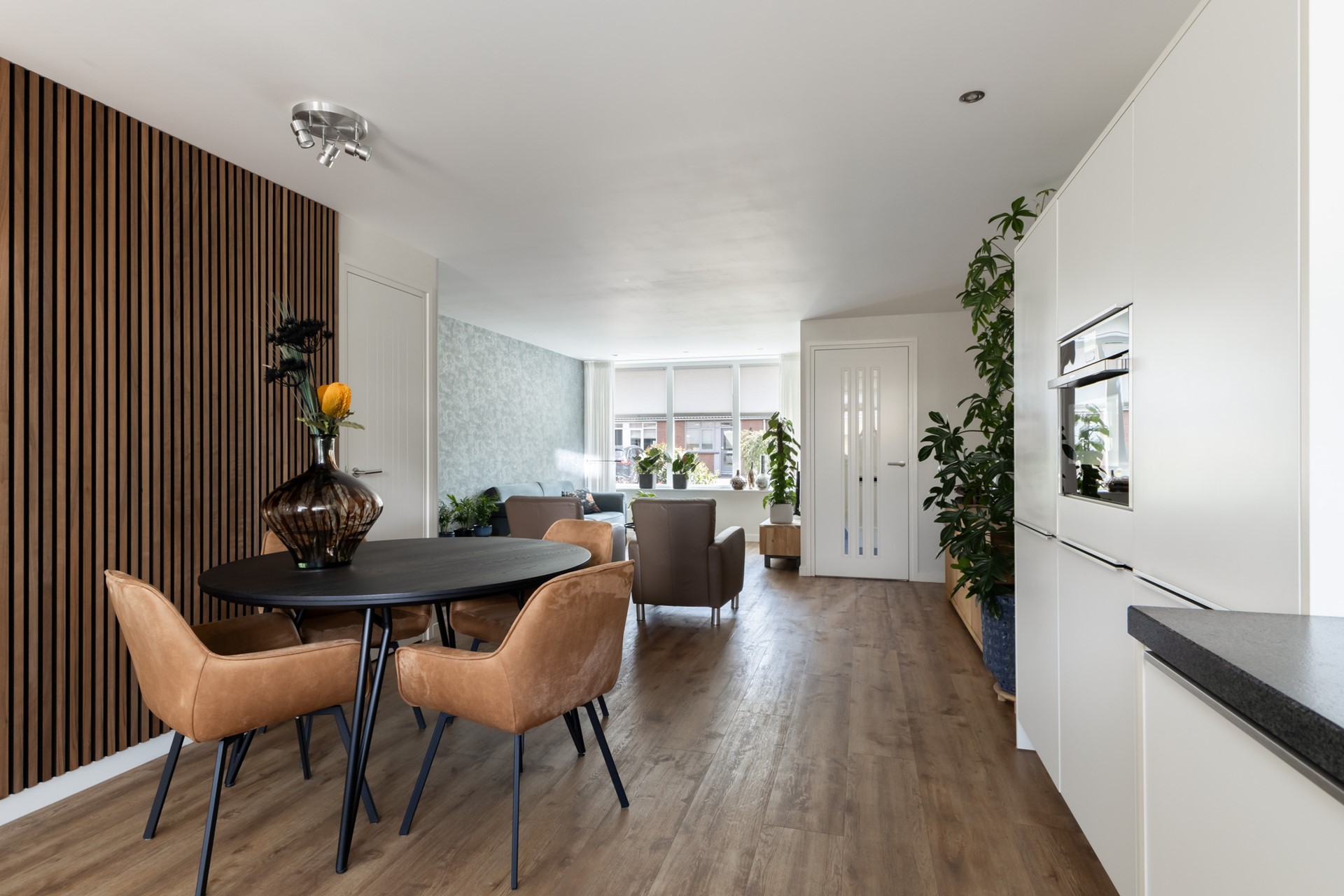 Bij binnenkomst in de woning betreed je de hal, die toegang biedt tot de meterkast (voorzien van glasvezelaansluiting) en de sfeervolle woonkamer. Deze is gesitueerd aan de voorzijde en valt direct op door de erker met elektrisch bedienbare screen – een fijne plek met veel natuurlijk lichtinval. Aan de achterzijde van de woning bevindt zich de moderne open keuken, waar volop ruimte is voor een royale eettafel. Een handige provisiekast zorgt voor extra bergruimte. De luxe keuken in hoekopstelling is afgewerkt met een stijlvol natuurstenen werkblad en beschikt over hoogwaardige inbouwapparatuur, waaronder een inductiekookplaat met geïntegreerde afzuiging, combi-oven, koel-/vriescombinatie, vaatwasser, Quooker en veel kastruimte. Via een tussenportaal zijn de toiletruimte met wandcloset en fonteintje, evenals de trapopgang naar de eerste verdieping, bereikbaar. De gehele begane grond is hoogwaardig afgewerkt met een strak gestuukt plafond inclusief inbouwspots en een fraaie pvc-vloer met comfortabele vloerverwarming. Hier is duidelijk gekozen voor kwaliteit en wooncomfort.