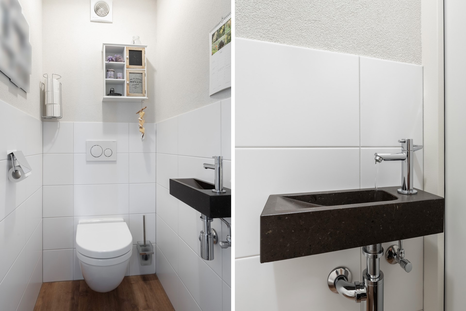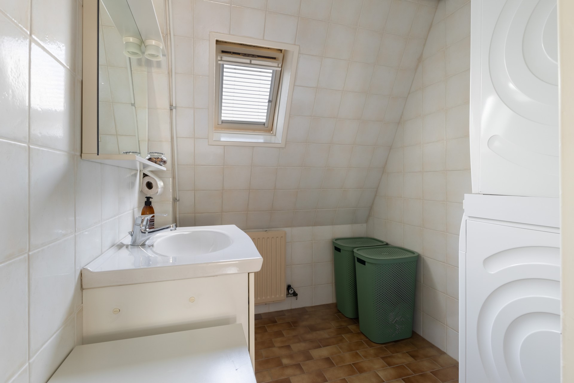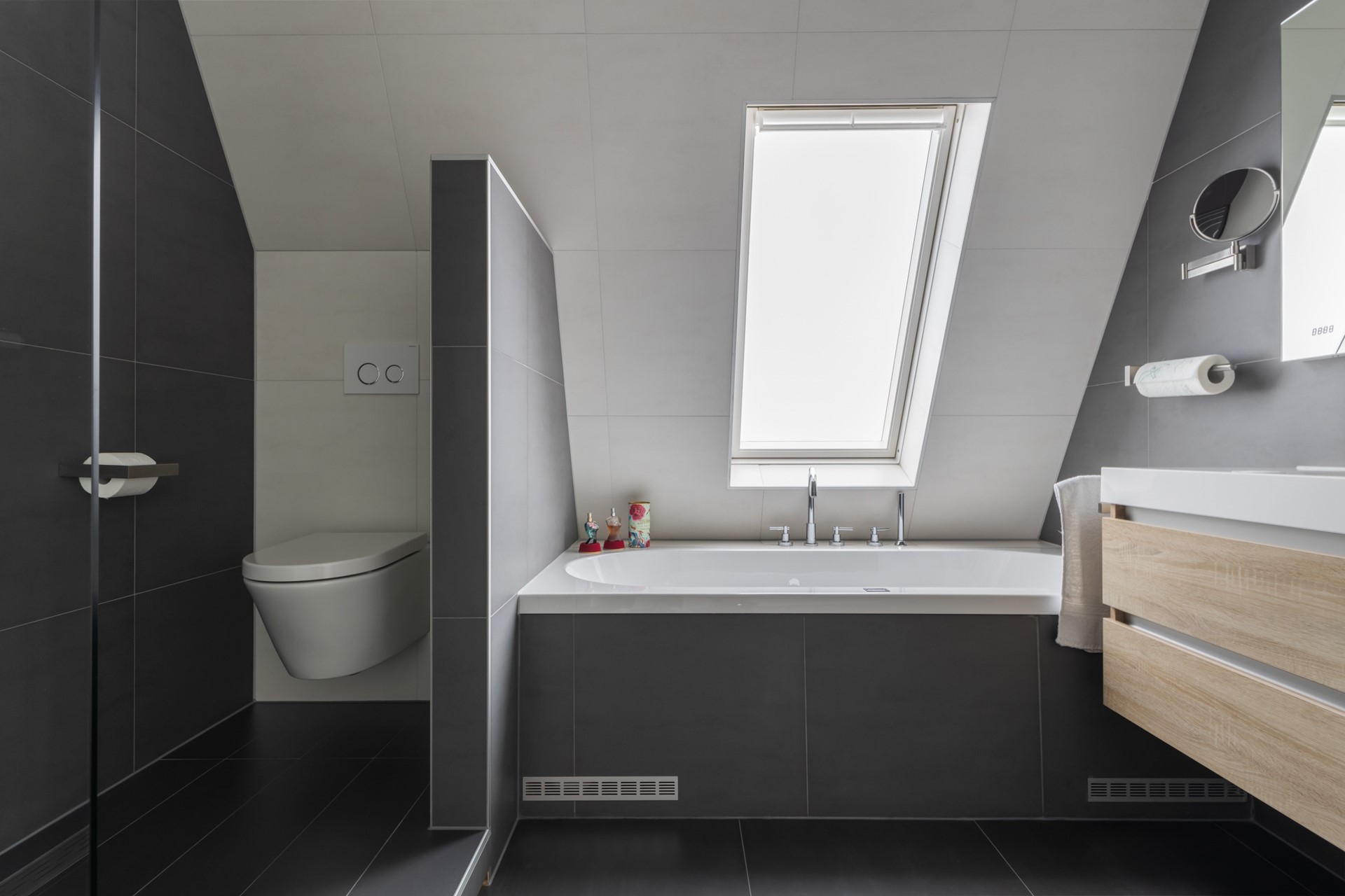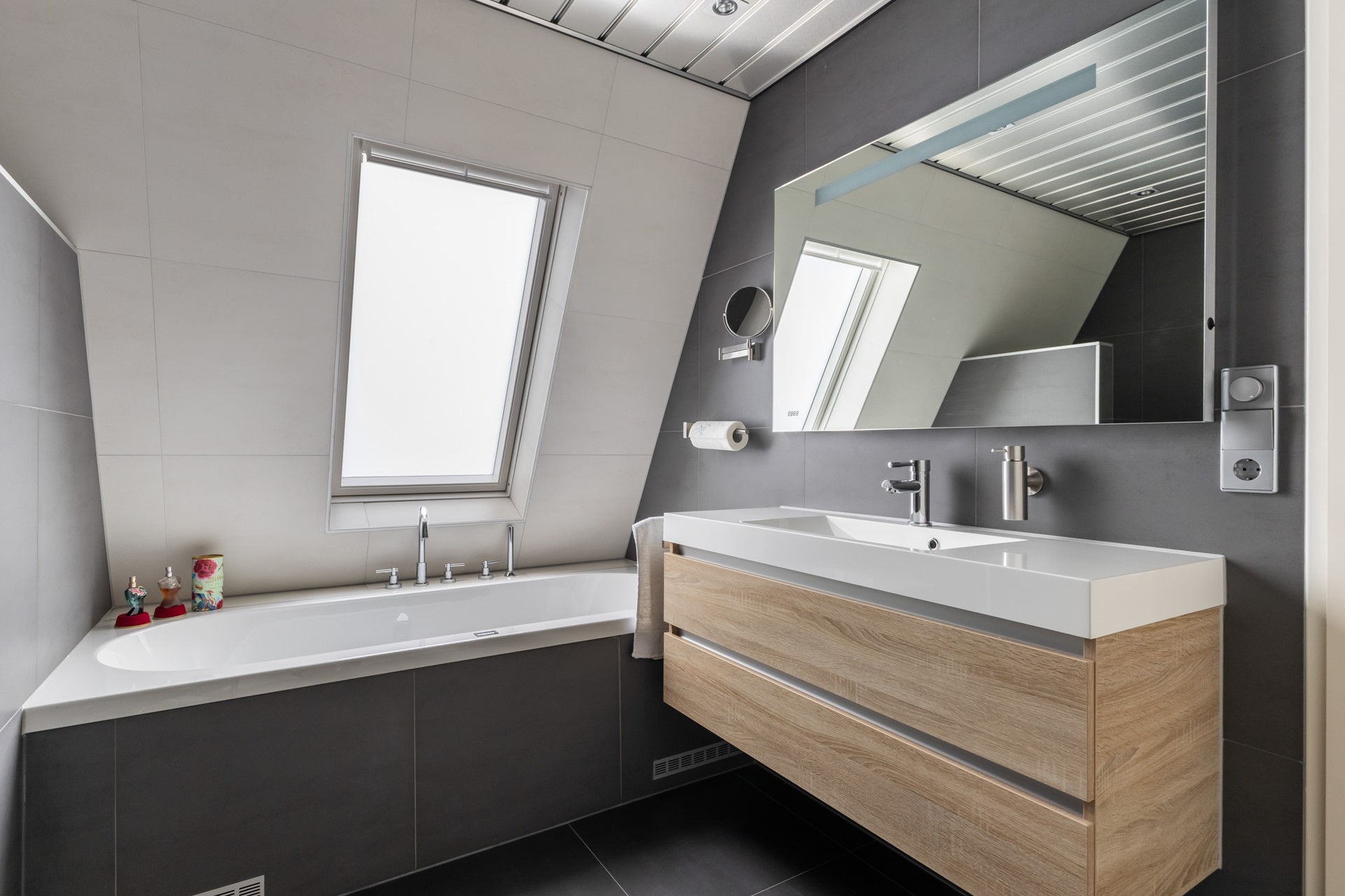Via een vaste trap bereik je de eerste verdieping. De overloop biedt toegang tot twee slaapkamers, een wasruimte en de luxe badkamer. Aan de achterzijde van de woning bevinden zich de badkamer en de wasruimte. De modern afgewerkte badkamer is volledig betegeld en uitgerust met comfortabele vloerverwarming, een inloopdouche, Whirlpool-ligbad, een groot wastafelmeubel, een wandcloset en een stijlvol aluminium plafond met inbouwspots. Direct naast de badkamer bevindt zich de voormalige badkamer, nu ingericht als praktische wasruimte met een wastafelmeubel en aansluitingen voor wasmachine en droger. Aan de voorzijde liggen twee nette slaapkamers, beide voorzien van een laminaatvloer en een Velux-dakraam, wat zorgt voor veel daglicht.