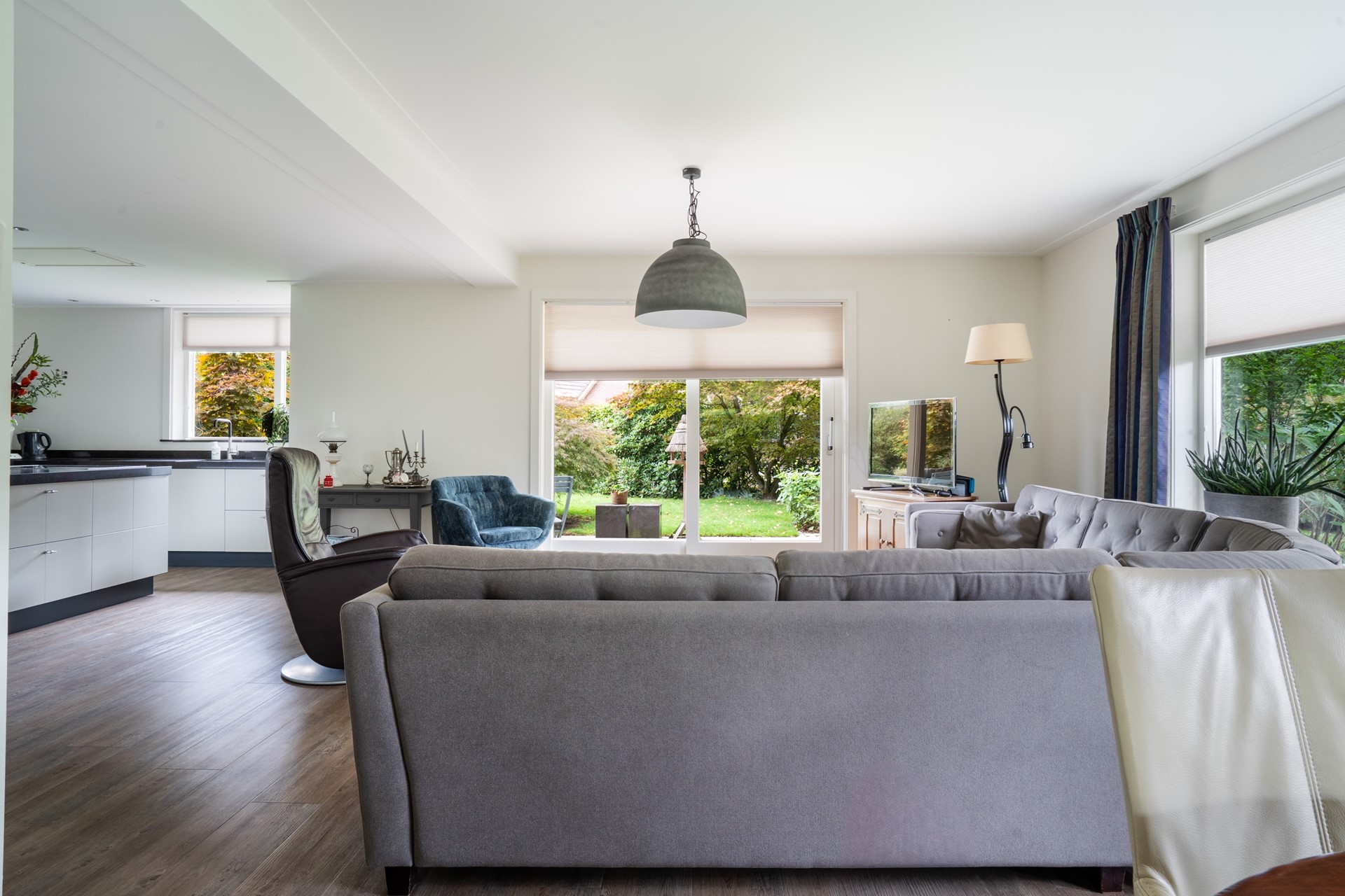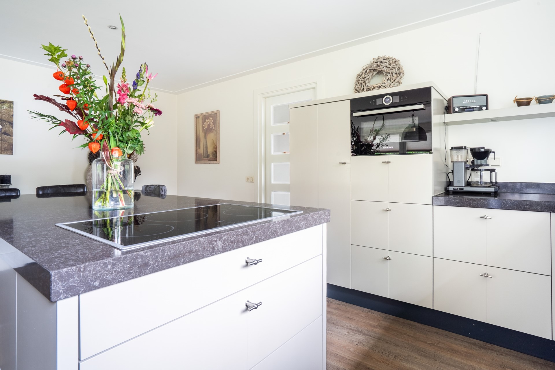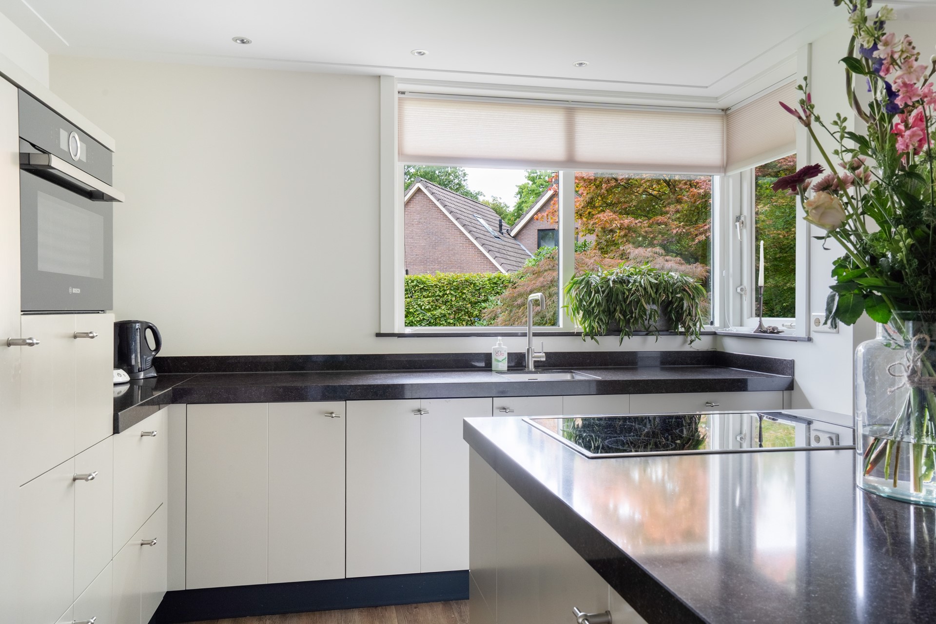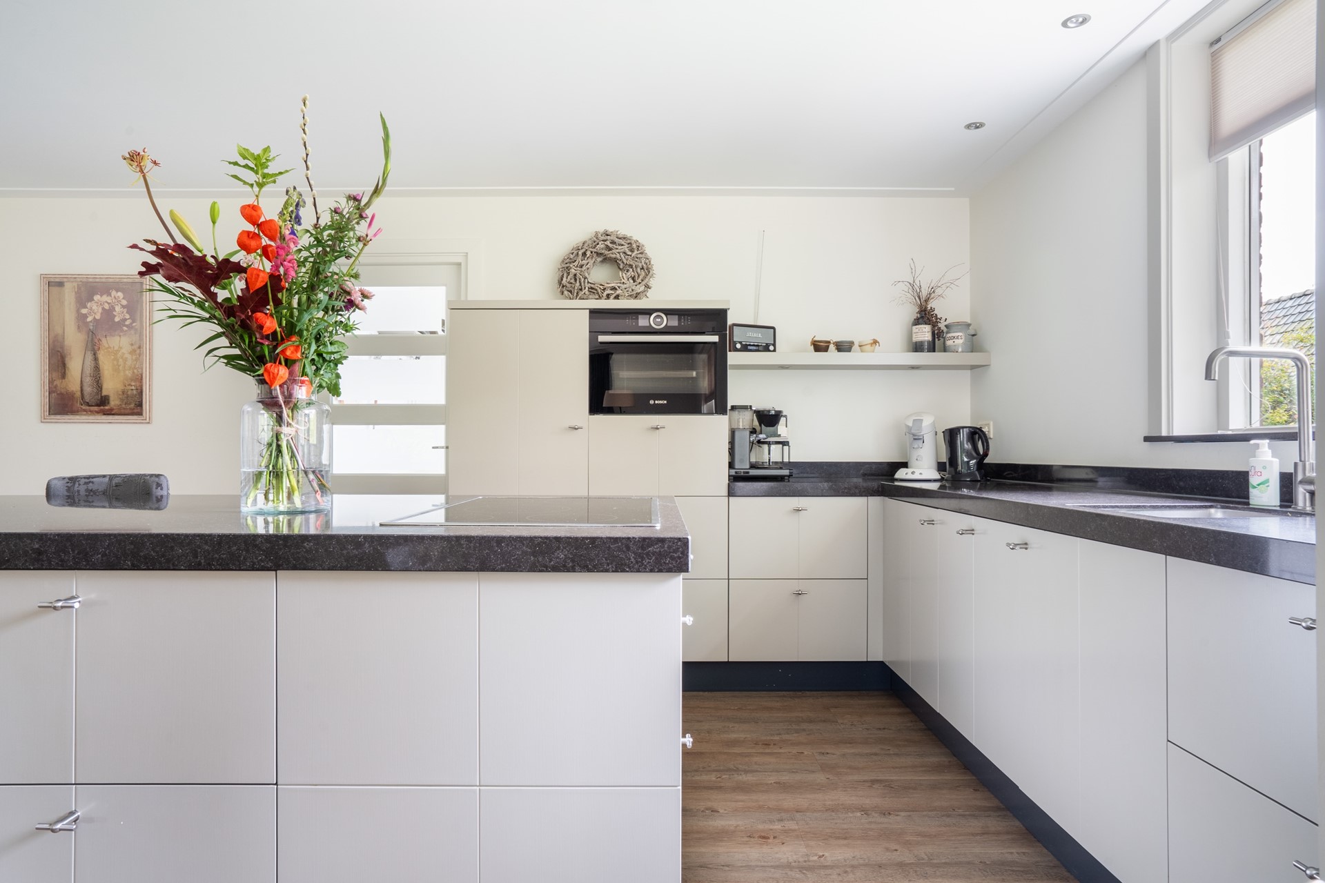 Via de overdekte entree kom je binnen in de hal, die toegang geeft tot de toiletruimte met wandcloset en fontein, de meterkast met glasvezelaansluiting, de slaapkamer en de woonkamer. De royale L-vormige woonkamer is een fijne, lichte leefruimte waar je een gezellige zit- en eethoek kunt creëren met prachtig uitzicht op de tuin. Dankzij de schuifpui stap je bovendien direct naar buiten, waardoor binnen en buiten naadloos in elkaar overlopen. In open verbinding met de woonkamer bevindt zich de moderne woonkeuken met kookeiland. Deze keuken is van alle gemakken voorzien en uitgerust met diverse inbouwapparatuur, waaronder een inductiekookplaat, afzuigkap, koelkast en een stoomoven. Een fijne keuken voor wie graag kookt. Aangrenzend aan de keuken bevindt zich de bijkeuken. Deze praktische ruimte is voorzien van een vaste kastenwand en biedt plek voor de wasmachine en droger. De ruime slaapkamer op de begane grond maakt gelijkvloers wonen mogelijk. De aangrenzende, geheel betegelde badkamer is voorzien van een douche en een wastafelmeubel. De gehele begane grond is keurig afgewerkt met een gestuukt plafond, vloerverwarming (m.u.v. de slaapkamer) en een onderhoudsvriendelijke PVC-vloer.