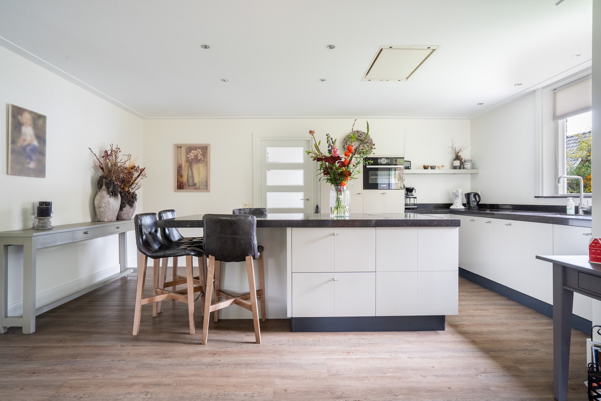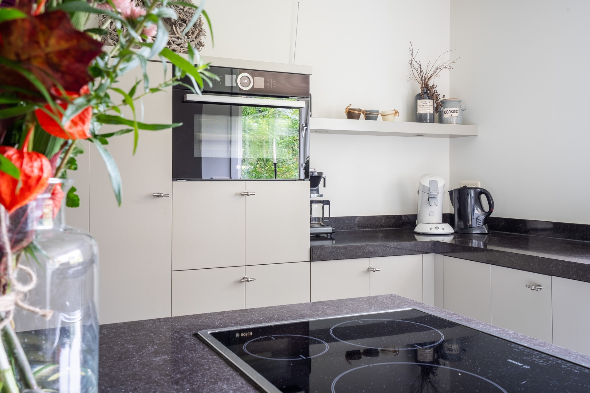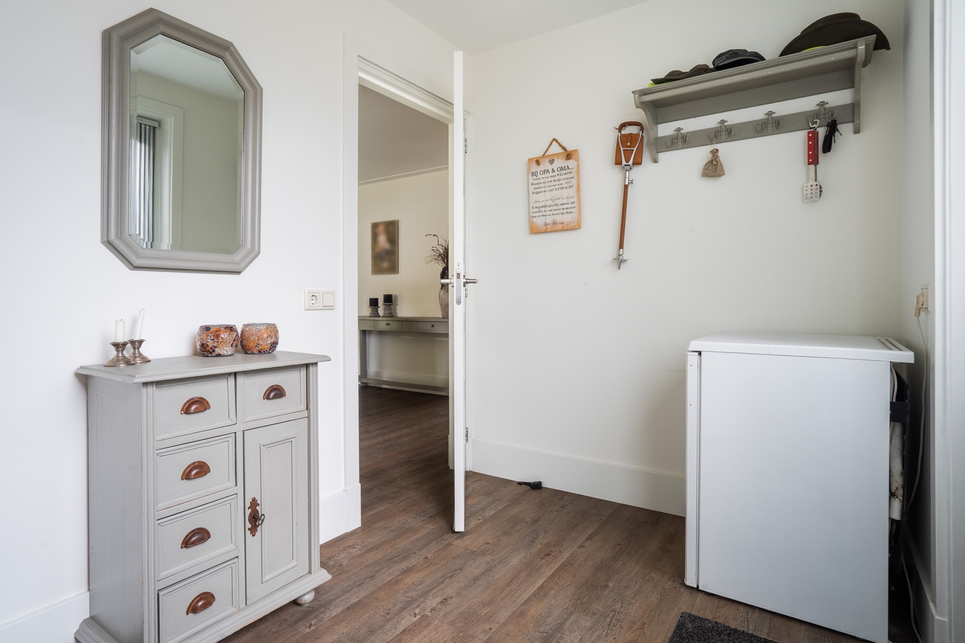 Via de overdekte entree kom je binnen in de hal, die toegang geeft tot de toiletruimte met wandcloset en fontein, de meterkast met glasvezelaansluiting, de slaapkamer en de woonkamer. De royale L-vormige woonkamer is een fijne, lichte leefruimte waar je een gezellige zit- en eethoek kunt creëren met prachtig uitzicht op de tuin. Dankzij de schuifpui stap je bovendien direct naar buiten, waardoor binnen en buiten naadloos in elkaar overlopen. In open verbinding met de woonkamer bevindt zich de moderne woonkeuken met kookeiland. Deze keuken is van alle gemakken voorzien en uitgerust met diverse inbouwapparatuur, waaronder een inductiekookplaat, afzuigkap, koelkast en een stoomoven. Een fijne keuken voor wie graag kookt. Aangrenzend aan de keuken bevindt zich de bijkeuken. Deze praktische ruimte is voorzien van een vaste kastenwand en biedt plek voor de wasmachine en droger. De ruime slaapkamer op de begane grond maakt gelijkvloers wonen mogelijk. De aangrenzende, geheel betegelde badkamer is voorzien van een douche en een wastafelmeubel. De gehele begane grond is keurig afgewerkt met een gestuukt plafond, vloerverwarming (m.u.v. de slaapkamer) en een onderhoudsvriendelijke PVC-vloer.