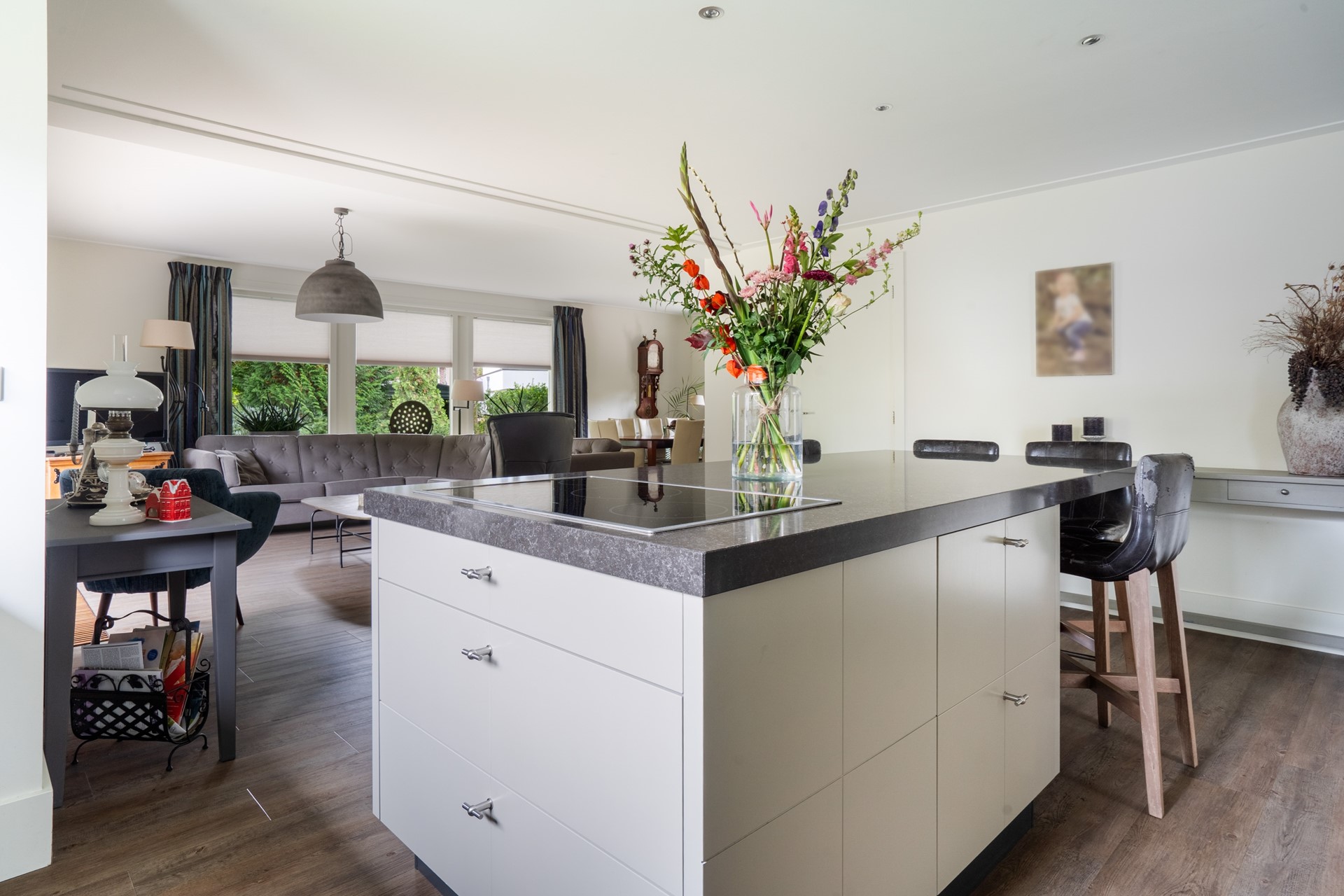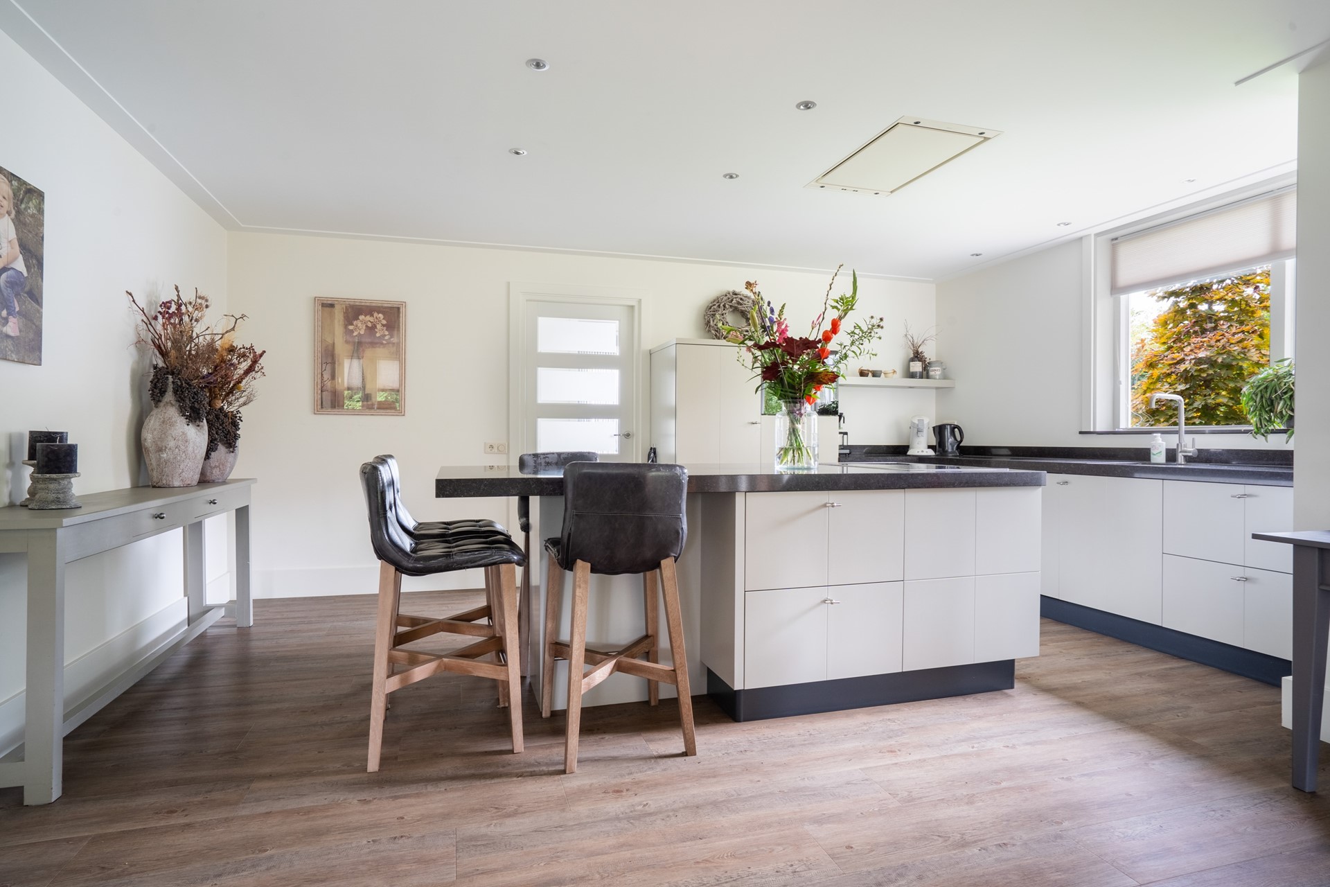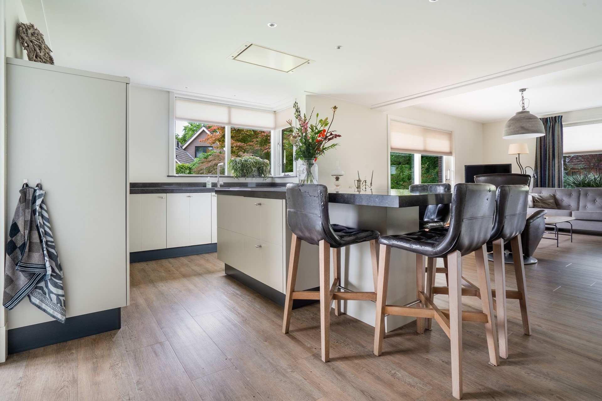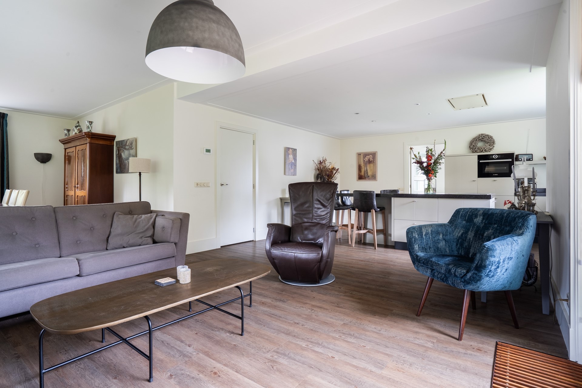 Via de overdekte entree kom je binnen in de hal, die toegang geeft tot de toiletruimte met wandcloset en fontein, de meterkast met glasvezelaansluiting, de slaapkamer en de woonkamer. De royale L-vormige woonkamer is een fijne, lichte leefruimte waar je een gezellige zit- en eethoek kunt creëren met prachtig uitzicht op de tuin. Dankzij de schuifpui stap je bovendien direct naar buiten, waardoor binnen en buiten naadloos in elkaar overlopen. In open verbinding met de woonkamer bevindt zich de moderne woonkeuken met kookeiland. Deze keuken is van alle gemakken voorzien en uitgerust met diverse inbouwapparatuur, waaronder een inductiekookplaat, afzuigkap, koelkast en een stoomoven. Een fijne keuken voor wie graag kookt. Aangrenzend aan de keuken bevindt zich de bijkeuken. Deze praktische ruimte is voorzien van een vaste kastenwand en biedt plek voor de wasmachine en droger. De ruime slaapkamer op de begane grond maakt gelijkvloers wonen mogelijk. De aangrenzende, geheel betegelde badkamer is voorzien van een douche en een wastafelmeubel. De gehele begane grond is keurig afgewerkt met een gestuukt plafond, vloerverwarming (m.u.v. de slaapkamer) en een onderhoudsvriendelijke PVC-vloer.