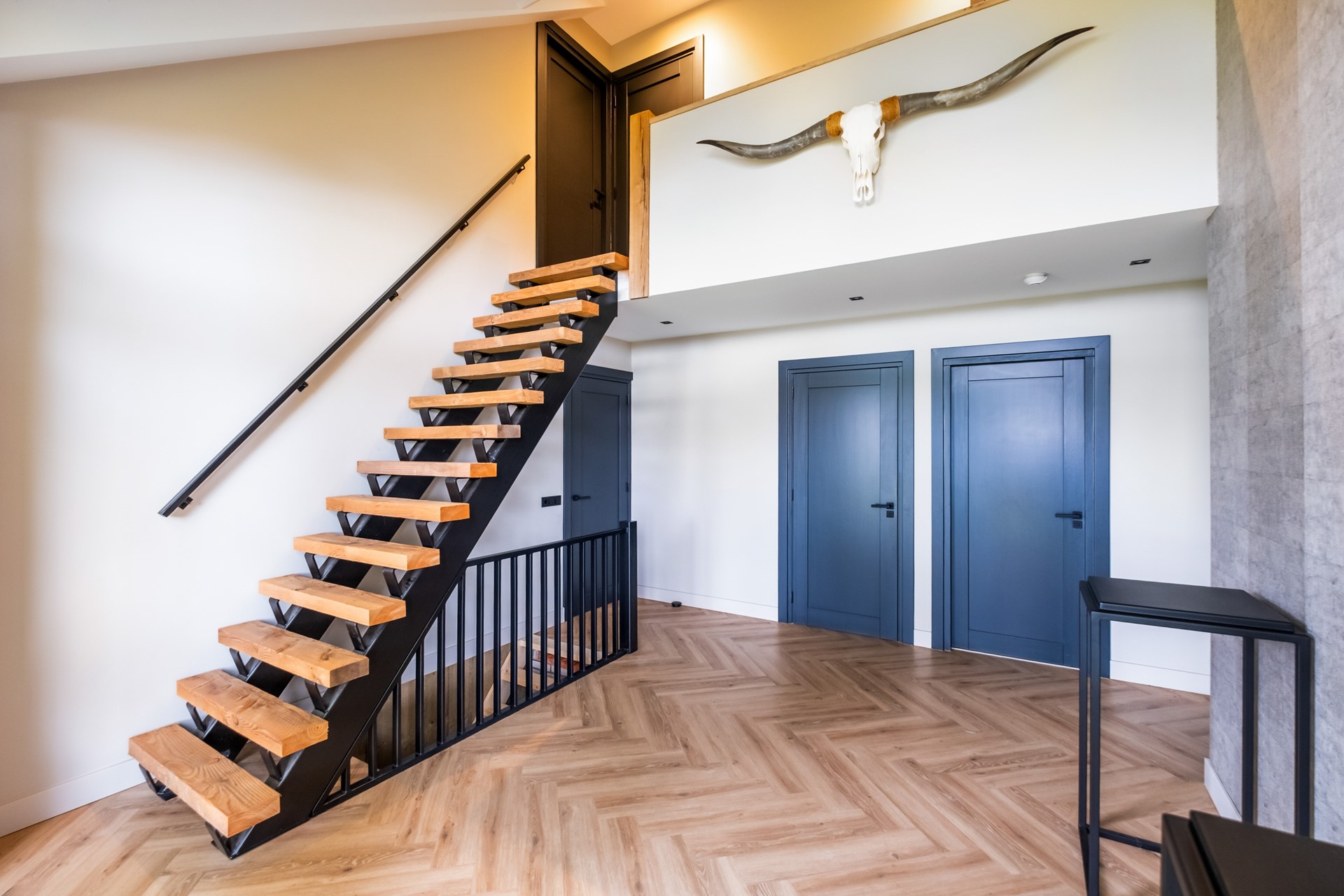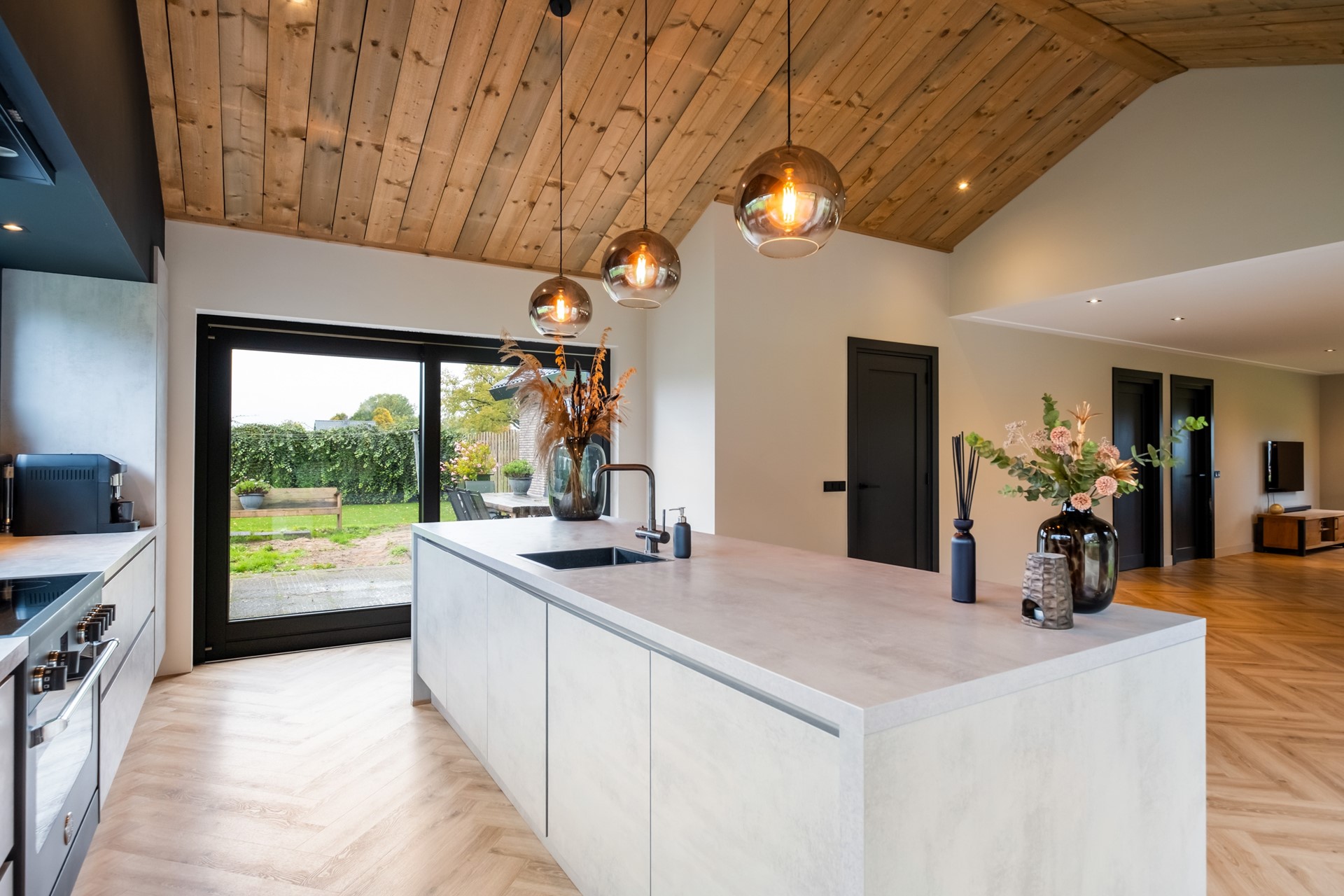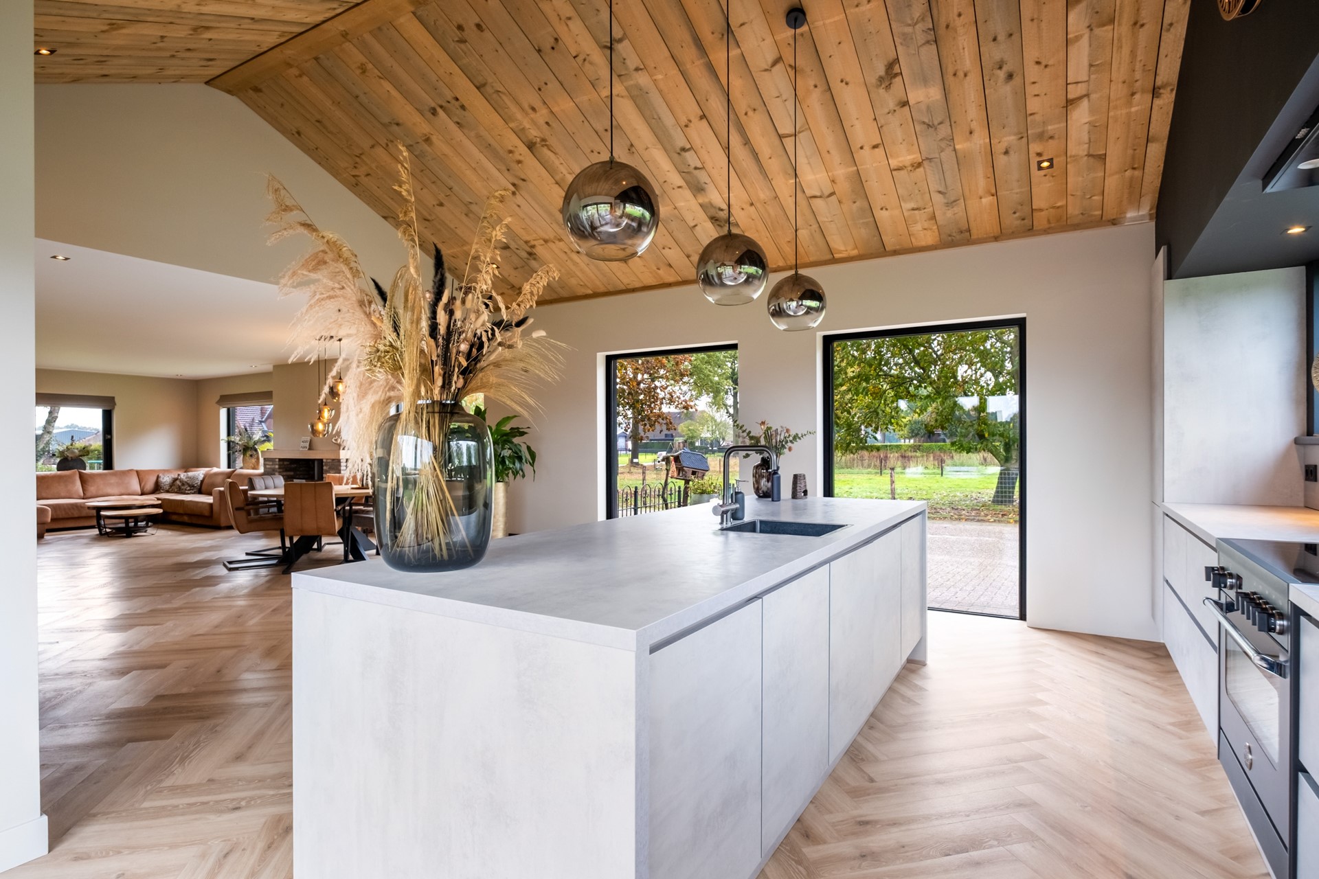 De royale entree aan de voorzijde, voorzien van een vide, geeft toegang tot de trapopgang naar de eerste verdieping, de trapneergang naar het souterrain, drie slaapkamers, de badkamer, de toiletruimte met wandcloset en fontein en de woonkamer. De woonkamer is afgewerkt met strak gestucte wanden, een pvc-vloer en een gezellige houtkachel. De open woonkeuken is in rechte opstelling met een spoeleiland en voorzien van een inductiekookplaat met oven, afzuigkap, koelkast, vriezer, vaatwasser en Quooker. Via de schuifpui is er een directe verbinding met de tuin. In deze leefruimte bevindt zich tevens een berging met de meterkast, glasvezelaansluiting, elektrische boiler en de cv-installatie (Intergas 2023). Daarnaast biedt een achterportaal een extra toegang tot de tuin.