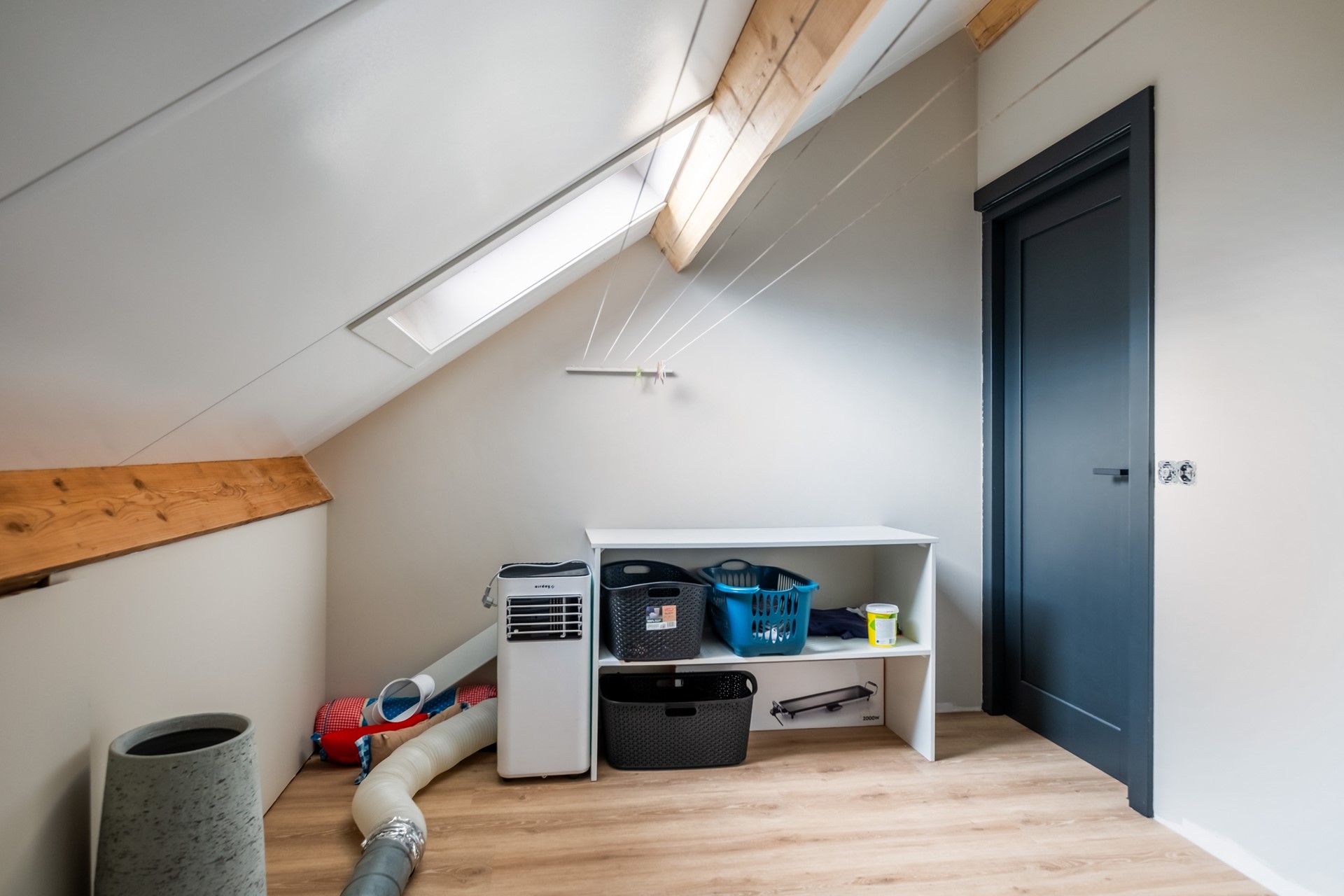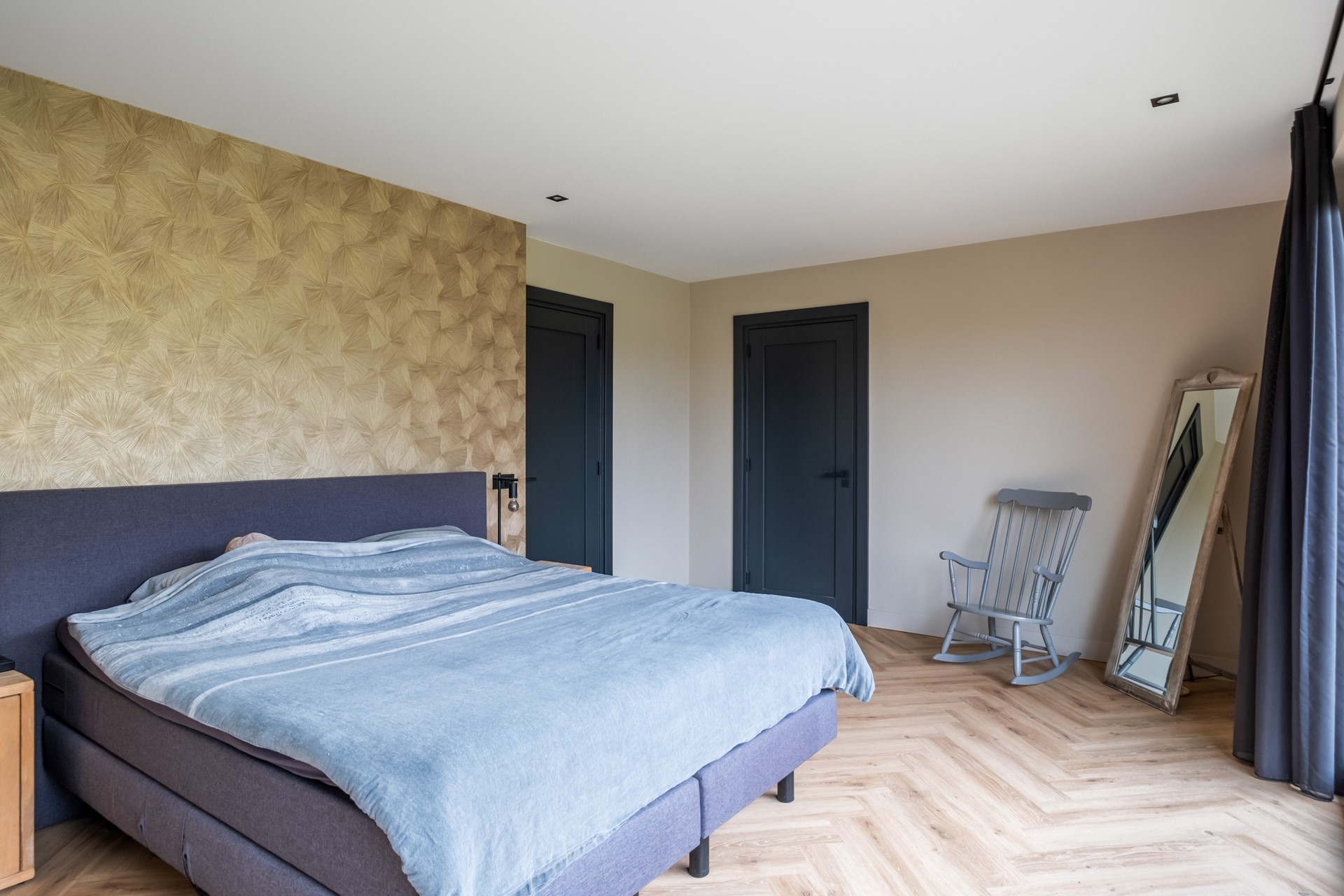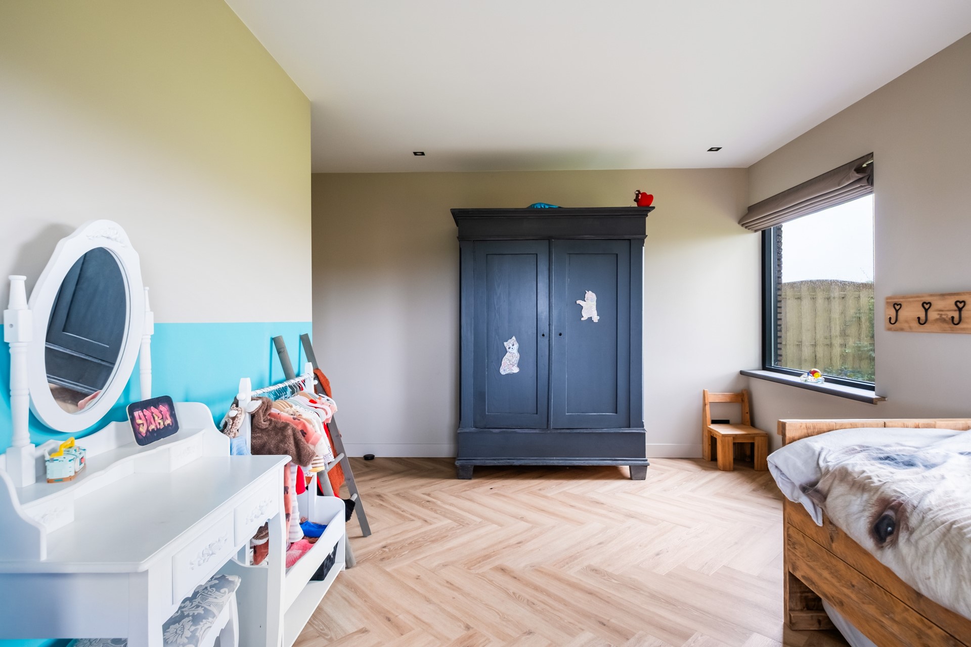 Via de vaste trap bereik je de overloop op de eerste verdieping, die toegang biedt tot twee slaapkamers, een wasruimte en een toiletruimte met wandcloset en fontein. Beide slaapkamers zijn ruim opgezet en bieden voldoende mogelijkheden om te slapen, studeren of ontspannen, bijvoorbeeld voor oudere kinderen. De wasruimte is praktisch ingericht met aansluitingen voor wasmachine en droger.