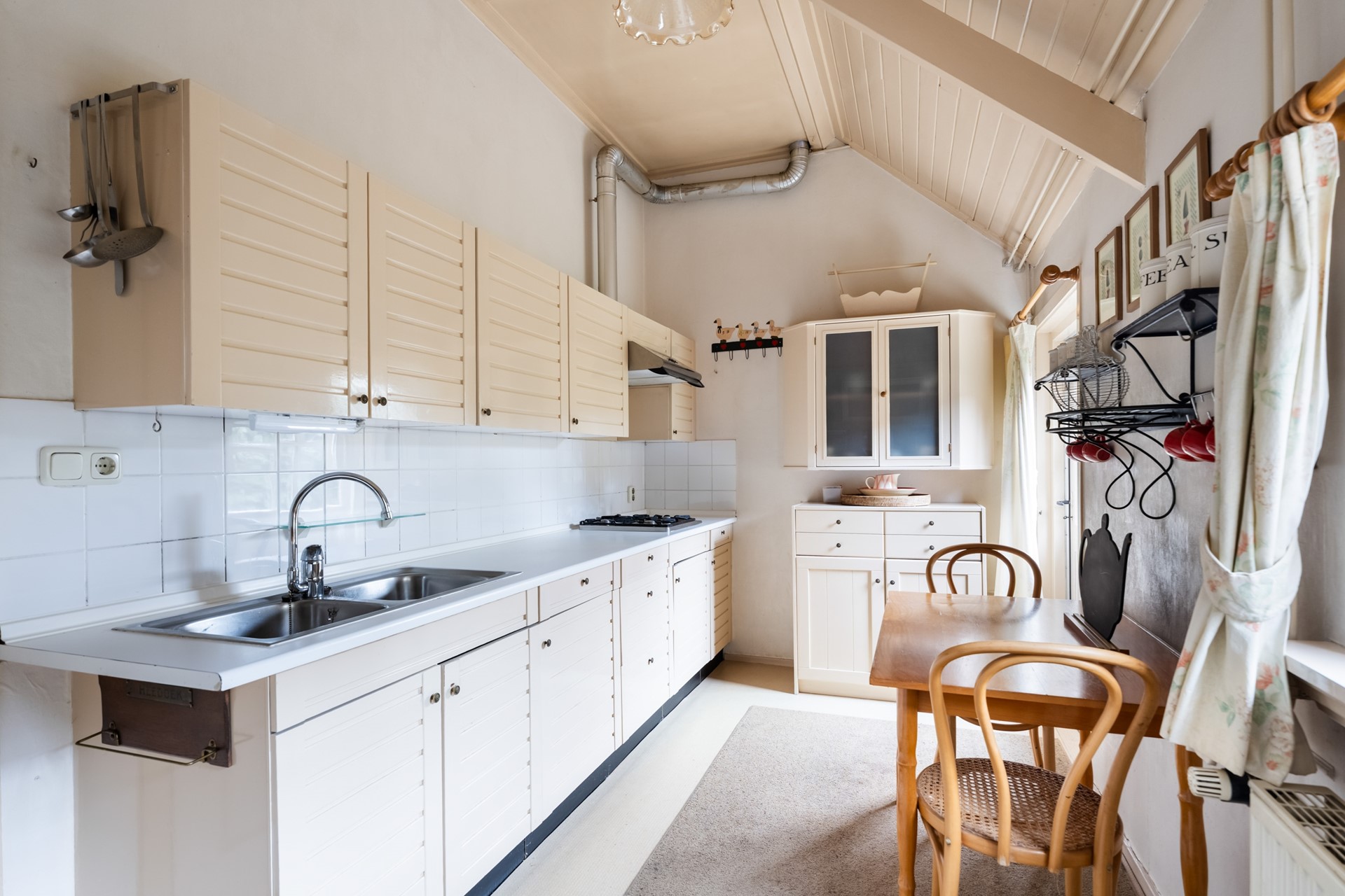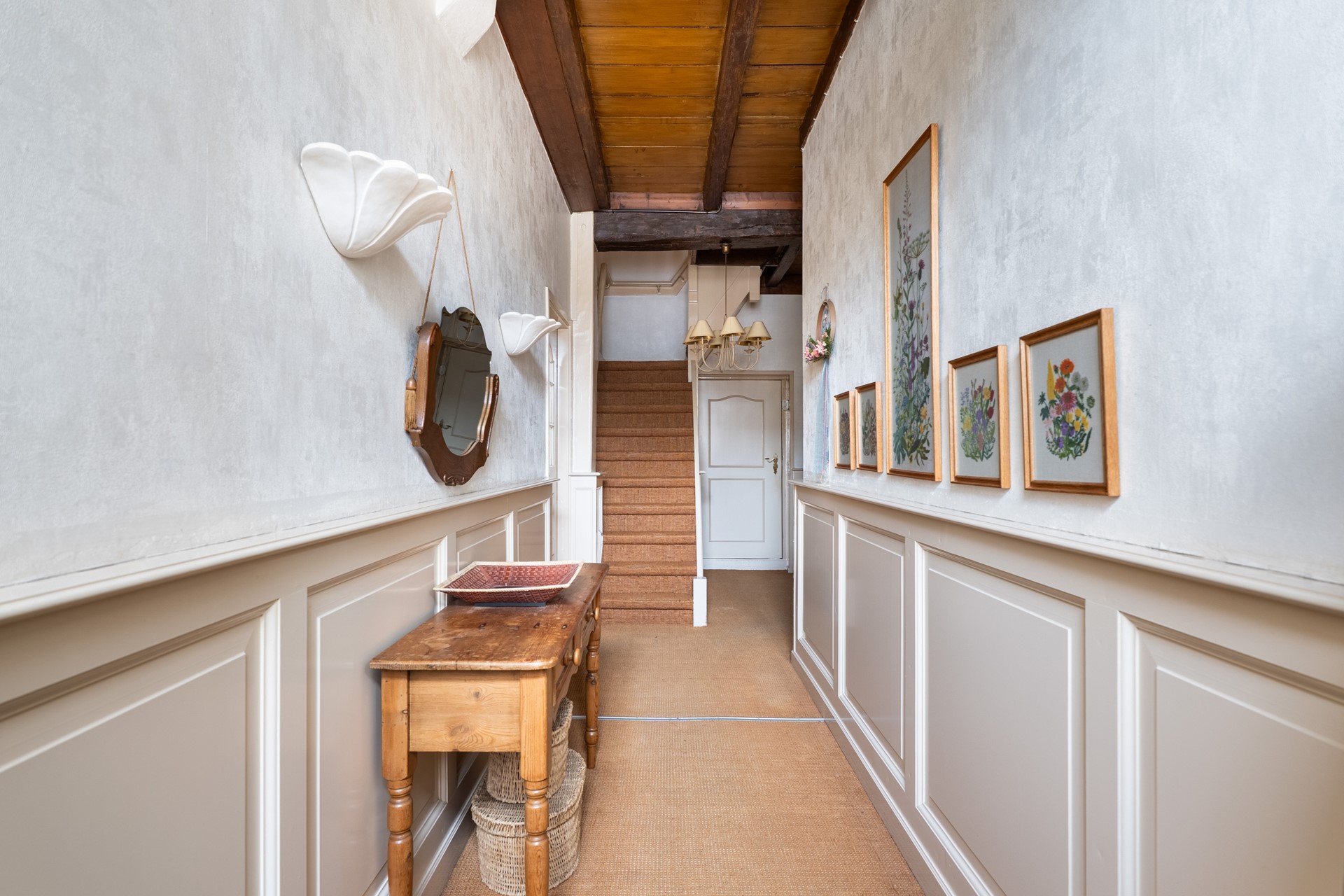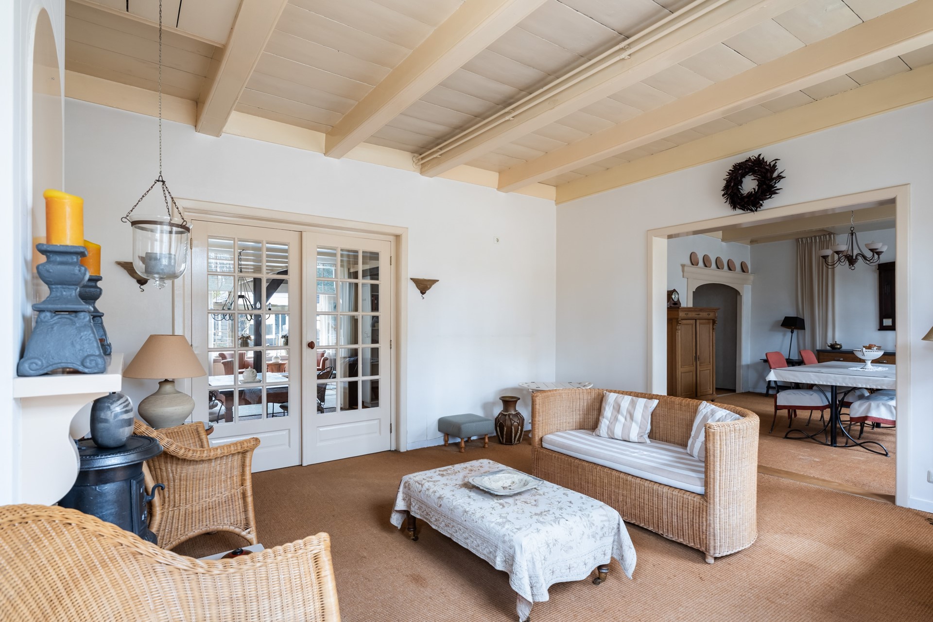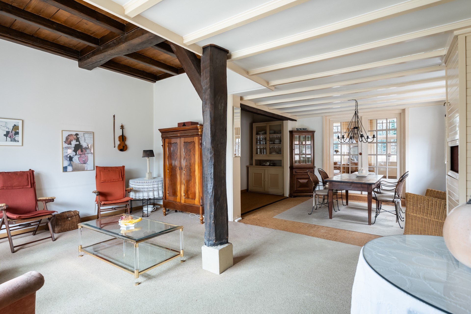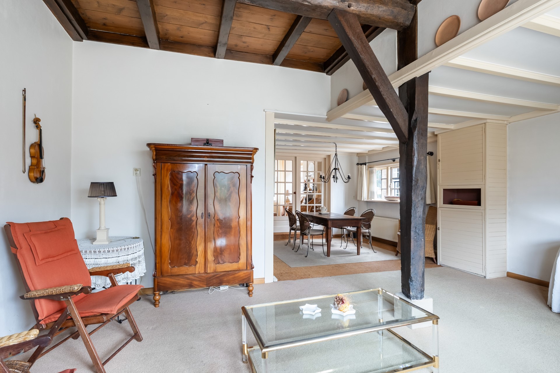 Zodra je binnenstapt voel je het karakter van het huis. Het houten balkenplafond en de hoge plafonds zorgen direct voor een warme, authentieke uitstraling. De hal geeft toegang tot de verschillende leefruimtes, maar het is vooral de woonkamer die indruk maakt. Doordat het pand vroeger als winkelruimte in gebruik was, is de leefruimte opvallend royaal en flexibel in te delen – bovendien biedt dit de mogelijkheid om vandaag de dag nog steeds een winkel of kantoor aan huis te vestigen. Dankzij de en-suite deuren creëer je moeiteloos verschillende zones – van een sfeervolle eetkamer tot een comfortabele zit- of tv-kamer. Tot slot geven de nisjes en details het geheel extra charme en maken dit huis allesbehalve standaard.