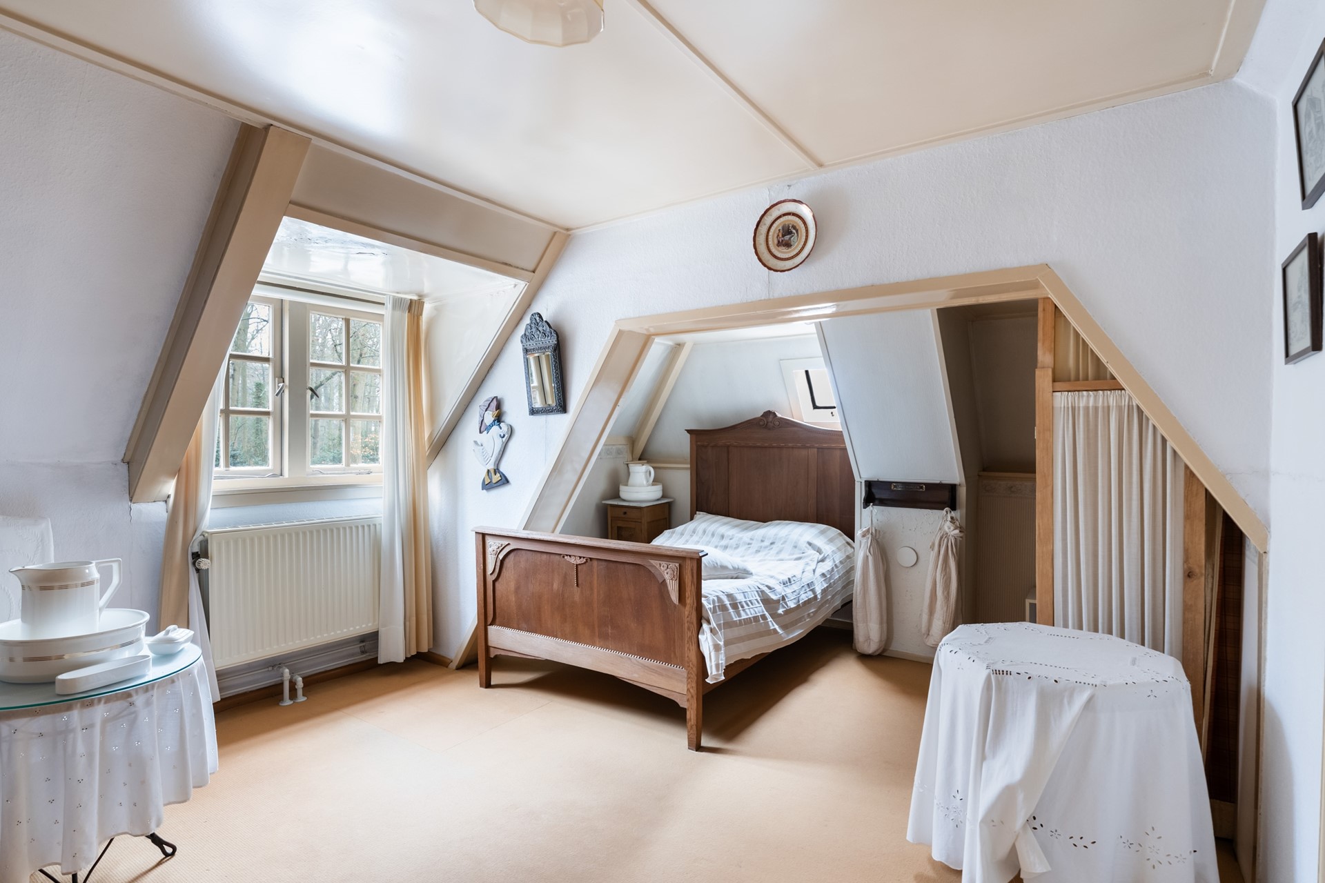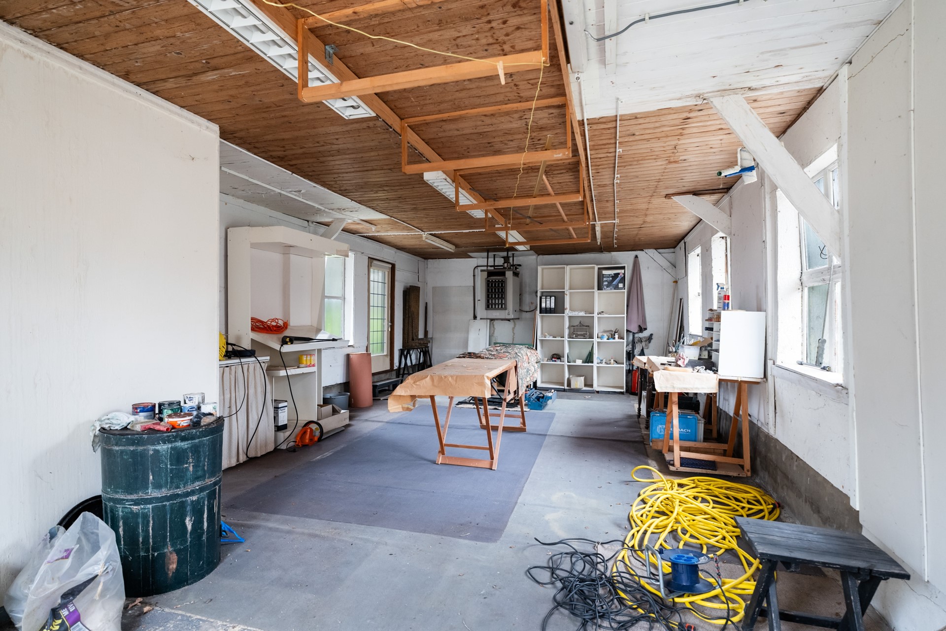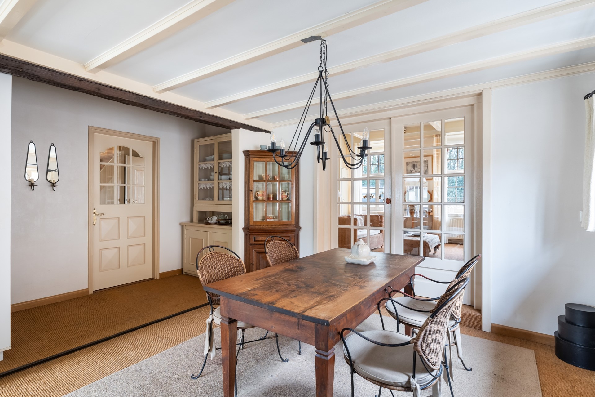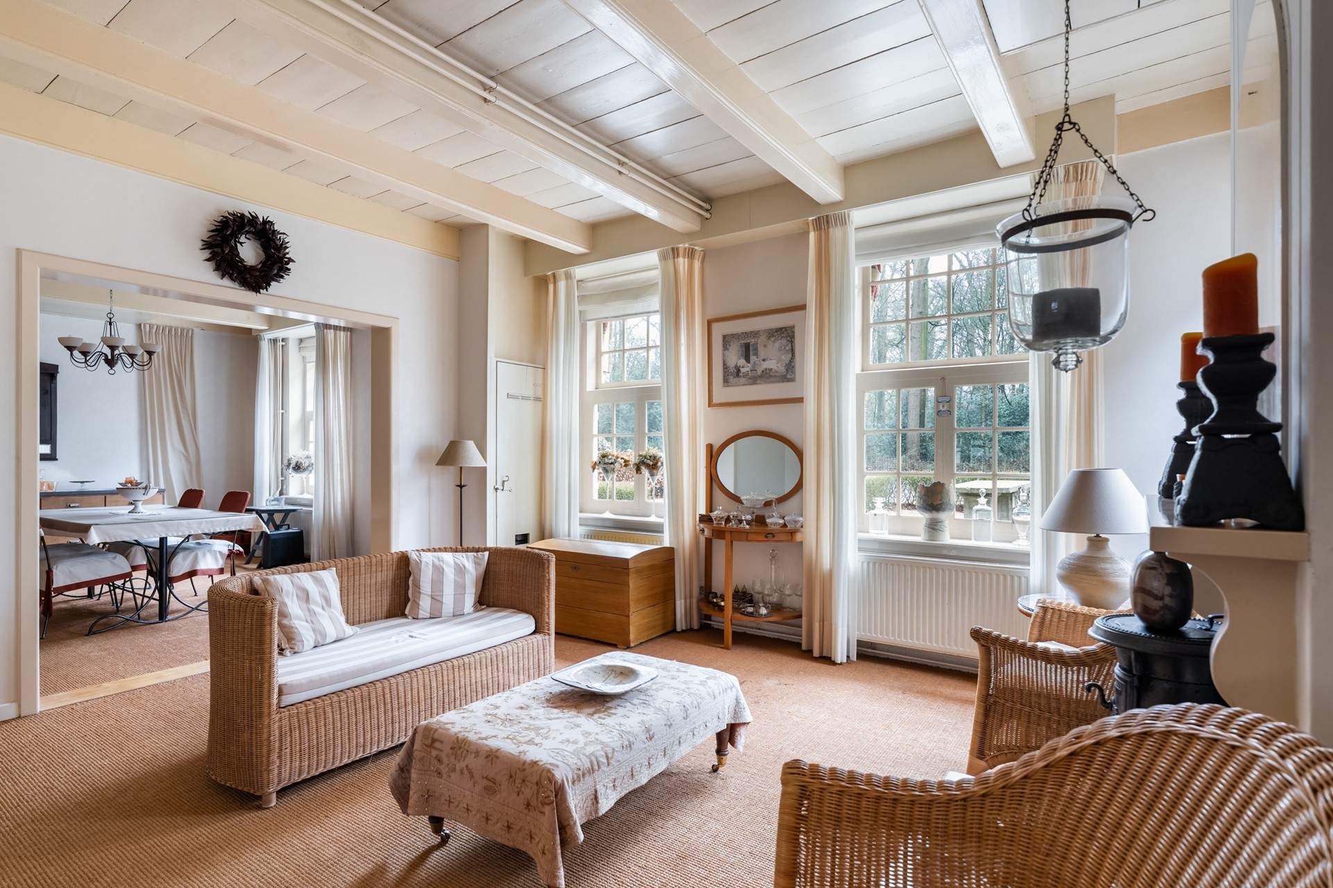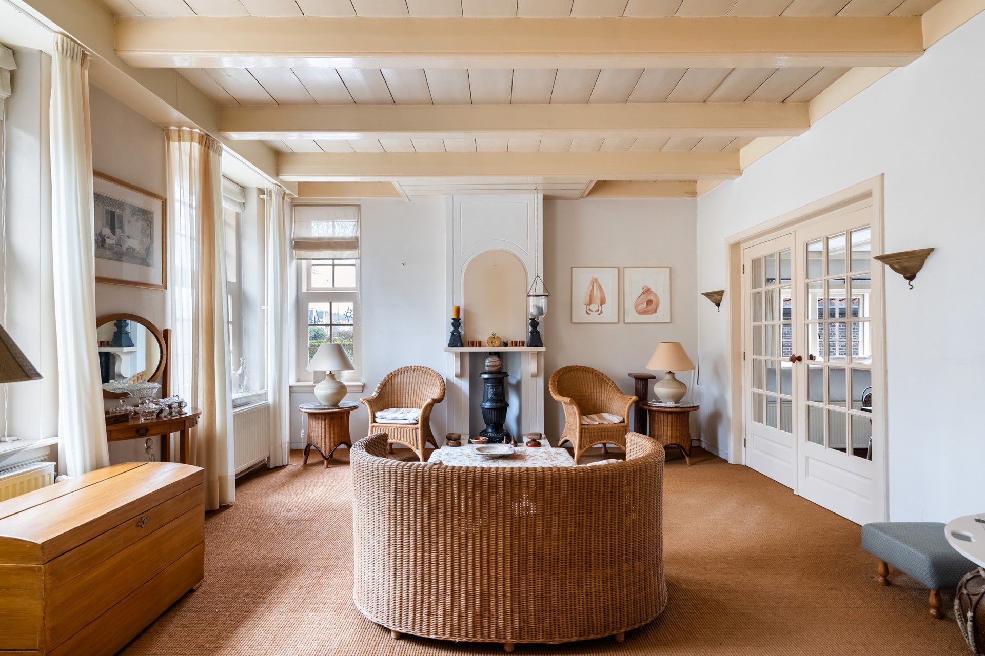 Zodra je binnenstapt voel je het karakter van het huis. Het houten balkenplafond en de hoge plafonds zorgen direct voor een warme, authentieke uitstraling. De hal geeft toegang tot de verschillende leefruimtes, maar het is vooral de woonkamer die indruk maakt. Doordat het pand vroeger als winkelruimte in gebruik was, is de leefruimte opvallend royaal en flexibel in te delen – bovendien biedt dit de mogelijkheid om vandaag de dag nog steeds een winkel of kantoor aan huis te vestigen. Dankzij de en-suite deuren creëer je moeiteloos verschillende zones – van een sfeervolle eetkamer tot een comfortabele zit- of tv-kamer. Tot slot geven de nisjes en details het geheel extra charme en maken dit huis allesbehalve standaard.