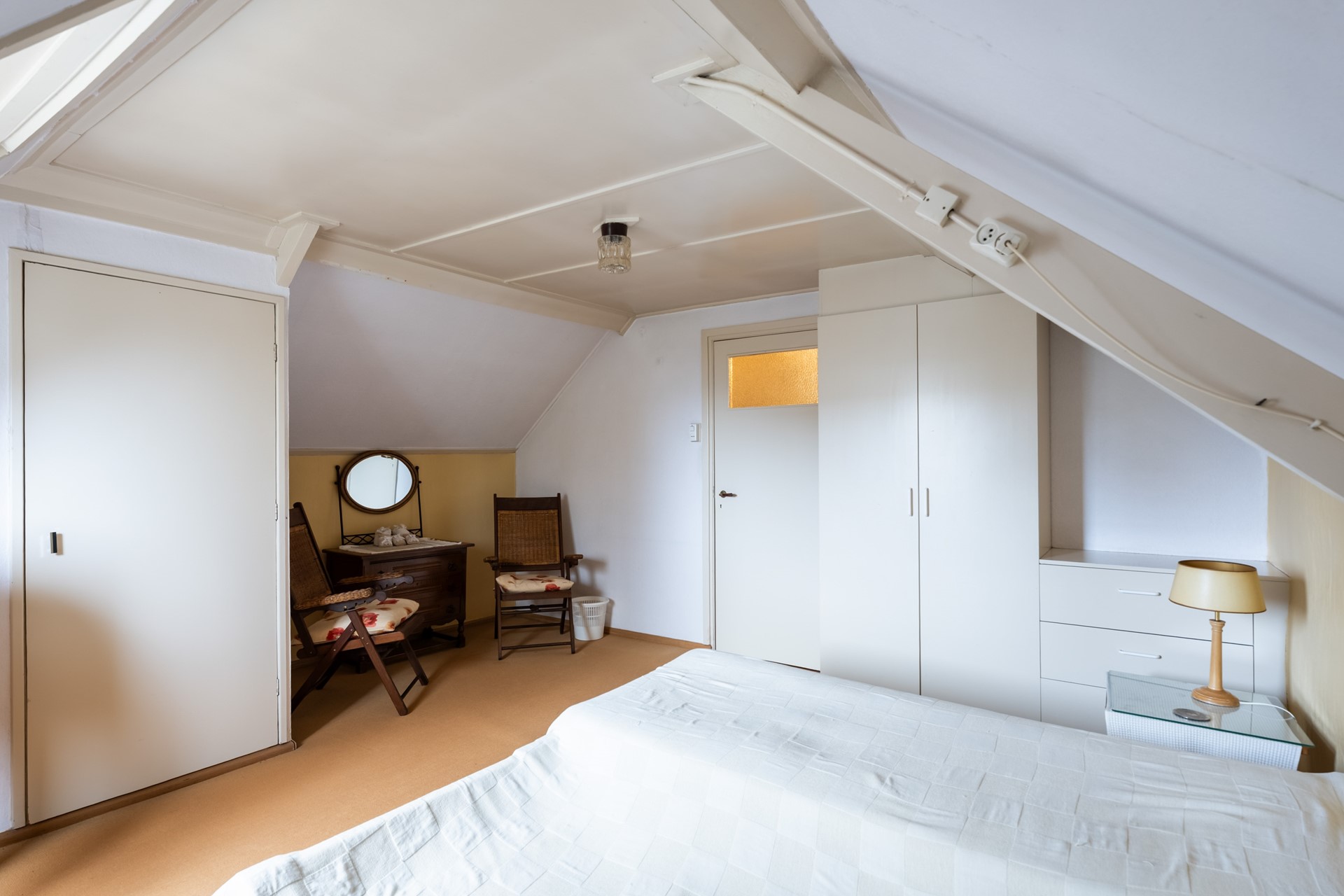 Op de verdieping vind je drie ruime slaapkamers, elk met vaste kastruimte. De kamers aan de voorzijde profiteren van extra licht en ruimte dankzij de dakkapel. De badkamer is praktisch ingericht met een douche in bad, wastafelmeubel en een Velux-dakraam dat zorgt voor prettig daglicht. Je vindt op deze verdieping een fijne combinatie van karakter, functionaliteit en ruimte!