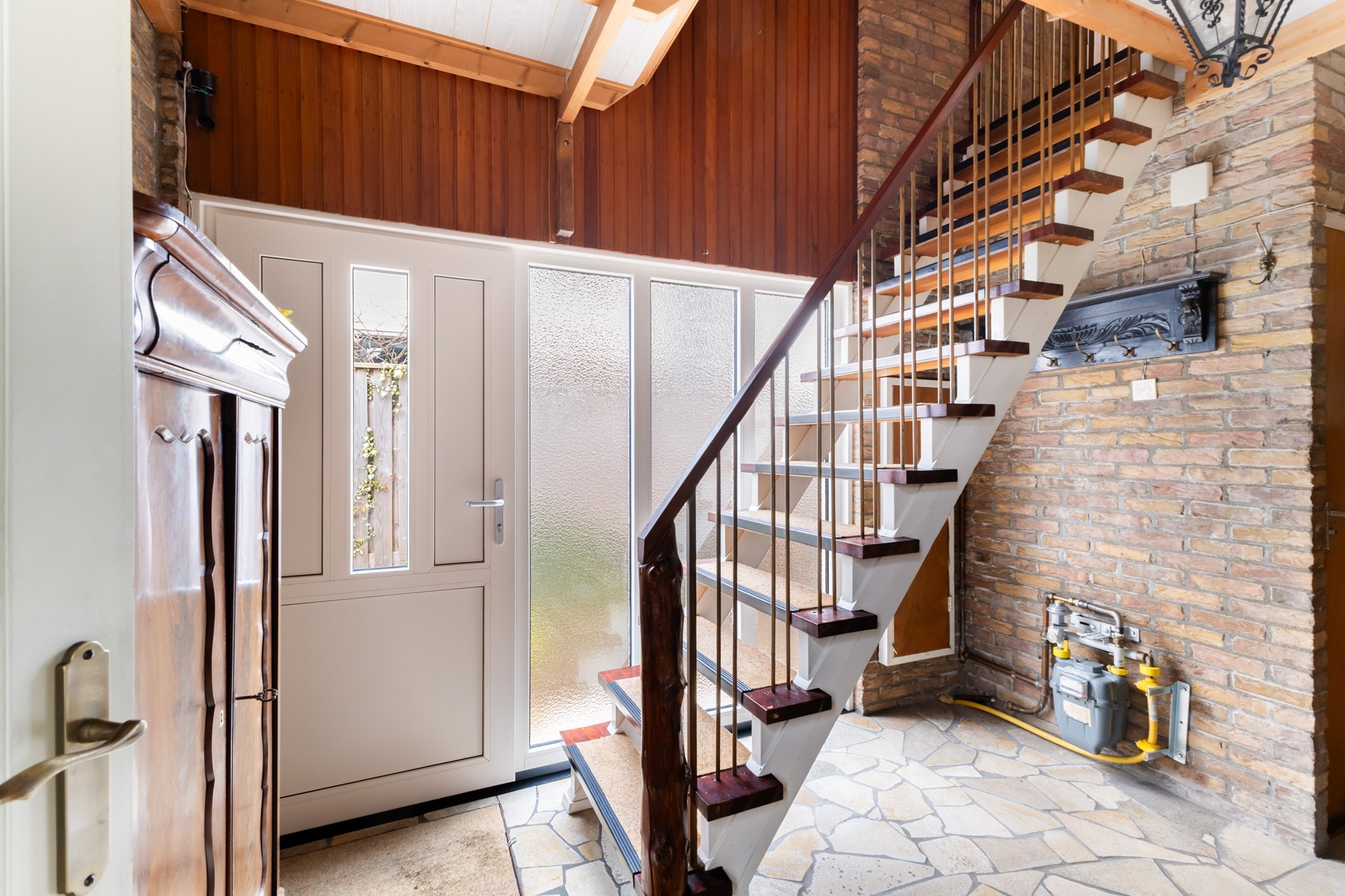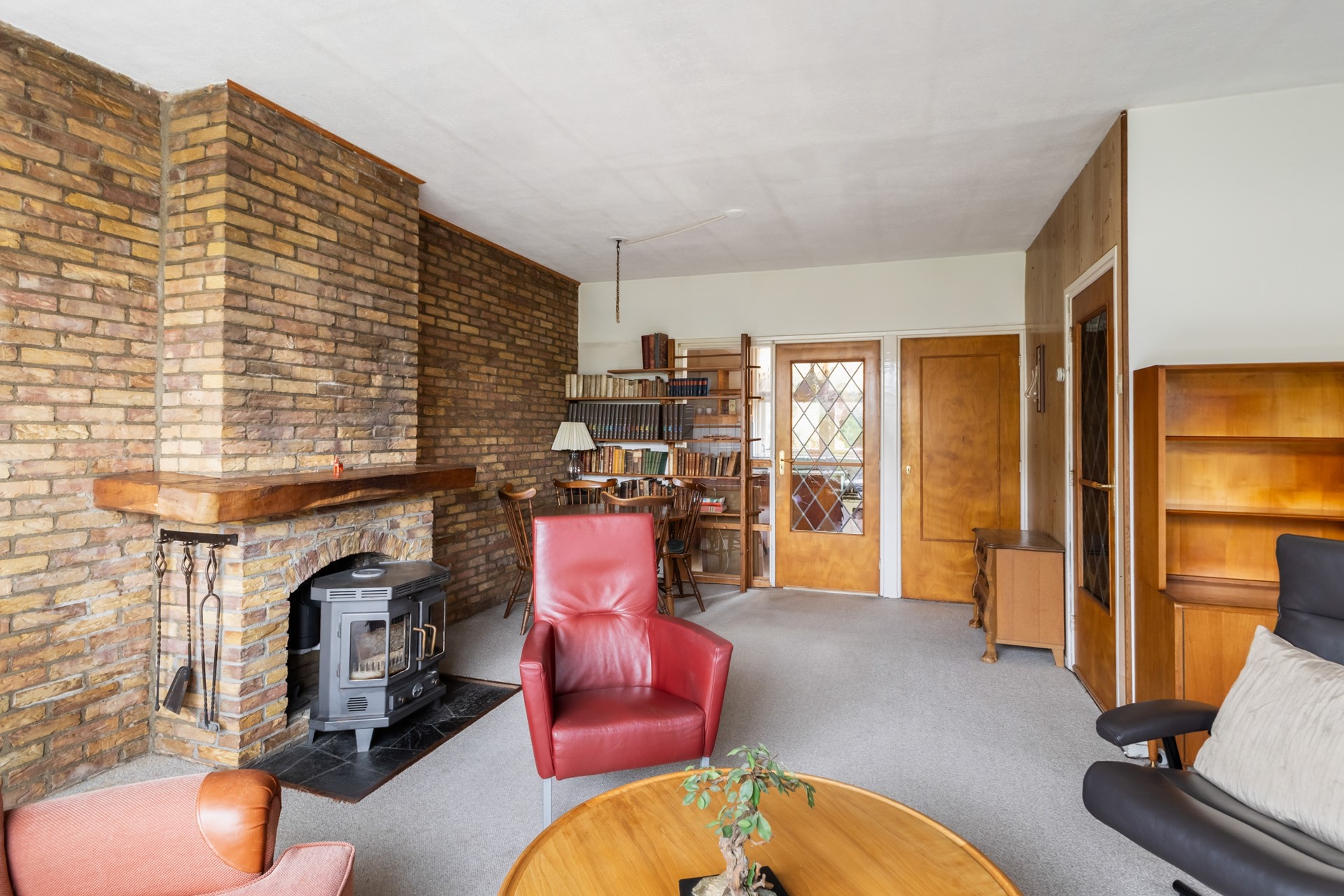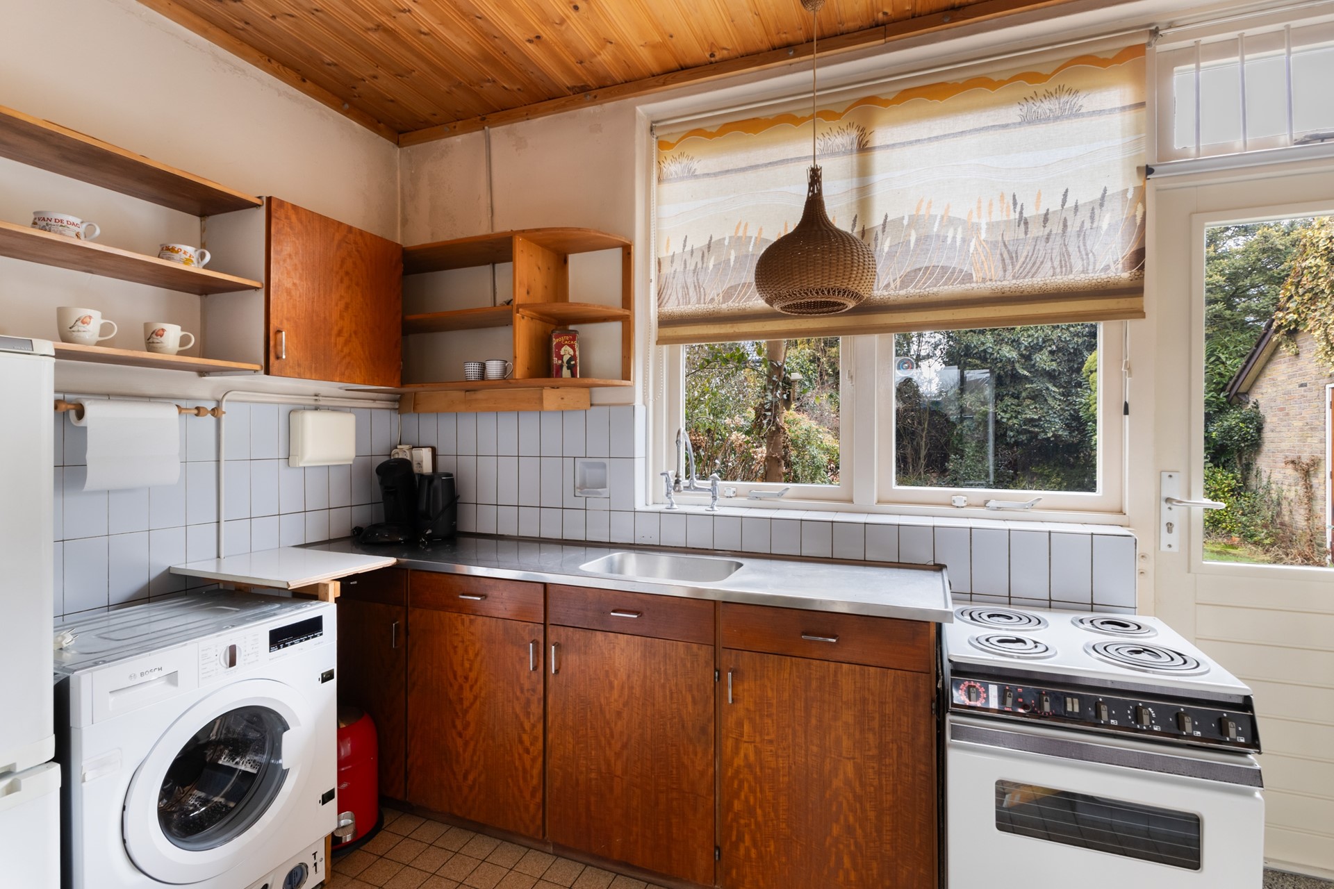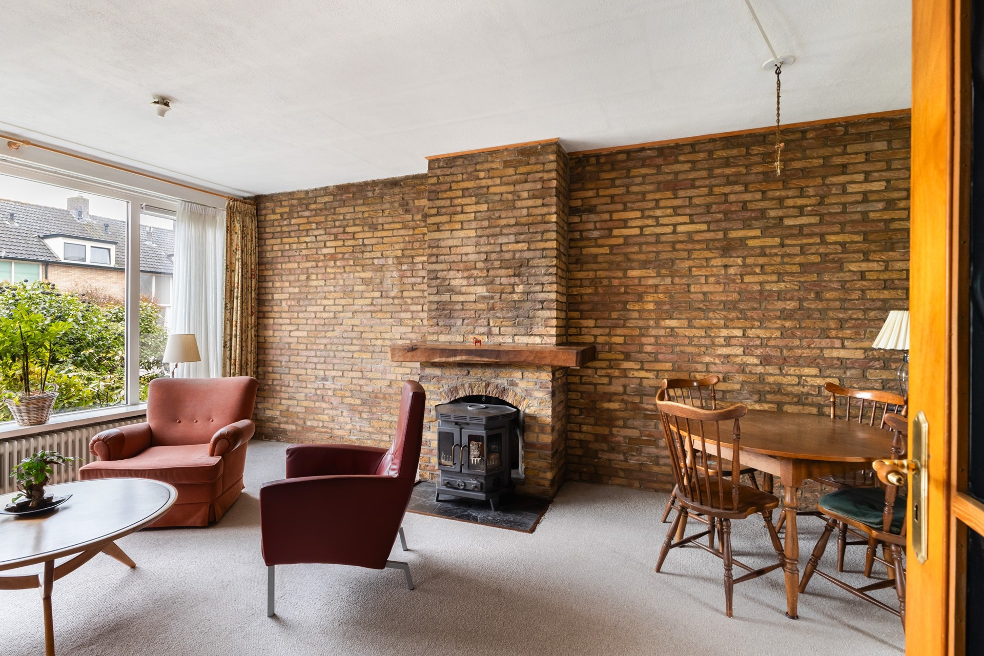 Via de entree kom je binnen in een ruime hal met directe toegang tot de trapopgang naar de 1e verdieping, de toiletruimte, de keuken en de woonkamer. De L-vormige woonkamer is aan de voorzijde van de woning gesitueerd en profiteert dankzij de grote raampartijen van een prettige lichtinval. De gezellige houtkachel zorgt daarbij voor extra sfeer en warmte in de koude maanden. Vanuit de woonkamer is de keuken bereikbaar, voorzien van een elektrisch fornuis en een koel-/vriescombinatie. Door de scheidingswand tussen de woonkamer en keuken te verwijderen, is hier eenvoudig een sfeervolle open keuken te realiseren. In de keuken bevinden zich tevens de aansluitingen voor de wasmachine en droger. Via de loopdeur stap je bovendien zo het terras op, waardoor binnen en buiten op een prettige manier met elkaar verbonden zijn.