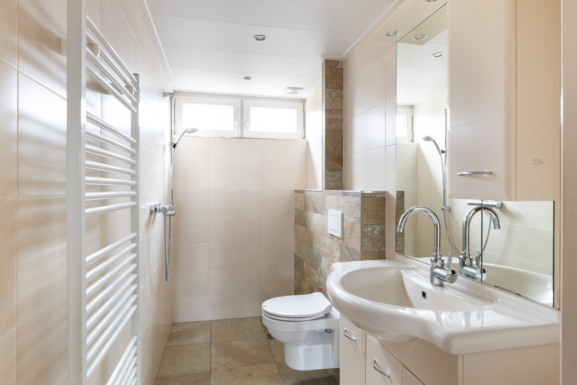 Via een vaste trap bereik je de overloop van de 1e verdieping. Vanaf hier heb je toegang tot 4 slaapkamers en de badkamer. Aan de achterzijde van de woning is over de volledige breedte een dakkapel geplaatst. Hierdoor profiteren 2 slaapkamers en de badkamer van extra ruimte en een prettige hoeveelheid daglicht. De badkamer is uitgerust met een douche, toilet en een wastafelmeubel. Van de 4 slaapkamers bevindt de royale ouderslaapkamer zich aan de voorzijde van de woning. Deze kamer beschikt bovendien over een eigen wastafel. Tot slot biedt de overloop via een vaste trap toegang tot de zolderverdieping.