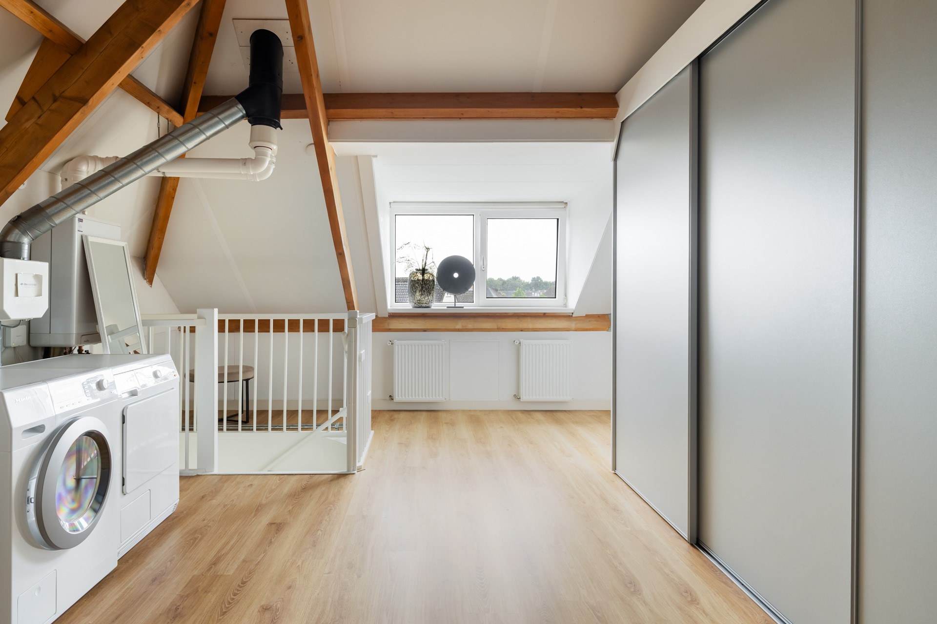 Via de vaste trap kom je op de tweede verdieping. Deze open ruimte is voorzien van een dakkapel en een praktische inbouwkast. Het biedt volop mogelijkheden voor eigen invulling, zoals het creëren van extra slaapkamer(s). Daarnaast bevinden zich hier de aansluitingen voor de wasmachine en droger, evenals de cv-installatie (Intergas, 2021) en mv-box (2021).