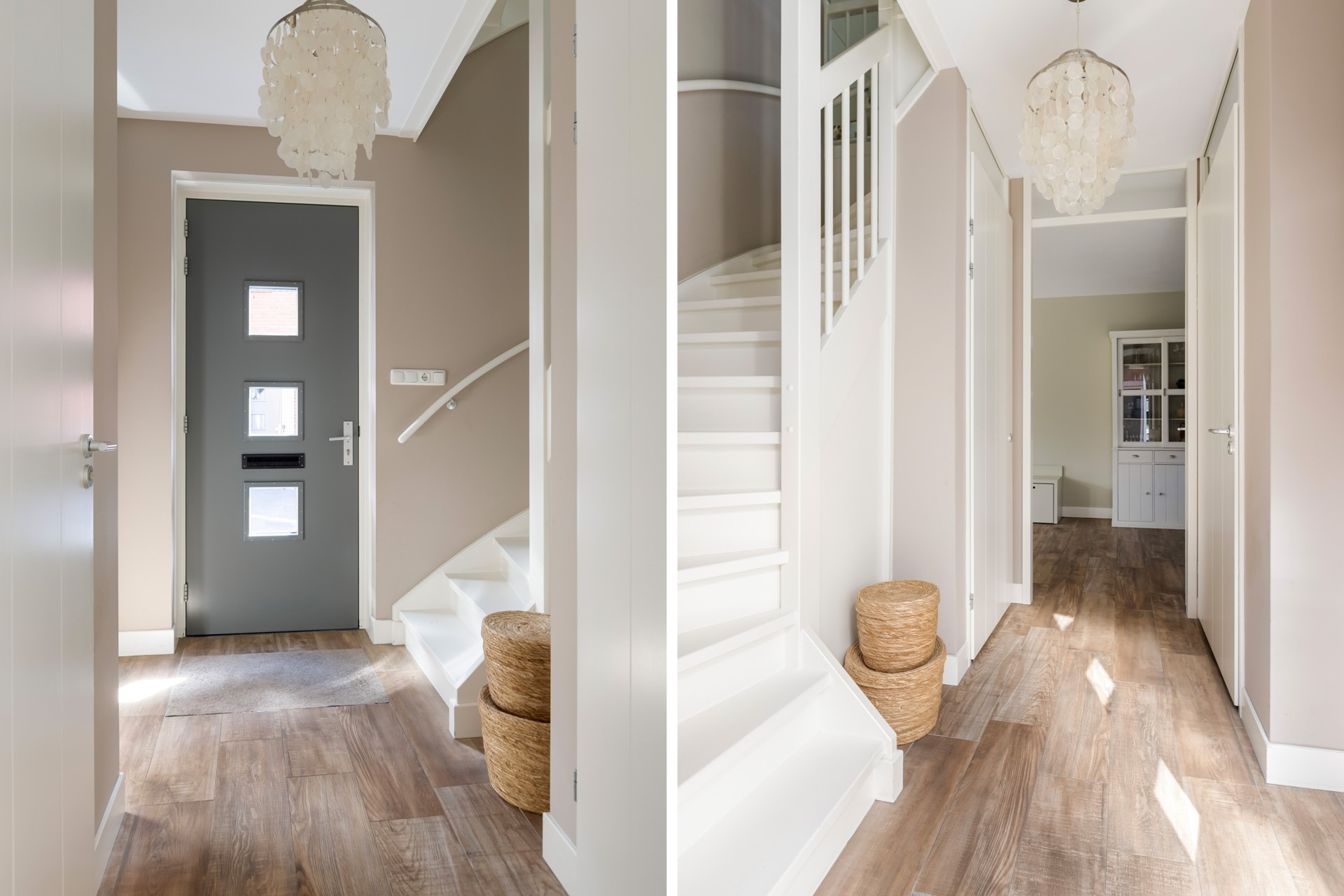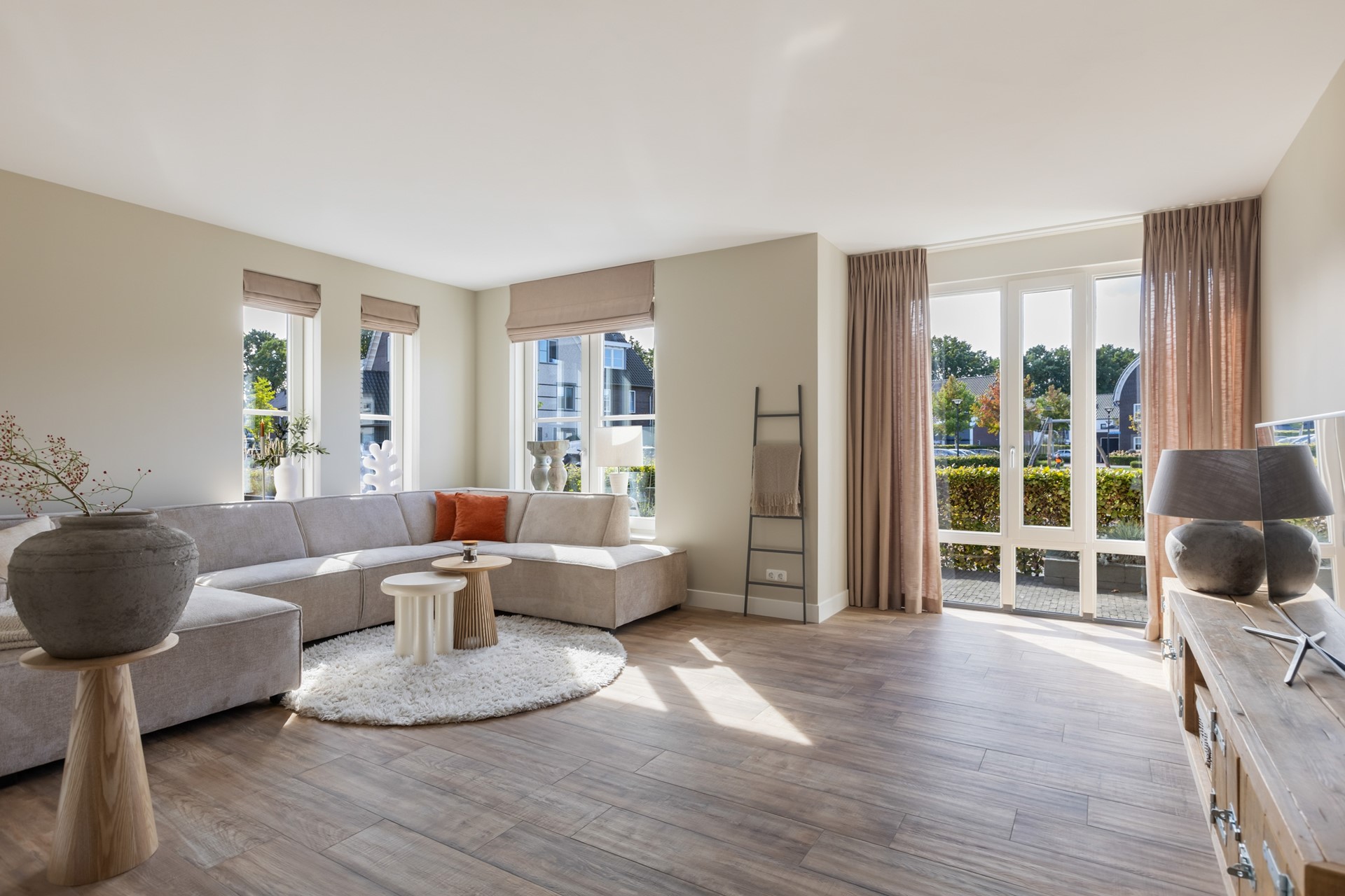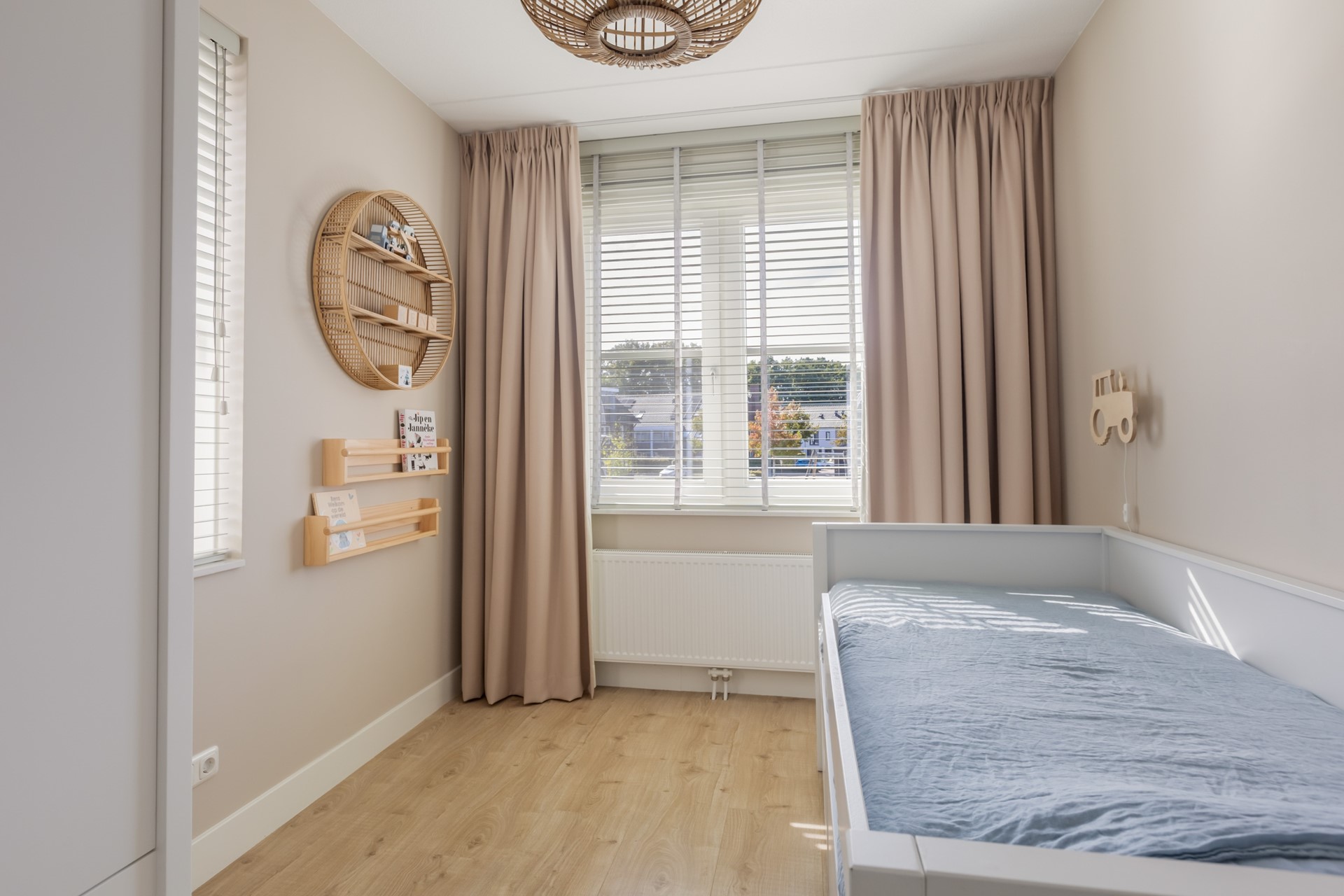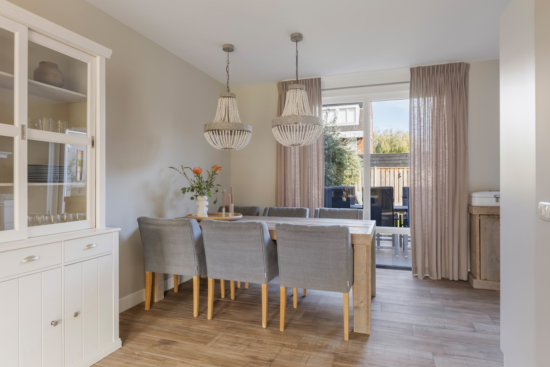 Begane grond: Via de entree kom je in de hal met toegang tot de meterkast (voorzien van glasvezelaansluiting), een moderne toiletruimte met wandcloset en fonteintje, de trap naar de eerste verdieping, een praktische trapkast én de woonkamer met open keuken. De ruime woonkamer bevindt zich aan de voorzijde van de woning en heeft een sfeervolle erker met uitzicht op de speelplaats. Dankzij de grote raampartijen geniet je hier van veel natuurlijk licht. De ruimte loopt door naar de keuken, waar plek is voor een royale eettafel. De keuken in hoekopstelling, afgewerkt met inbouwspots, is uitgerust met een 5-pits fornuis met oven, afzuigkap, koel-vriescombinatie en vaatwasser. Vanuit hier stap je direct het terras in de achtertuin op. Tot slot zijn de wanden strak afgewerkt en is de gehele begane grond voorzien van een plavuizenvloer met comfortabele vloerverwarming.