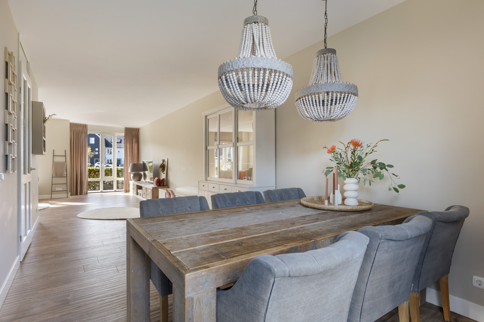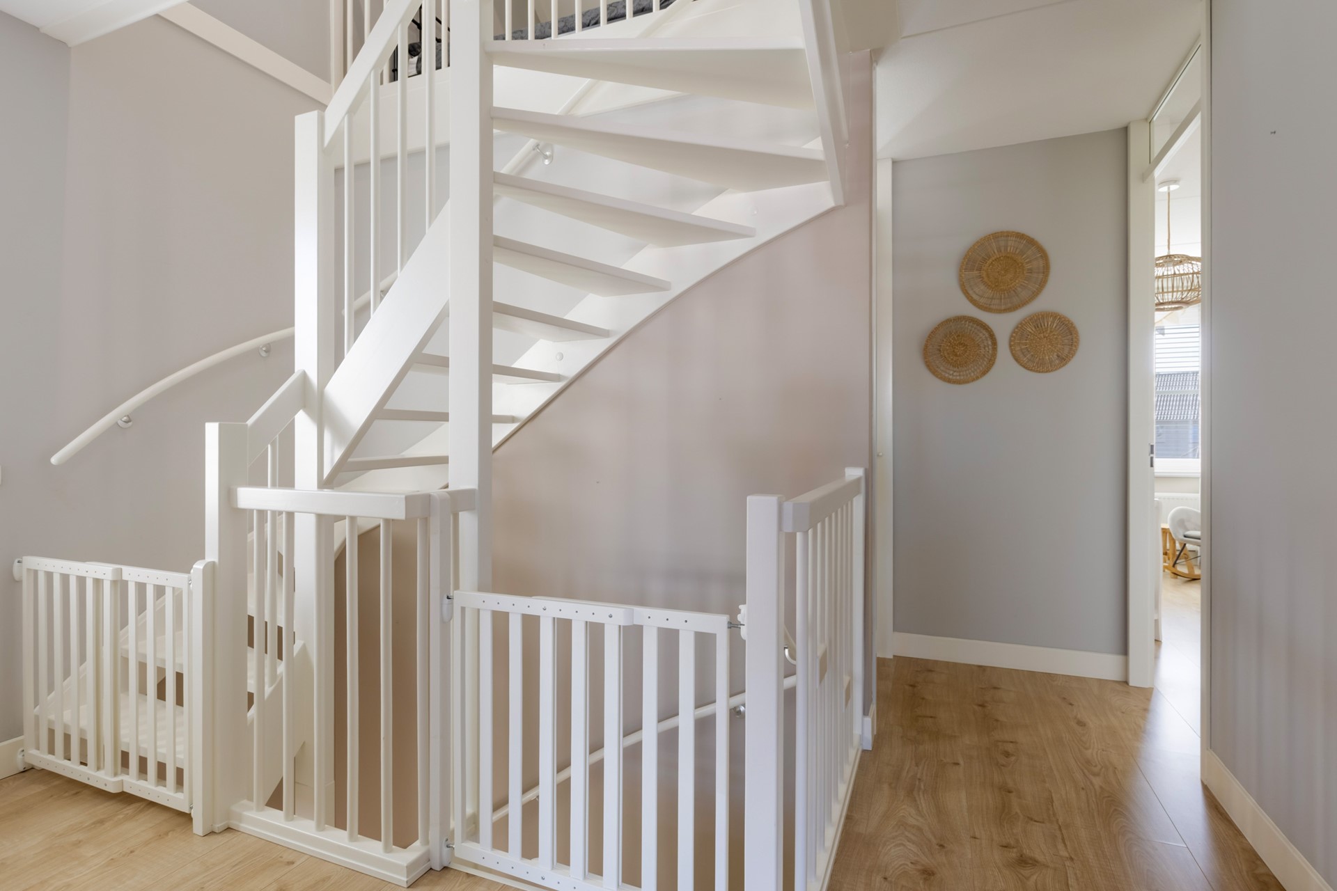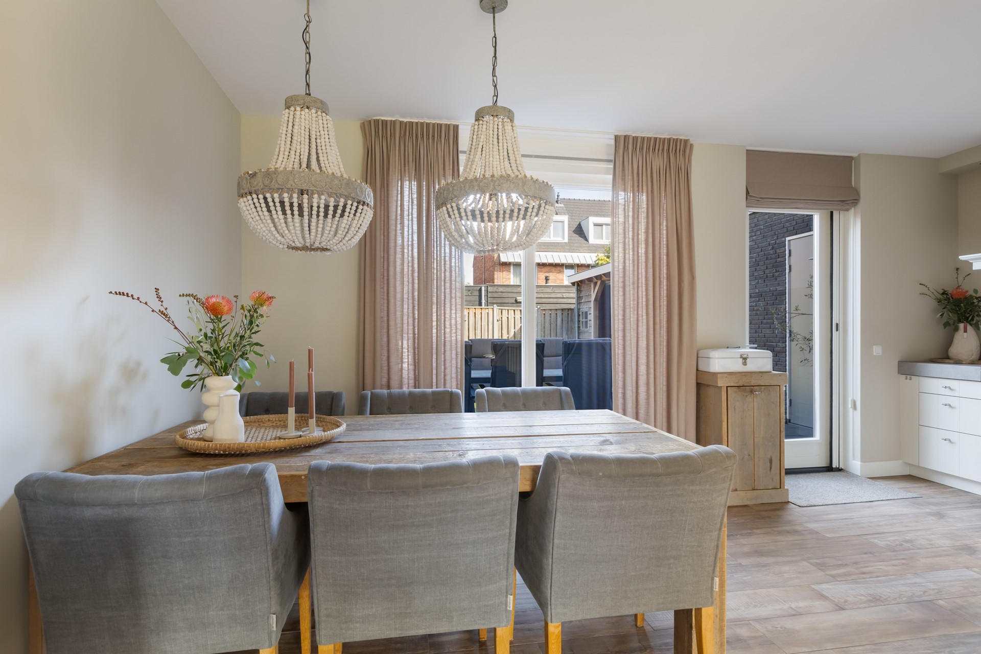 Begane grond: Via de entree kom je in de hal met toegang tot de meterkast (voorzien van glasvezelaansluiting), een moderne toiletruimte met wandcloset en fonteintje, de trap naar de eerste verdieping, een praktische trapkast én de woonkamer met open keuken. De ruime woonkamer bevindt zich aan de voorzijde van de woning en heeft een sfeervolle erker met uitzicht op de speelplaats. Dankzij de grote raampartijen geniet je hier van veel natuurlijk licht. De ruimte loopt door naar de keuken, waar plek is voor een royale eettafel. De keuken in hoekopstelling, afgewerkt met inbouwspots, is uitgerust met een 5-pits fornuis met oven, afzuigkap, koel-vriescombinatie en vaatwasser. Vanuit hier stap je direct het terras in de achtertuin op. Tot slot zijn de wanden strak afgewerkt en is de gehele begane grond voorzien van een plavuizenvloer met comfortabele vloerverwarming.