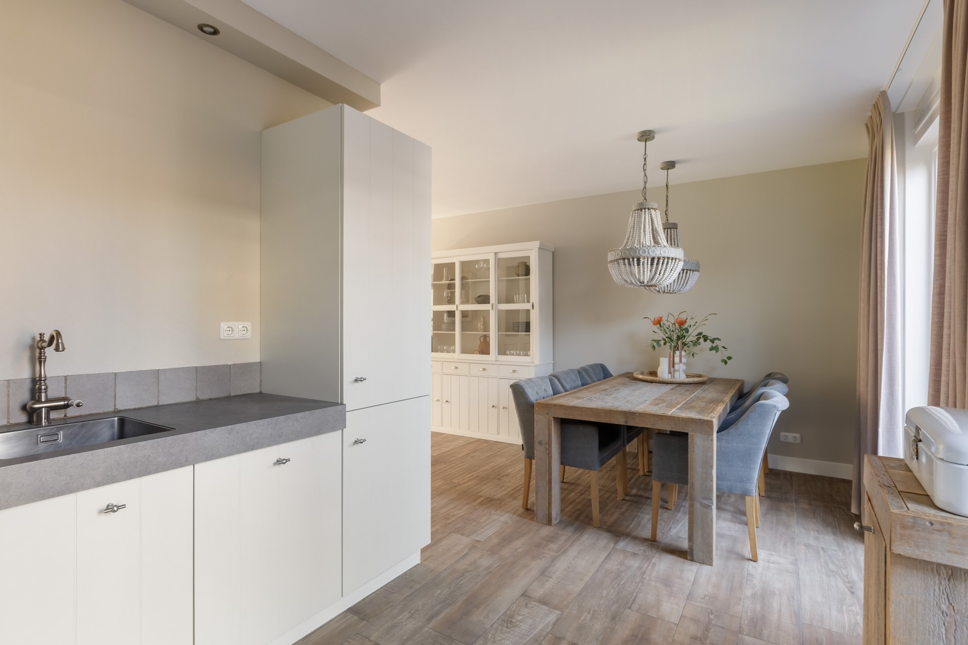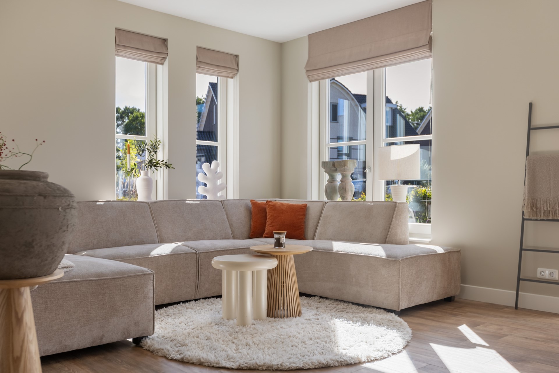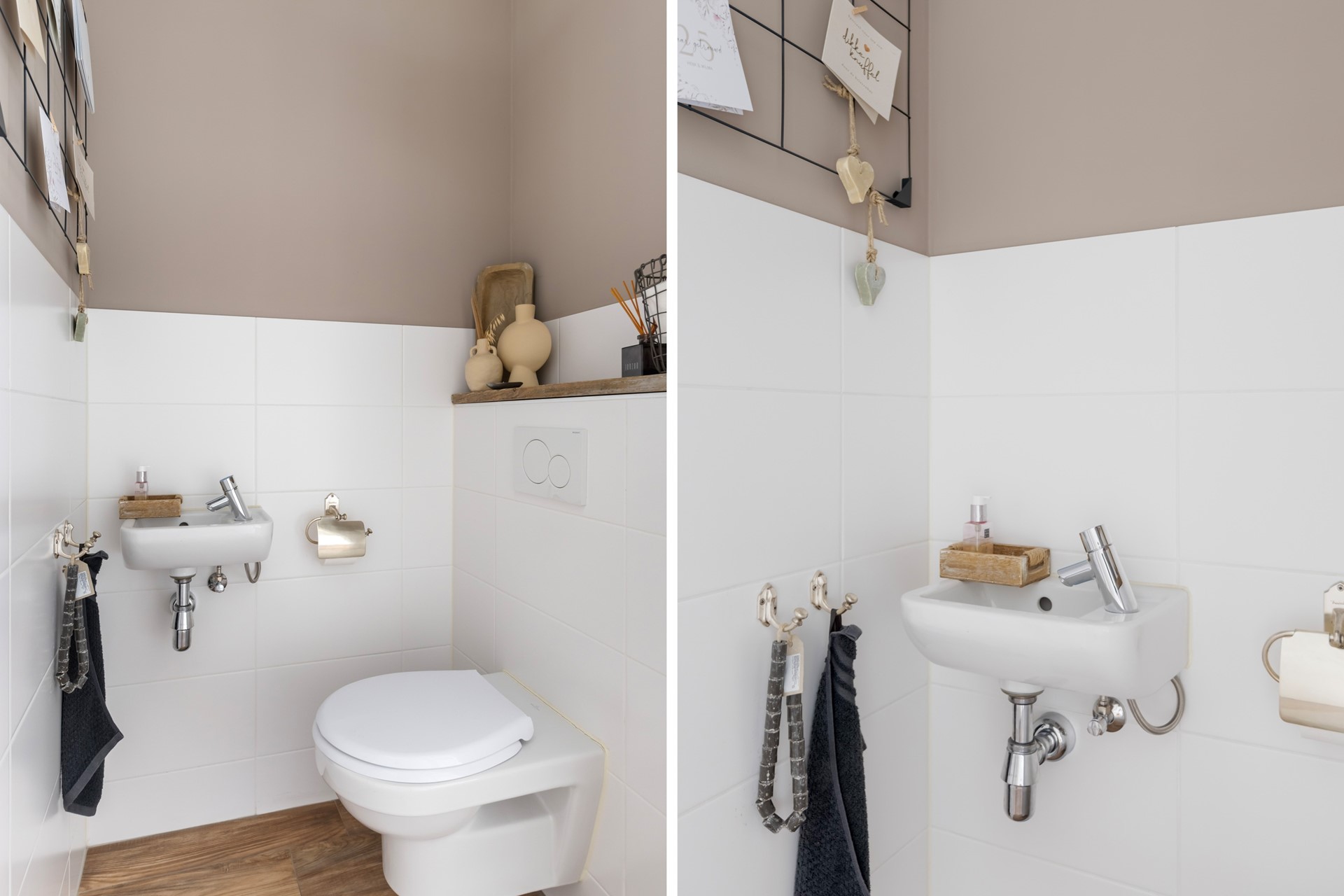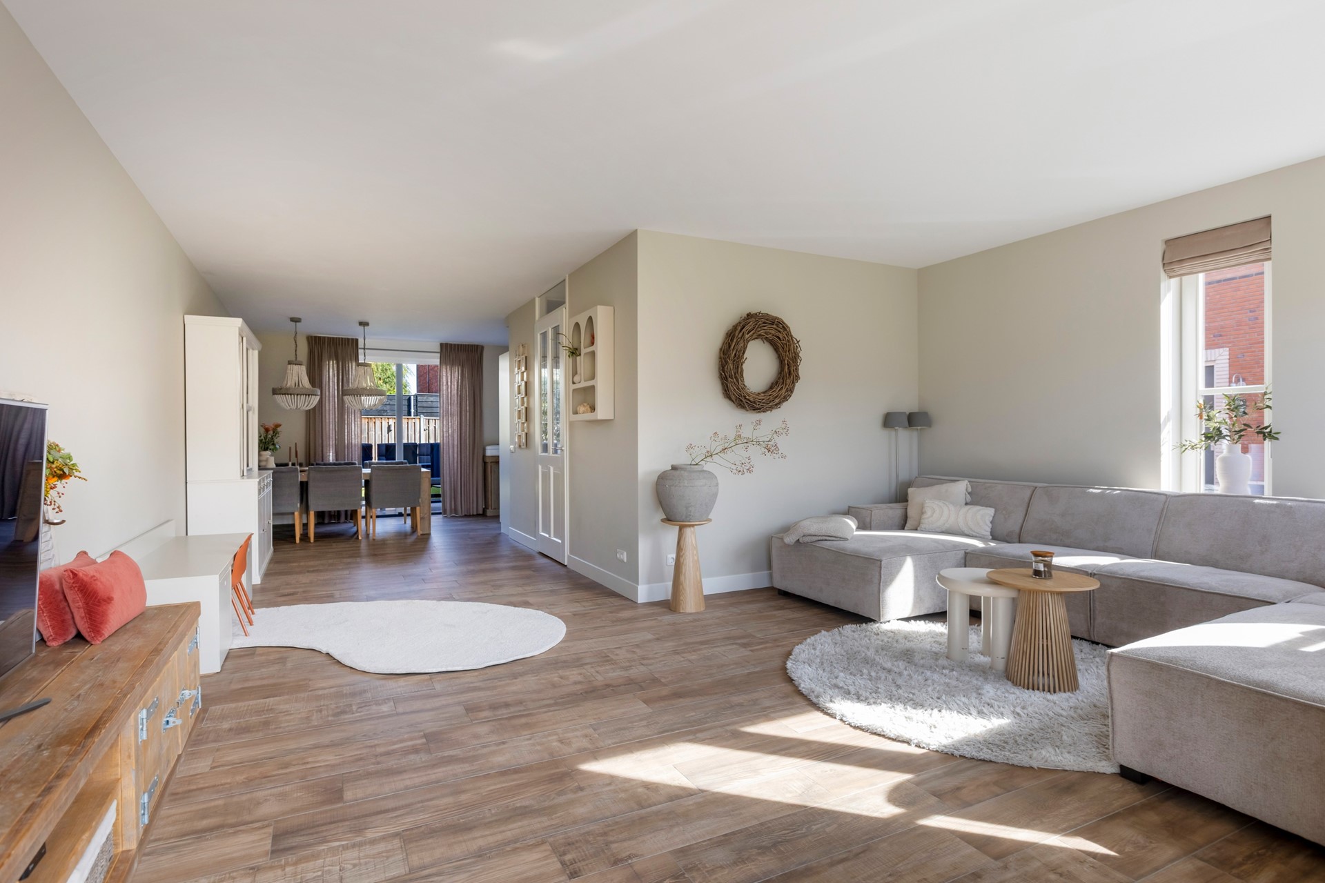 Begane grond: Via de entree kom je in de hal met toegang tot de meterkast (voorzien van glasvezelaansluiting), een moderne toiletruimte met wandcloset en fonteintje, de trap naar de eerste verdieping, een praktische trapkast én de woonkamer met open keuken. De ruime woonkamer bevindt zich aan de voorzijde van de woning en heeft een sfeervolle erker met uitzicht op de speelplaats. Dankzij de grote raampartijen geniet je hier van veel natuurlijk licht. De ruimte loopt door naar de keuken, waar plek is voor een royale eettafel. De keuken in hoekopstelling, afgewerkt met inbouwspots, is uitgerust met een 5-pits fornuis met oven, afzuigkap, koel-vriescombinatie en vaatwasser. Vanuit hier stap je direct het terras in de achtertuin op. Tot slot zijn de wanden strak afgewerkt en is de gehele begane grond voorzien van een plavuizenvloer met comfortabele vloerverwarming.